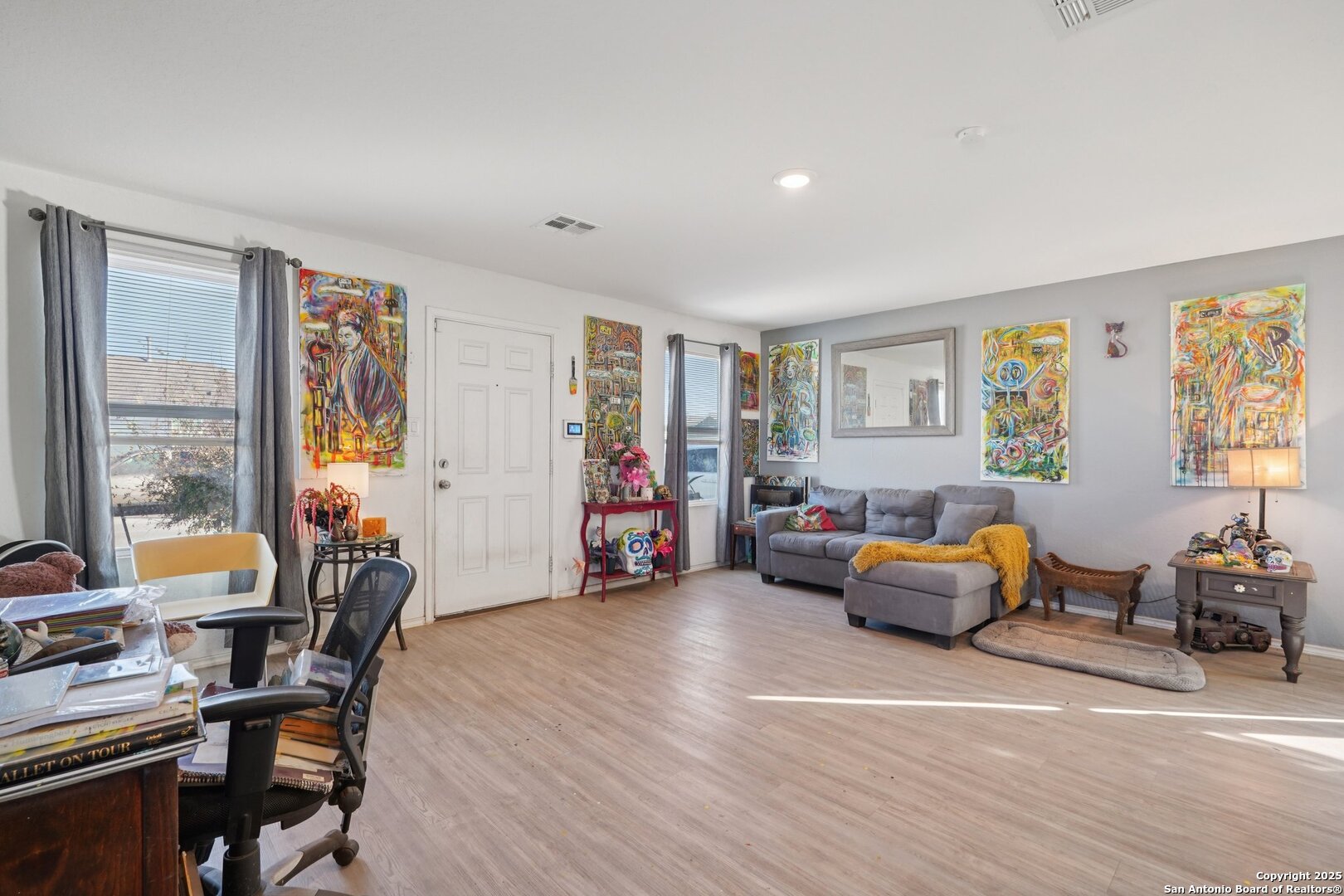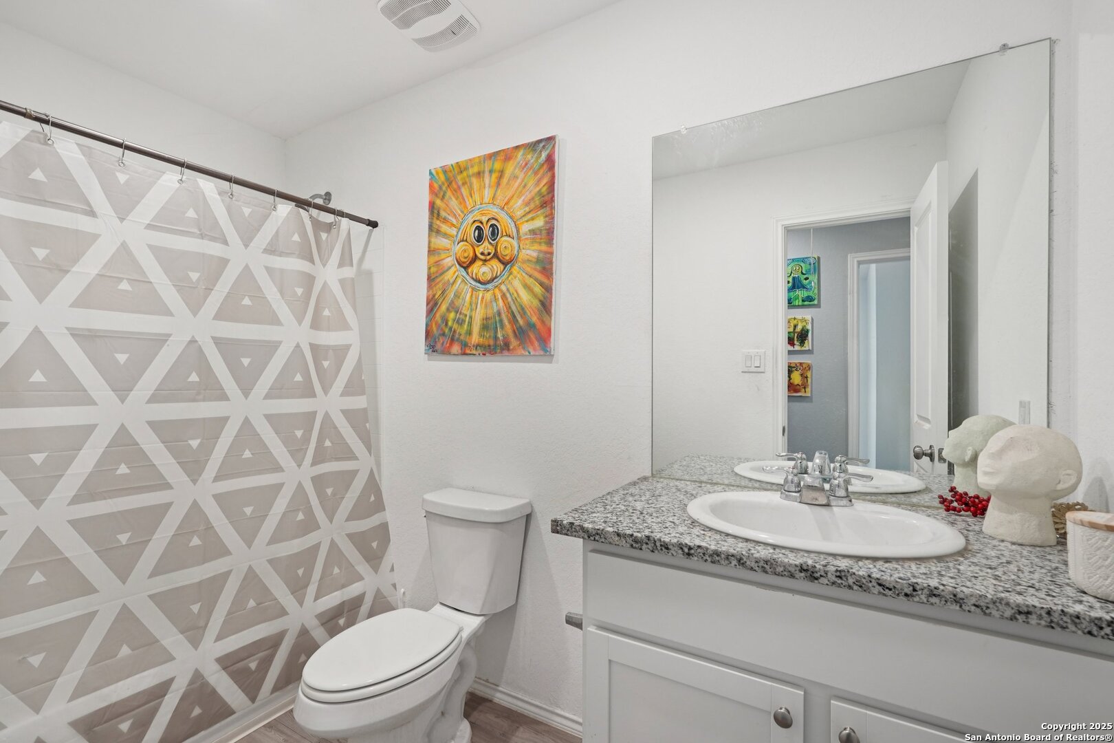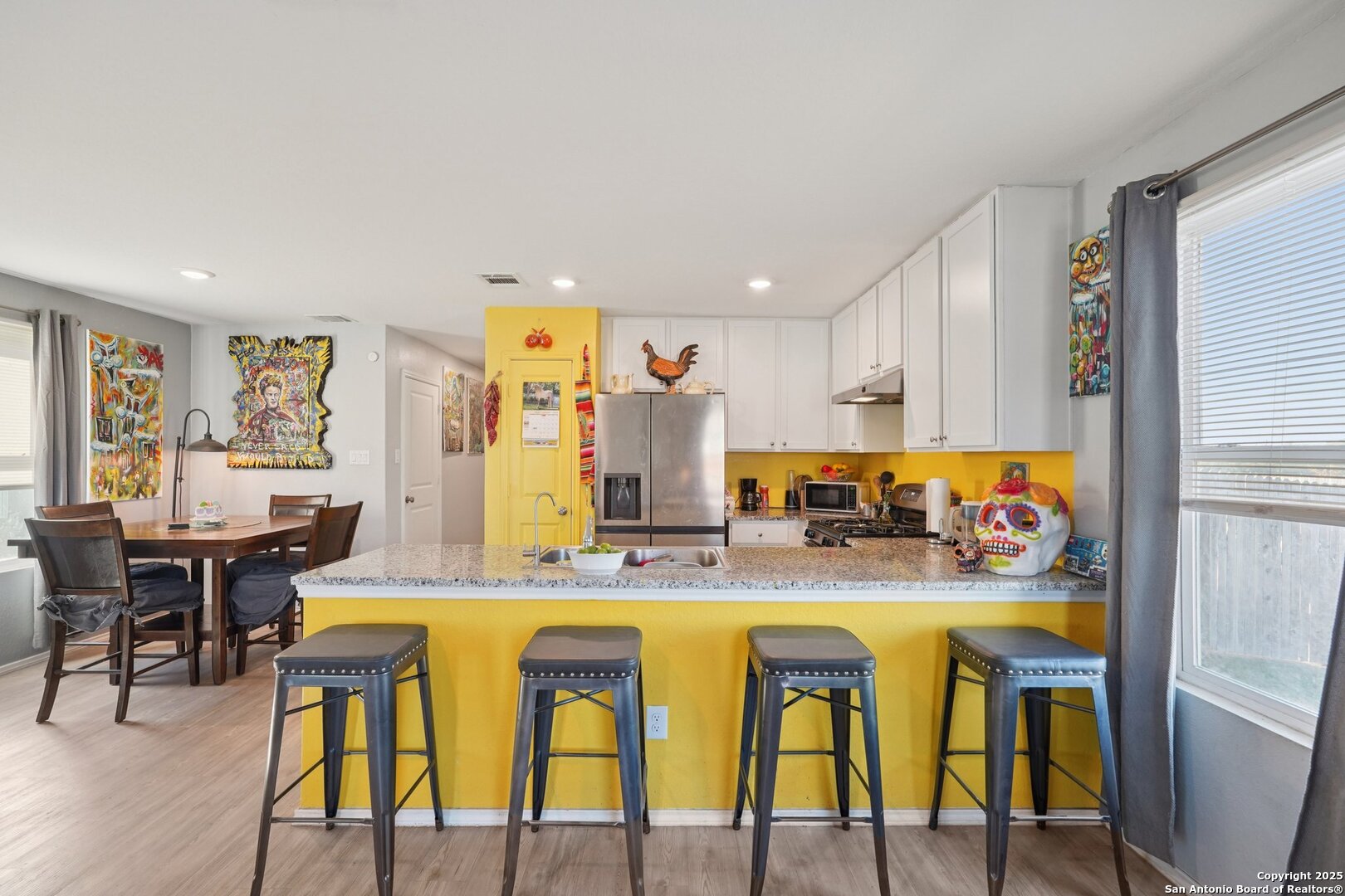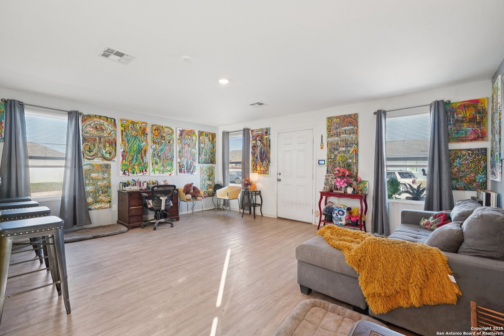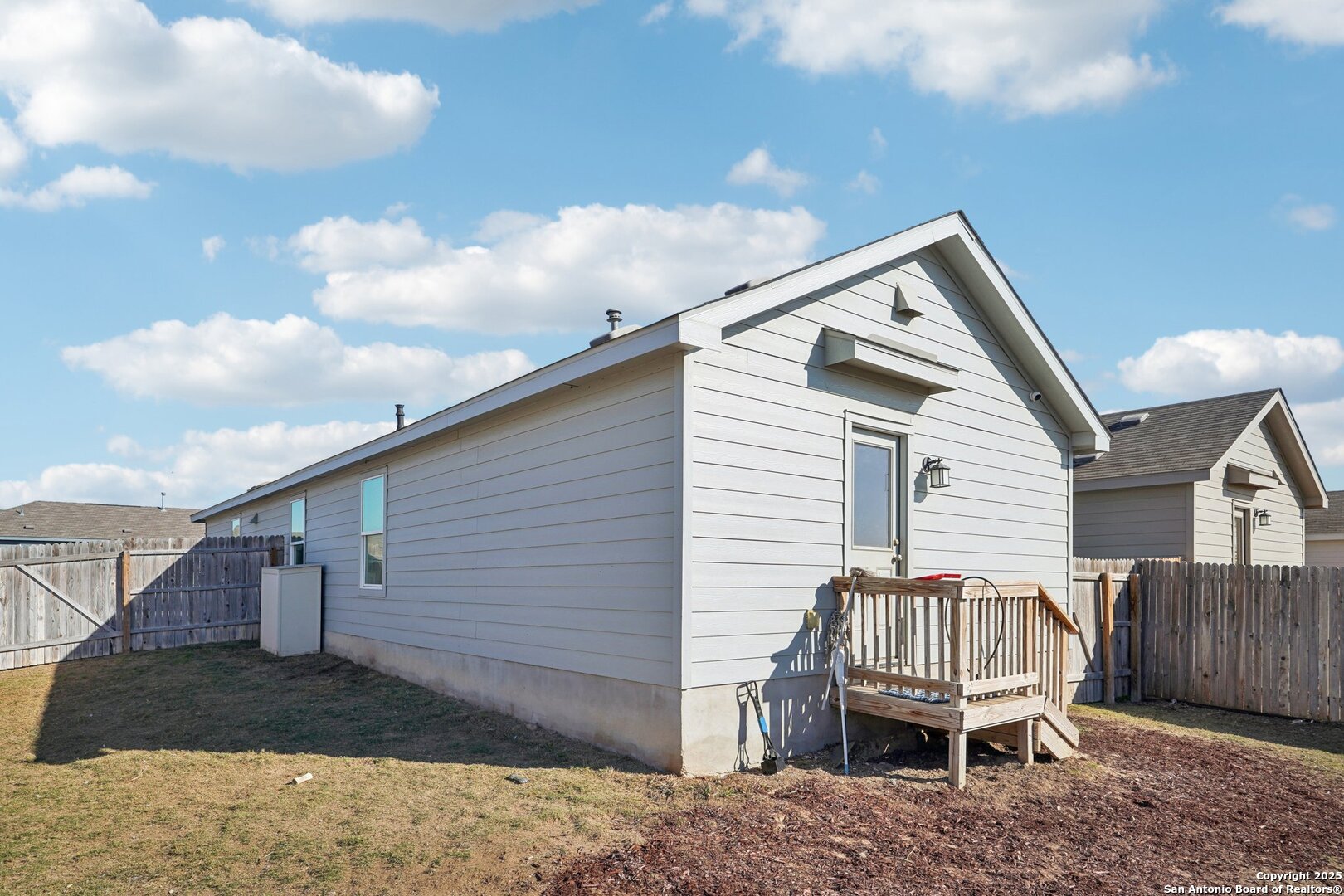 Enjoy low maintenance living at this darling home on a corner lot that backs up to a greenbelt. 4.7 VA assumable rate. Located near Hwy 90 and 211 in the popular Silos community with a gorgeous pool, playground, BBQ area, clubhouse, and fitness center. This lovely home is like-new with an open floor plan, 3 bedrooms, 2 full baths, and vinyl plank flooring throughout with zero carpet. The kitchen includes granite counters, stainless steel appliances, and gas cooking. Enjoy your spacious primary bedroom with dual closets, a full bathroom with granite counters, and easy access to the back yard for your furry friends. There's room for everyone with 2 additional bedrooms, a 2nd full bathroom, and laundry room in the hall. Washer/dryer, refrigerator, and water softener included. Only minutes from Lackland AFB, Loop 410, Loop 1604, Sea World, Costco, HEB, and dining nearby.