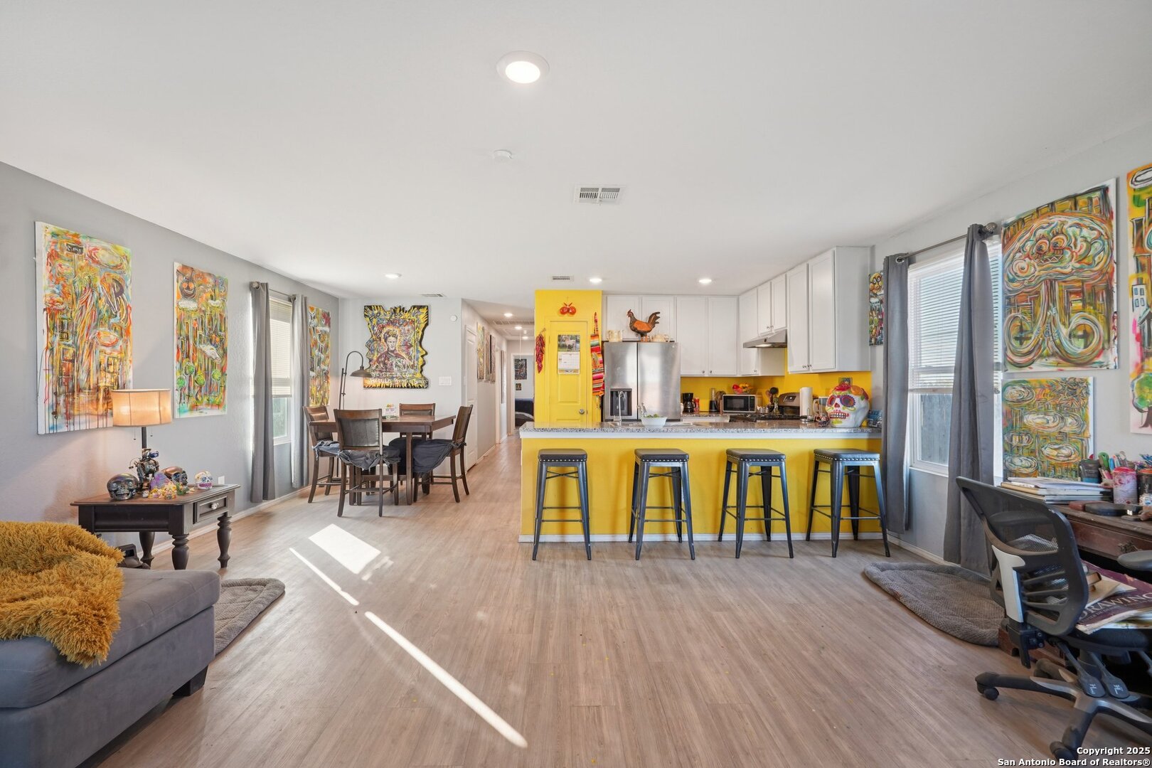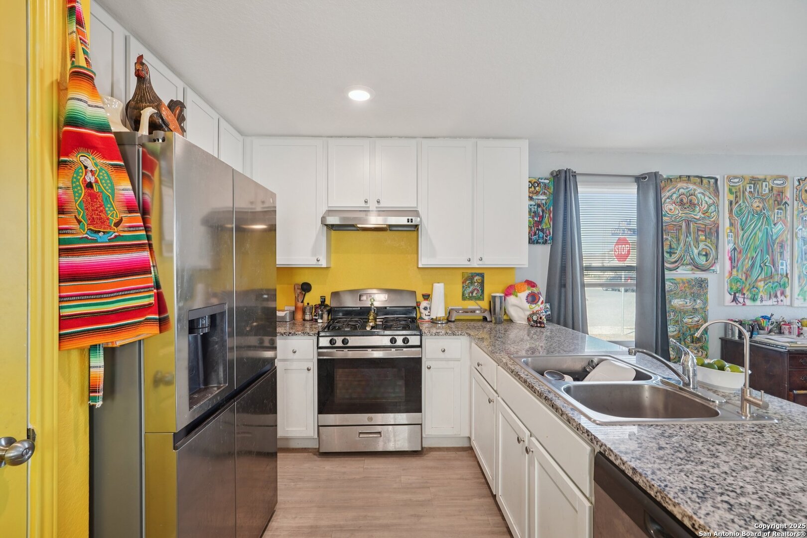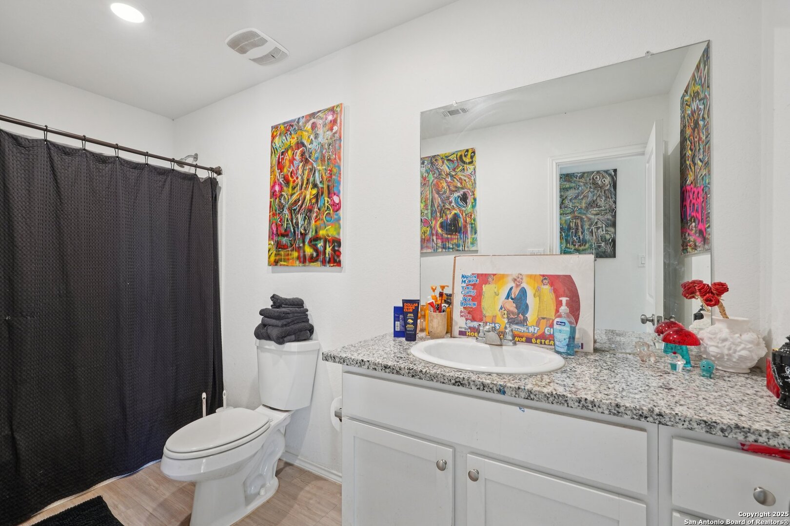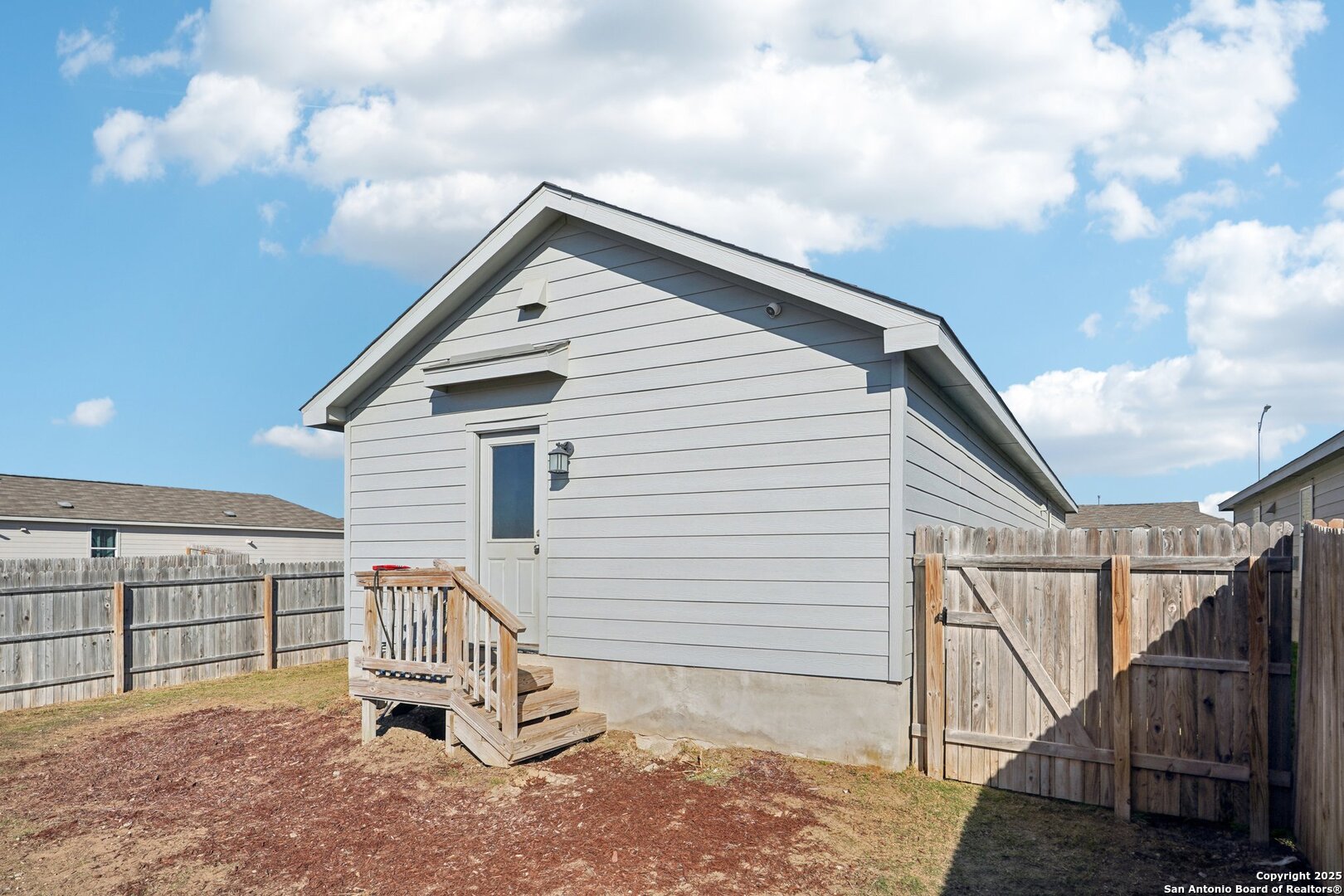 Enjoy low maintenance living at this darling home on a corner lot that backs up to a greenbelt. 4.7 VA assumable rate. Located near Hwy 90 and 211 in the popular Silos community with a gorgeous pool, playground, BBQ area, clubhouse, and fitness center. This lovely home is like-new with an open floor plan, 3 bedrooms, 2 full baths, and vinyl plank flooring throughout with zero carpet. The kitchen includes granite counters, stainless steel appliances, and gas cooking. Enjoy your spacious primary bedroom with dual closets, a full bathroom with granite counters, and easy access to the back yard for your furry friends. There's room for everyone with 2 additional bedrooms, a 2nd full bathroom, and laundry room in the hall. Washer/dryer, refrigerator, and water softener included. Only minutes from Lackland AFB, Loop 410, Loop 1604, Sea World, Costco, HEB, and dining nearby.