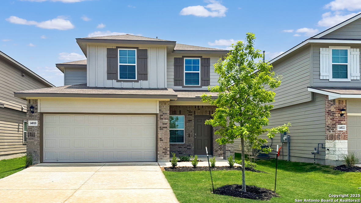 Introducing The Hanna, a two-story home featuring 4 bedrooms, 2.5 baths, and a 2-car garage in Riverstone at Westpointe, a new home community in San Antonio, TX. Here you will find a beautiful open-concept layout with 2042 square feet of functional living space. Your kitchen, dining area and family room blend together seamlessly with plenty of room for everyday living as well as plenty of natural light from the large windows. The gourmet kitchen includes granite counter tops, stainless steel appliances, shaker style cabinetry and a kitchen island overlooking the living area. The main bedroom suite is downstairs and features quality carpet flooring and an attached bathroom complete with separate water closet, granite vanity counter top, tiled walk-in shower and a large walk-in closet. The second story includes a full bathroom, a game room, and all secondary bedrooms. Whether these rooms become bedrooms or other bonus spaces, there is sure to be comfort. Additional features of The Hanna floor plan include sheet vinyl flooring in entry, living room, and all wet areas, granite bathroom counter tops throughout the home, and rear covered patio (per plan) over looking full yard landscaping and irrigation. This home includes our HOME IS CONNECTED base package. Using one central hub that talks to all the devices in your home, you can control the lights, thermostat and locks, all from your cellular device.