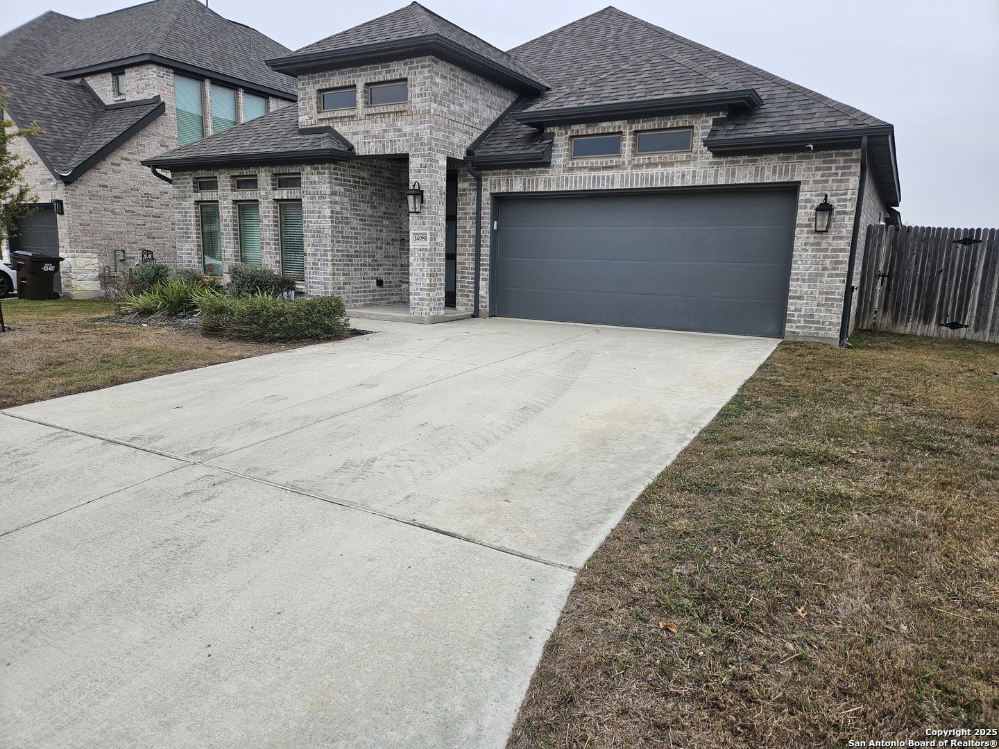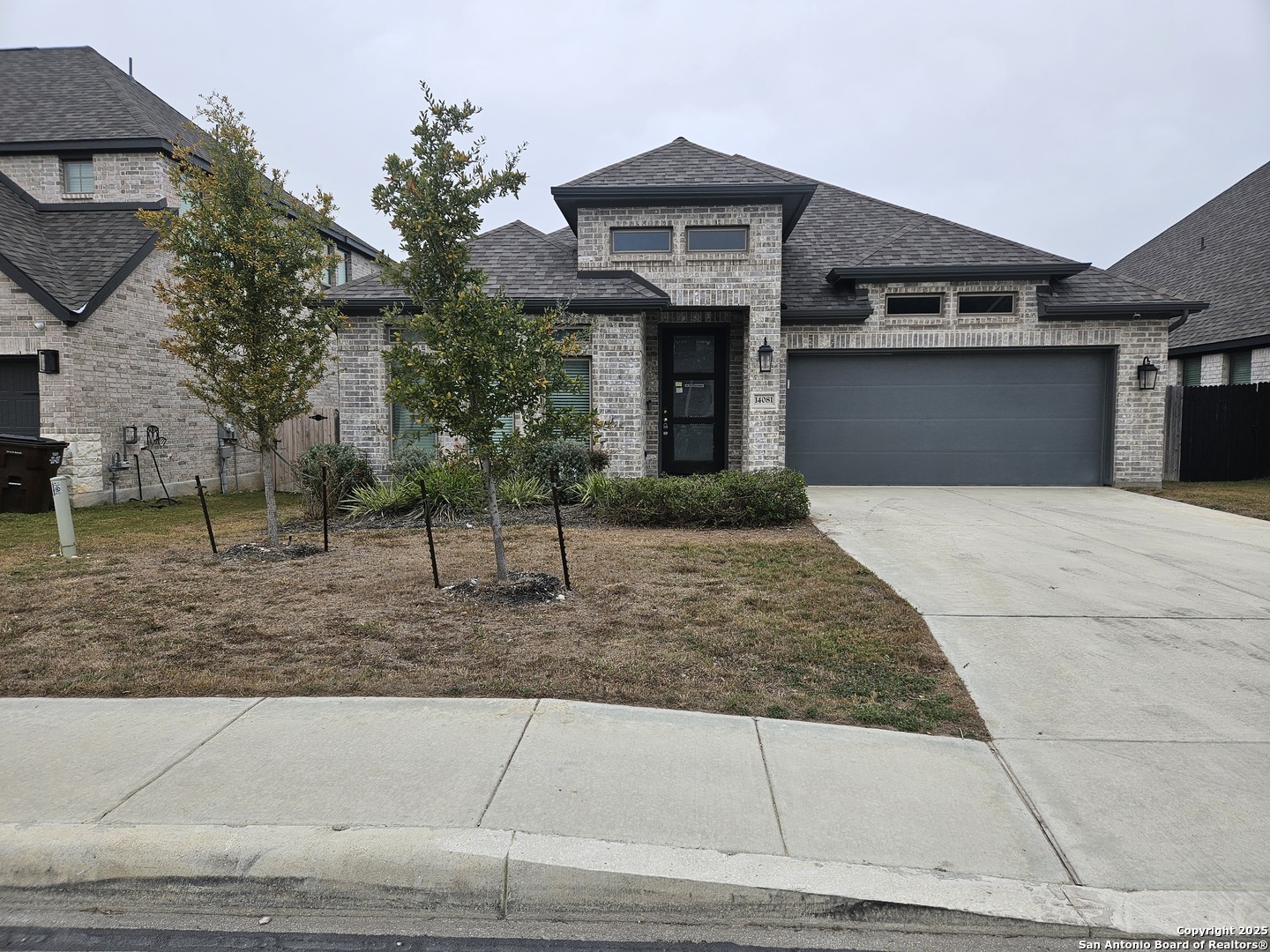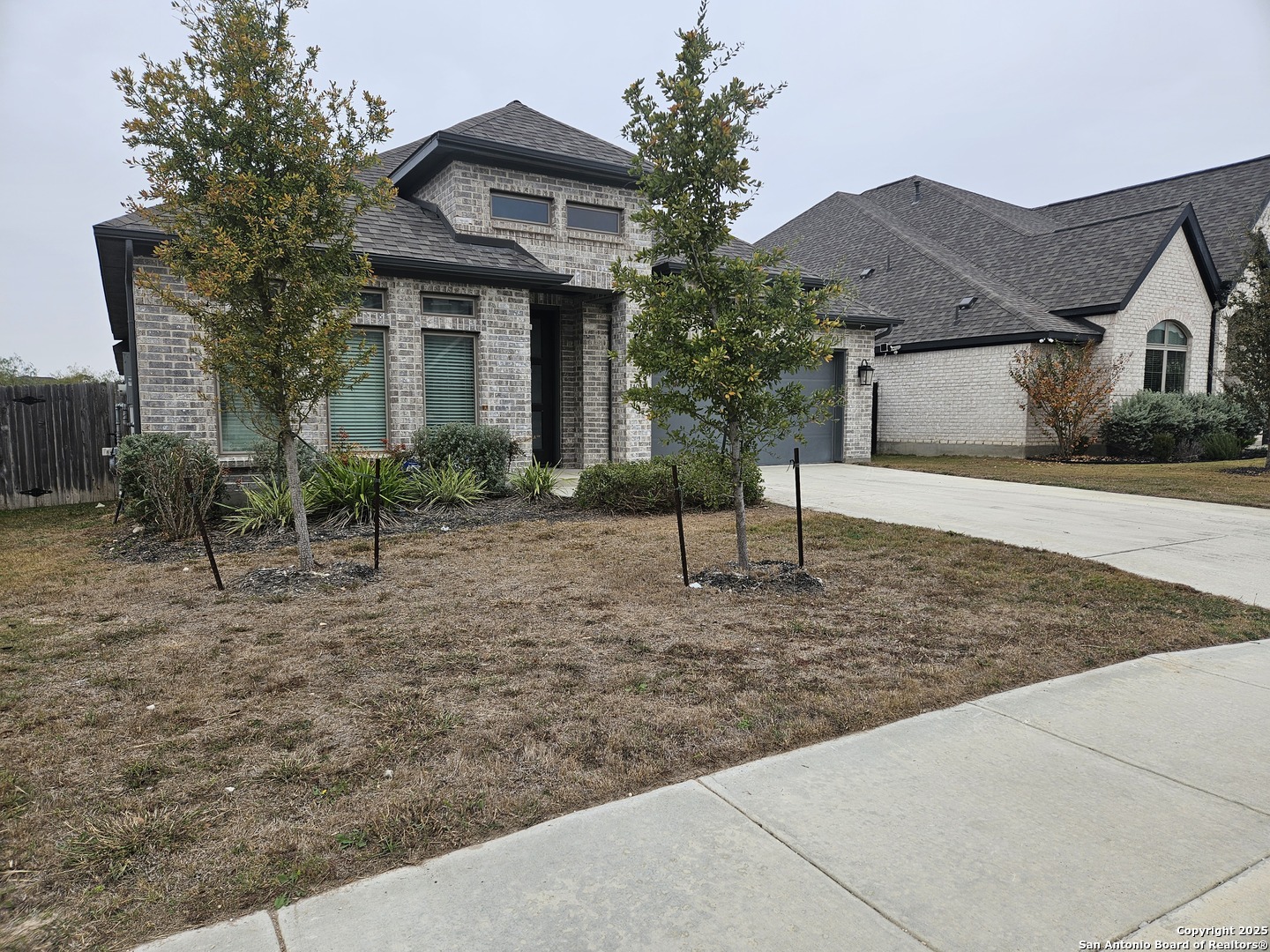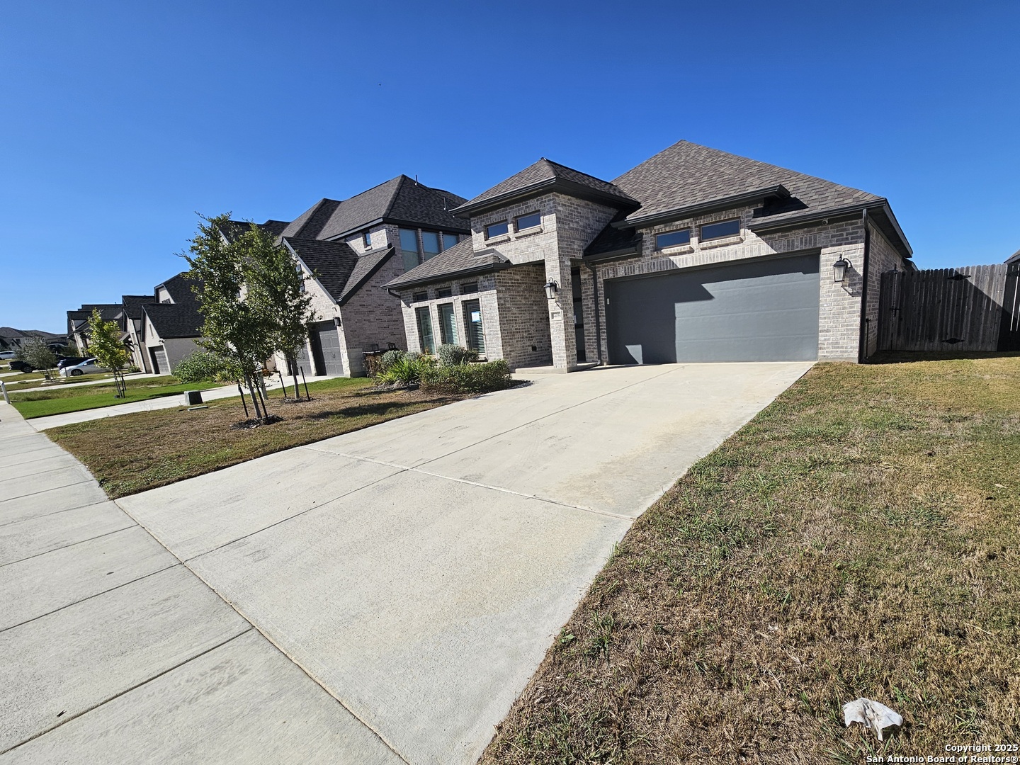 Home features 13-foot ceilings framed by game room with French doors. Extended entry flows to the kitchen and dining area. Island kitchen with built-in seating space and a corner walk-in pantry. Family room with a wall of windows. Secluded primary suite. Primary bath offers dual vanities, garden tub, separate glass enclosed shower and two walk-in closets. Guest suite with a full bathroom and a walk-in closet. Secondary bedrooms and a utility room complete this one-story design. Extended covered backyard patio. Mud room just off the garage.