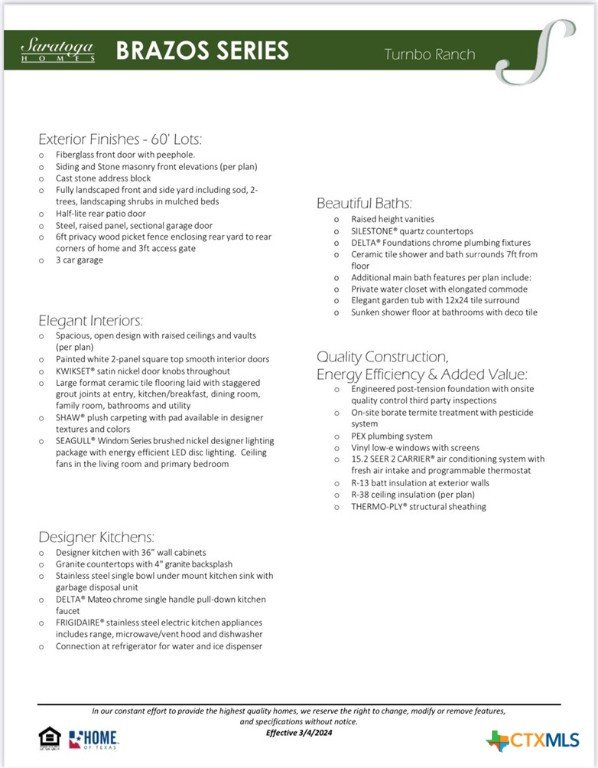 Welcome to a one of a kind , Brand new Saratoga Home offering a 60 foot lot, 2 Car Garage in Killeen at an affordable price! Discover the perfect blend of luxury and comfort in this brand-new, four-bedroom, three and a half bathroom home located in the beautiful brand new Turbo Ranch Subdivision!! This inviting residence provides exquisite granite countertops in the kitchen, elegant tile flooring, plush carpet, with a host of impressive upgrades that elevate your living experience! Don’t miss the opportunity to make this dream home yours!