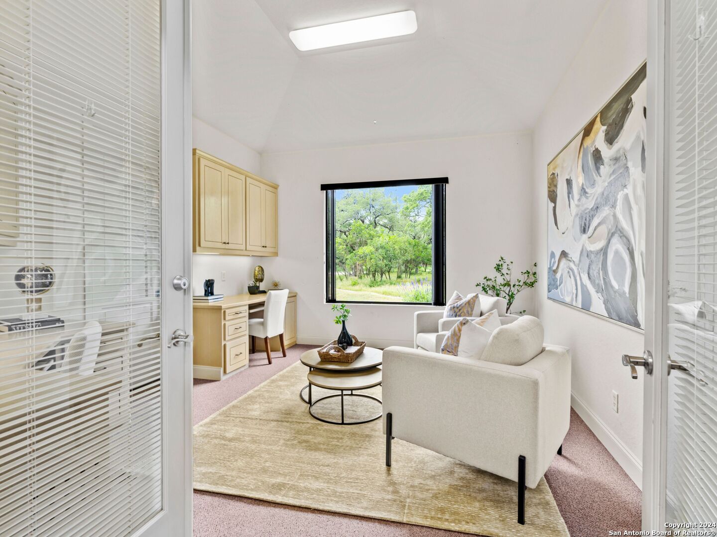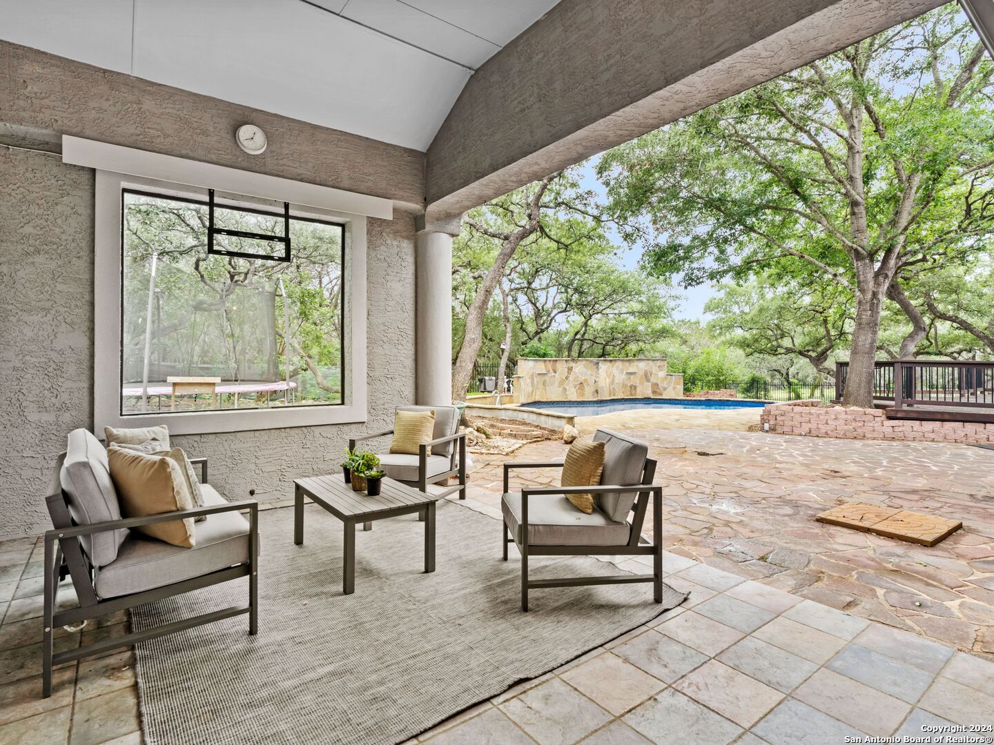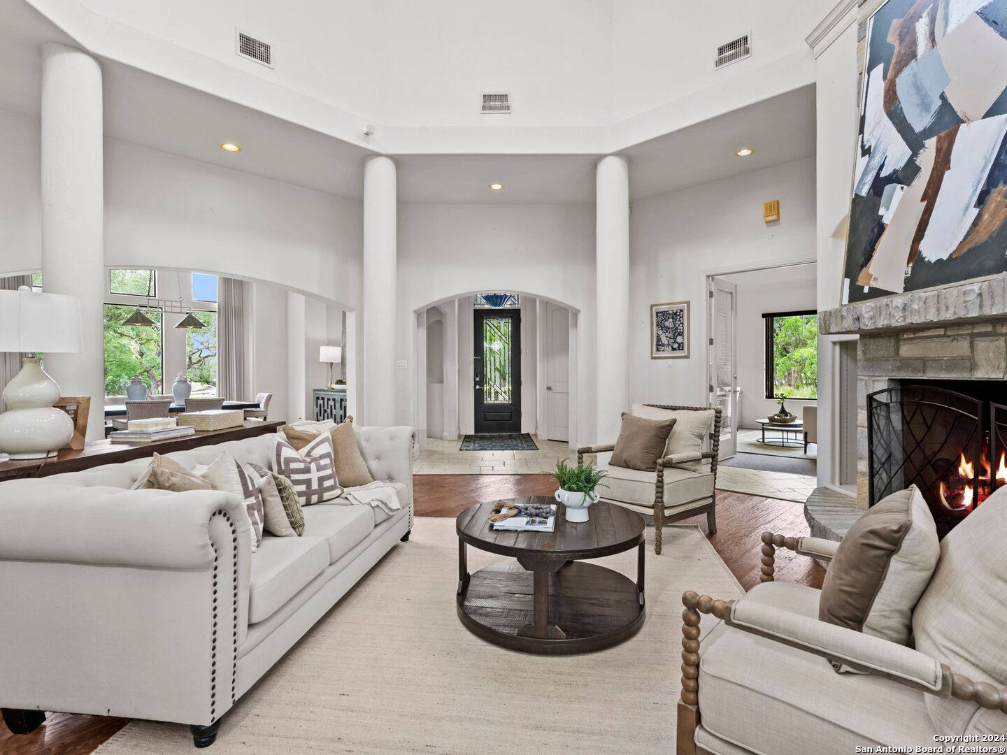 Welcome to your dream retreat nestled within the prestigious gated community of River Forest in New Braunfels. This stunning property that has been recently updated offers an unparalleled blend of luxury, functionality, and natural beauty. Step into the grandeur of this three-bedroom, two-and-a-half-bathroom home through its impressive 35-foot ceiling grand entrance and living room, where light dances through expansive windows, illuminating the spacious interior. The layout seamlessly combines elegance and comfort, with a separate dining room for formal gatherings, an office adorned with built-ins for remote work, and a versatile bonus room adaptable to your lifestyle needs. Entertainment awaits both indoors and out, with a Keith Zars pool featuring a captivating waterfall, perfect for unwinding on warm Texas afternoons. For those seeking wellness and relaxation, indulge in the 15-foot swim spa, ideal for invigorating workouts or soothing hydrotherapy sessions.The allure of outdoor living continues with access to the private river park, granting exclusive entry to the tranquil waters of the river. Spend weekends kayaking, fishing, or simply basking in the natural splendor of the surroundings. Car enthusiasts and hobbyists will delight in the amenities this property offers, including a three-car garage for ample storage, a 20x30 workshop for creative endeavors, and a greenhouse. The expansive yard provides ample space for outdoor activities and gardening. Additional features include a reverse osmosis system, a water softener, kitchen ice maker, and a central vacuum. Experience the epitome of luxury living in this unique home within River Forest, where every detail has been meticulously crafted to create a haven you'll never want to leave.