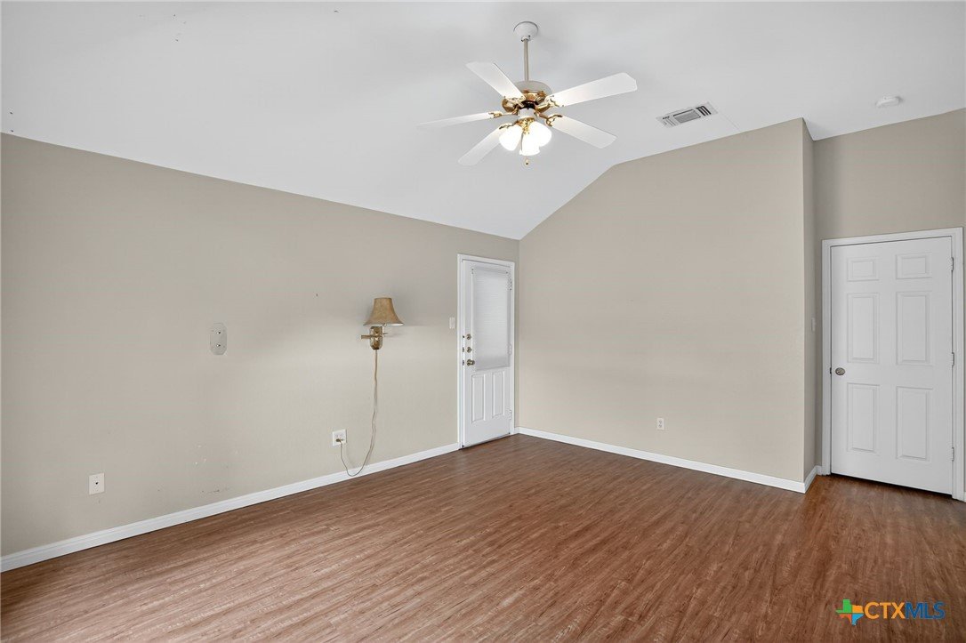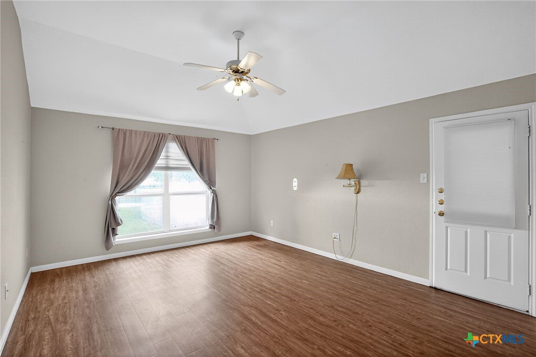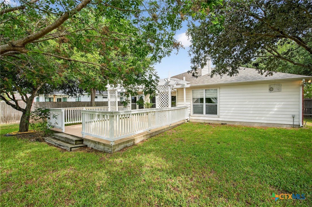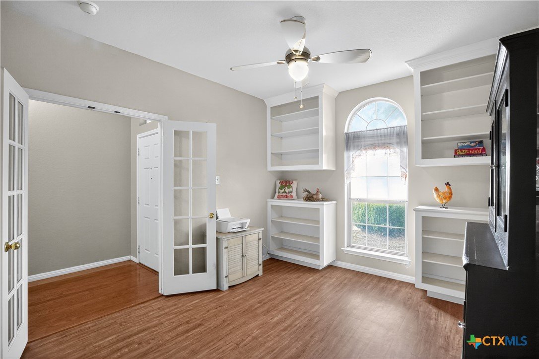Welcome to this beautiful 4-bedroom, 2-bath home -offering the option to use the fourth bedroom as a private office complete with built-ins. Designed with an open floor plan and high ceilings, this home feels bright, spacious, and perfect for both everyday living and entertaining. The inviting living room features a cozy fireplace, while the well-appointed kitchen offers an island, plenty of counter space, and a large dining area. A convenient utility room provides ample storage to keep everything organized. The primary suite is a true retreat with a full bath including double vanities, a handicap-accessible walk-in shower, and a generous walk -in closet. An enclosed sunroom connects directly to both the backyard and the primary suite-perfect for enjoying morning coffee or evening relaxation. Step outside to the rear porch with a charming trellis cover and extended patio. The backyard is shaded with mature trees, sidewalks for each access, and plenty of room for gatherings or play. Additional highlights include a 2-car garage, no HOA, and a fantastic location within Lockhart. This thoughtfully designed home combines comfort, function, and style-ready for its next owners to enjoy. Verify Schools.