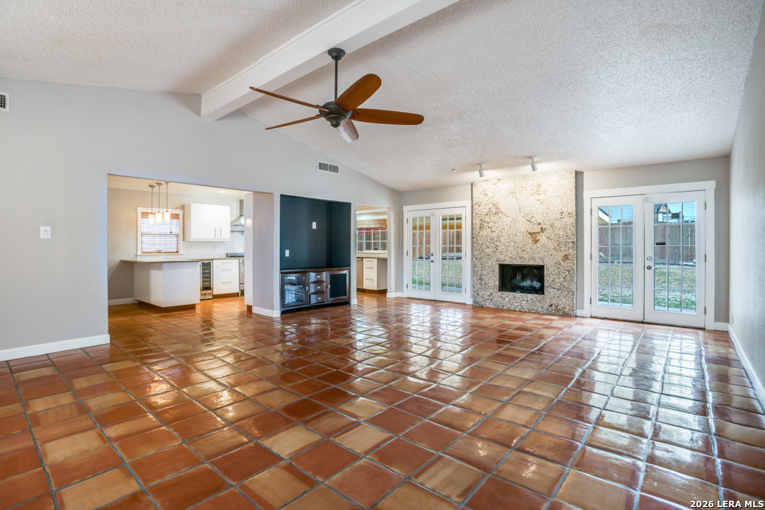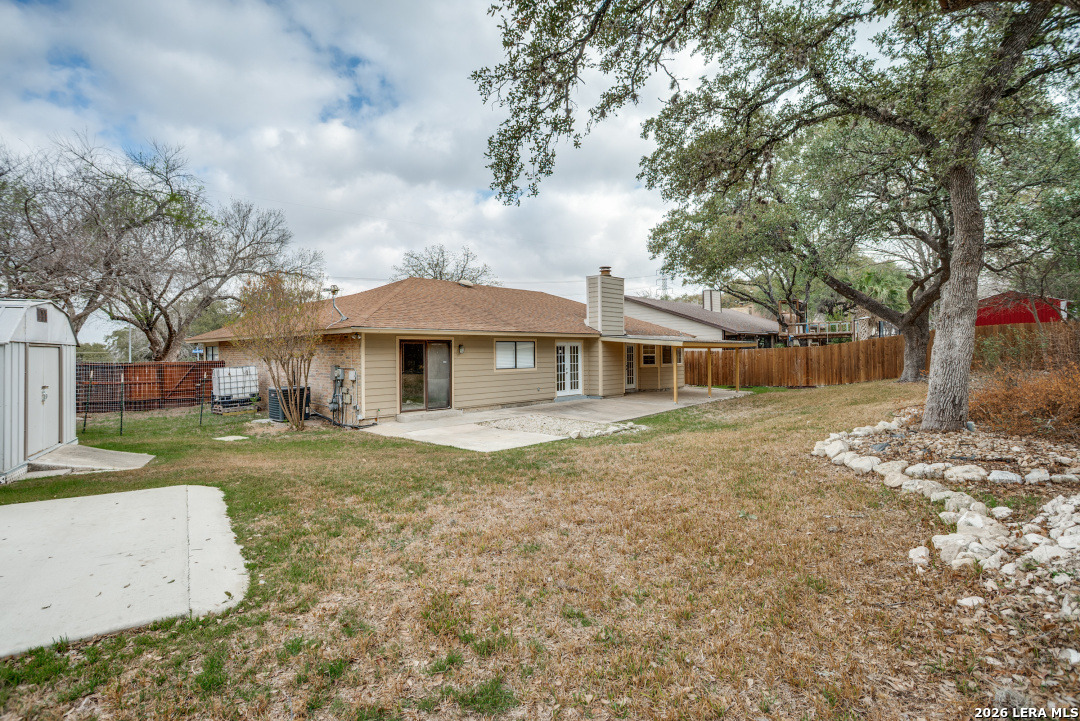 Well kept one story home sitting on .29 corner lot with beautiful mature trees and professionally landscaped. This home offers double door entrance and opens to a open and inviting living room , check out the granite gas fireplace with vaulted ceilings in the living area. The entire kitchen offers a white cabinets, appliances, fixtures, white beadboard ceiling, wine refrigerator and bright and enticing windows in kitchen, This home offers saltillo tile throughout w/carpet in bedrooms. The large back covered patio over looks the oversized yard with sprinkler system front & back, drip system in front flower beds and two storage sheds. The back patio is perfect for those family get together. Great neighborhood . AGENTS please note the Supra lock box is locate front of the home right hand side on water faucet.