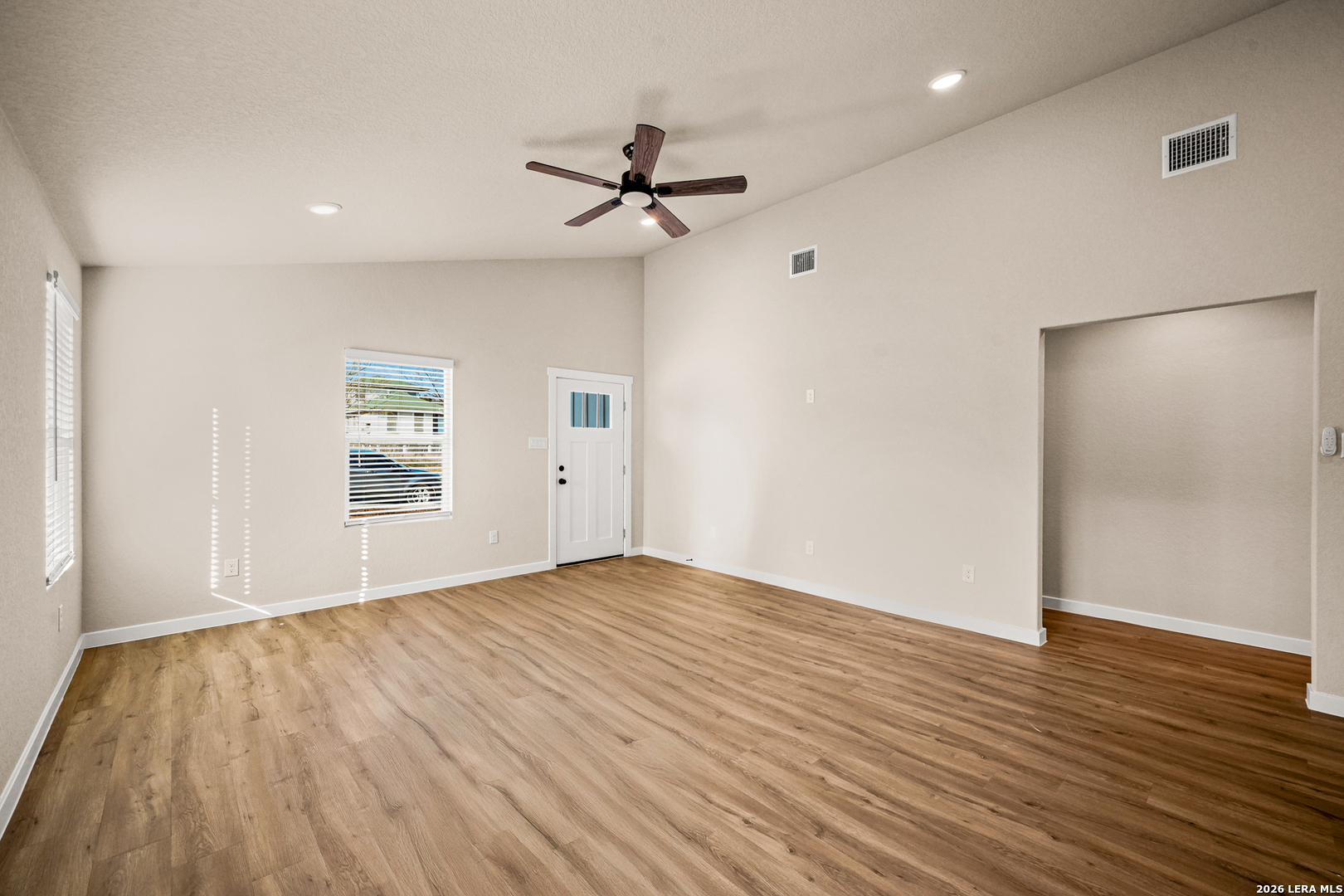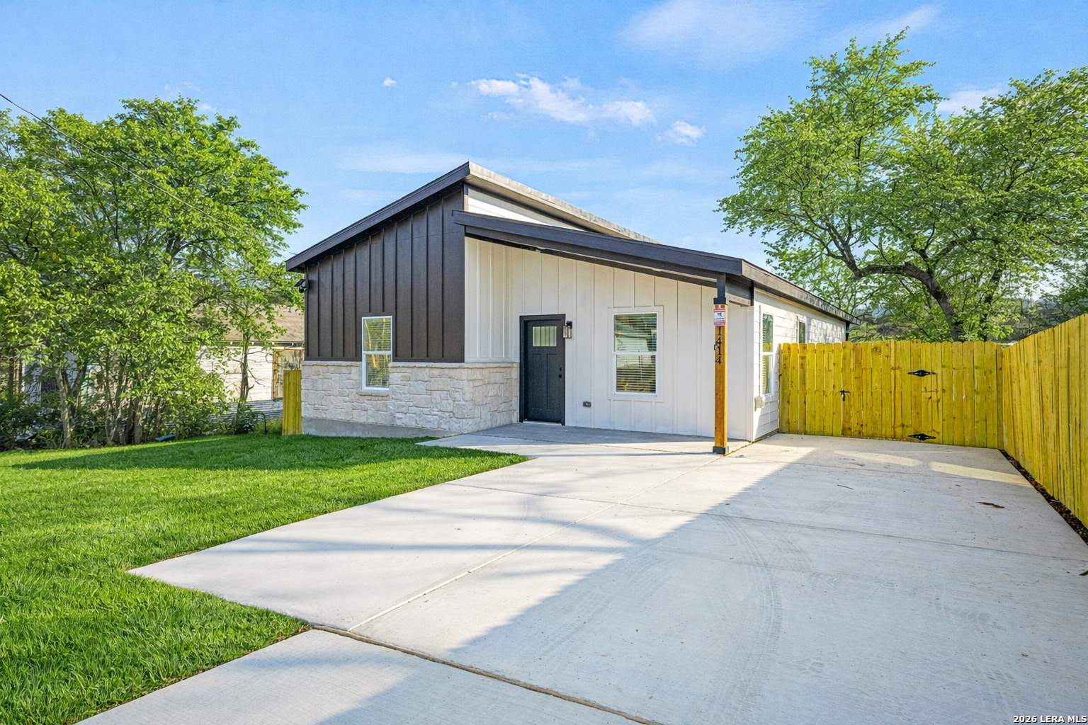 Experience the pinnacle of modern living in this newly constructed mid-century modern home, thoughtfully designed to blend timeless aesthetics with contemporary functionality. Located on San Antonio's revitalizing East Side near the E. Houston corridor, this home offers the perfect balance of urban convenience and neighborhood charm just minutes from Downtown San Antonio, major highways including I-35 and I-10, and a short drive to the historic Pearl district and the River Walk. Residents enjoy close proximity to local parks, community spaces, and ongoing area investment that continues to bring new energy and opportunity to this growing part of the city. This residence features three spacious bedrooms and two well-appointed bathrooms, offering ample space for comfort and privacy. With no Homeowners Association (HOA) fees and a 2-10 Builder Warranty included, you can enjoy peace of mind and greater freedom in your new home. The exterior boasts inviting front and rear covered patios, perfect for relaxing or entertaining guests. Inside, the open floor plan is accentuated by vaulted ceilings, allowing natural light to flood the living spaces and create an airy, welcoming atmosphere. Durable vinyl flooring extends throughout the main areas, while plush carpeting in the bedrooms adds a touch of coziness. Two-inch faux wood blinds provide both style and privacy. The chef's kitchen is a culinary dream, equipped with 42-inch soft-close cabinets, granite countertops, and stainless steel appliances, including a stove, microwave, dishwasher, and disposal. Each room features 9-foot ceilings, enhancing the home's spacious feel. The primary bedroom serves as a private retreat, complete with an oversized closet offering generous storage space and full bath. This property also features a large double driveway providing ample parking, a new fence surrounding the entire yard, and a covered patio with railing ideal for outdoor gatherings. This exceptional property is a rare find in a rapidly growing area. Schedule your private tour today to experience firsthand what makes this home and its vibrant East Side location, truly special.