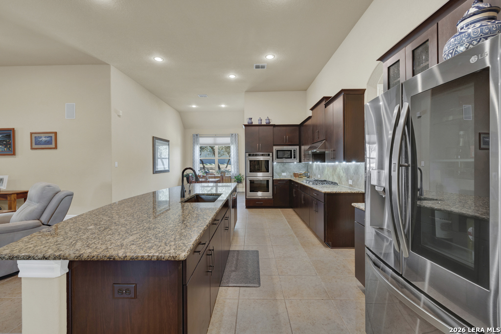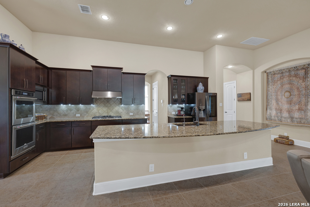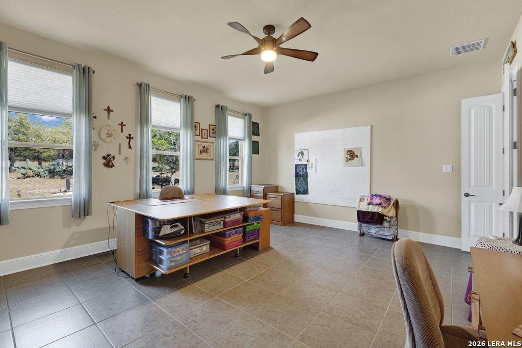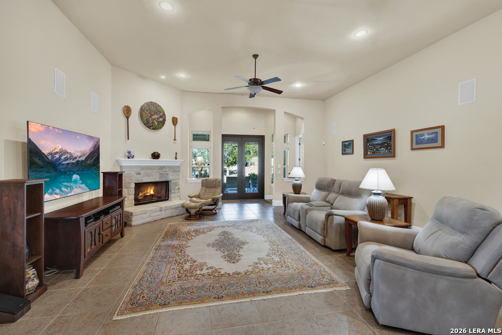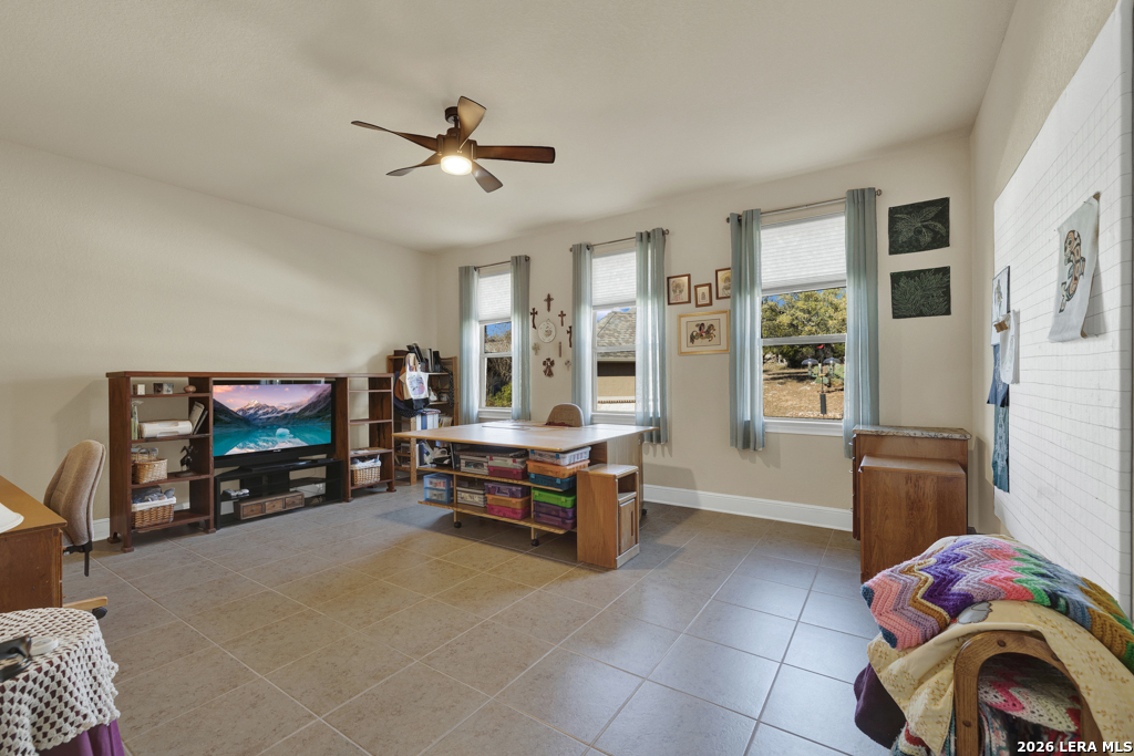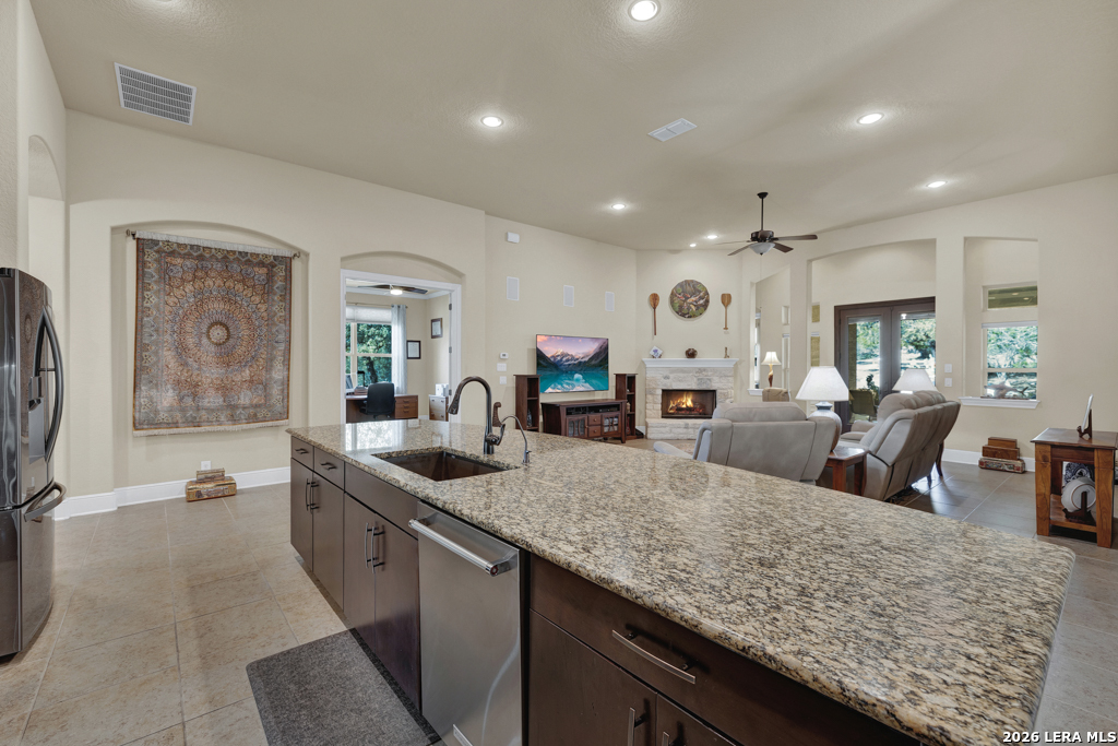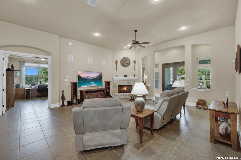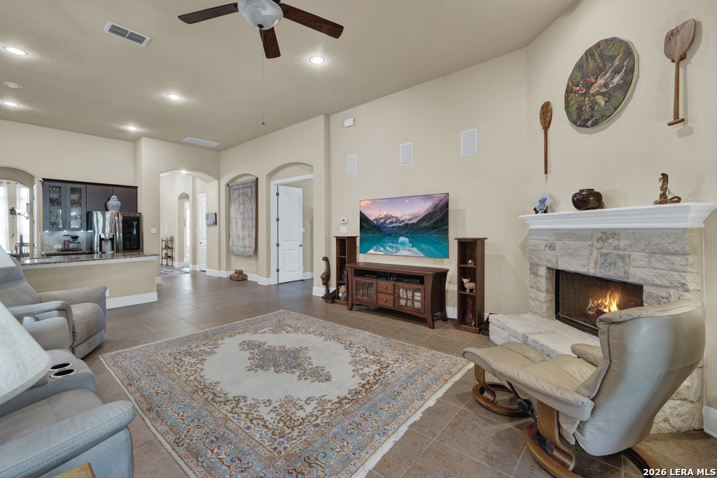 Stunning 4-bedroom, 3-bath home offering 3,161 sq. ft. of beautifully designed living space with soaring ceilings and an open, flowing floor-plan ideal for everyday comfort and effortless entertaining. The gourmet kitchen features a double-wide island with breakfast bar, double oven, and stainless steel appliances. Tile flooring extends throughout the main living areas, while plush carpet adds warmth to the bedrooms. The spacious primary suite is a true retreat, featuring a luxurious walk-in shower with a rain shower head and dual shower heads for a spa-like experience. Enjoy cozy evenings by the living room fireplace or relax outdoors on the covered patio with ceiling fan, overlooking a backyard complete with a workshop and raised garden beds - perfect for hobbies, gardening, or additional storage. Thoughtful details, exceptional design, and versatile spaces make this home truly move-in ready.