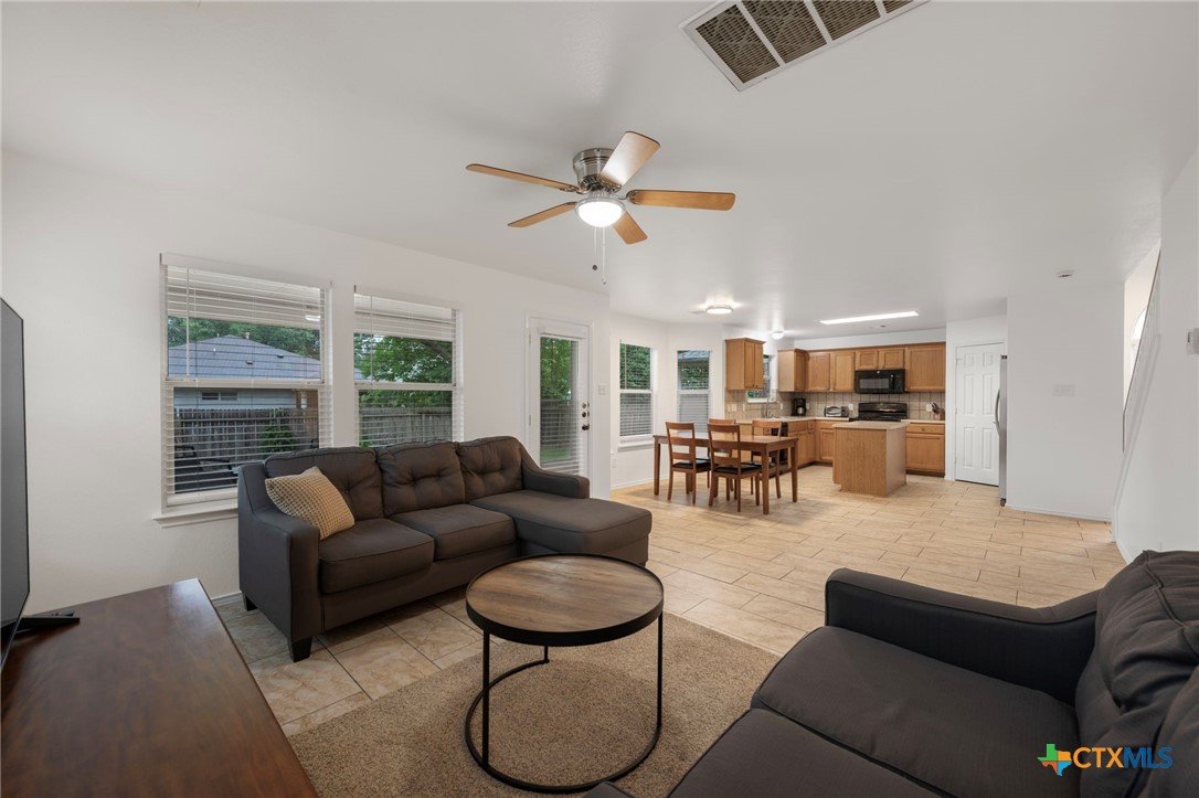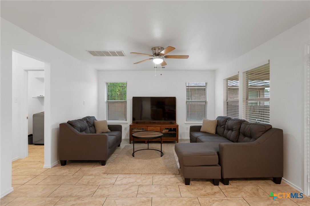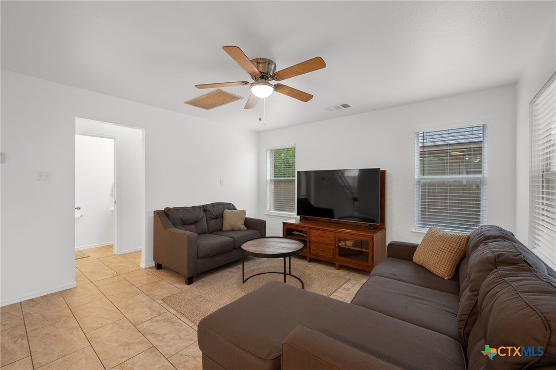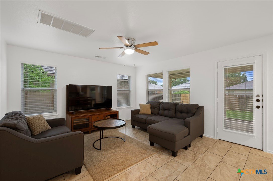 This beautifully maintained home offers comfort, space, and flexibility in every corner. With three spacious bedrooms, 2.5 bathrooms, and a generous loft that can easily serve as an office, game room, or serene yoga retreat, this layout adapts effortlessly to your lifestyle. Each bedroom comfortably fits queen-sized beds, while the expansive primary suite is a true retreat—easily accommodating a California king with room to spare for a sitting area and walk-in closet . The en suite bath features a separate tub, shower stall and private toilet room, designed with both comfort and privacy in mind. An open floor plan fills the home with natural light, and the soaring ceilings in the living area enhance the airy, welcoming ambiance. The kitchen opens to the dining and living areas, perfect for entertaining or casual gatherings, and includes a large pantry and abundant cabinetry. Enjoy the versatility of both a cozy family room and a formal living room—ideal for relaxing or hosting. Outside, the spacious backyard features a grassy area for play or gardening and a shaded patio perfect for outdoor lounging. Major updates include a new roof and HVAC system (Jan 2023), fresh interior and exterior paint (April 2025), new blinds, digital lock, vents, power outlets, repaired fencing, and new gutters (Jan 2025), ensuring modern convenience and peace of mind. This home is truly move-in ready and full of potential.