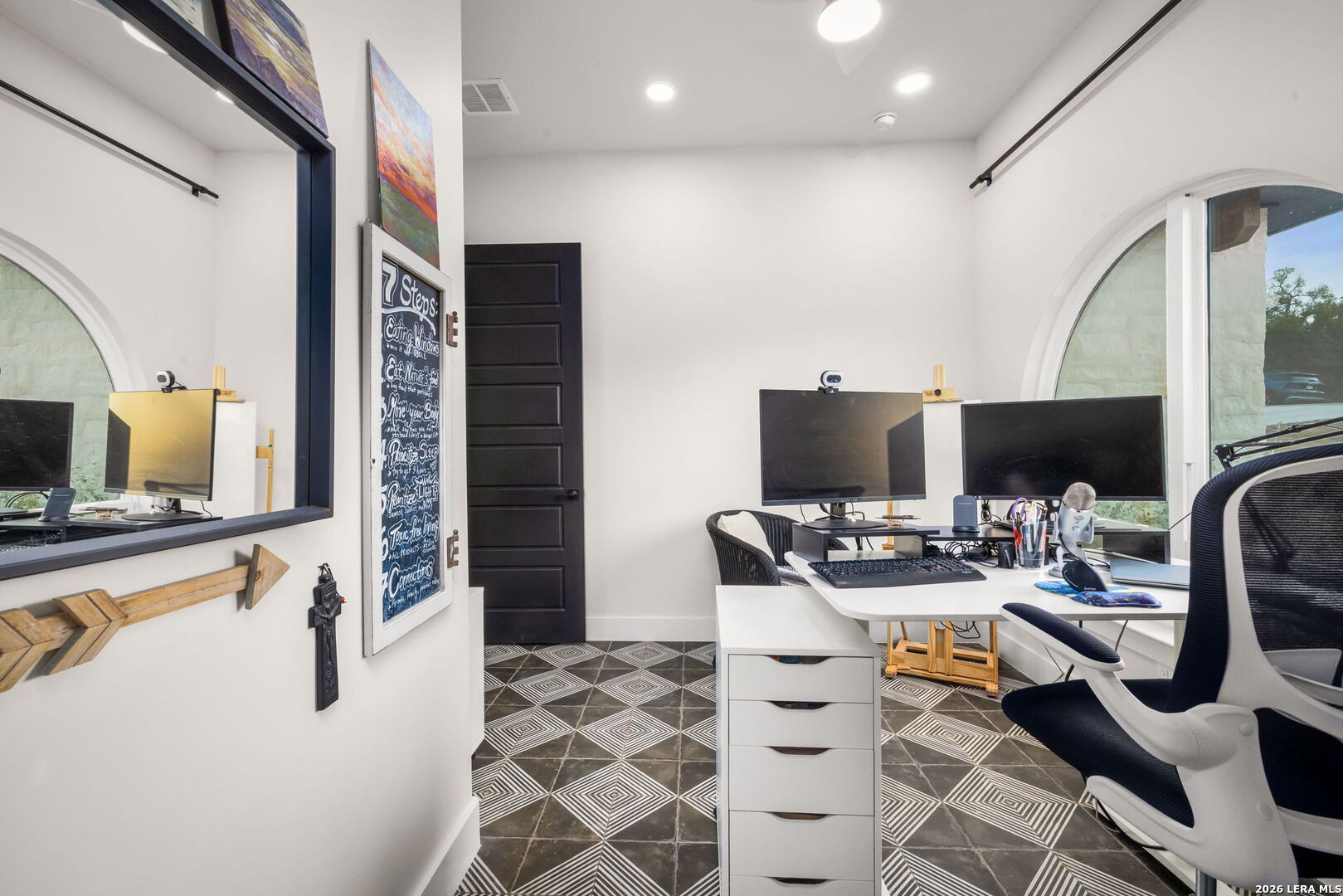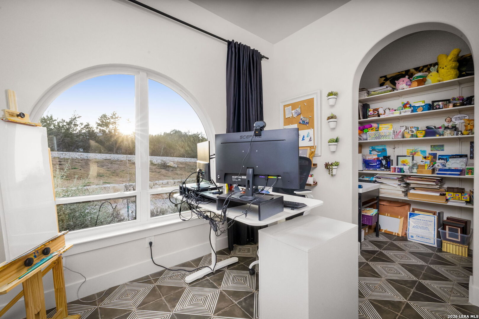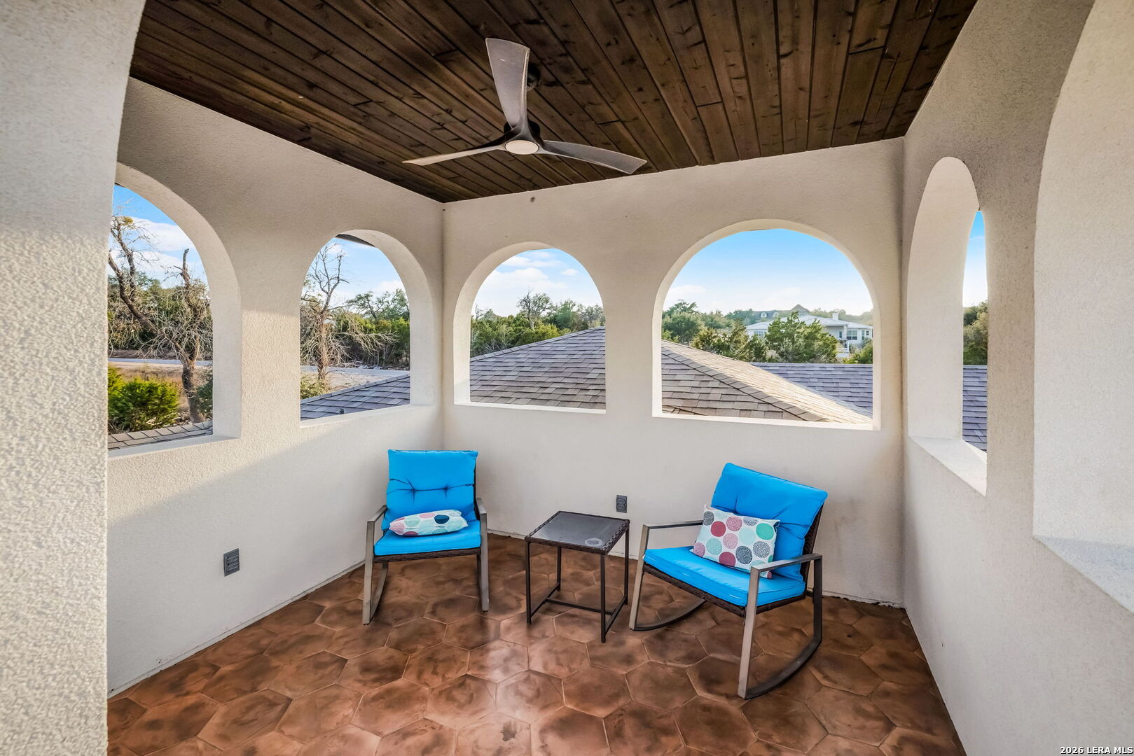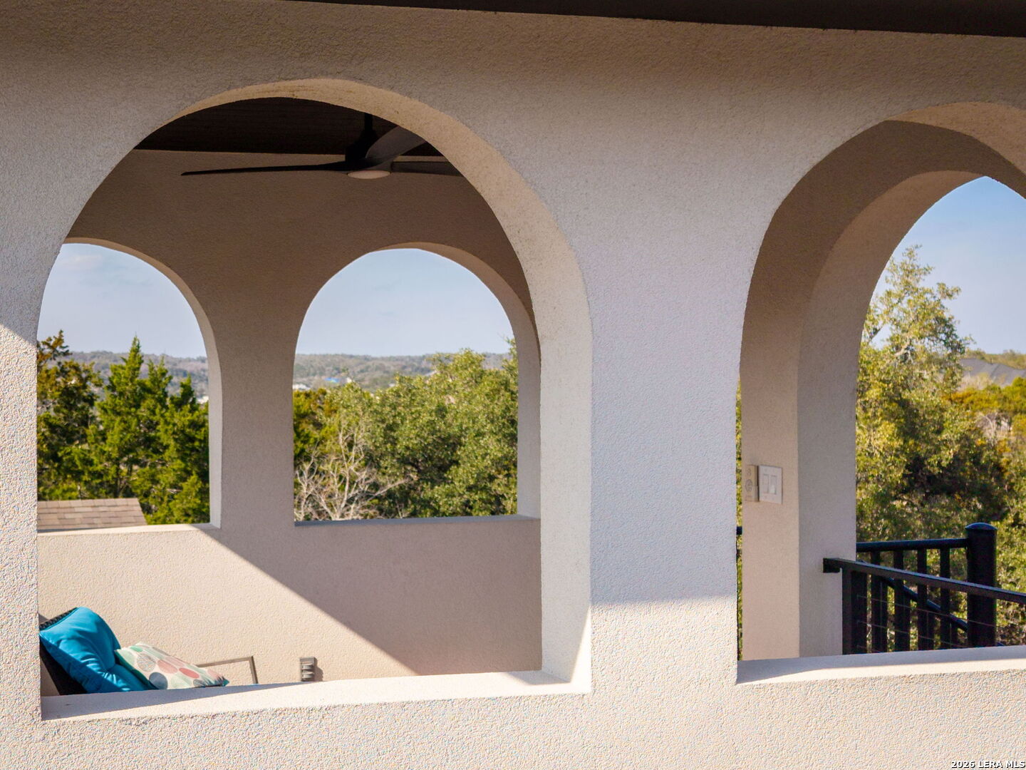 Experience refined Texas Hill Country living in this stunning 2023 KC Custom Home, located in the prestigious Vintage Oaks at the Vineyards. Offering 3,356 square feet, 4 bedrooms, and 3 bathrooms, this one-of-a-kind residence blends artisan craftsmanship with modern luxury on a beautifully landscaped, private lot. From the moment you enter, the home impresses with its Level 5 hand-troweled stucco interior walls, expansive windows, and an open-concept design flooded with natural light. The chef's kitchen is the heart of the home, featuring a GE Cafe gas range with pot filler, two dishwashers, custom cabinetry, stone countertops, a walk-in pantry, breakfast bar, and a charming breakfast nook with built-in banquette seating-perfect for both entertaining and everyday living. The living room showcases dramatic windows on two walls and a gas fireplace, creating a warm yet striking centerpiece for gatherings. The primary suite is a true retreat, highlighted by a hand-painted ceiling mural, spa-style bath with separate soaking tub and walk-in shower, and an expansive walk-in closet. Two thoughtfully designed home offices provide flexibility for work or study, including a hidden office concealed behind a custom bookcase for privacy and security. A media room offers the perfect space for movie nights or game days, while the laundry room with dog wash station and dog door leads directly to a dedicated outdoor dog run for ultimate convenience. Outdoor living is elevated with a large, covered patio surrounded by lush vegetation for exceptional privacy. A spiral staircase leads to a second-story outdoor "nest", ideal for enjoying peaceful mornings and sweeping Hill Country views. Completing the property is an oversized two-car garage plus a dedicated golf cart bay, perfect for taking full advantage of the community. Located within Vintage Oaks, residents enjoy world-class amenities including resort-style pools, clubhouse, fitness center, miles of hiking trails, sports courts, and vibrant social activities-all just minutes from New Braunfels, wineries, dining, and shopping. This extraordinary home offers a rare combination of custom design, luxury finishes, privacy, and Hill Country charm-a true statement property in one of the area's most sought-after communities.