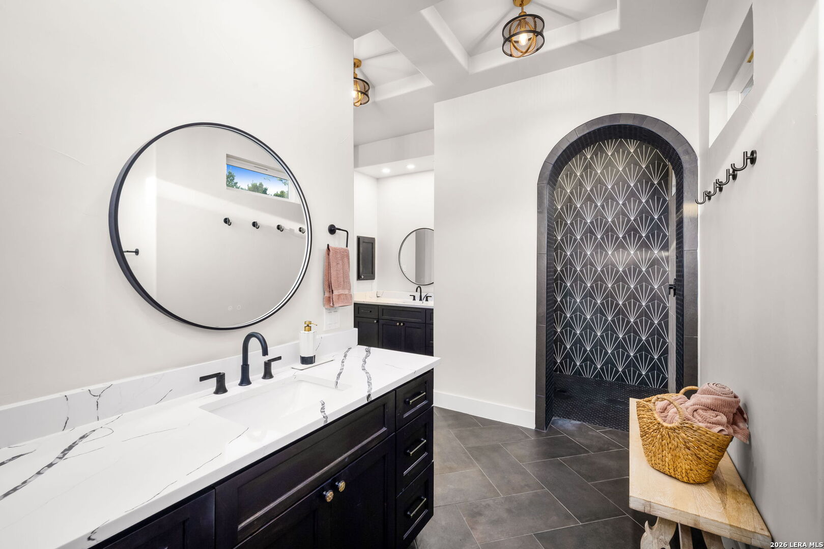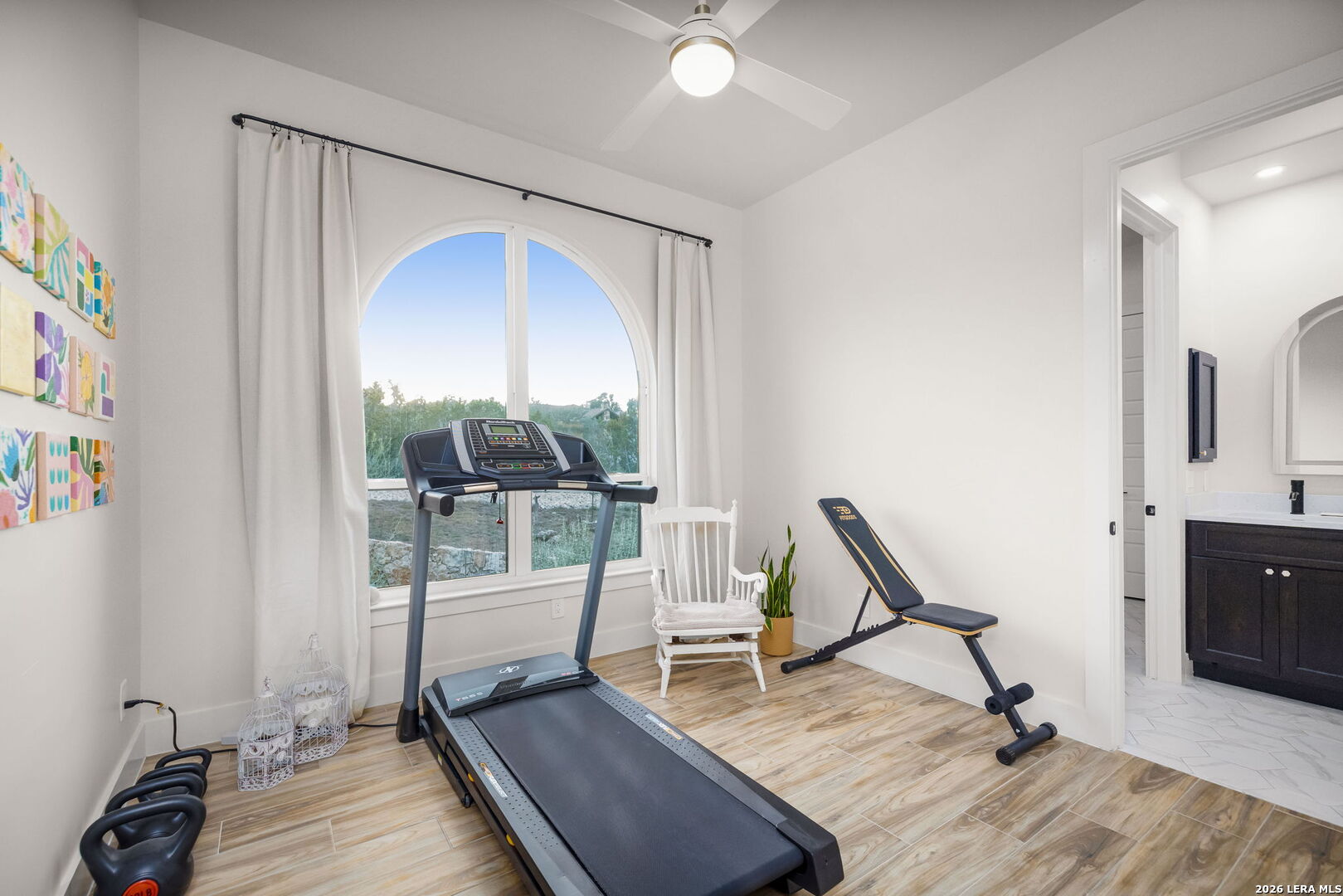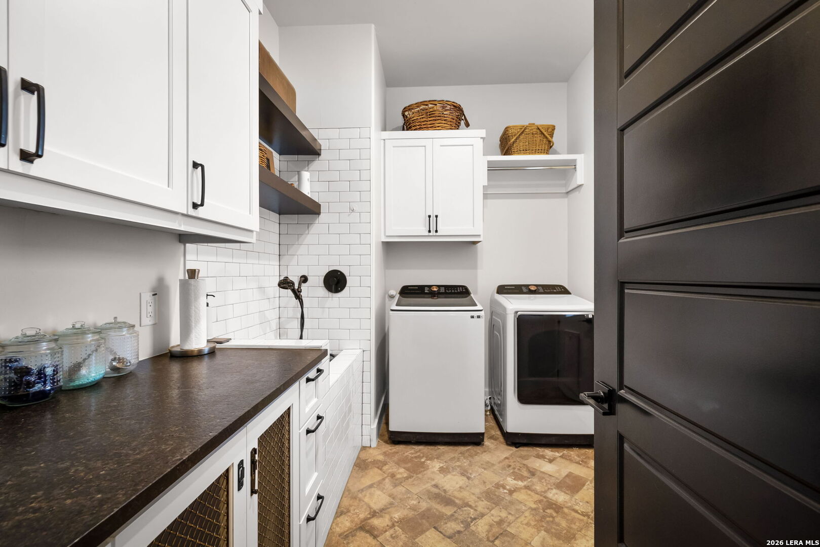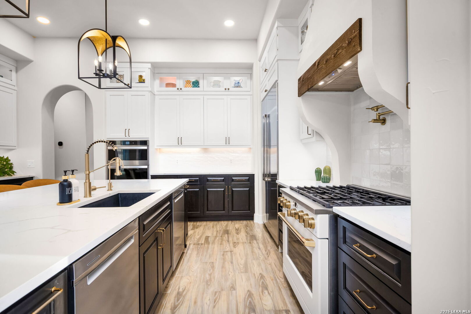 Experience refined Texas Hill Country living in this stunning 2023 KC Custom Home, located in the prestigious Vintage Oaks at the Vineyards. Offering 3,356 square feet, 4 bedrooms, and 3 bathrooms, this one-of-a-kind residence blends artisan craftsmanship with modern luxury on a beautifully landscaped, private lot. From the moment you enter, the home impresses with its Level 5 hand-troweled stucco interior walls, expansive windows, and an open-concept design flooded with natural light. The chef's kitchen is the heart of the home, featuring a GE Cafe gas range with pot filler, two dishwashers, custom cabinetry, stone countertops, a walk-in pantry, breakfast bar, and a charming breakfast nook with built-in banquette seating-perfect for both entertaining and everyday living. The living room showcases dramatic windows on two walls and a gas fireplace, creating a warm yet striking centerpiece for gatherings. The primary suite is a true retreat, highlighted by a hand-painted ceiling mural, spa-style bath with separate soaking tub and walk-in shower, and an expansive walk-in closet. Two thoughtfully designed home offices provide flexibility for work or study, including a hidden office concealed behind a custom bookcase for privacy and security. A media room offers the perfect space for movie nights or game days, while the laundry room with dog wash station and dog door leads directly to a dedicated outdoor dog run for ultimate convenience. Outdoor living is elevated with a large, covered patio surrounded by lush vegetation for exceptional privacy. A spiral staircase leads to a second-story outdoor "nest", ideal for enjoying peaceful mornings and sweeping Hill Country views. Completing the property is an oversized two-car garage plus a dedicated golf cart bay, perfect for taking full advantage of the community. Located within Vintage Oaks, residents enjoy world-class amenities including resort-style pools, clubhouse, fitness center, miles of hiking trails, sports courts, and vibrant social activities-all just minutes from New Braunfels, wineries, dining, and shopping. This extraordinary home offers a rare combination of custom design, luxury finishes, privacy, and Hill Country charm-a true statement property in one of the area's most sought-after communities.