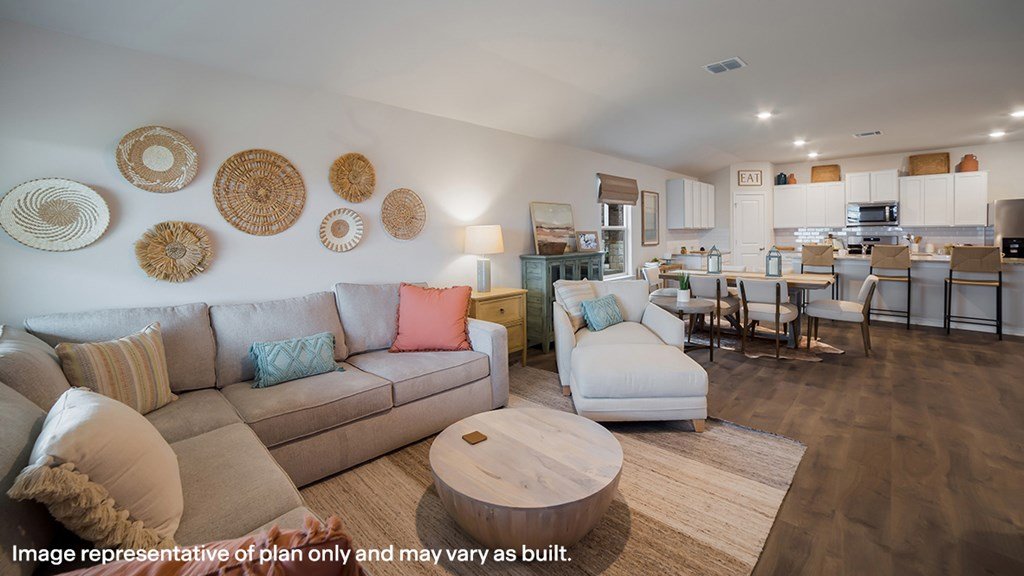 The Bryant is a stunning single-story home featured at High Garden in Comfort, TX. The Bryant is sure to impress with its selection of 3 front exteriors, 4 bedrooms, 2 bathrooms and 2-car garage. Welcome guests as they walk through the elongated foyer with a decorative nook wall feature to the spacious eat-in kitchen. Facing the blended dining area and living room, the kitchen includes an oversized island, corner pantry with shelving, plenty of cabinet storage, quartz countertops, stylish subway tile backsplash, stainless steel appliances, and a electric cooking range. The private main bedroom is located at the back of the house and features a relaxing ensuite bathroom complete with double vanities, a garden tub, walk-in shower, and a spacious walk-in closet. If privacy is your top priority, this bathroom comes standard with a separate water closet. Two secondary bedrooms are located off the entry and the other is centrally located off the kitchen. All have quality carpet, spacious closets and windows for plenty of natural lighting. Whether these rooms become bedrooms or other bonus spaces, there is sure to be comfort and functionality. Additional features include tall 9-foot ceilings, 2-inch faux wood blinds throughout the home, luxury vinyl plank flooring in the entry, family room, kitchen, and dining area, ceramic tile in the bathrooms and utility room, and pre-plumb for water softener loop. You'll enjoy added security in your new home with our Home is Connected features. Using one central hub that talks to all the devices in your home, you can control the lights, thermostat and locks, all from your cellular device. Contact us today and find your home at High Garden by clicking the text with us button or request information button. "