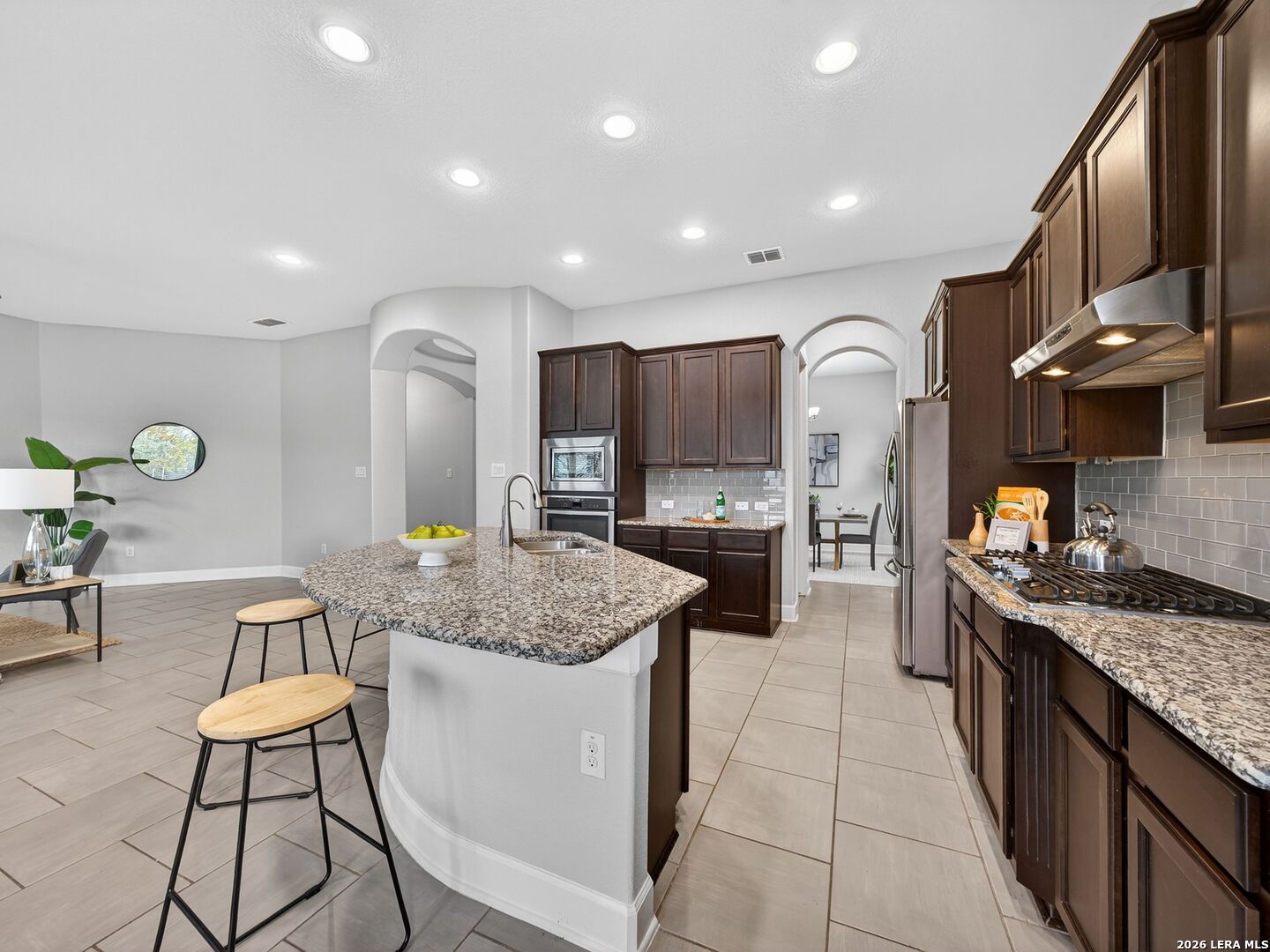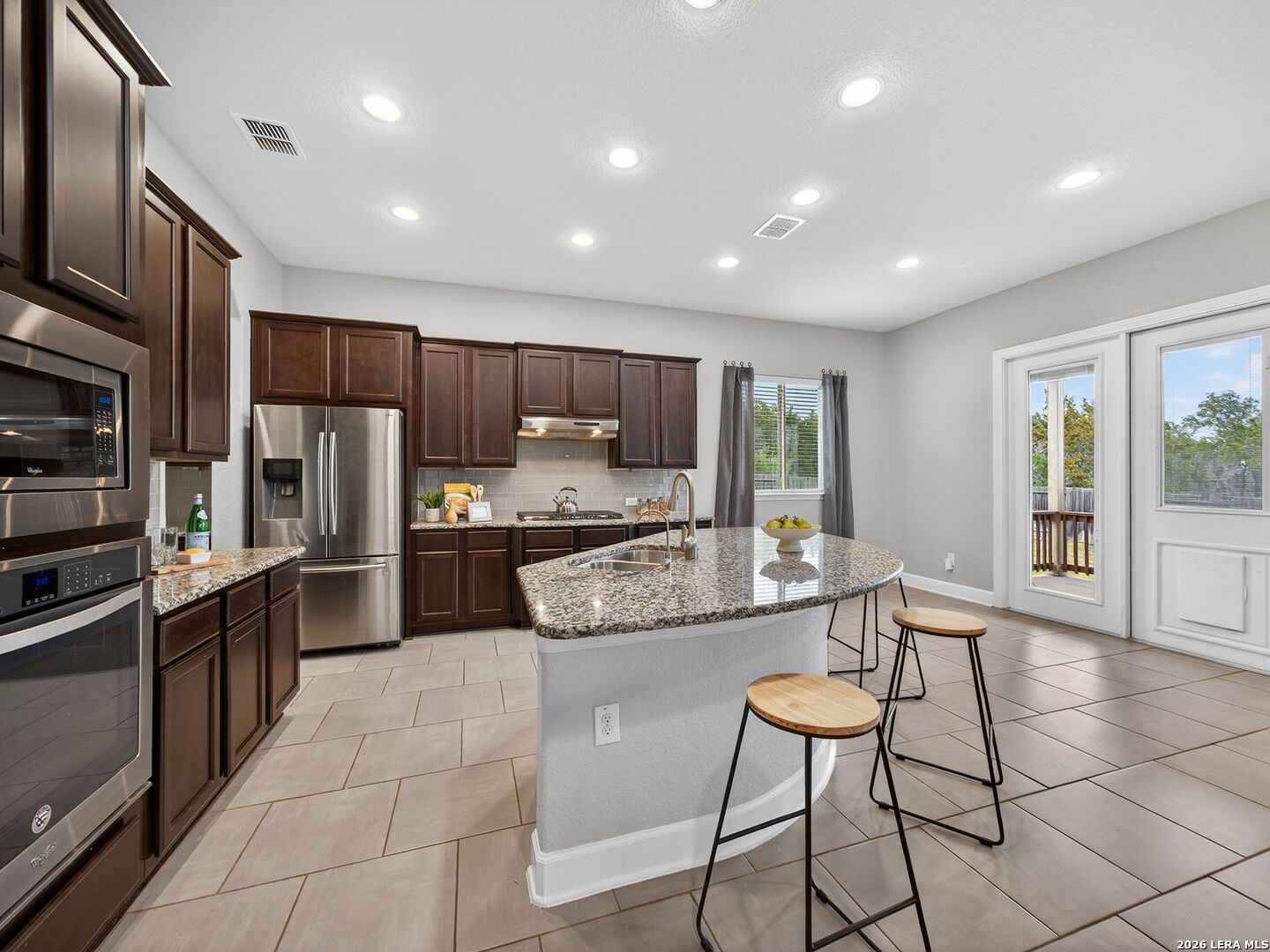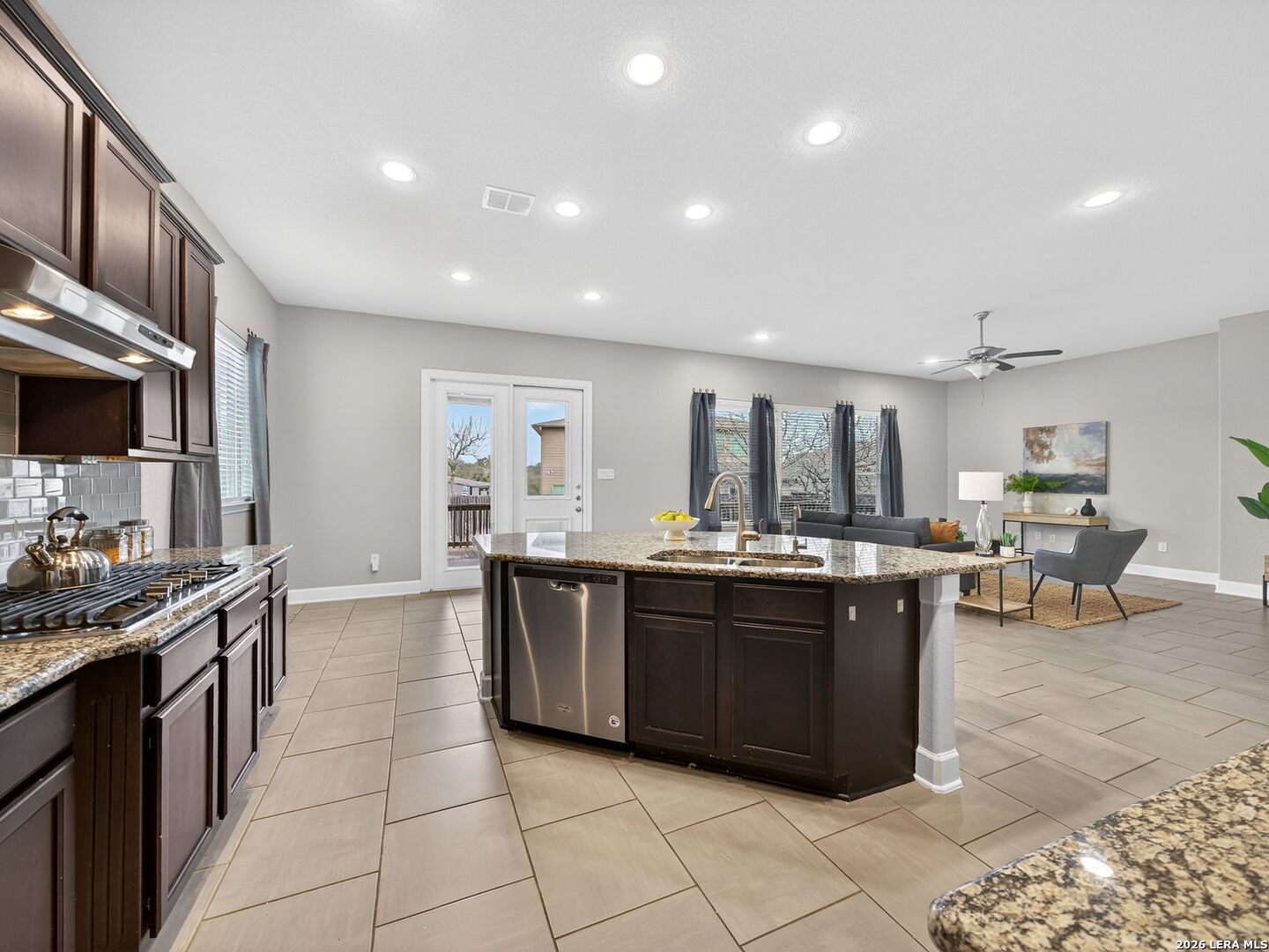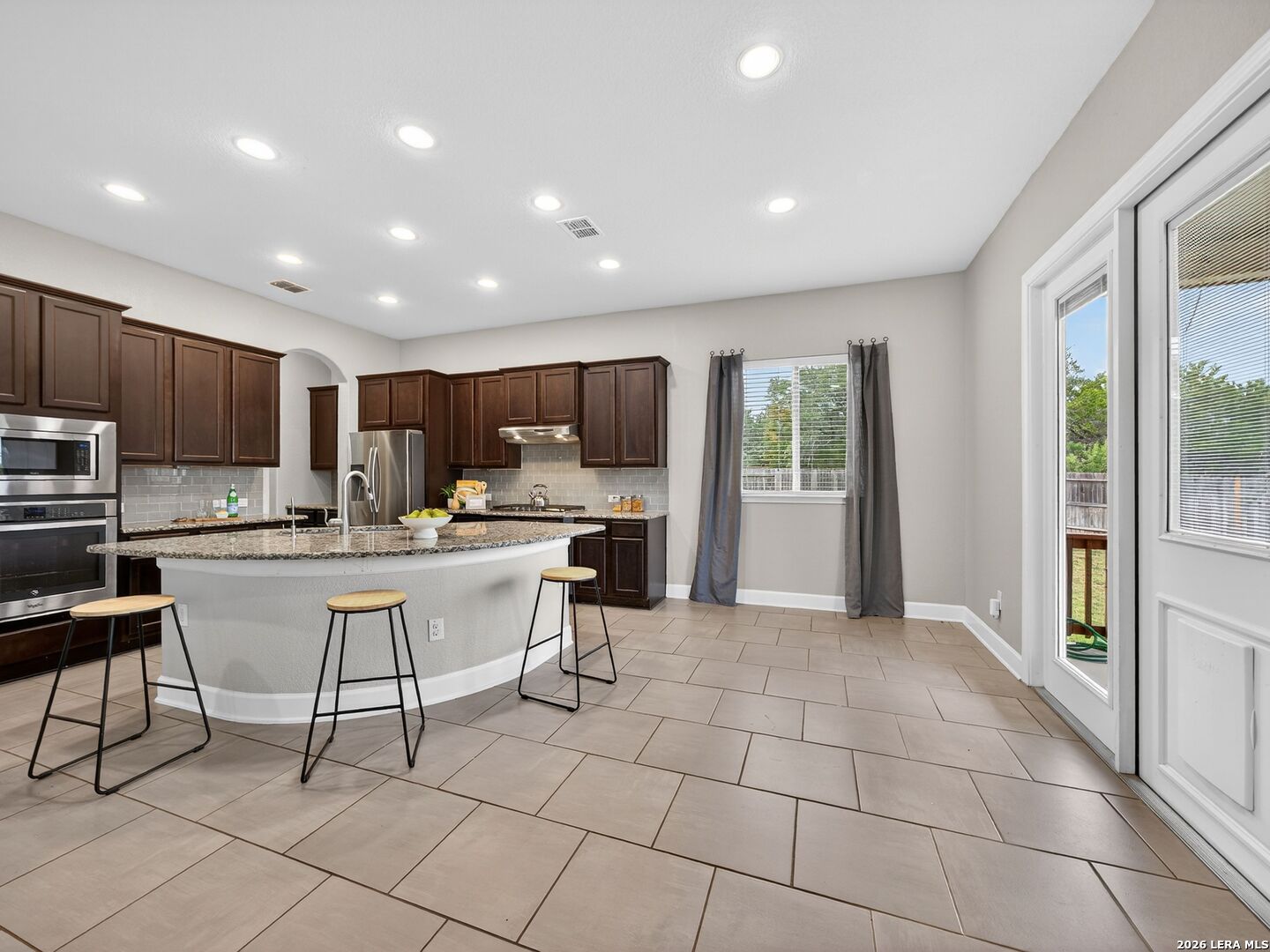 Immaculate single-story home with 3 bedrooms, an office, a formal dining room, 3 full baths, and a 3-car garage with 10-foot ceilings throughout. One secondary bedroom has an ensuite bath with Jack-and-Jill access to the office, ideal for guests or multi-generational living. The spacious living room opens to a well-appointed kitchen with stainless steel appliances, including refrigerator, GAS cooktop, built-in oven and microwave, and dishwasher. Features include wood cabinetry, a large granite island, a Butler's niche, and a walk-in pantry. The primary bath offers a double vanity, separate tub, and a shower. Enjoy the OVERSIZED backyard, with room for a pool and a huge covered patio, perfect for entertaining. Complete with a water softener and sprinkler system. Community amenities include a pool, jogging trails, and nearby schools. Convenient to Hwy 211, Hwy 90, Loop 1604, Lackland AFB, shopping, and dining.