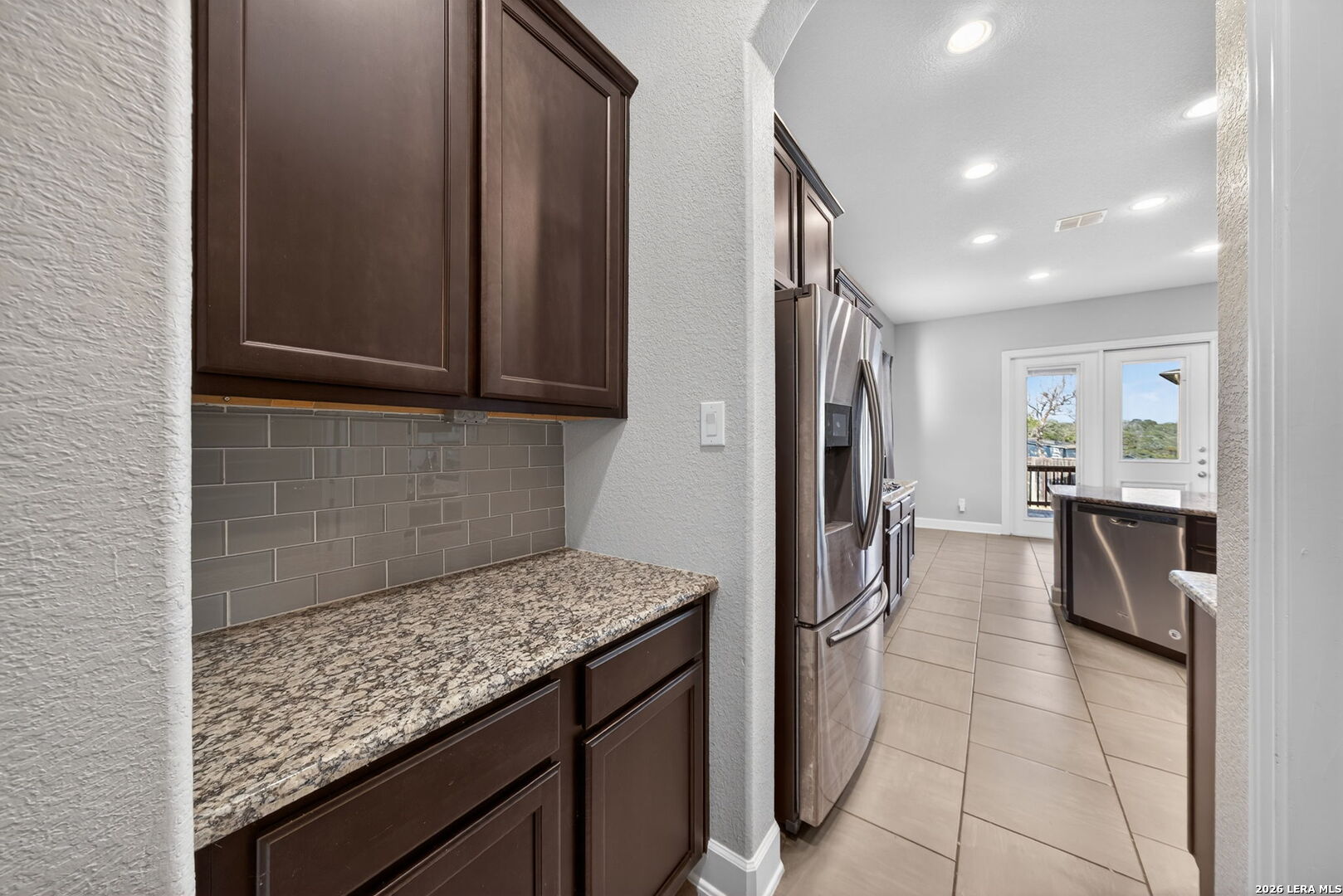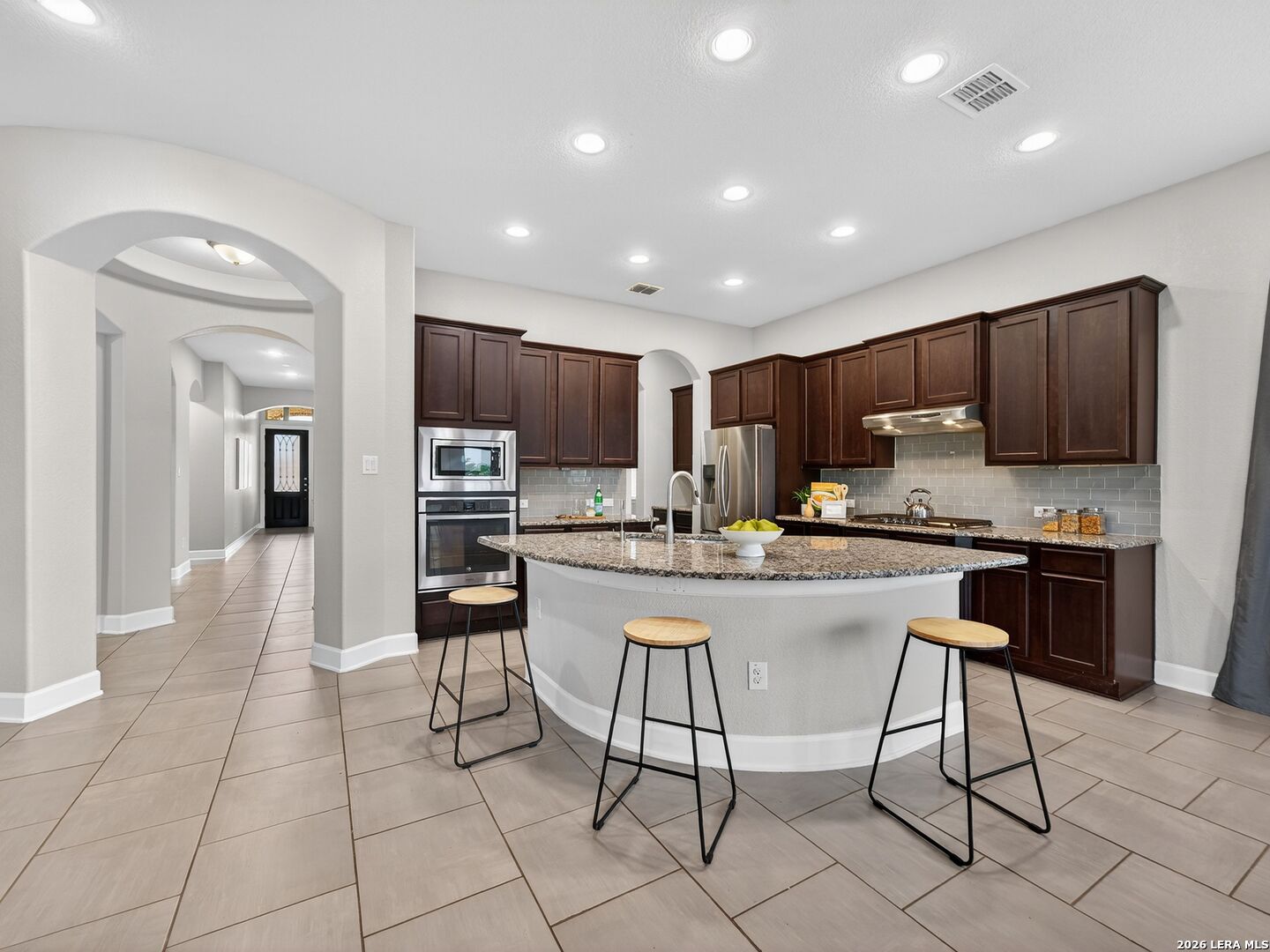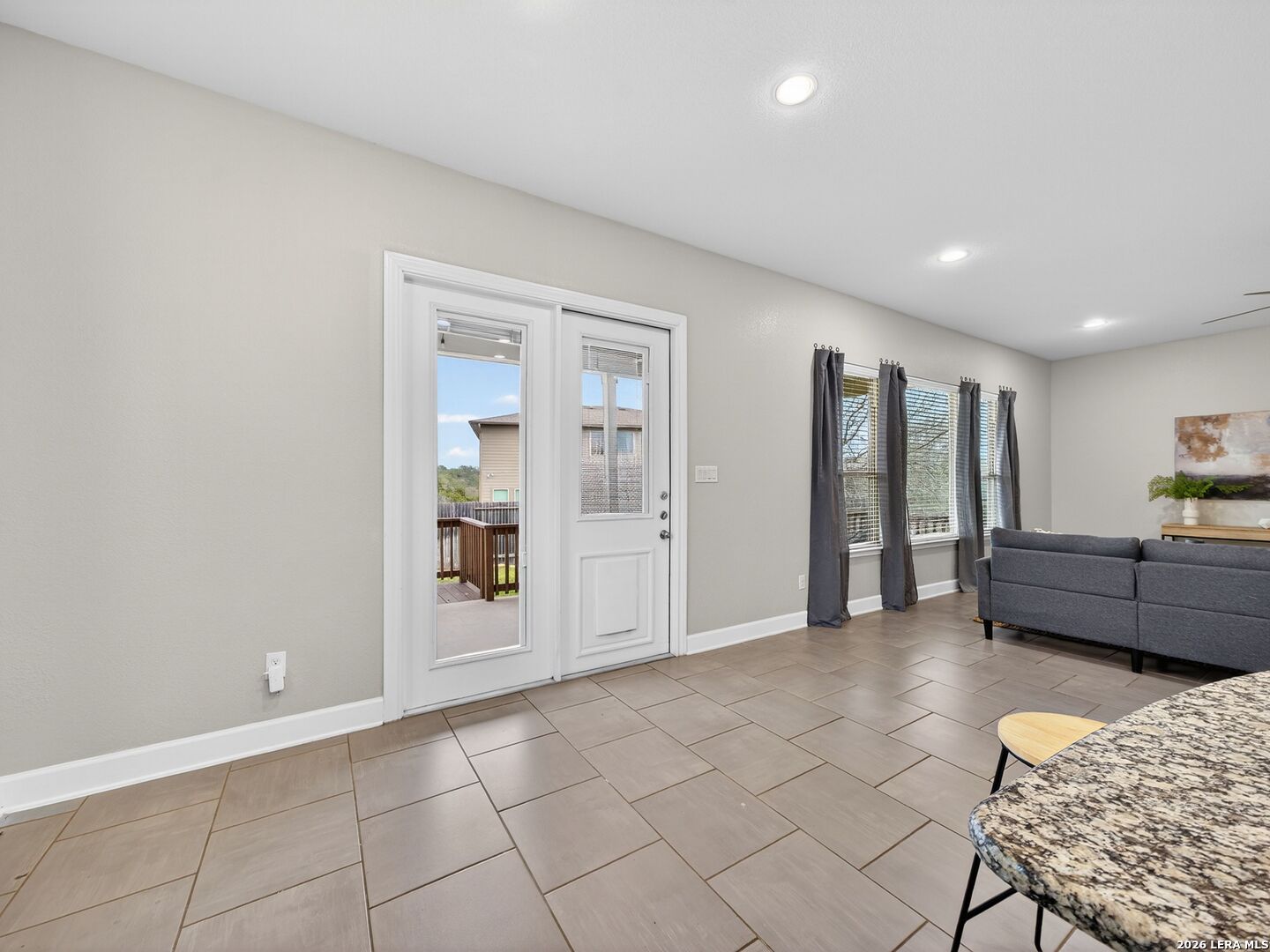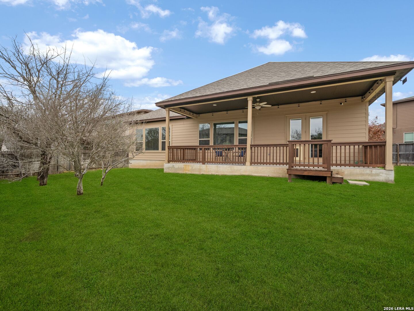 Immaculate single-story home with 3 bedrooms, an office, a formal dining room, 3 full baths, and a 3-car garage with 10-foot ceilings throughout. One secondary bedroom has an ensuite bath with Jack-and-Jill access to the office, ideal for guests or multi-generational living. The spacious living room opens to a well-appointed kitchen with stainless steel appliances, including refrigerator, GAS cooktop, built-in oven and microwave, and dishwasher. Features include wood cabinetry, a large granite island, a Butler's niche, and a walk-in pantry. The primary bath offers a double vanity, separate tub, and a shower. Enjoy the OVERSIZED backyard, with room for a pool and a huge covered patio, perfect for entertaining. Complete with a water softener and sprinkler system. Community amenities include a pool, jogging trails, and nearby schools. Convenient to Hwy 211, Hwy 90, Loop 1604, Lackland AFB, shopping, and dining.