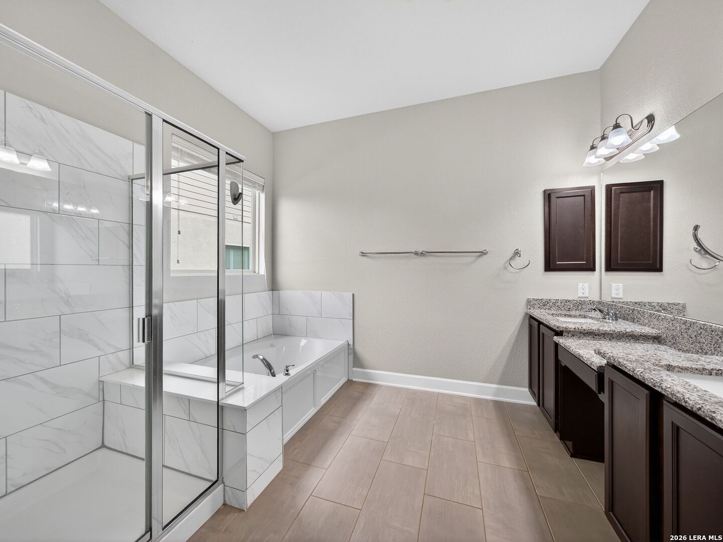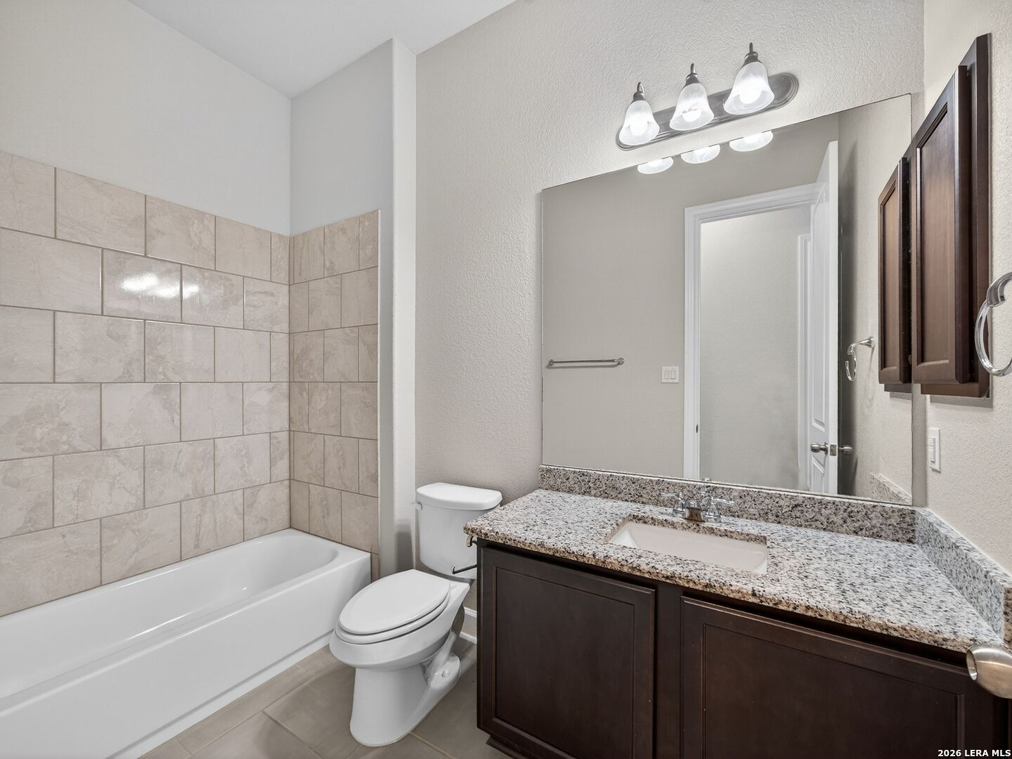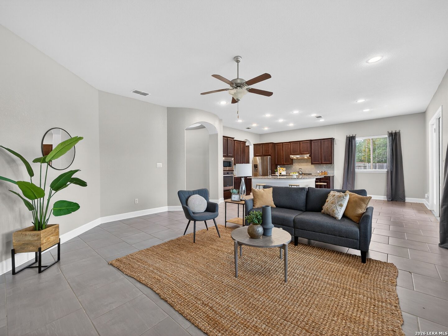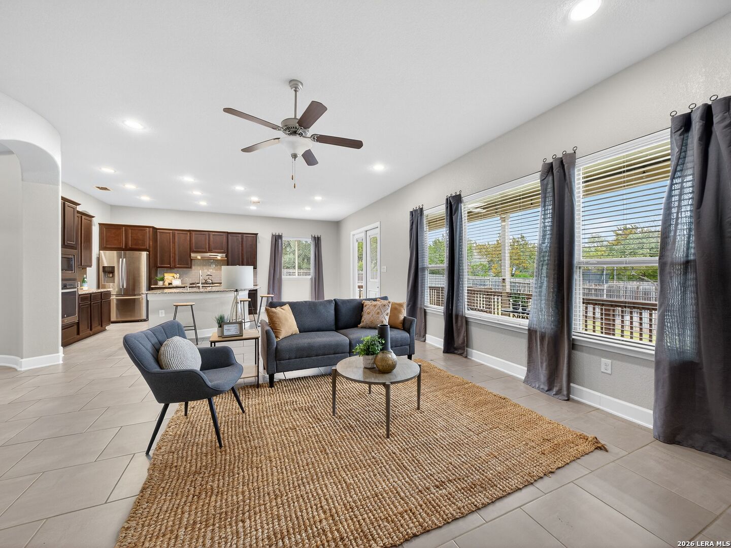 Immaculate single-story home with 3 bedrooms, an office, a formal dining room, 3 full baths, and a 3-car garage with 10-foot ceilings throughout. One secondary bedroom has an ensuite bath with Jack-and-Jill access to the office, ideal for guests or multi-generational living. The spacious living room opens to a well-appointed kitchen with stainless steel appliances, including refrigerator, GAS cooktop, built-in oven and microwave, and dishwasher. Features include wood cabinetry, a large granite island, a Butler's niche, and a walk-in pantry. The primary bath offers a double vanity, separate tub, and a shower. Enjoy the OVERSIZED backyard, with room for a pool and a huge covered patio, perfect for entertaining. Complete with a water softener and sprinkler system. Community amenities include a pool, jogging trails, and nearby schools. Convenient to Hwy 211, Hwy 90, Loop 1604, Lackland AFB, shopping, and dining.