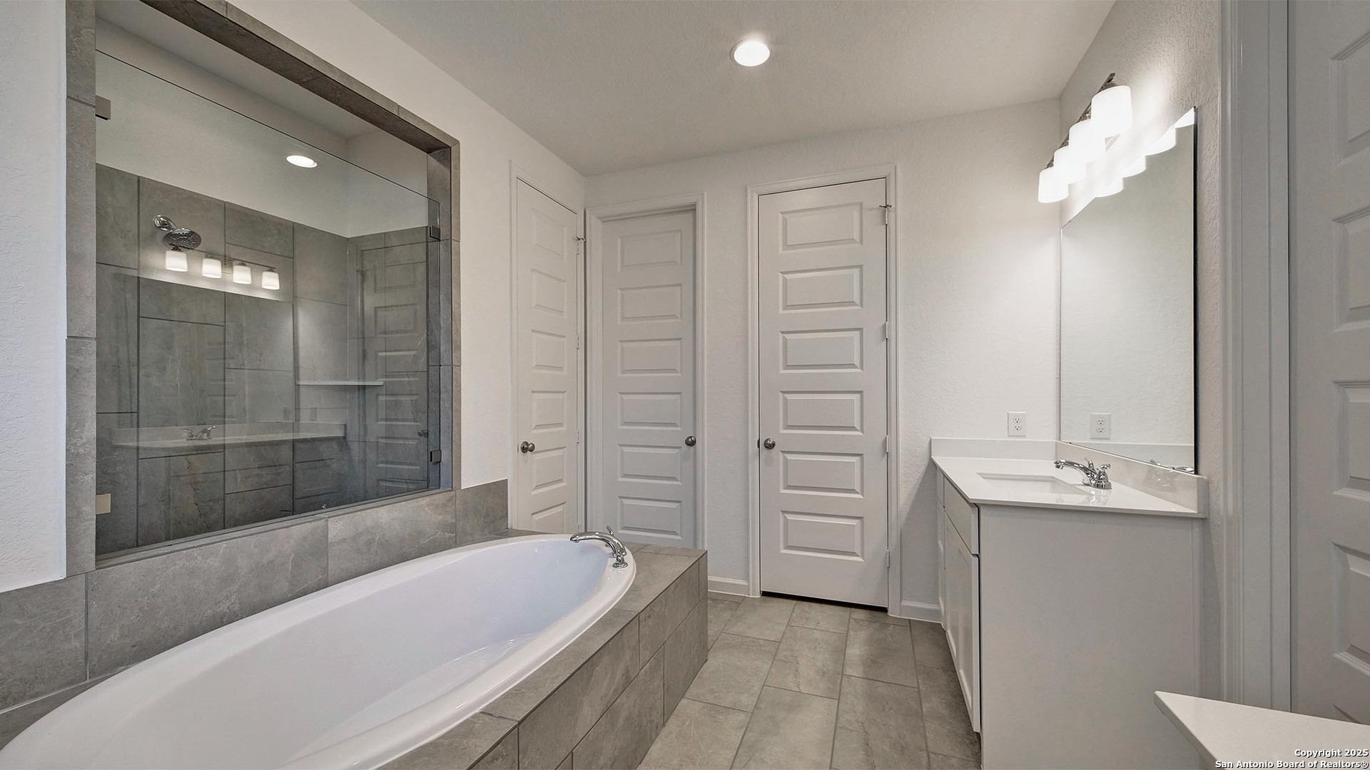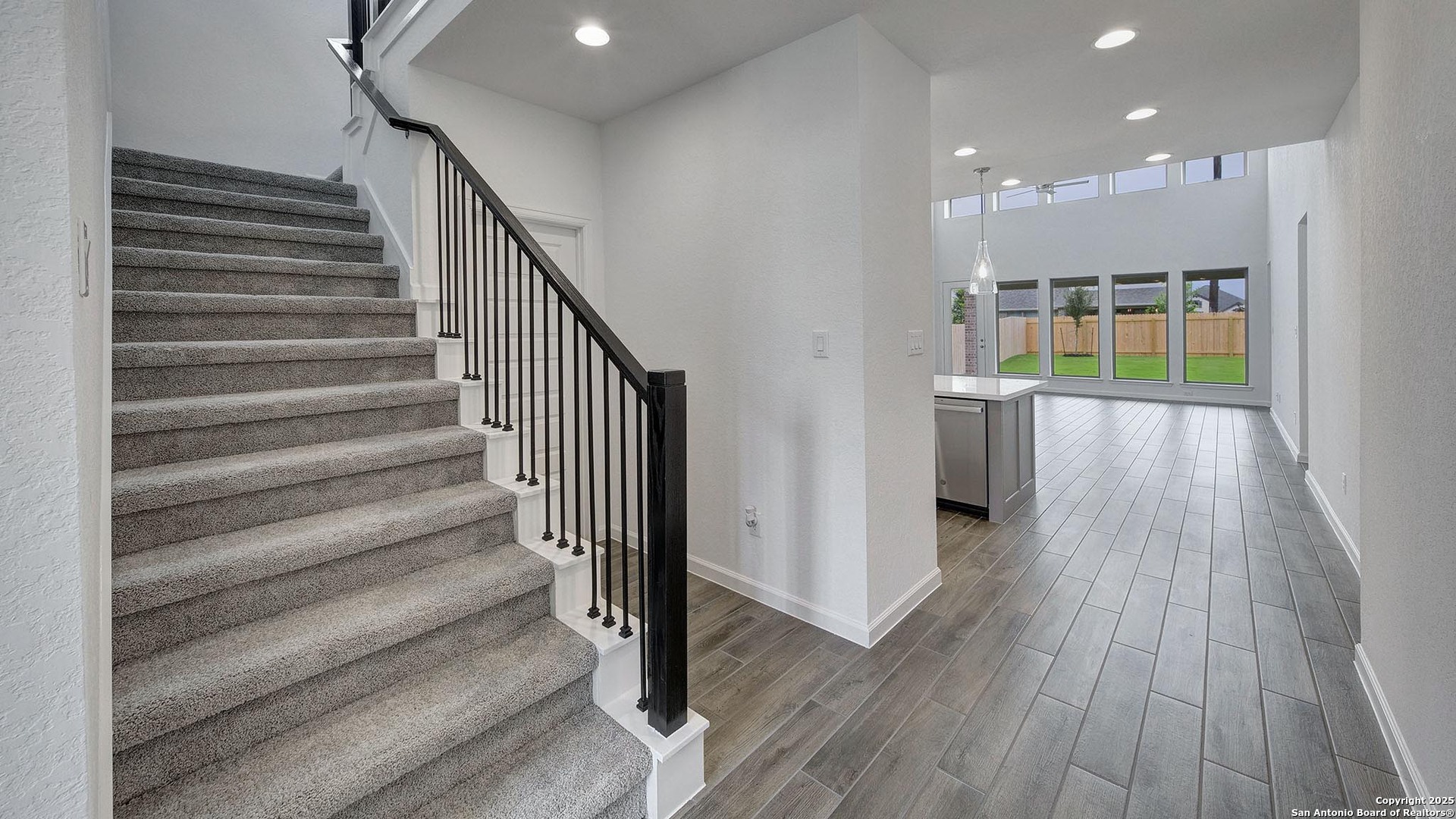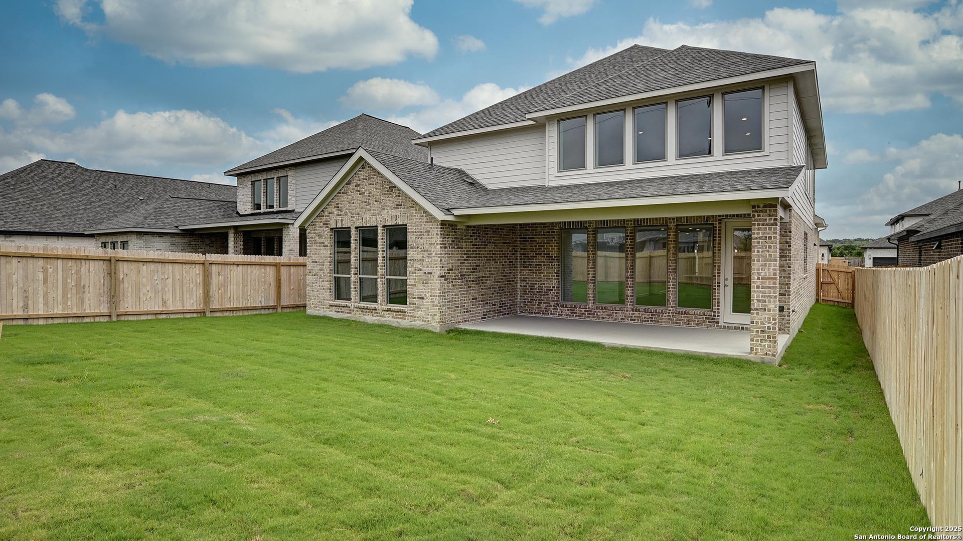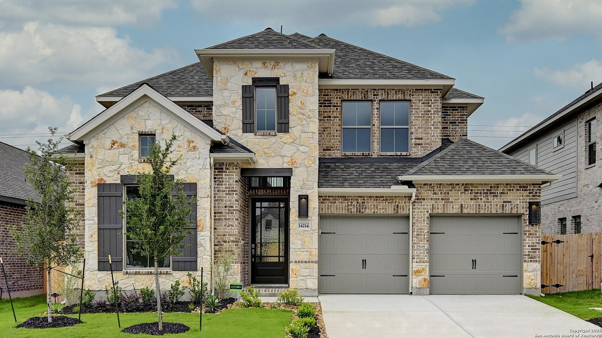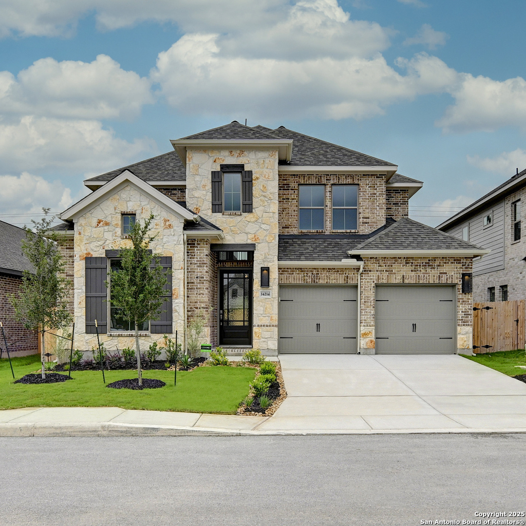READY FOR MOVE-IN! Home office with French doors set at two-story entry. Open kitchen offers deep walk-in pantry and generous island with built-in seating space. Dining area opens to two-story family room with wall of windows. Primary suite with 10-foot ceiling. Dual vanities, garden tub, separate glass-enclosed shower and large walk-in closet in primary bath. A second bedroom is downstairs. A game room and secondary bedrooms are upstairs. Covered backyard patio and 5-zone sprinkler system. Mud room off two-car garage.