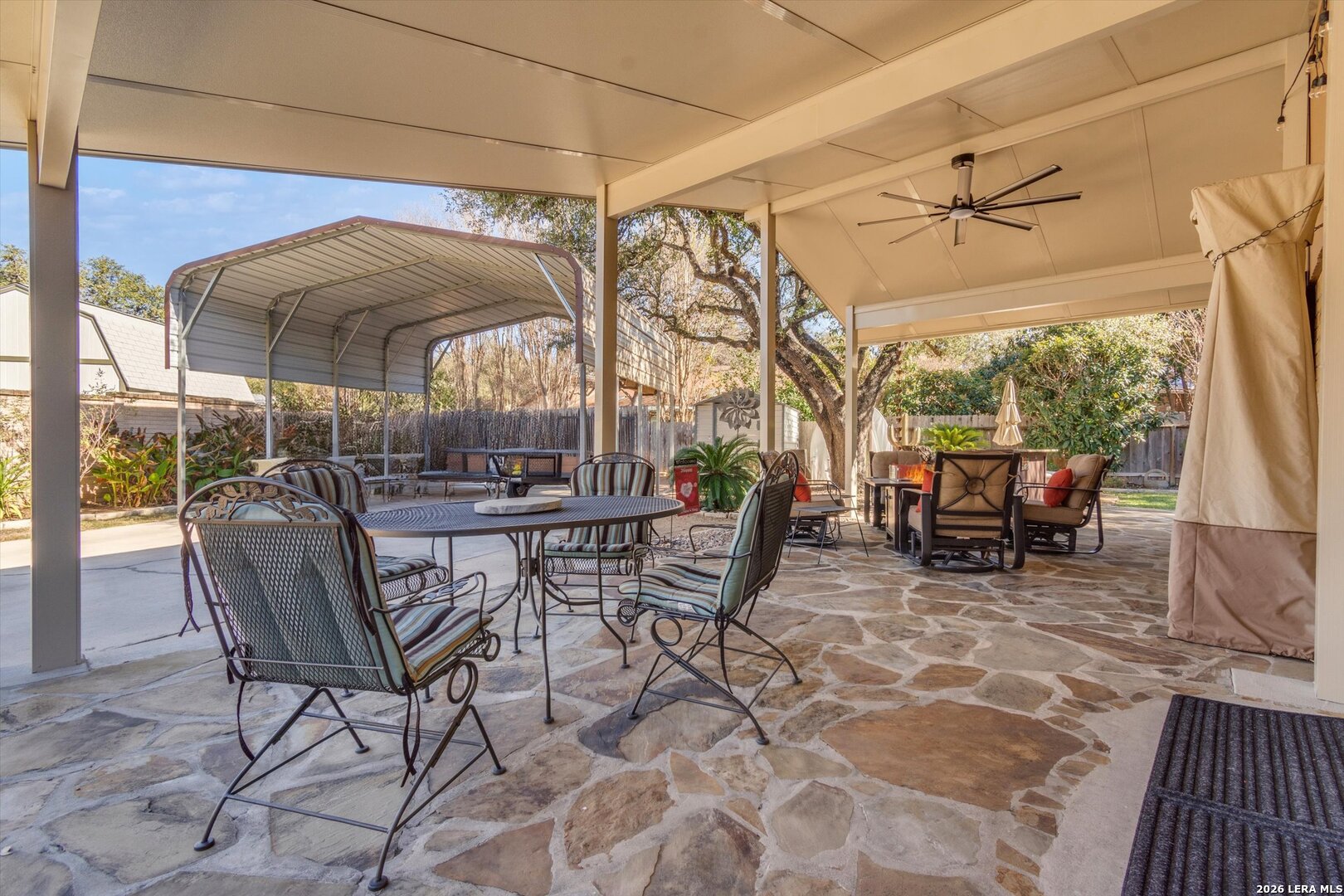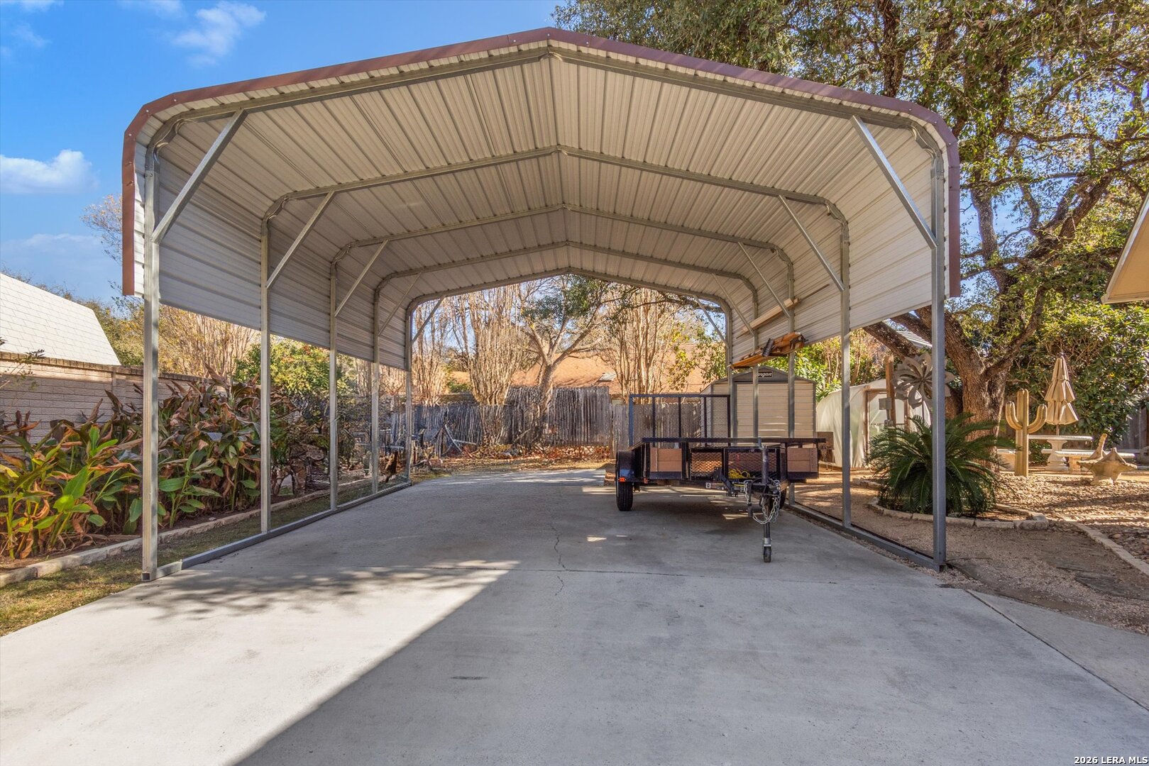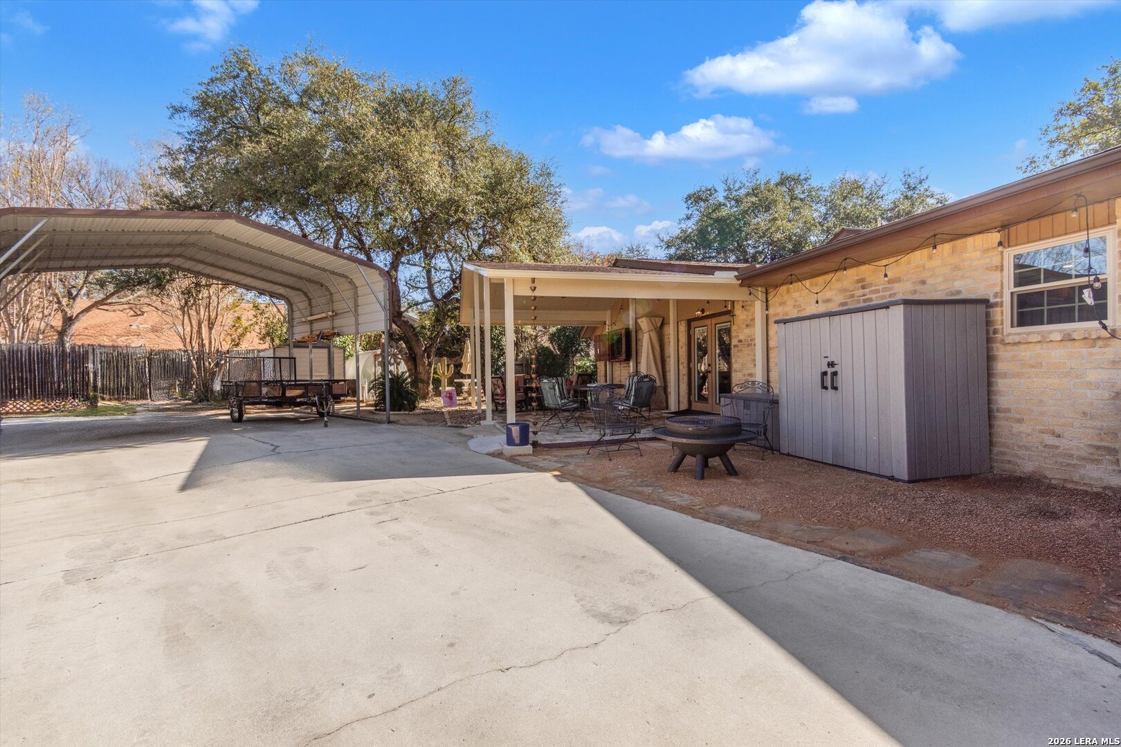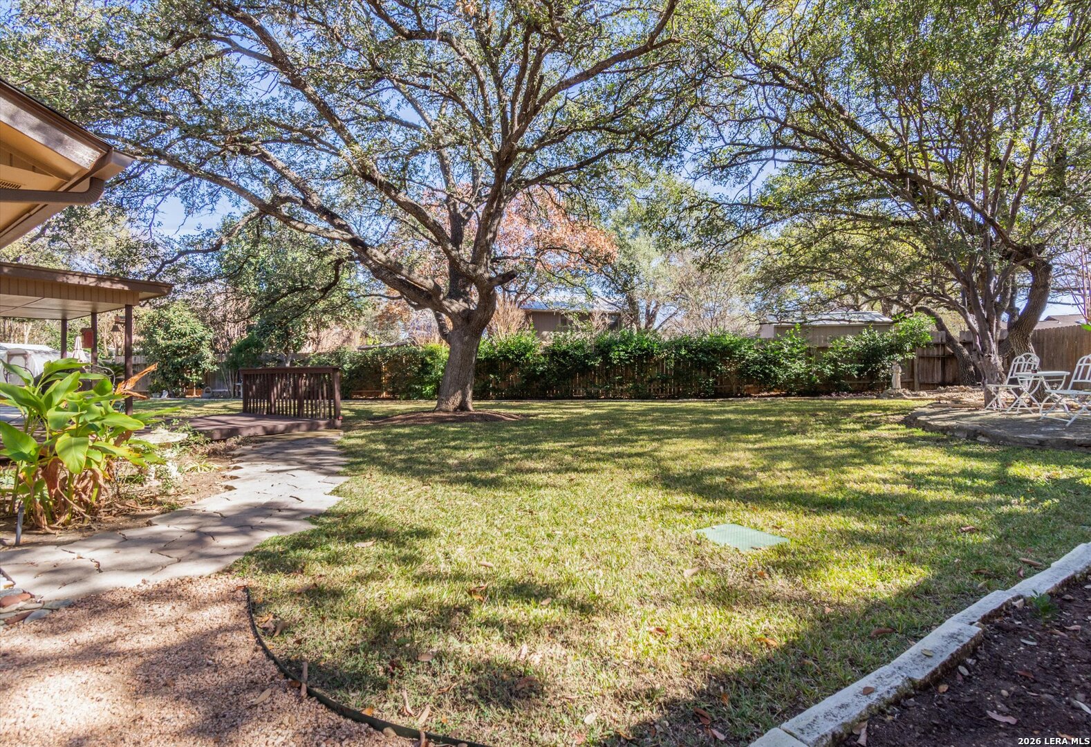 Stunning Single-Story Home on Oversized Cul-de-Sac Lot in Woods of Shavano! Welcome to this beautifully updated single story, 3-bedroom, 2 bath home nestled on a generous .3-acre homesite in a quiet cul-de-sac surrounded by mature trees. Combining privacy, space, and modern comfort, this home checks every box today's buyers are searching for. Inside, enjoy easy care tile & engineered hardwood flooring throughout. No carpet, custom window coverings and an abundance of natural light from new Andersen windows. The inviting living room is anchored by a cozy fireplace, creating the perfect gathering space. The chef's kitchen is the heart of the home, showcasing Monogram SMART appliances, drawer microwave, soft close cabinetry with slide out drawers, solid countertops, and a coveted pot filler perfect for everyday living and entertaining. Additional upgrades include pre plumbing for a water softener, full sprinkler system, recently cleaned a/c ducts, and new bathroom exhaust fans, offering peace of mind and efficiency. Step outside to your private backyard retreat featuring a covered patio, deck, tiki bar, greenhouse, and two storage sheds. It is ideal for entertaining, hobbies, or relaxation. Outdoor enthusiasts and RV owners will love the covered RV parking with electricity. Additionally, it has a green house. Located in a quiet cul de sac with generous outdoor space, this move-in ready home offers comfort, versatility and lifestyle. Schedule your private showing today.