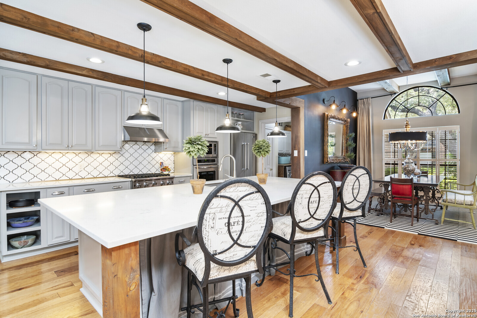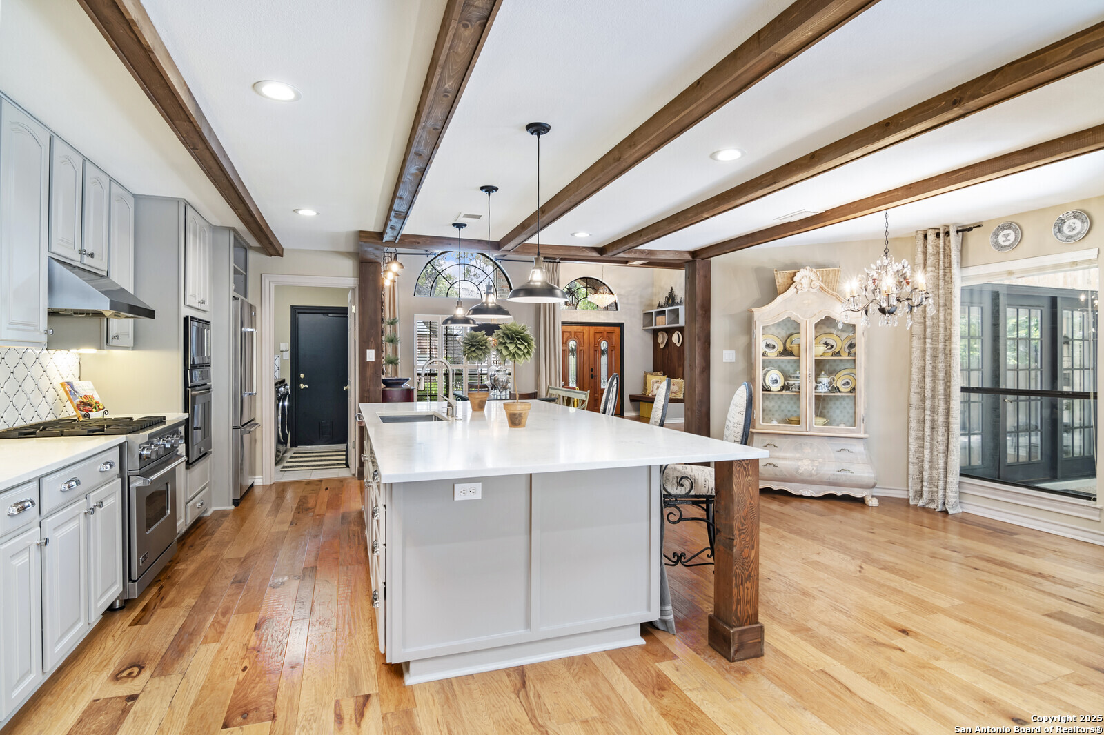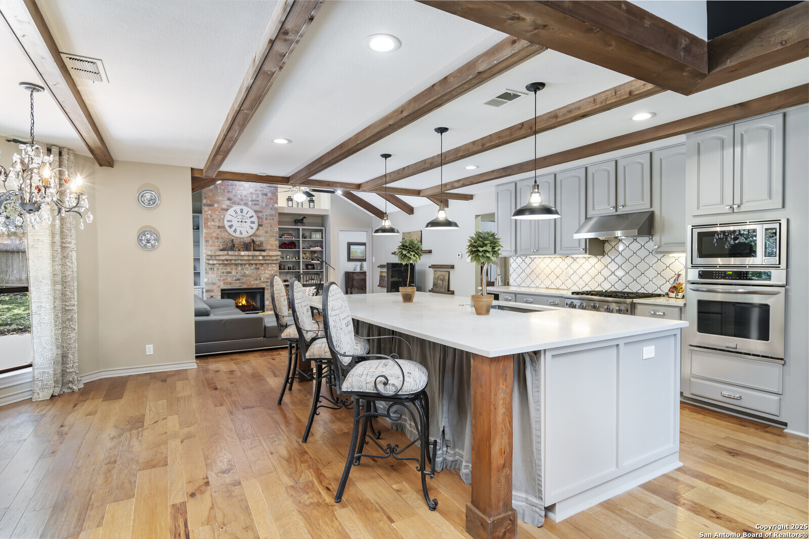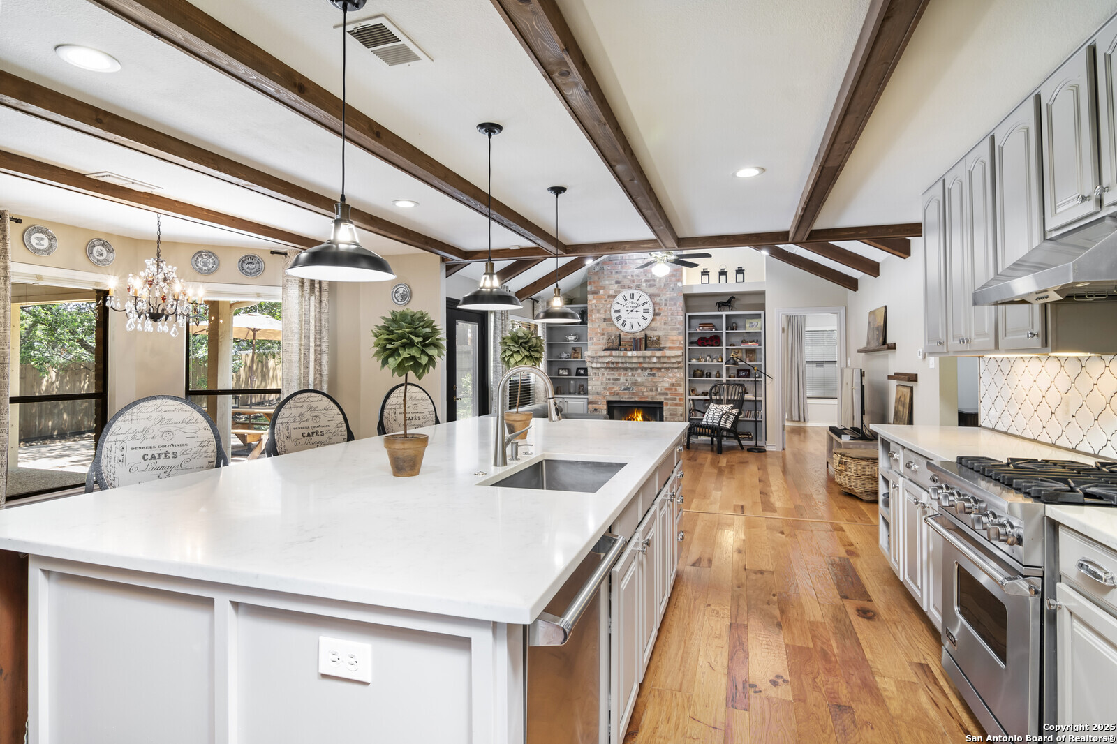 Spectacular One-Story in Deerfield Welcome to 1422 Hawks Meadow, a beautifully updated one-story home in the heart of the coveted Deerfield community. Offering 2,684 square feet of refined living space, this 4-bedroom, 3-bath residence has been thoughtfully renovated with elevated style and attention to detail. Inside, you'll find a wide open floor plan with soaring ceilings and custom beam treatments that add warmth and architectural interest. Rich wood flooring flows throughout the main living areas, complementing the fresh lighting, updated fixtures, and transitional design elements. At the heart of the home is an enormous island kitchen outfitted with professional-grade appliances, custom cabinetry, and designer touches-perfect for everyday living and effortless entertaining. The spacious primary suite features a beautifully updated bath with high-end finishes and a spa-like feel. Generously sized secondary bedrooms and flexible spaces make this home as functional as it is stunning. Located in one of North Central San Antonio's most established and sought-after communities, this home offers exceptional walkability, top-rated schools, and access to Deerfield's amenities-including a pool, tennis courts, park, and 24-hour security patrol. Truly a rare opportunity to own a move-in ready, designer-inspired home in Deerfield.