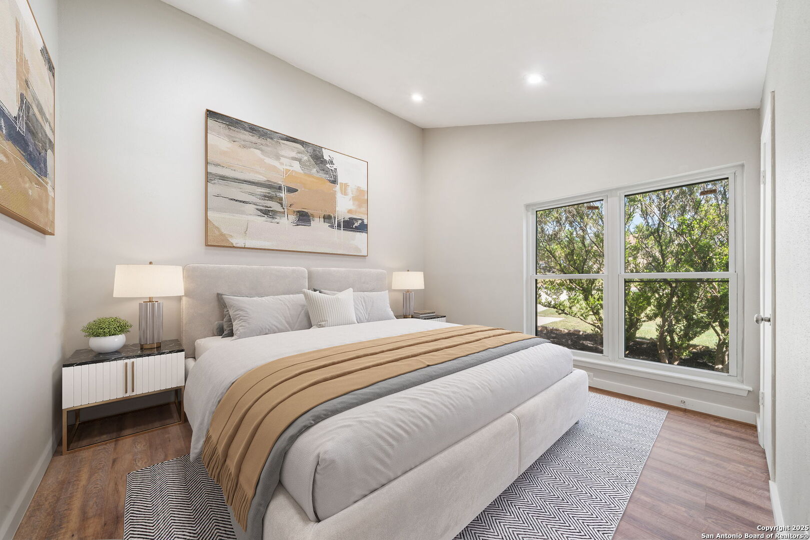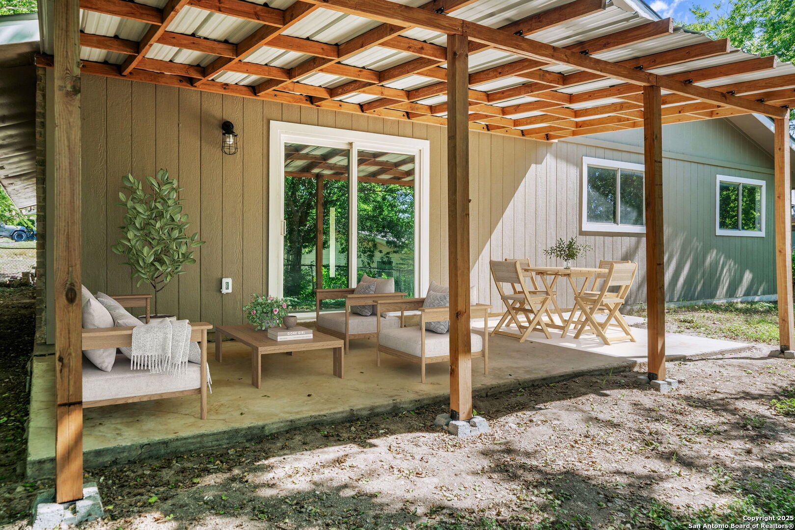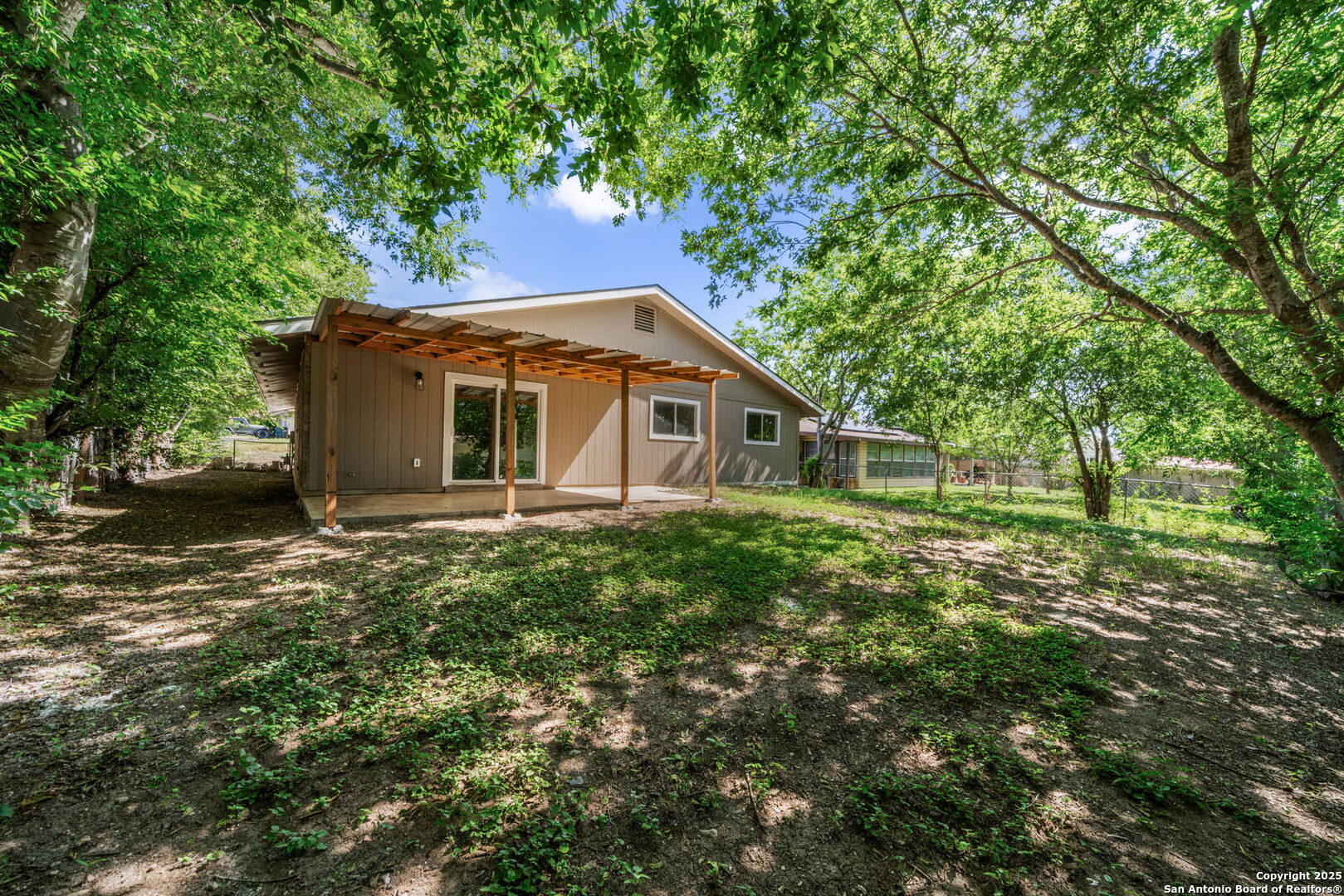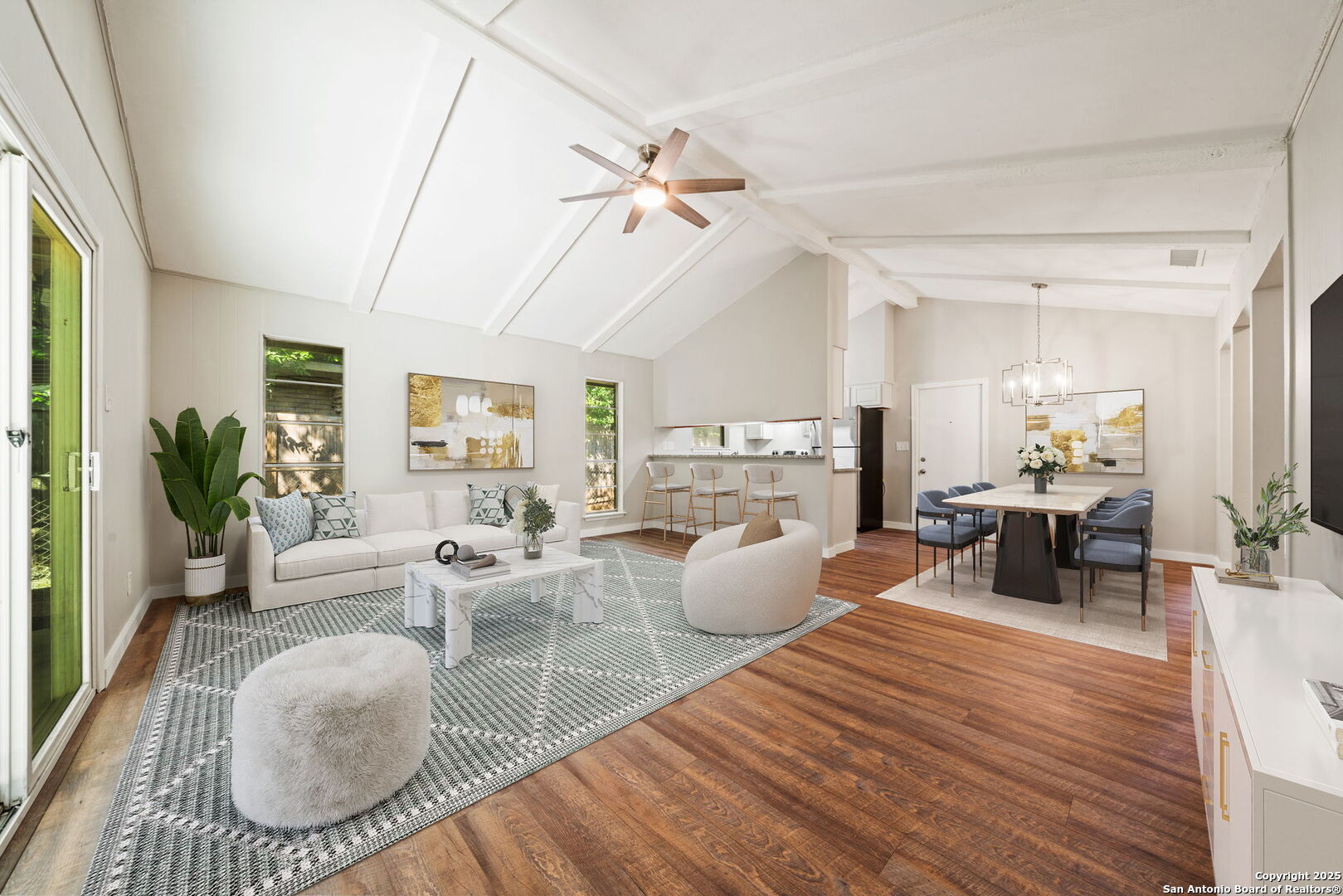 Welcome Home!! As you drive up the house instantly "pops" with the fresh paint, new siding and new roof. Upon walking through the front door the extensive remodel welcome you in with a bit of a throwback with the terrazzo floor in the entry way. The open family room/dining room has a vaulted ceiling with new luxury vinyl plank flooring offer a very comfortable area for gathering. New ceiling fans and light fixtures through the house provide a great new look and help keep you cool and air circulating through out the year. When it is time to retire for a good night of sleep the primary bedroom is a cozy retreat with a vaulted ceiling and walk in closet. As you walk through the house the fresh paint and solid wood baseboards and new flooring showcase the remodel, which extends to throughout the house. The backyard is spacious with large trees providing great shade while the large patio is covered with a new roof providing a great outdoor living space with plenty of room for a grill or smoker. This lovely home located in El Chaparral in desirable Northeast ISD withing walking distance to Northern Hills Elementary.
