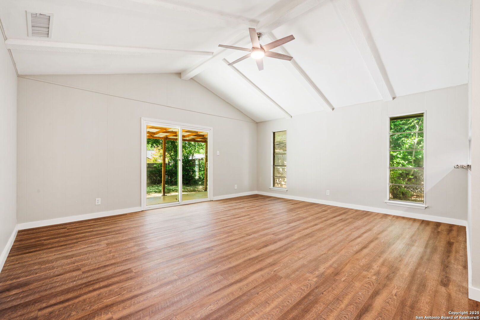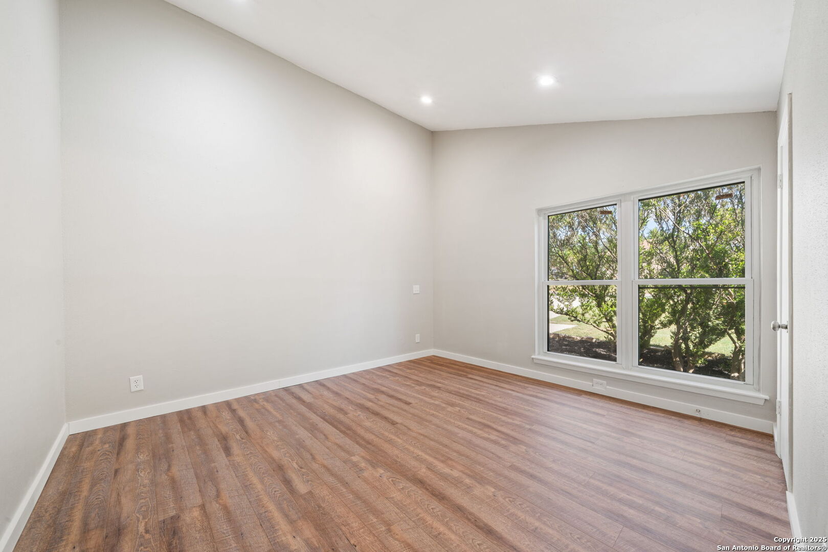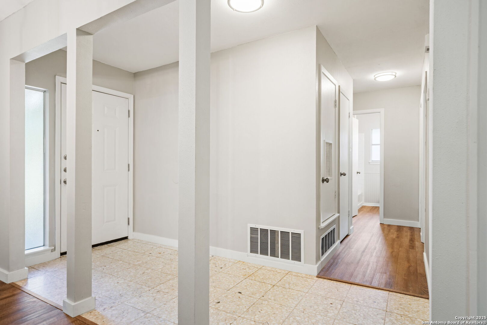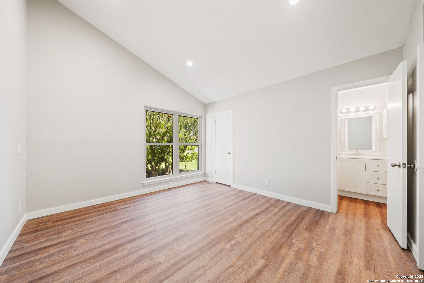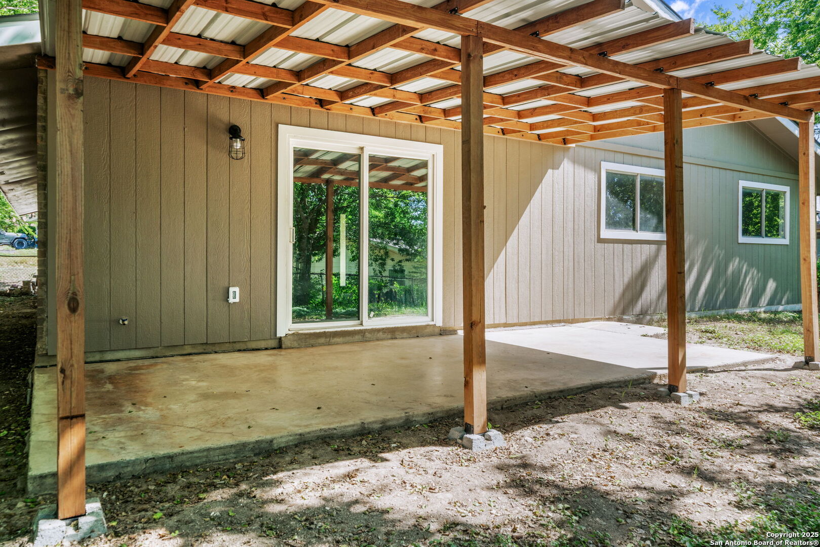 Welcome Home!! As you drive up the house instantly "pops" with the fresh paint, new siding and new roof. Upon walking through the front door the extensive remodel welcome you in with a bit of a throwback with the terrazzo floor in the entry way. The open family room/dining room has a vaulted ceiling with new luxury vinyl plank flooring offer a very comfortable area for gathering. New ceiling fans and light fixtures through the house provide a great new look and help keep you cool and air circulating through out the year. When it is time to retire for a good night of sleep the primary bedroom is a cozy retreat with a vaulted ceiling and walk in closet. As you walk through the house the fresh paint and solid wood baseboards and new flooring showcase the remodel, which extends to throughout the house. The backyard is spacious with large trees providing great shade while the large patio is covered with a new roof providing a great outdoor living space with plenty of room for a grill or smoker. This lovely home located in El Chaparral in desirable Northeast ISD withing walking distance to Northern Hills Elementary.
