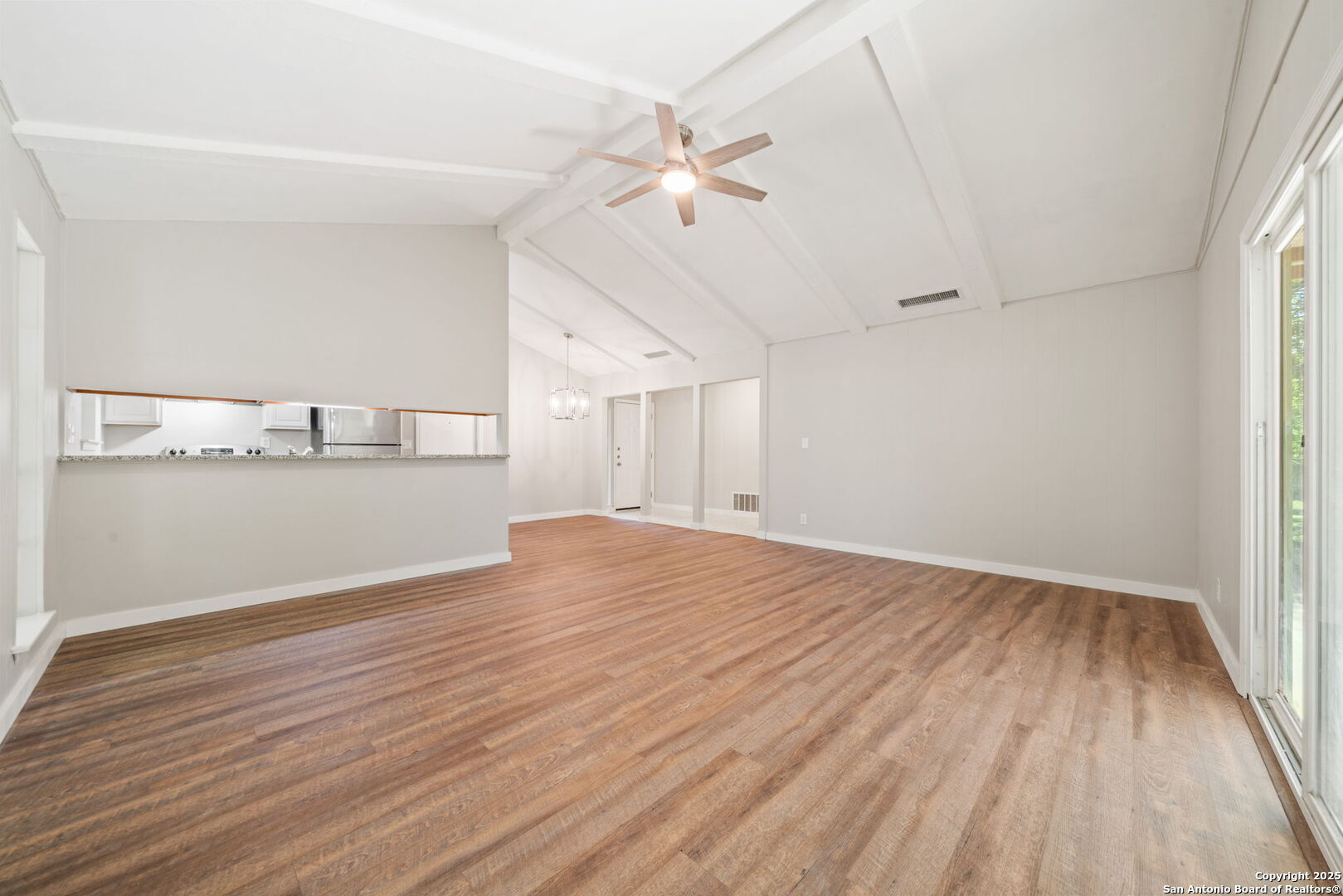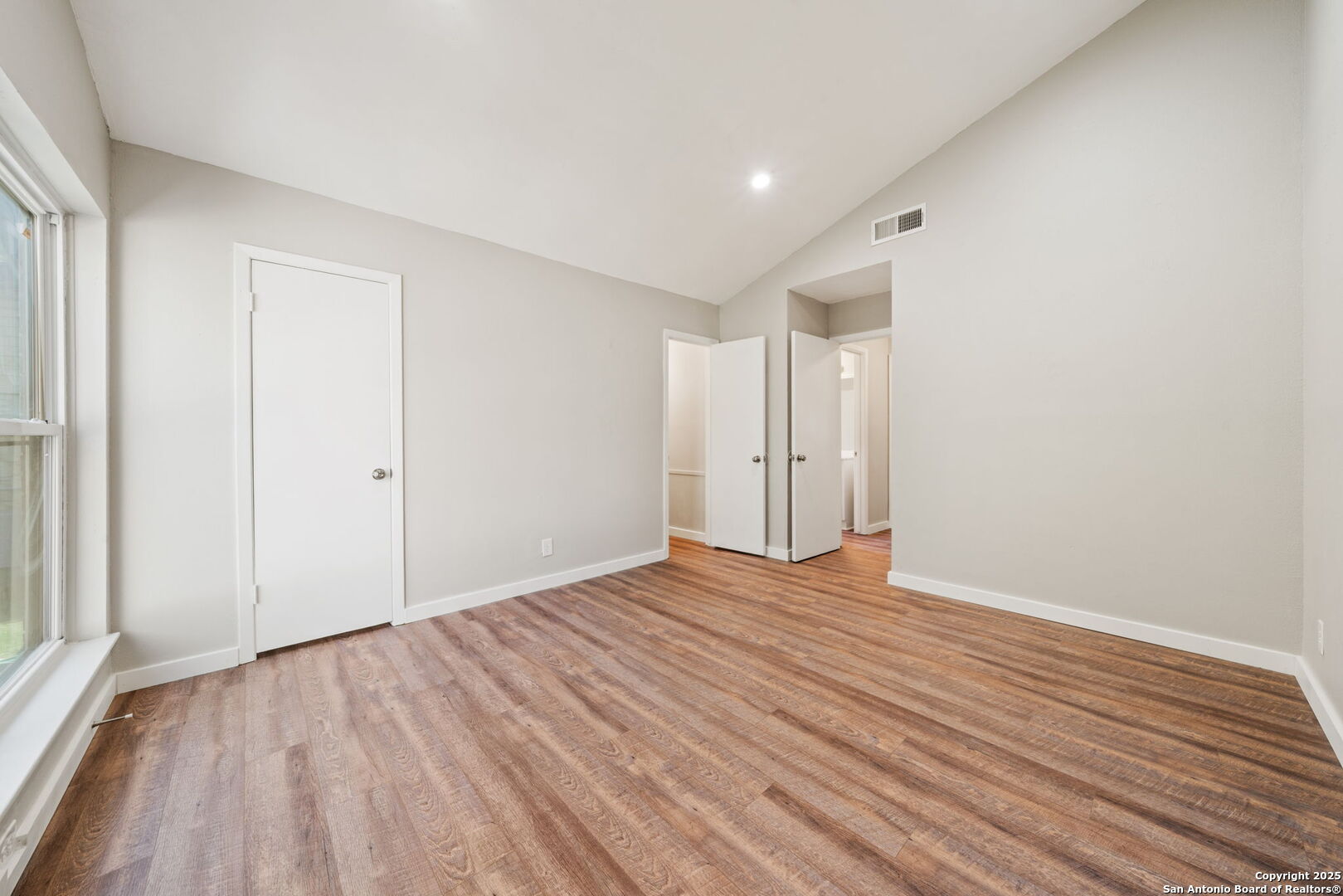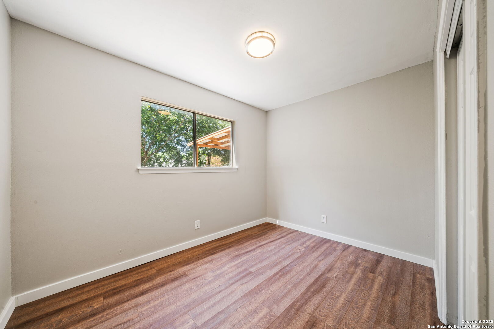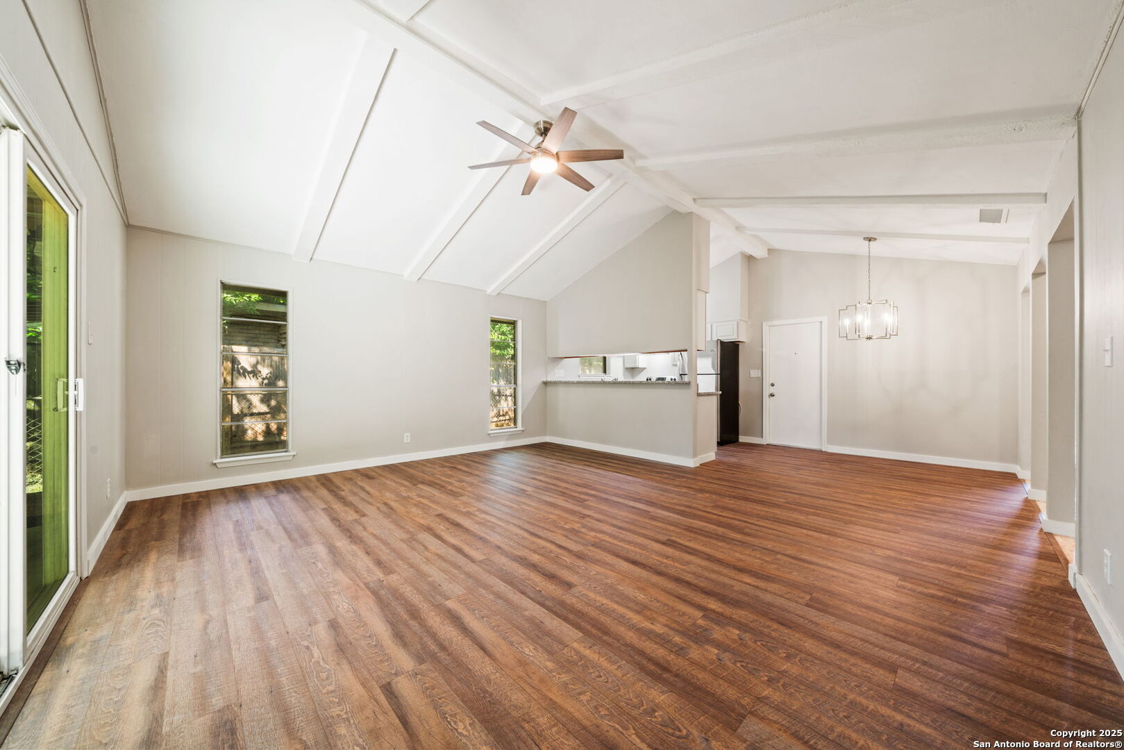 Welcome Home!! As you drive up the house instantly "pops" with the fresh paint, new siding and new roof. Upon walking through the front door the extensive remodel welcome you in with a bit of a throwback with the terrazzo floor in the entry way. The open family room/dining room has a vaulted ceiling with new luxury vinyl plank flooring offer a very comfortable area for gathering. New ceiling fans and light fixtures through the house provide a great new look and help keep you cool and air circulating through out the year. When it is time to retire for a good night of sleep the primary bedroom is a cozy retreat with a vaulted ceiling and walk in closet. As you walk through the house the fresh paint and solid wood baseboards and new flooring showcase the remodel, which extends to throughout the house. The backyard is spacious with large trees providing great shade while the large patio is covered with a new roof providing a great outdoor living space with plenty of room for a grill or smoker. This lovely home located in El Chaparral in desirable Northeast ISD withing walking distance to Northern Hills Elementary.