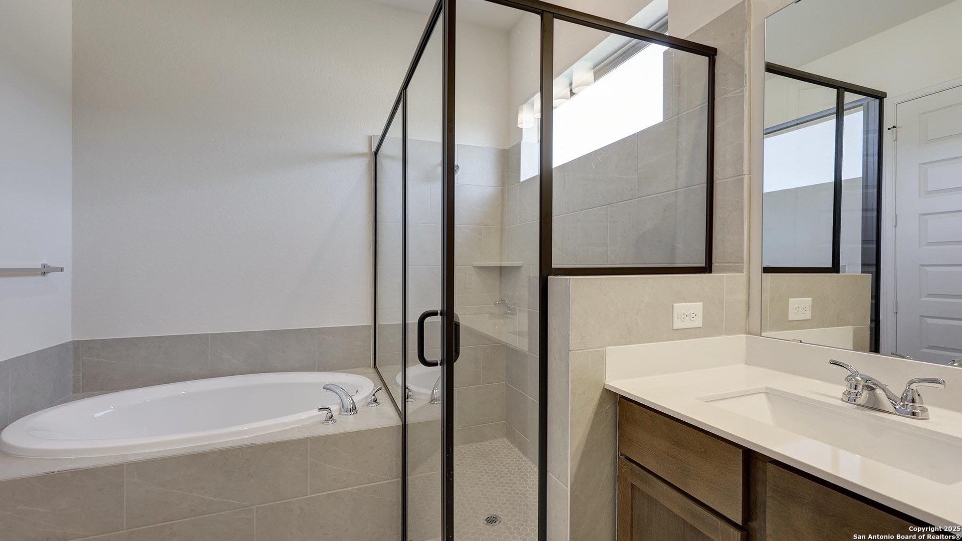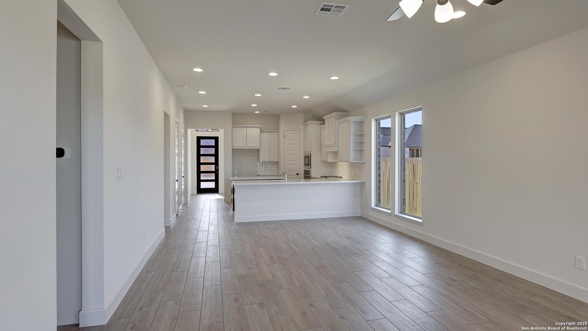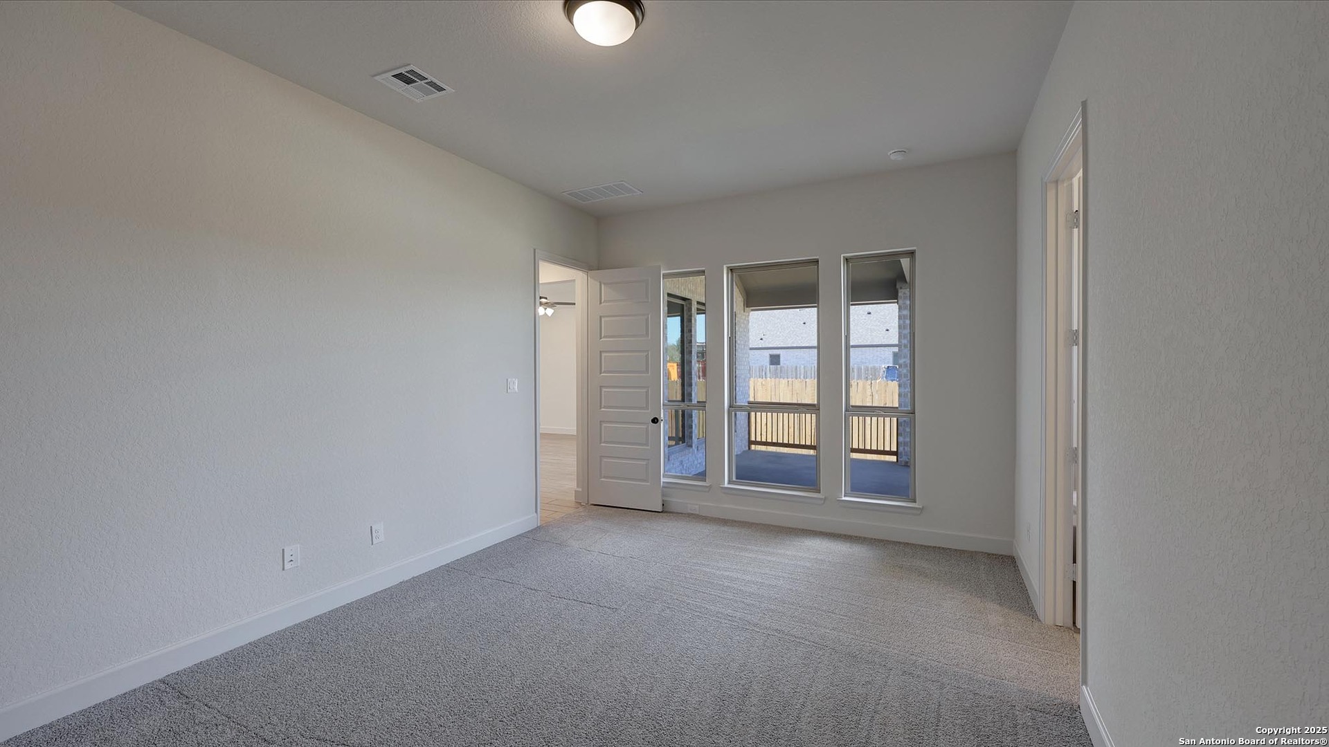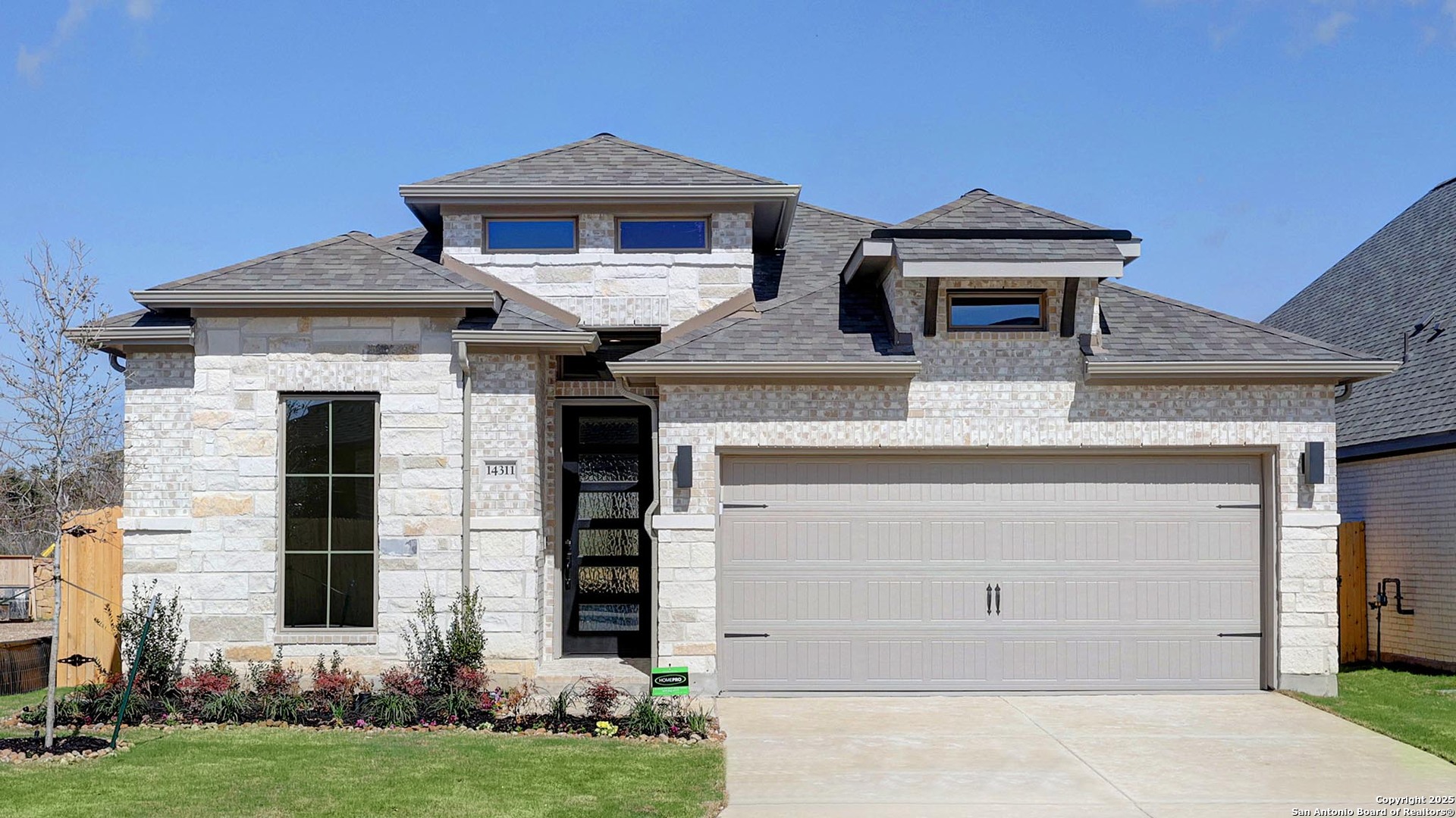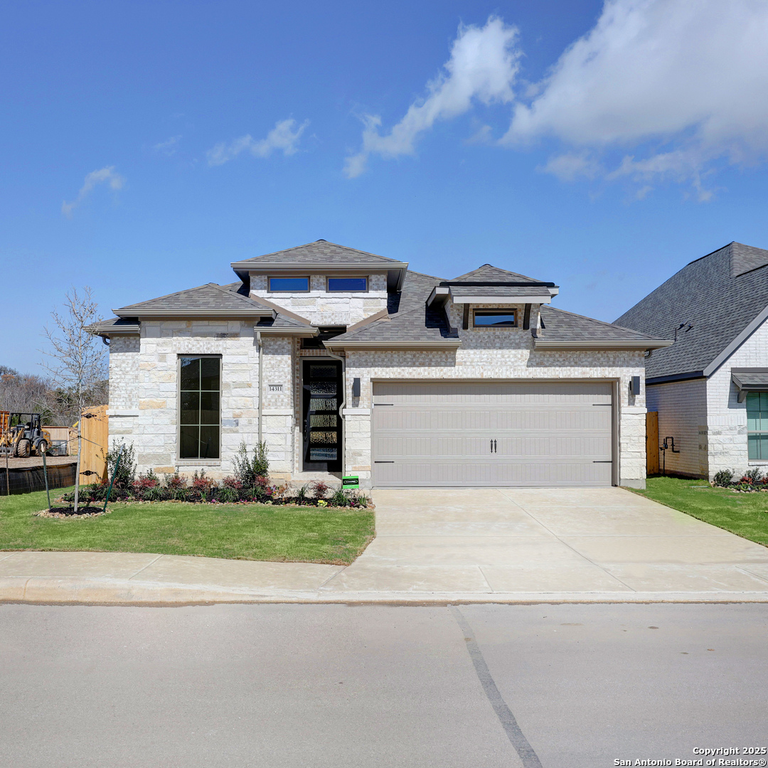 MOVE IN READY! Home office set at entry. Open island kitchen offers walk-in pantry and generous counter space. Dining area flows to open family room with wall of windows. Primary suite includes primary bath with dual vanity, garden tub, separate glass-enclosed shower and walk-in closet. Secondary bedrooms with walk-in closets, a full bathroom with dual sinks and a utility room completes this design. Covered backyard patio. Two-car garage and 5-zone sprinkler system.