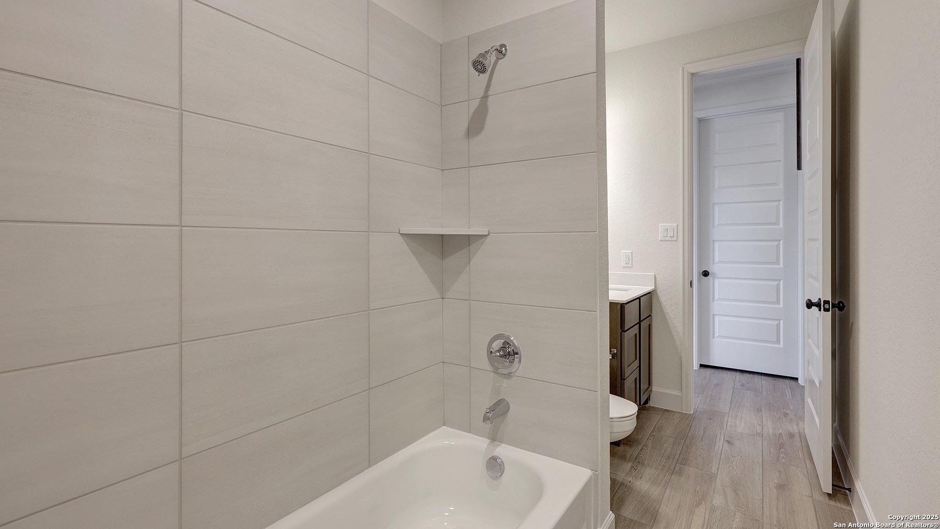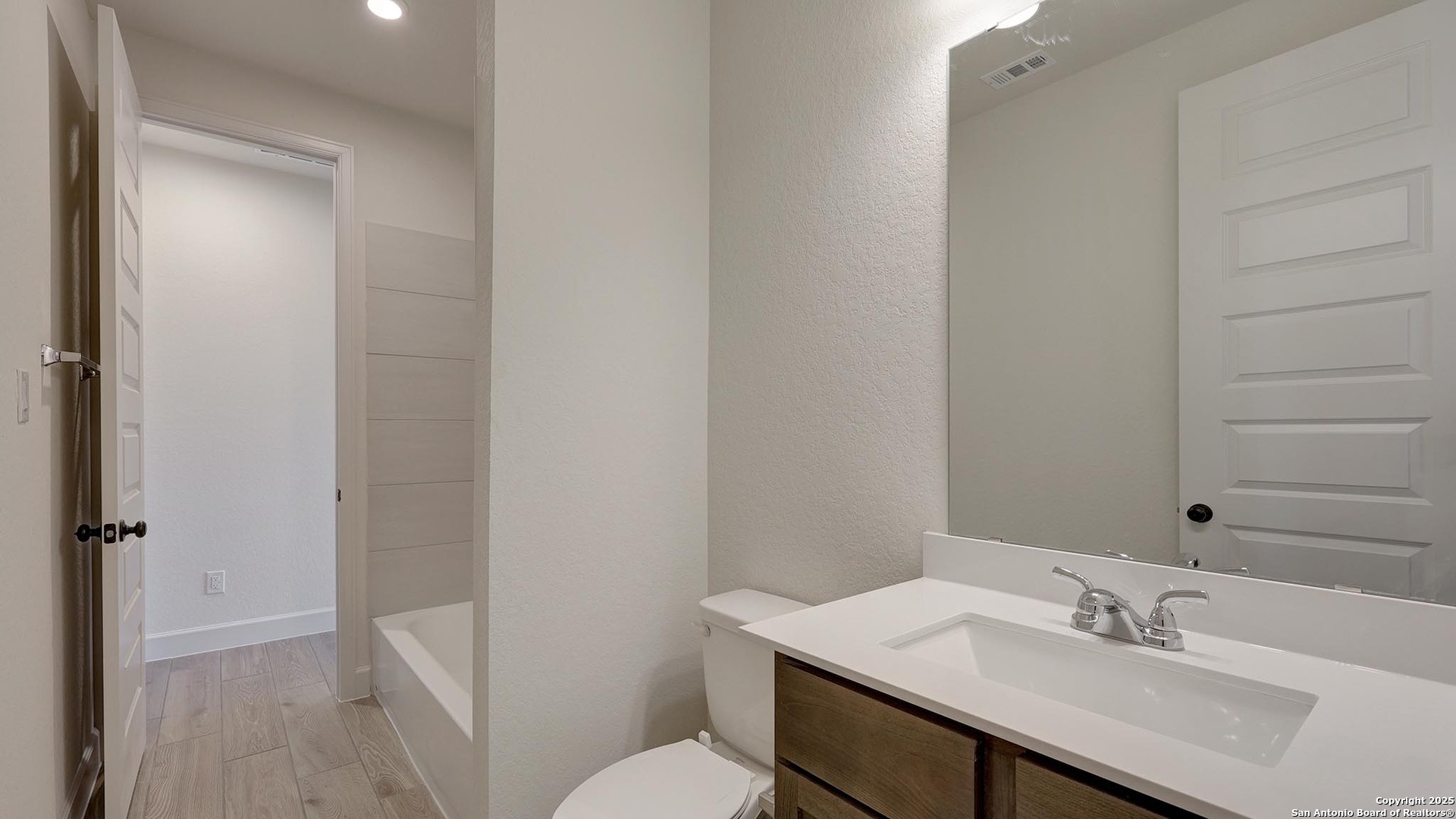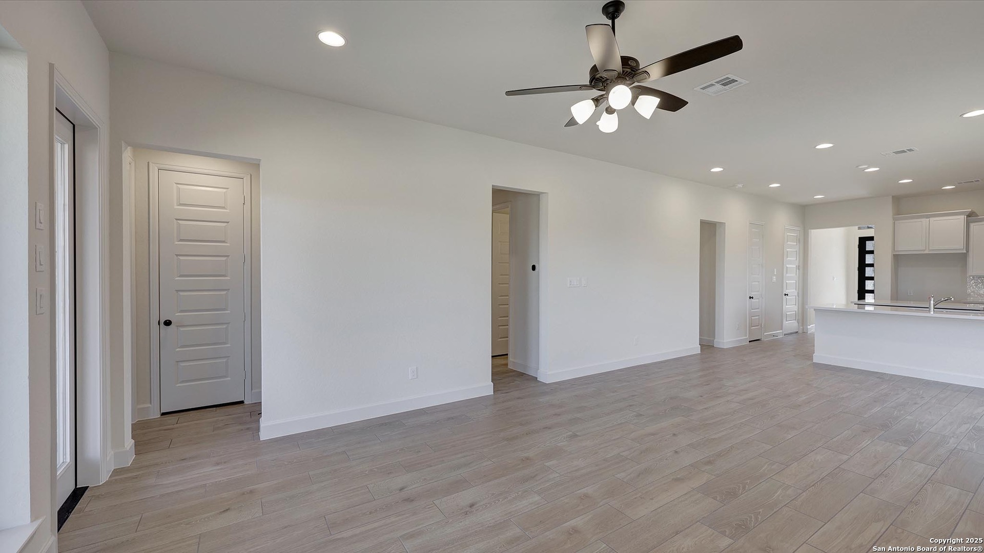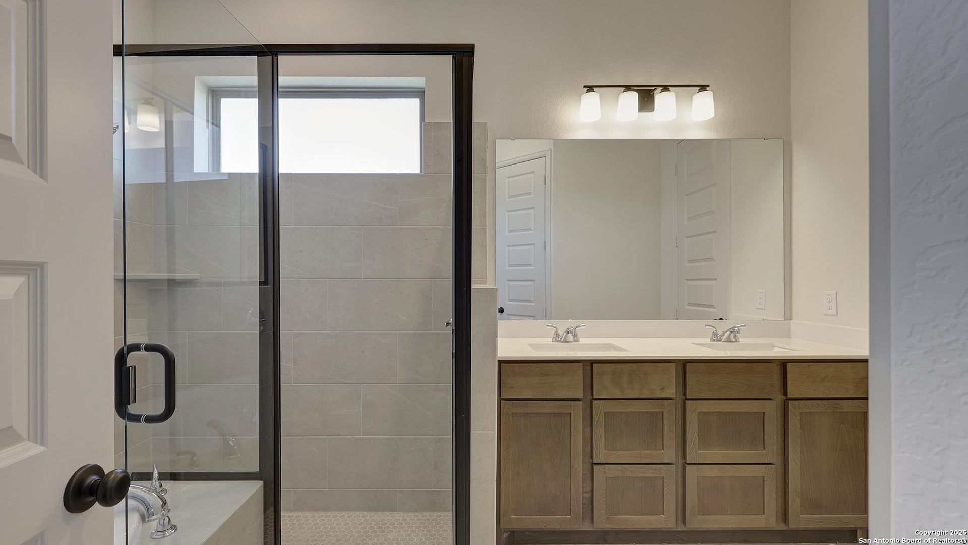 MOVE IN READY! Home office set at entry. Open island kitchen offers walk-in pantry and generous counter space. Dining area flows to open family room with wall of windows. Primary suite includes primary bath with dual vanity, garden tub, separate glass-enclosed shower and walk-in closet. Secondary bedrooms with walk-in closets, a full bathroom with dual sinks and a utility room completes this design. Covered backyard patio. Two-car garage and 5-zone sprinkler system.