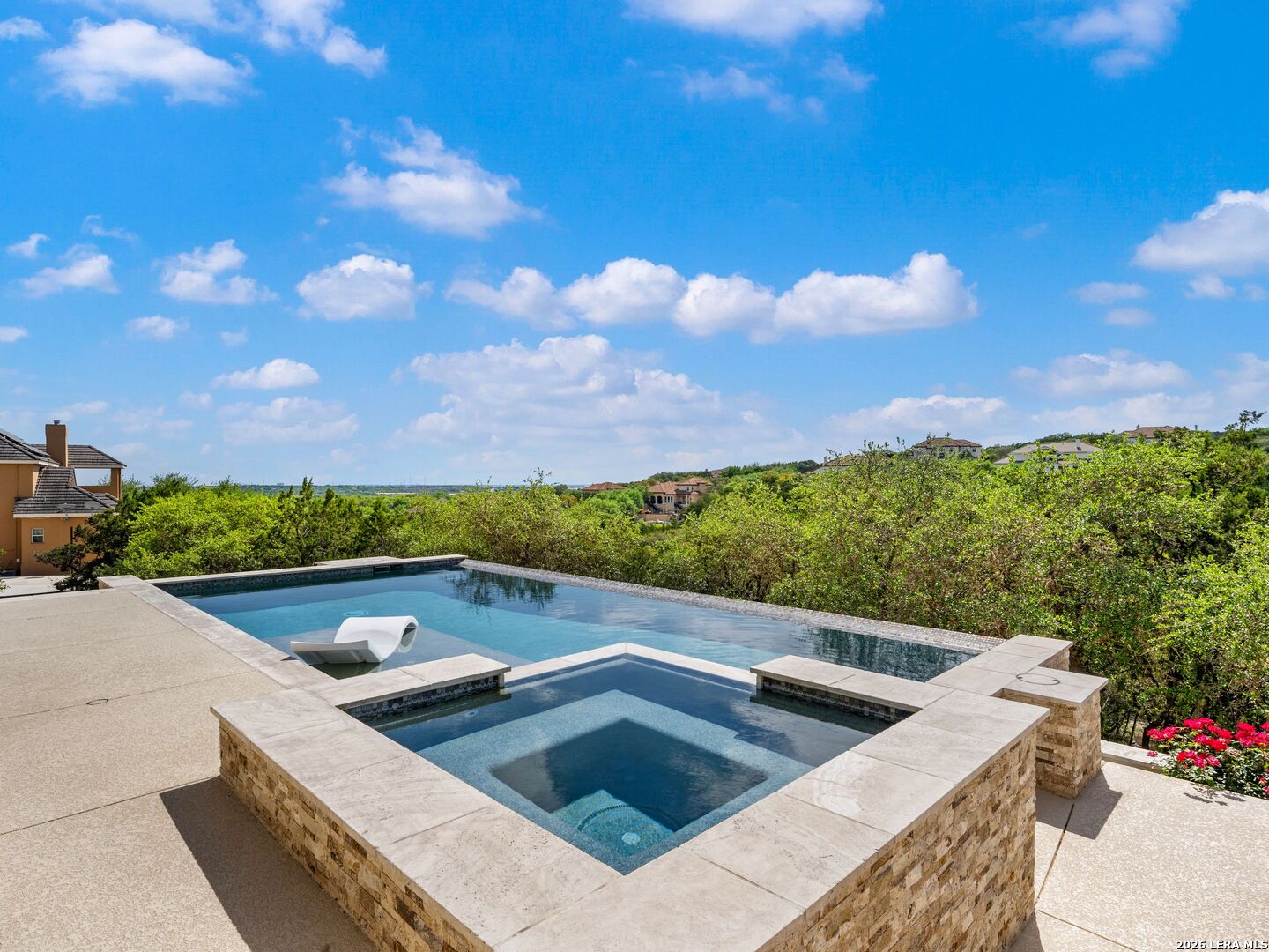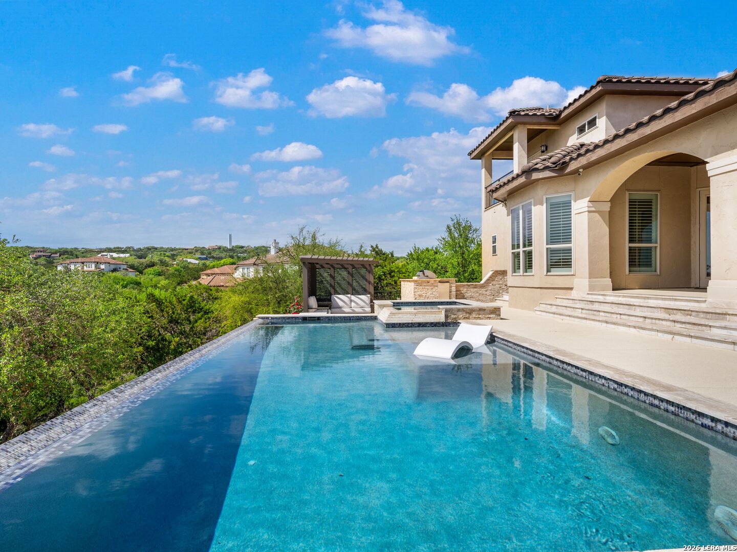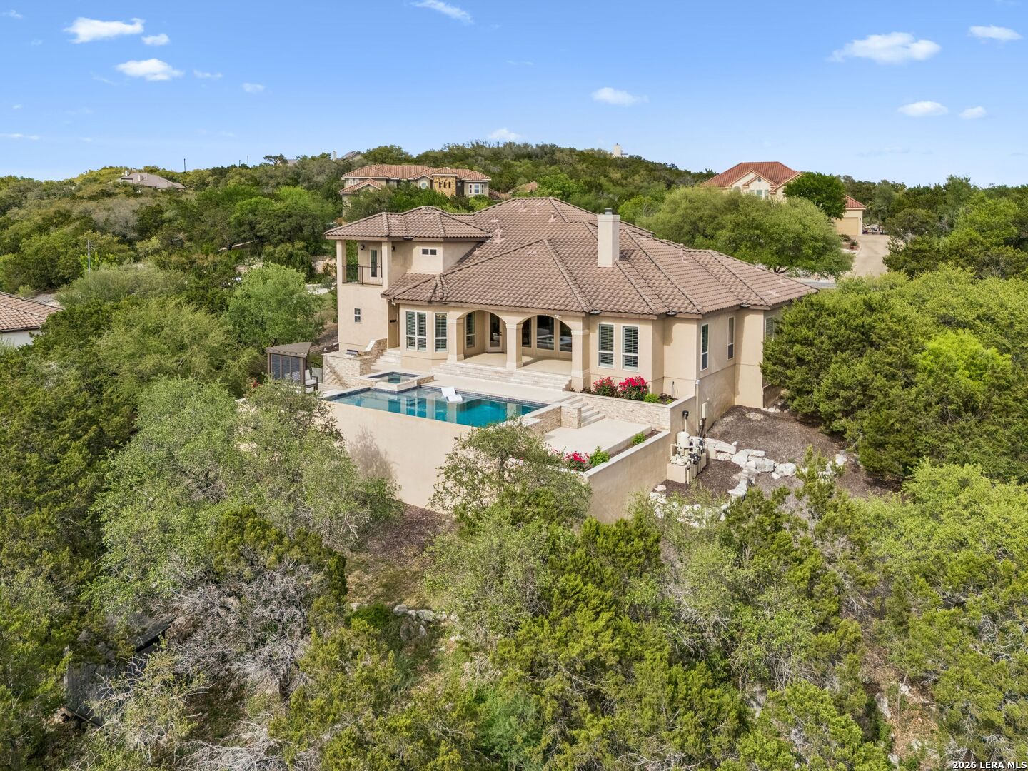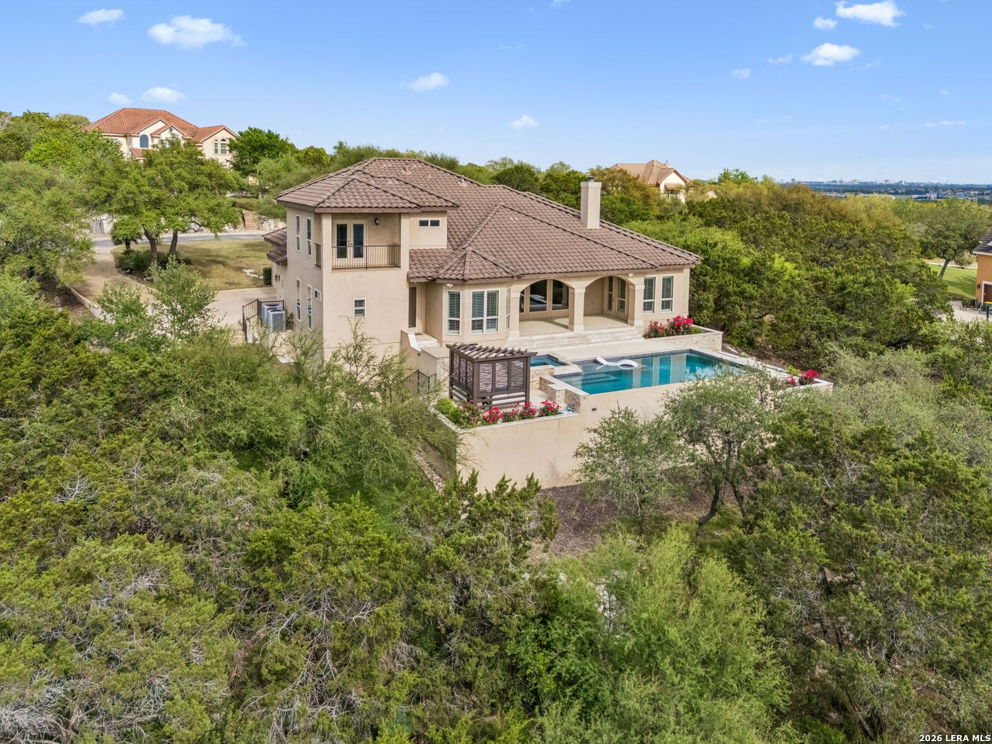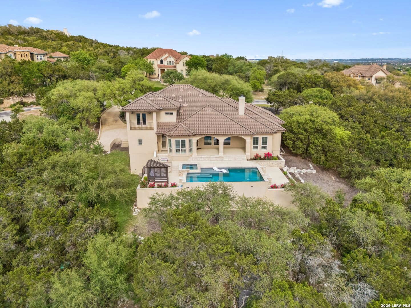 Set on just over two acres within Acadia Heights Estates, this residence brings together scale, craftsmanship, and a layout that feels both intentional and comfortable. From the moment you enter, natural light, ceiling height, and material selection establish a refined but livable atmosphere carried throughout the home. The main living area is defined by its volume and openness, anchored by a stone fireplace and framed by well placed windows that draw in the surrounding landscape. The kitchen is positioned as a central gathering space, equipped with stainless steel appliances, gas cooking, double ovens, extensive cabinetry, and a large island with bar seating. It connects seamlessly to the living and dining areas, supporting both daily living and entertaining. The primary suite is privately situated and designed as a retreat, featuring custom ceiling details and a well appointed bath with separate vanities, a seamless glass walk in shower, and a spacious walk in closet. A secondary guest bedroom is located on the main level, offering flexibility for guests or extended stays. Upstairs, two additional bedrooms provide separation and privacy, including one with a private balcony that captures expansive, picturesque views. An oversized game room completes the upper level, creating an additional space for gathering or relaxation. The outdoor setting is a defining feature of the property, where panoramic views create a true sense of openness and privacy. A pool and spa anchor the backyard, complemented by mature landscaping, extensive decking, and a covered patio designed for year round use.