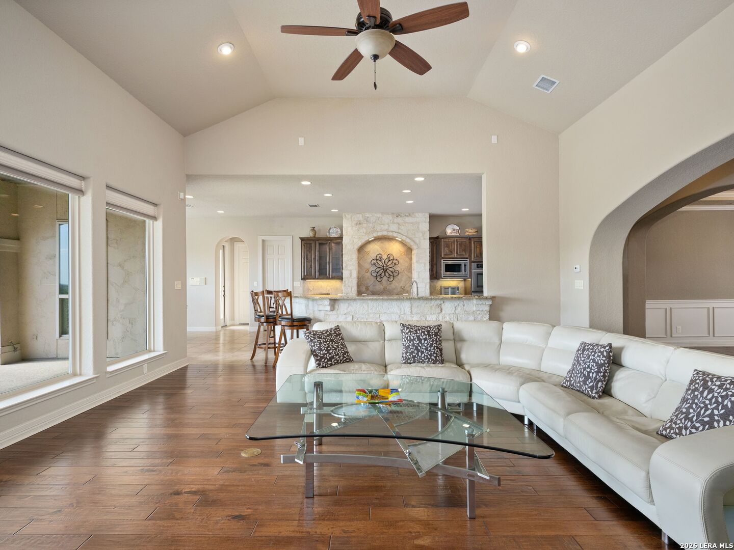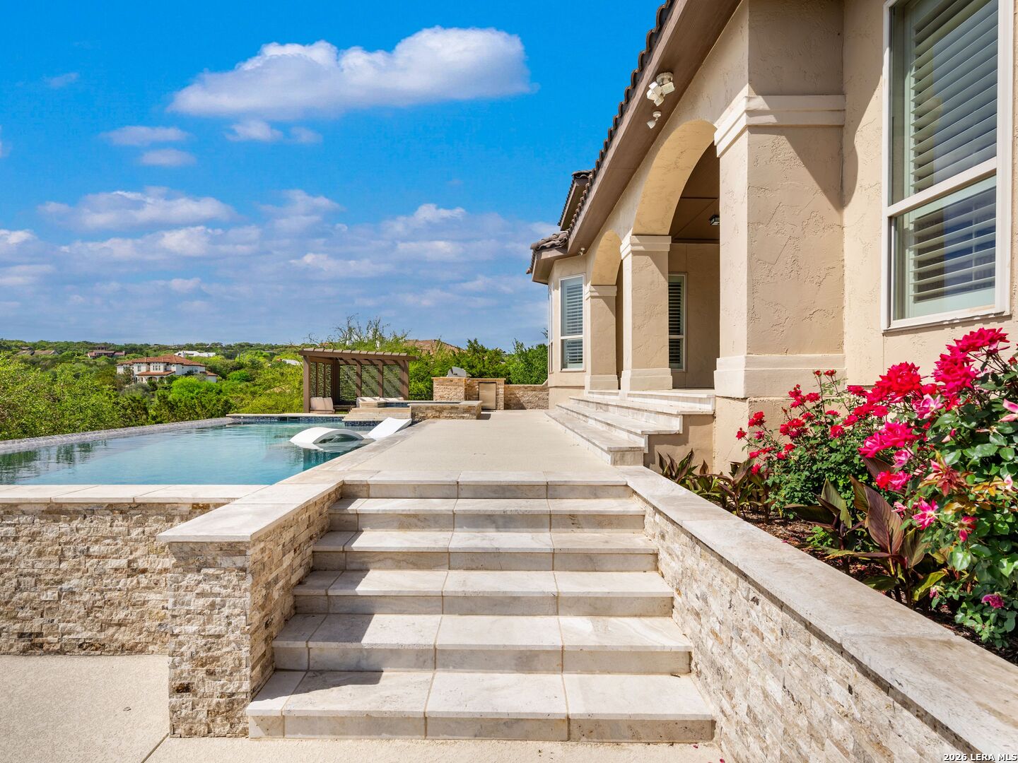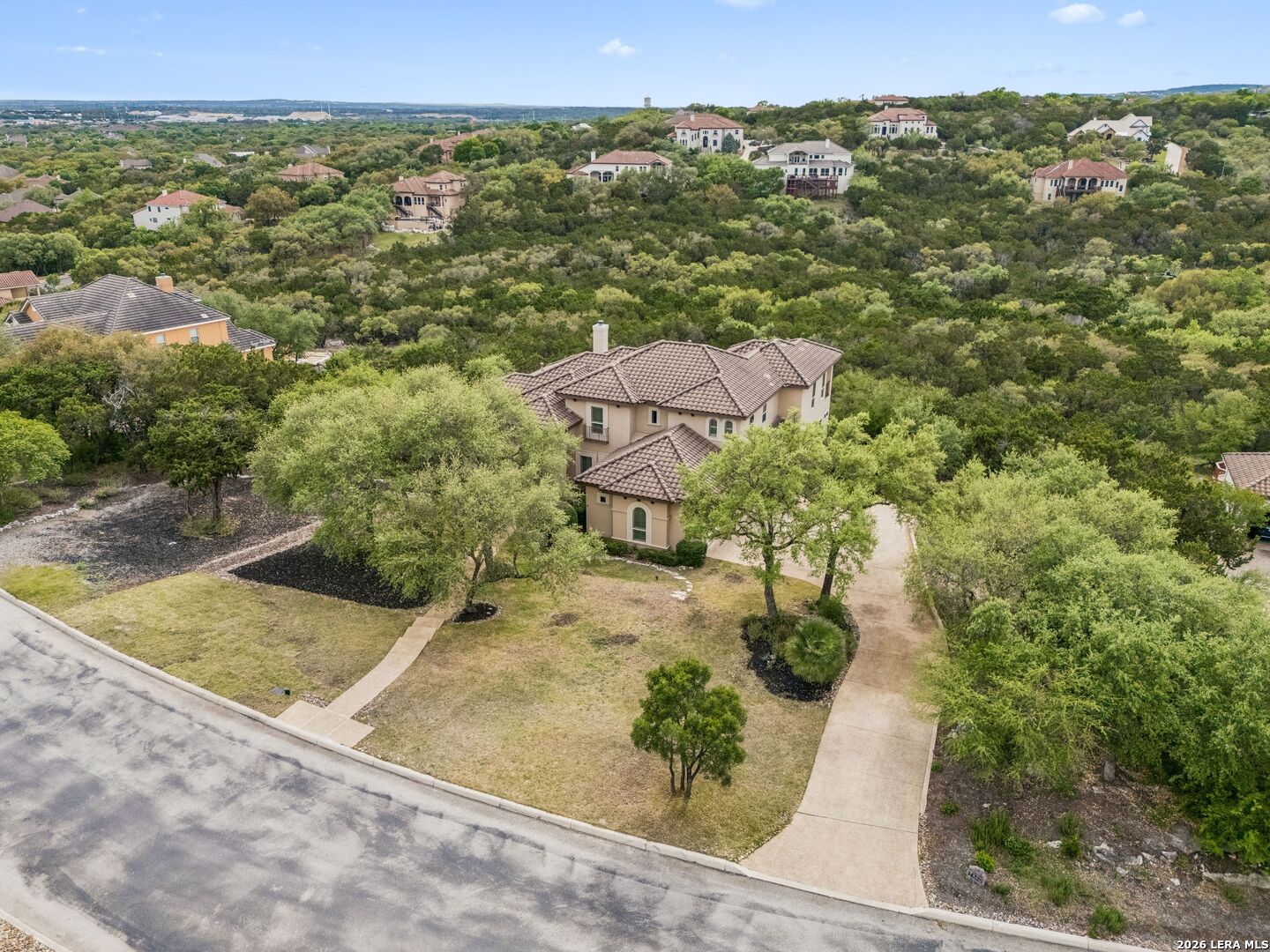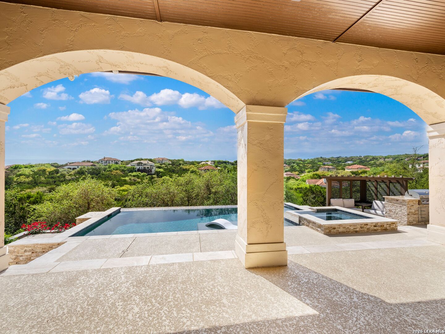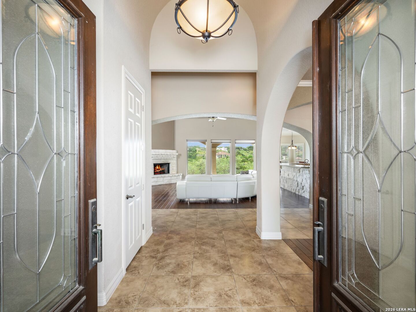Set on just over two acres within Acadia Heights Estates, this residence brings together scale, craftsmanship, and a layout that feels both intentional and comfortable. From the moment you enter, natural light, ceiling height, and material selection establish a refined but livable atmosphere carried throughout the home. The main living area is defined by its volume and openness, anchored by a stone fireplace and framed by well placed windows that draw in the surrounding landscape. The kitchen is positioned as a central gathering space, equipped with stainless steel appliances, gas cooking, double ovens, extensive cabinetry, and a large island with bar seating. It connects seamlessly to the living and dining areas, supporting both daily living and entertaining. The primary suite is privately situated and designed as a retreat, featuring custom ceiling details and a well appointed bath with separate vanities, a seamless glass walk in shower, and a spacious walk in closet. A secondary guest bedroom is located on the main level, offering flexibility for guests or extended stays. Upstairs, two additional bedrooms provide separation and privacy, including one with a private balcony that captures expansive, picturesque views. An oversized game room completes the upper level, creating an additional space for gathering or relaxation. The outdoor setting is a defining feature of the property, where panoramic views create a true sense of openness and privacy. A pool and spa anchor the backyard, complemented by mature landscaping, extensive decking, and a covered patio designed for year round use.