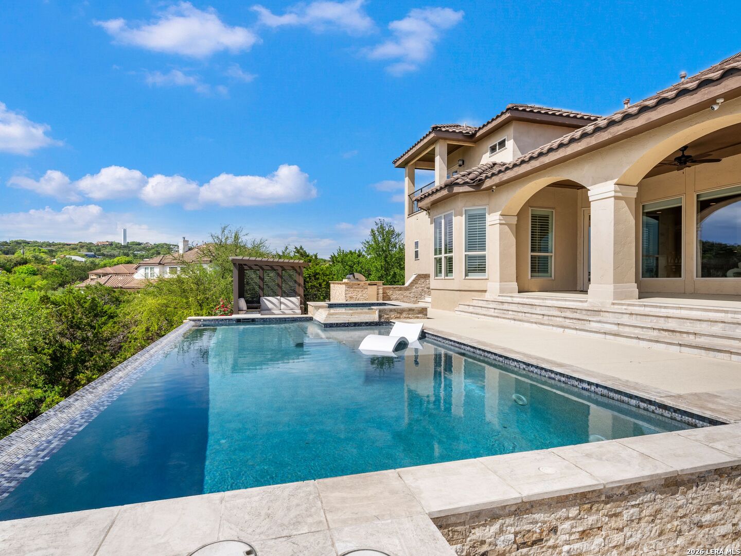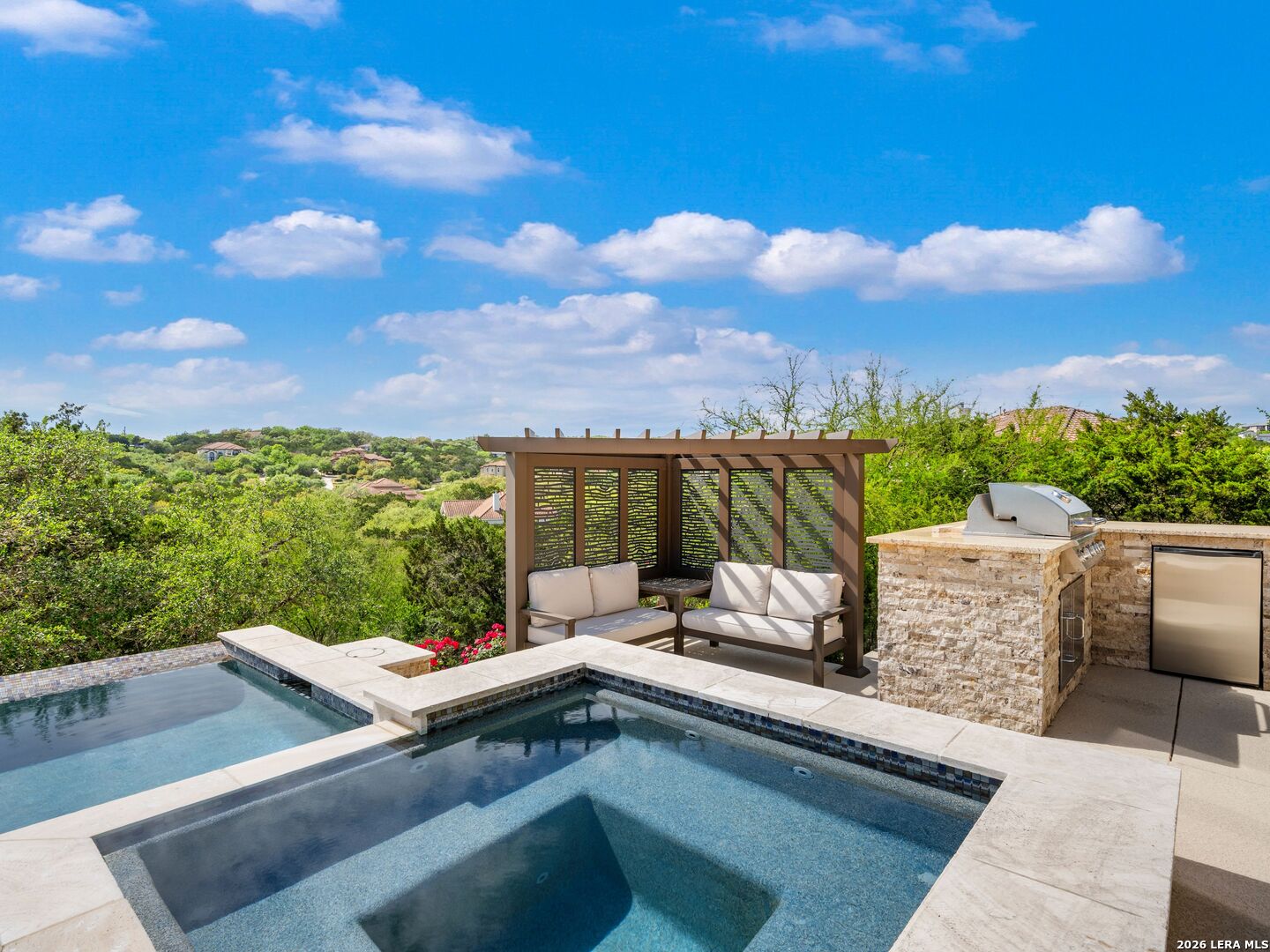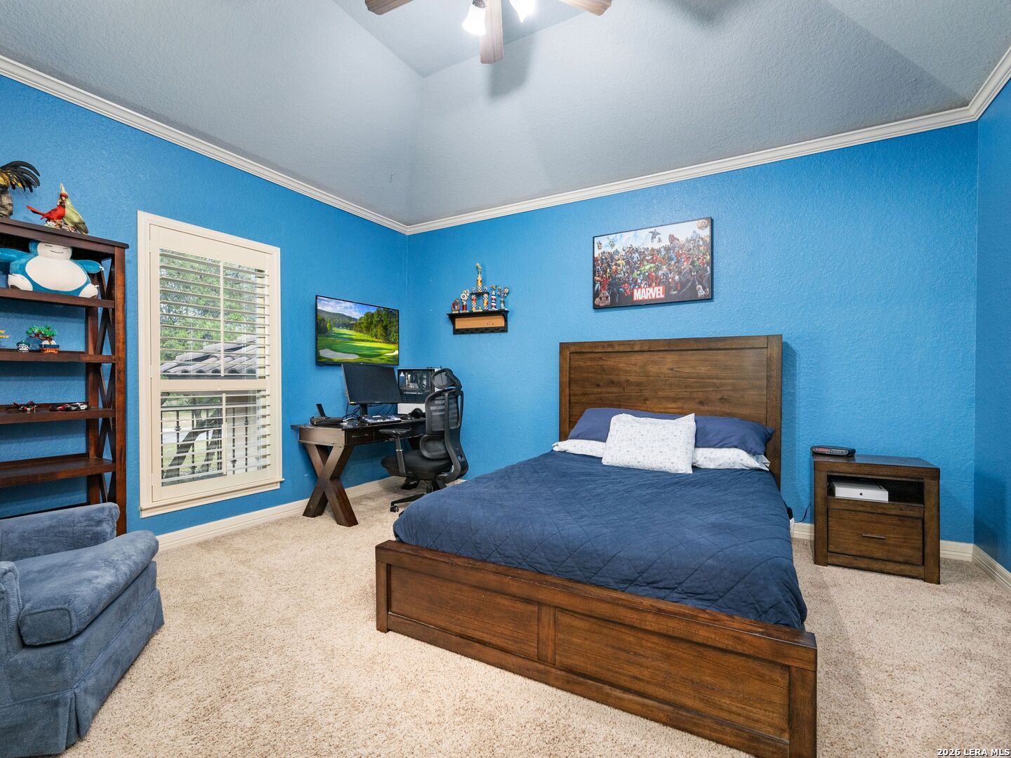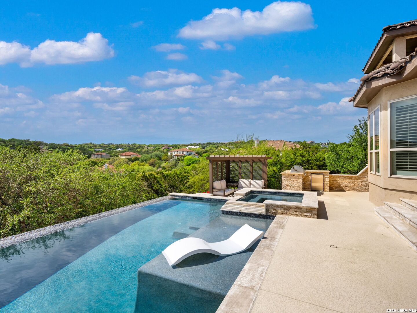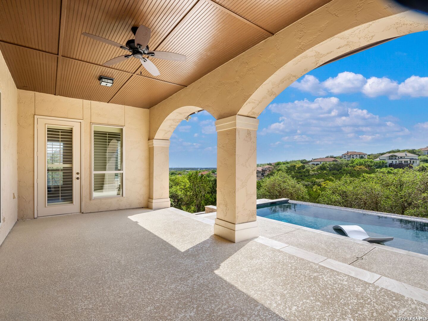 Set on just over two acres within Acadia Heights Estates, this residence brings together scale, craftsmanship, and a layout that feels both intentional and comfortable. From the moment you enter, natural light, ceiling height, and material selection establish a refined but livable atmosphere carried throughout the home. The main living area is defined by its volume and openness, anchored by a stone fireplace and framed by well placed windows that draw in the surrounding landscape. The kitchen is positioned as a central gathering space, equipped with stainless steel appliances, gas cooking, double ovens, extensive cabinetry, and a large island with bar seating. It connects seamlessly to the living and dining areas, supporting both daily living and entertaining. The primary suite is privately situated and designed as a retreat, featuring custom ceiling details and a well appointed bath with separate vanities, a seamless glass walk in shower, and a spacious walk in closet. A secondary guest bedroom is located on the main level, offering flexibility for guests or extended stays. Upstairs, two additional bedrooms provide separation and privacy, including one with a private balcony that captures expansive, picturesque views. An oversized game room completes the upper level, creating an additional space for gathering or relaxation. The outdoor setting is a defining feature of the property, where panoramic views create a true sense of openness and privacy. A pool and spa anchor the backyard, complemented by mature landscaping, extensive decking, and a covered patio designed for year round use.