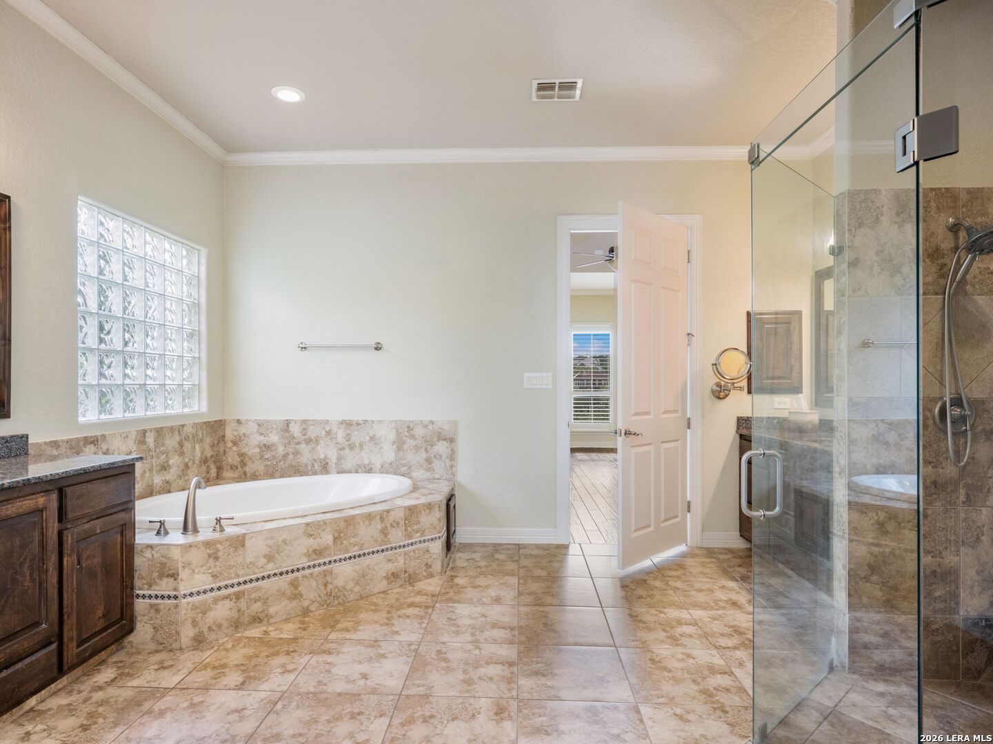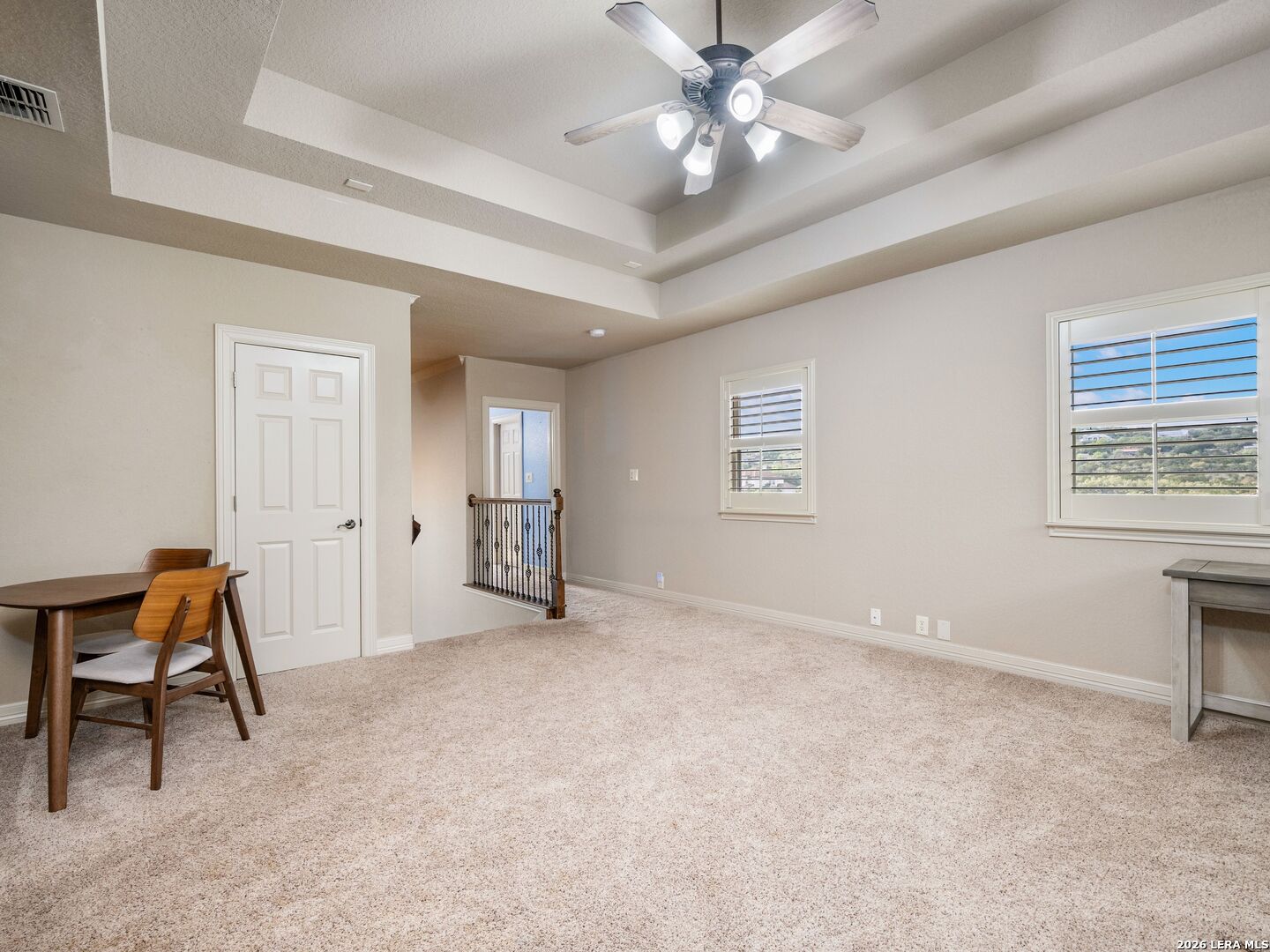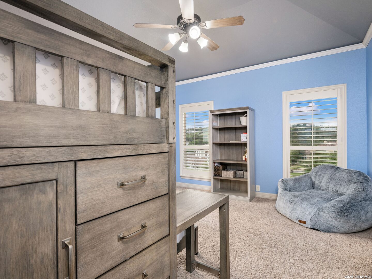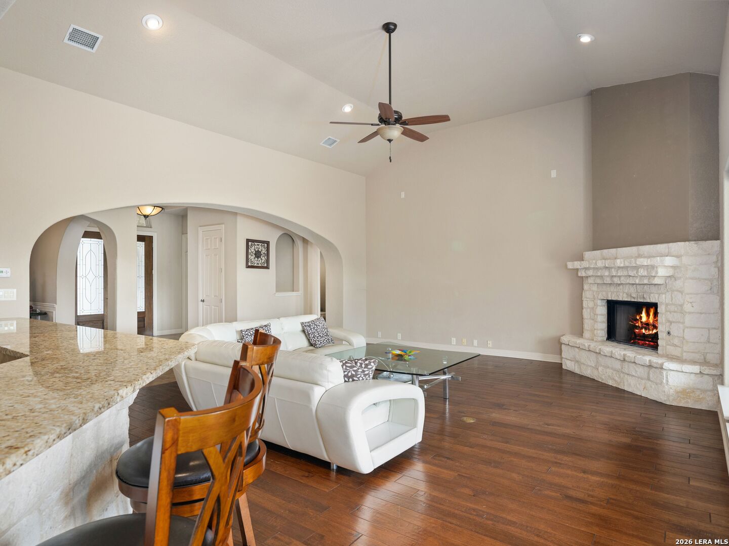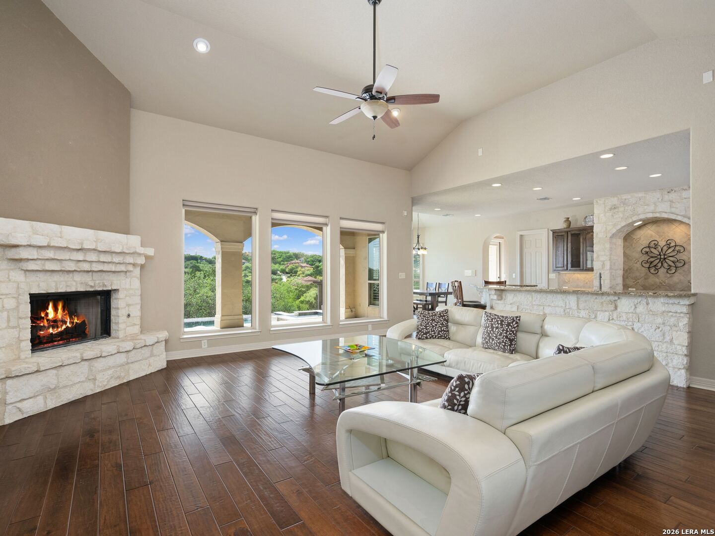 Set on just over two acres within Acadia Heights Estates, this residence brings together scale, craftsmanship, and a layout that feels both intentional and comfortable. From the moment you enter, natural light, ceiling height, and material selection establish a refined but livable atmosphere carried throughout the home. The main living area is defined by its volume and openness, anchored by a stone fireplace and framed by well placed windows that draw in the surrounding landscape. The kitchen is positioned as a central gathering space, equipped with stainless steel appliances, gas cooking, double ovens, extensive cabinetry, and a large island with bar seating. It connects seamlessly to the living and dining areas, supporting both daily living and entertaining. The primary suite is privately situated and designed as a retreat, featuring custom ceiling details and a well appointed bath with separate vanities, a seamless glass walk in shower, and a spacious walk in closet. A secondary guest bedroom is located on the main level, offering flexibility for guests or extended stays. Upstairs, two additional bedrooms provide separation and privacy, including one with a private balcony that captures expansive, picturesque views. An oversized game room completes the upper level, creating an additional space for gathering or relaxation. The outdoor setting is a defining feature of the property, where panoramic views create a true sense of openness and privacy. A pool and spa anchor the backyard, complemented by mature landscaping, extensive decking, and a covered patio designed for year round use.