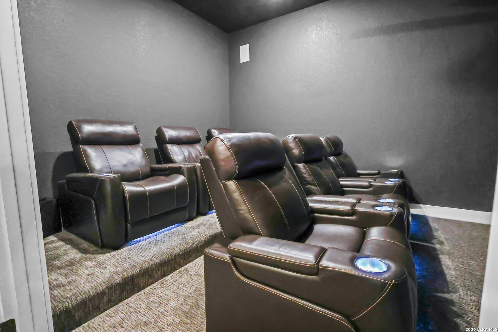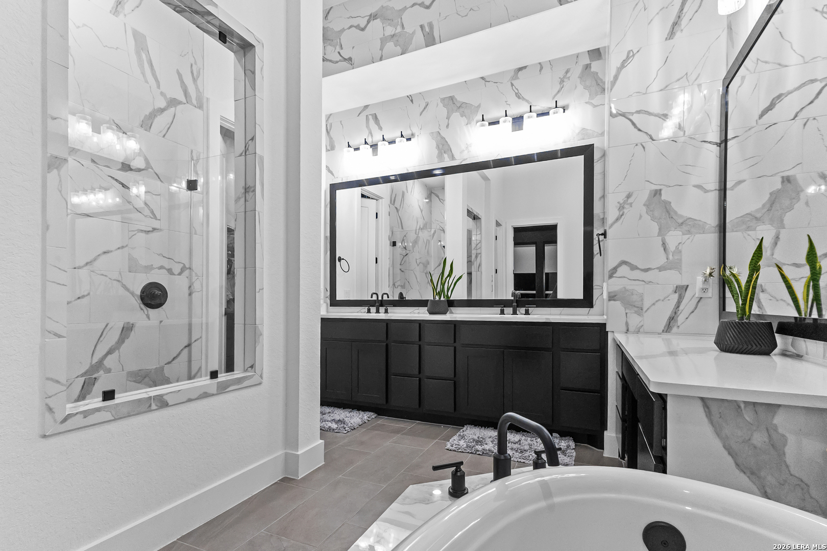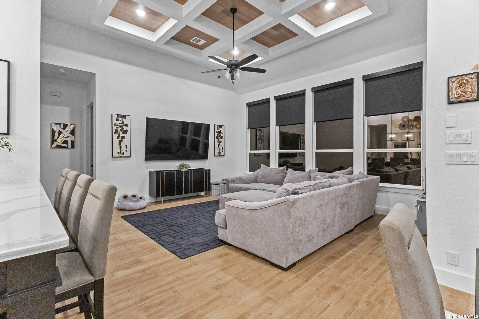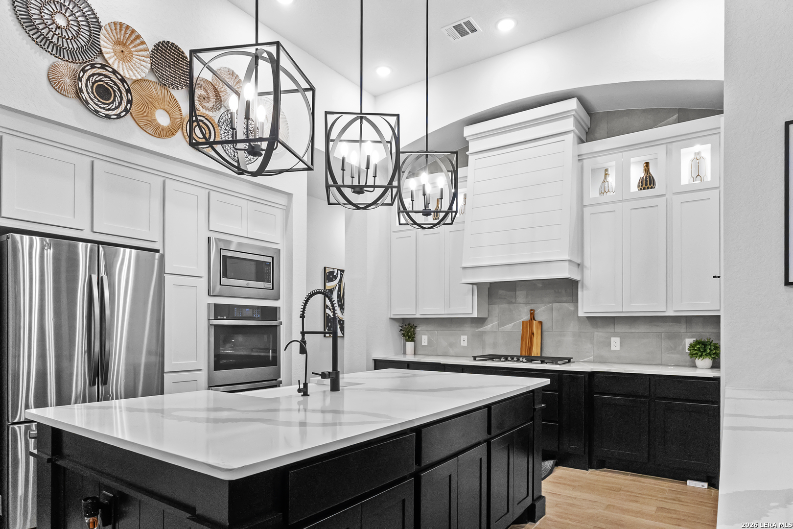 Stunning one-story luxury home situated on a rare 70-ft wide corner lot in the Ventana community of Bulverde, set on a quiet cul-de-sac and backing to a peaceful Hill Country greenbelt, with no neighbors on one side for added privacy. This highly sought after Highland Homes floorplan offers an exceptional layout featuring 4 spacious bedrooms, 4.5 bathrooms, a private study, and a dedicated media room. Each bedroom includes its own en-suite bath, providing comfort and convenience for family and guests alike. High ceilings throughout enhance the sense of space and natural light. Designed for both entertaining and everyday living, the open-concept kitchen showcases dual islands, upgraded finishes, and abundant counter space, flowing seamlessly into the main living areas. The home is filled with premium upgrades throughout, combining modern elegance with thoughtful design. Enjoy tranquil greenbelt views, the exclusivity of a wide lot, and the ease of a single-story layout in one of Bulverde's most desirable Hill Country communities.
