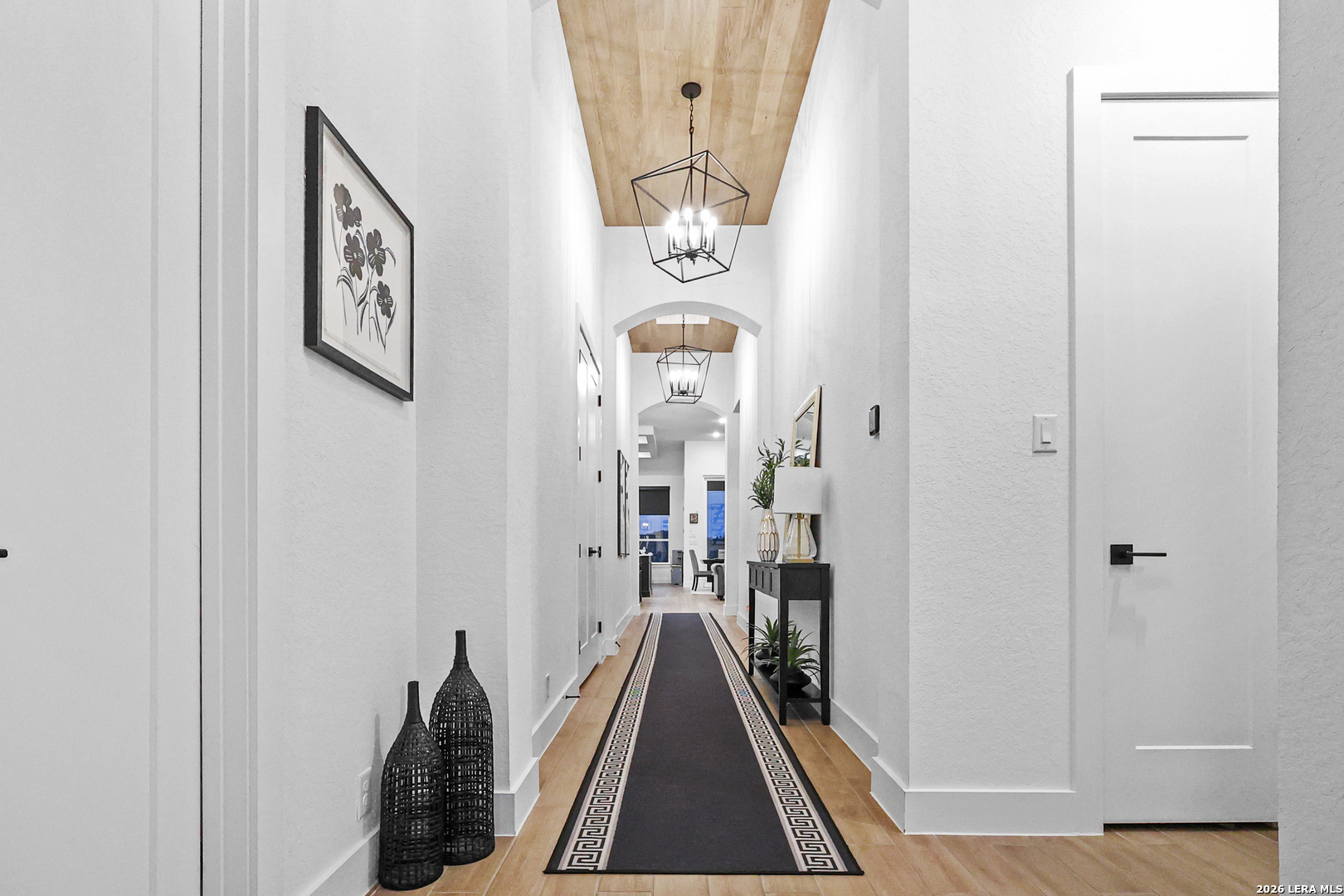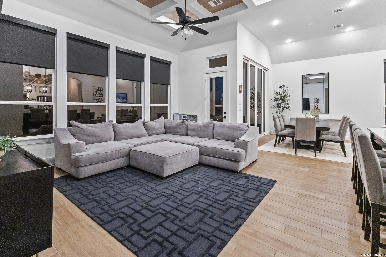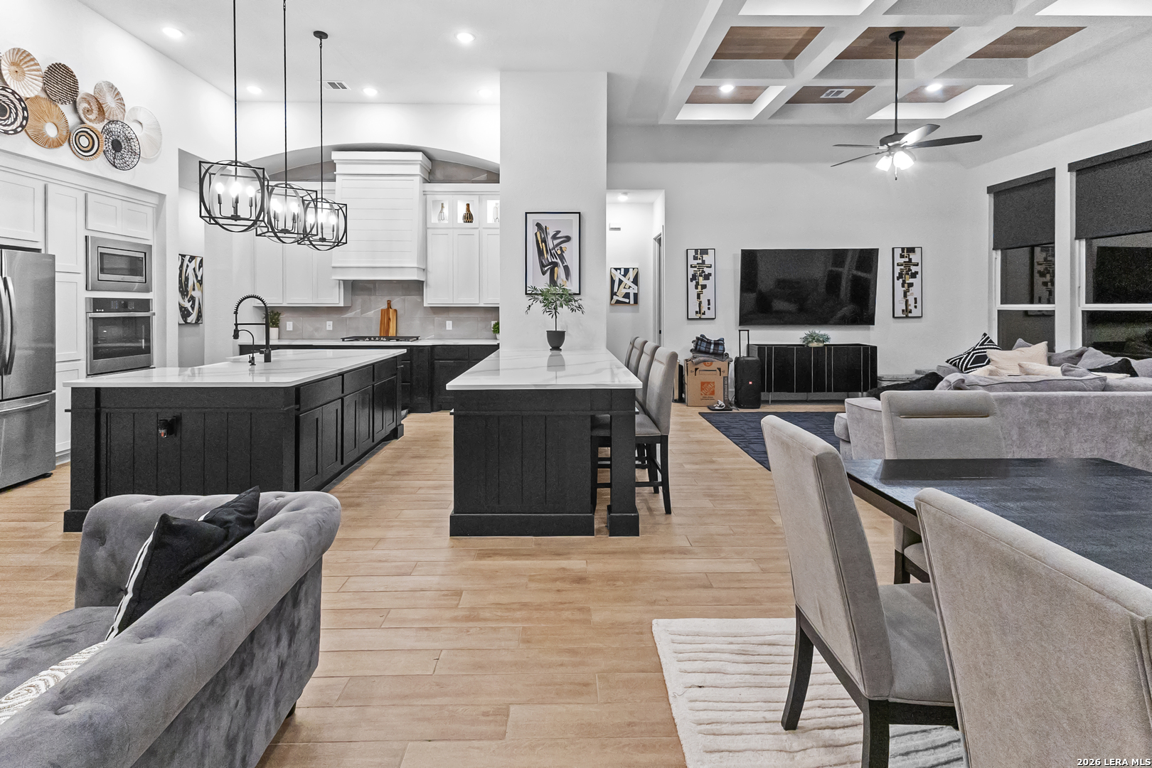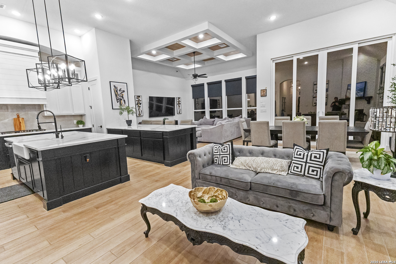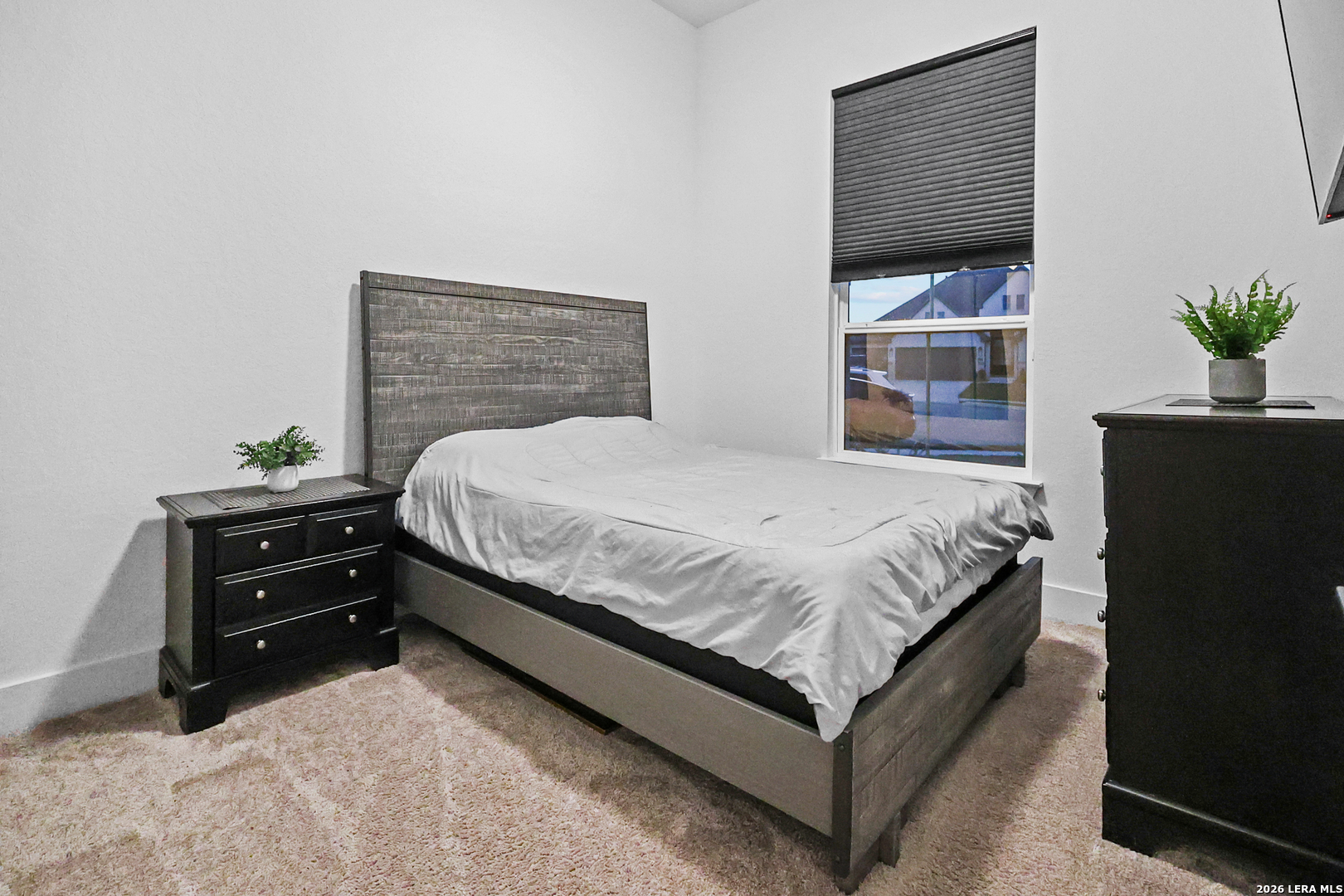 Stunning one-story luxury home situated on a rare 70-ft wide corner lot in the Ventana community of Bulverde, set on a quiet cul-de-sac and backing to a peaceful Hill Country greenbelt, with no neighbors on one side for added privacy. This highly sought after Highland Homes floorplan offers an exceptional layout featuring 4 spacious bedrooms, 4.5 bathrooms, a private study, and a dedicated media room. Each bedroom includes its own en-suite bath, providing comfort and convenience for family and guests alike. High ceilings throughout enhance the sense of space and natural light. Designed for both entertaining and everyday living, the open-concept kitchen showcases dual islands, upgraded finishes, and abundant counter space, flowing seamlessly into the main living areas. The home is filled with premium upgrades throughout, combining modern elegance with thoughtful design. Enjoy tranquil greenbelt views, the exclusivity of a wide lot, and the ease of a single-story layout in one of Bulverde's most desirable Hill Country communities.