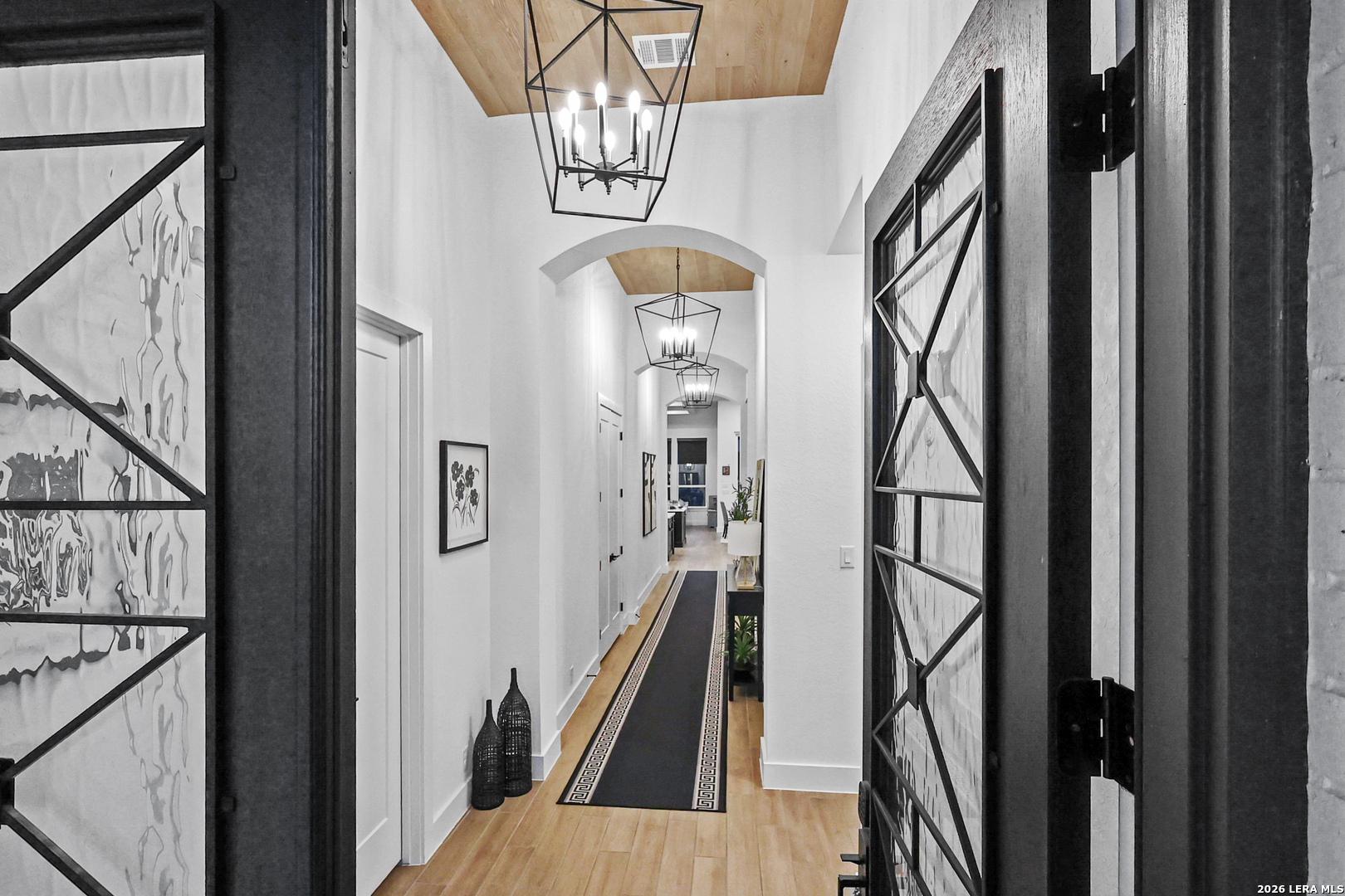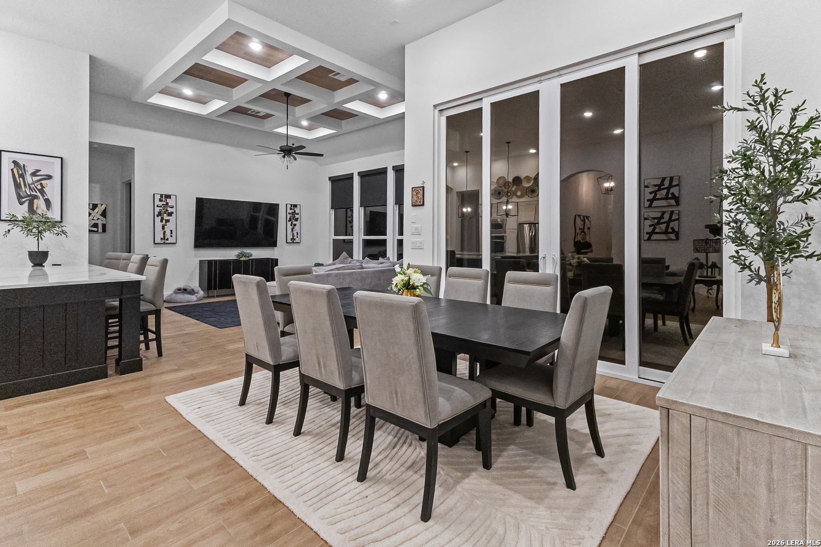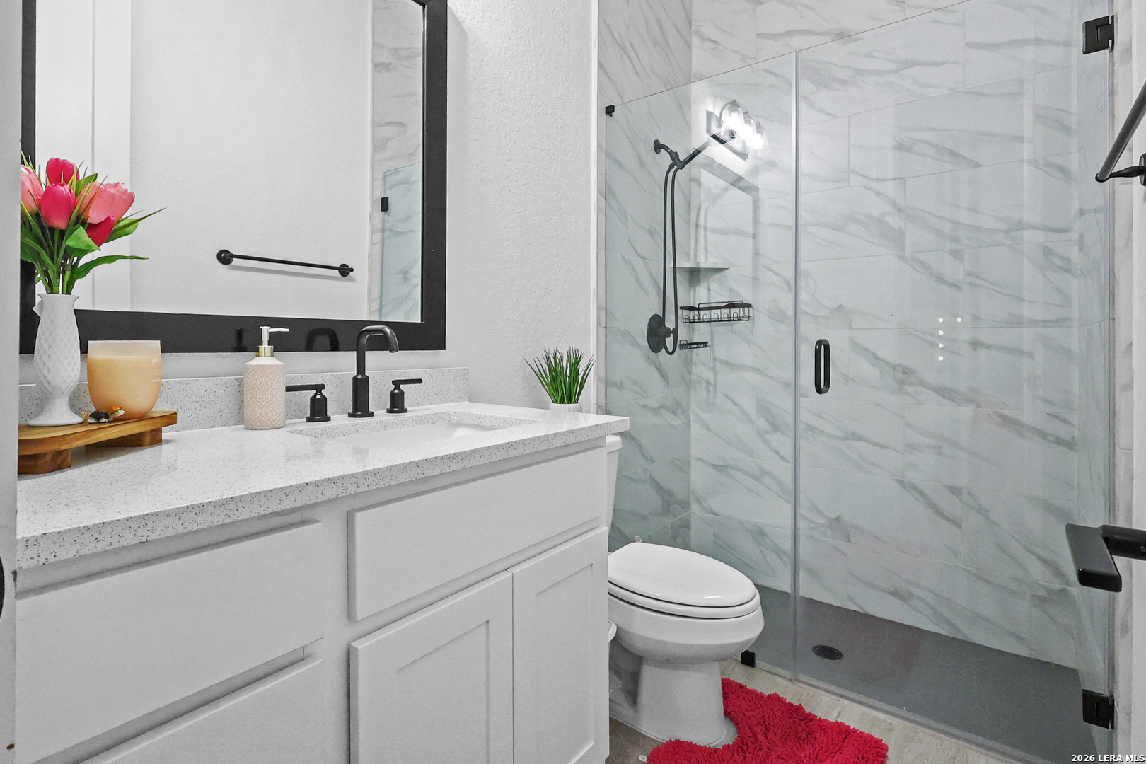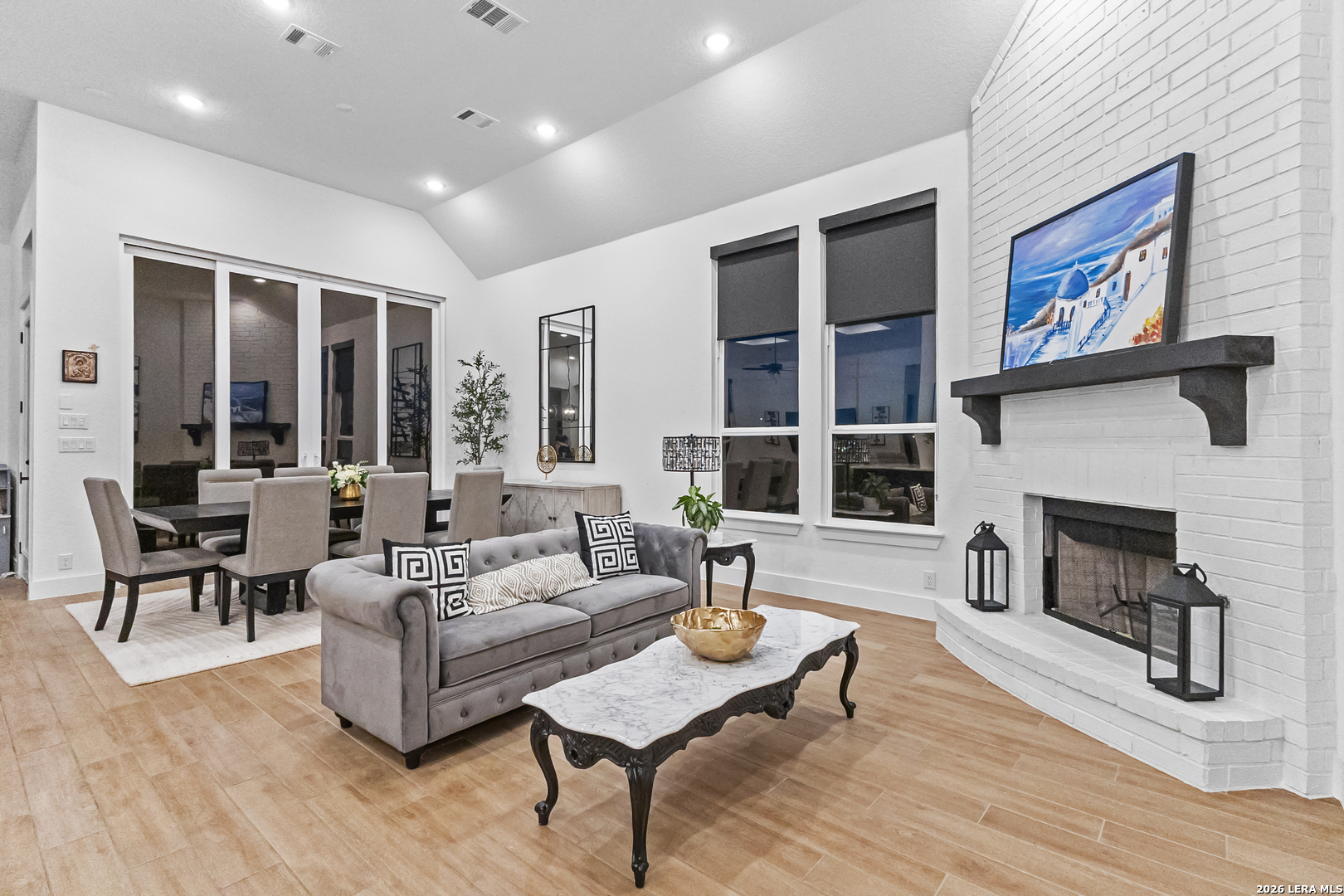 Stunning one-story luxury home situated on a rare 70-ft wide corner lot in the Ventana community of Bulverde, set on a quiet cul-de-sac and backing to a peaceful Hill Country greenbelt, with no neighbors on one side for added privacy. This highly sought after Highland Homes floorplan offers an exceptional layout featuring 4 spacious bedrooms, 4.5 bathrooms, a private study, and a dedicated media room. Each bedroom includes its own en-suite bath, providing comfort and convenience for family and guests alike. High ceilings throughout enhance the sense of space and natural light. Designed for both entertaining and everyday living, the open-concept kitchen showcases dual islands, upgraded finishes, and abundant counter space, flowing seamlessly into the main living areas. The home is filled with premium upgrades throughout, combining modern elegance with thoughtful design. Enjoy tranquil greenbelt views, the exclusivity of a wide lot, and the ease of a single-story layout in one of Bulverde's most desirable Hill Country communities.