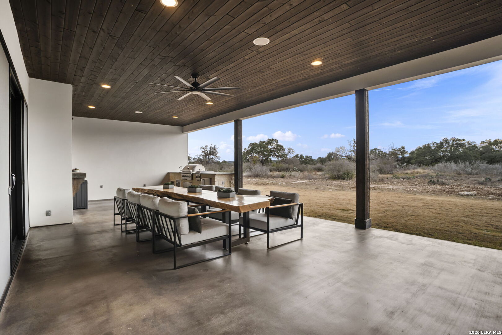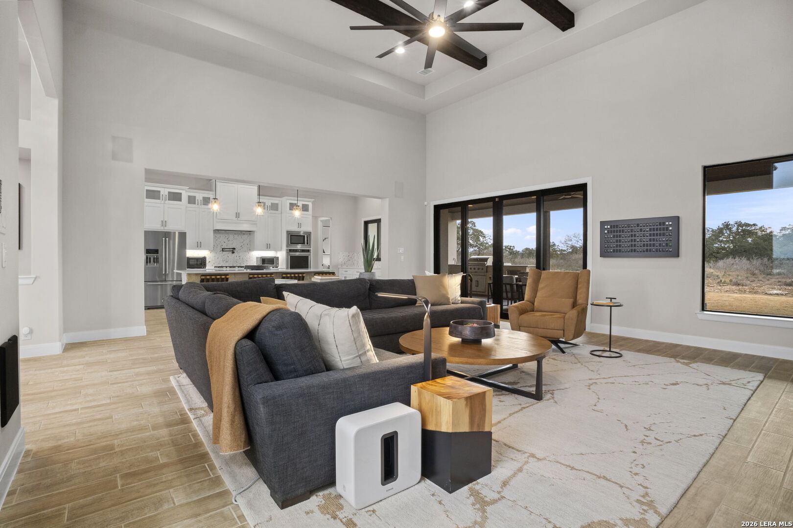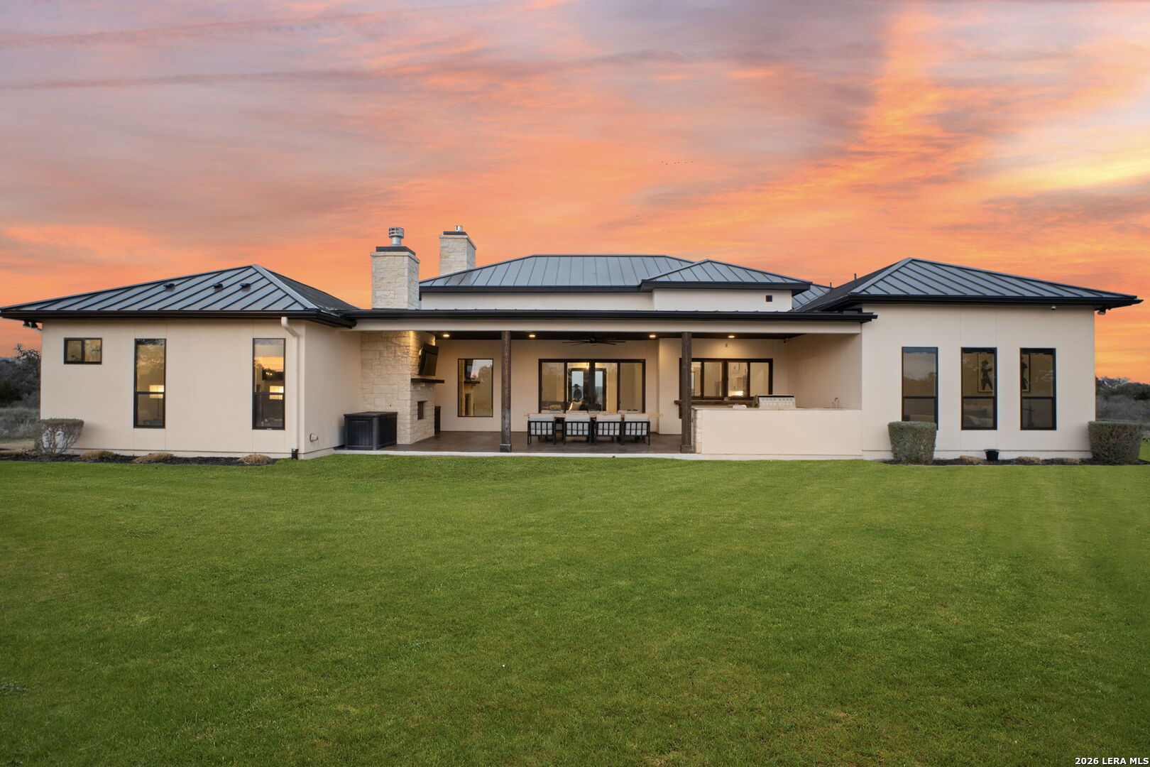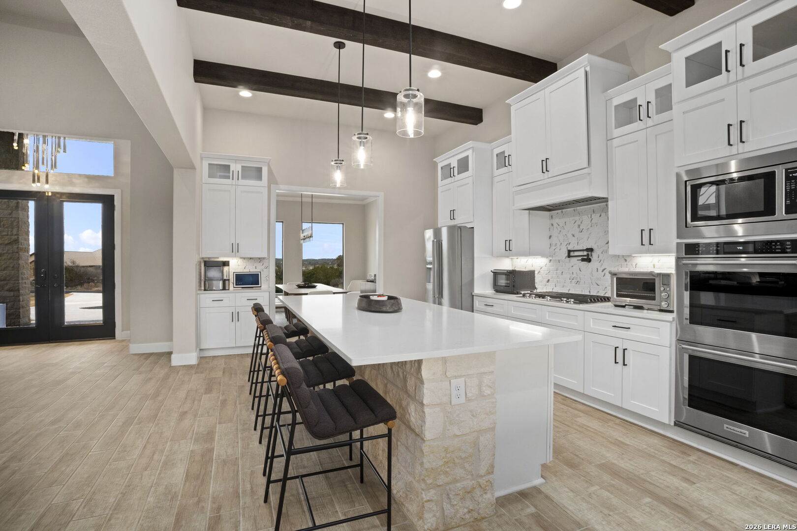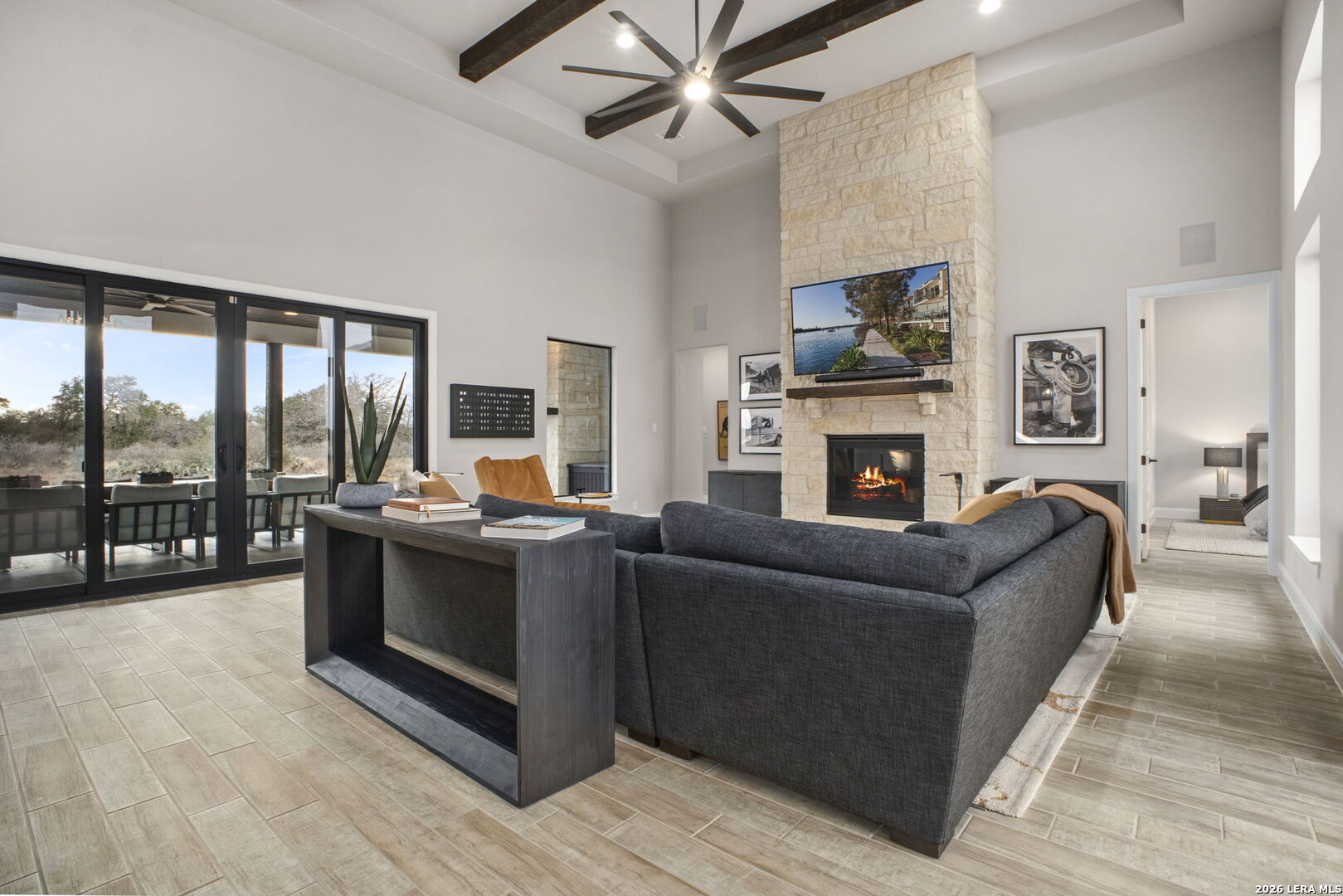 This luxurious, impeccably maintained single-story home is in the highly sought-after gated community of The Peninsula at Mystic Shores, nestled along the shores of the Guadalupe River and Canyon Lake, where water sports and neighborhood amenities abound. A grand entry welcomes you into an open-concept living space seamlessly integrating the living, kitchen, dining, and outdoor living areas-an entertainer's dream. The home features elegant ceramic tile flooring throughout, recessed lighting, quartz countertops, soaring ceilings, and stained wood beams accenting the living area, anchored by a dramatic floor-to-ceiling stone fireplace. The expansive breakfast bar with stone surround serves as the centerpiece for gatherings, while the chef's kitchen is equipped with stainless steel appliances, gas cooktop, double ovens, pot filler, and a convenient window pass-through to the outdoor bar. Outdoor living is exceptional, offering stained concrete flooring, a floor-to-ceiling stone fireplace, stone-enclosed outdoor kitchen, shiplap ceiling, ceiling fan, and a surround-sound system-perfect for year-round enjoyment. The primary suite is a true sanctuary, featuring a spa-like bath and a large walk-in closet with direct access to the oversized utility room, complete with its own dog spa. A fifth bedroom, located opposite the primary suite, is currently utilized as a fully equipped fitness room and would also make an ideal private study. The opposite wing of the home includes a spacious guest suite with an ensuite bath, along with two additional bedrooms connected by a well-appointed Jack-and-Jill bath, each offering walk-in closets. This home shows like a meticulously appointed model, offering effortless living, exceptional entertaining spaces, and an incredible Hill Country location. With access to outstanding amenities and serene surroundings, this private retreat invites you to make 146 Obscure Way your private retreat.