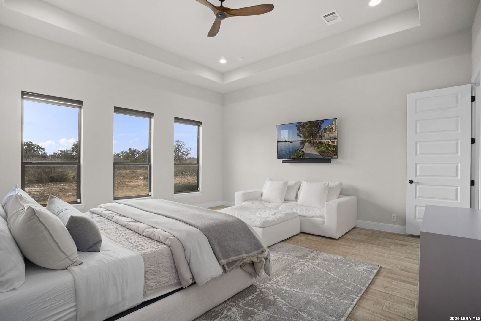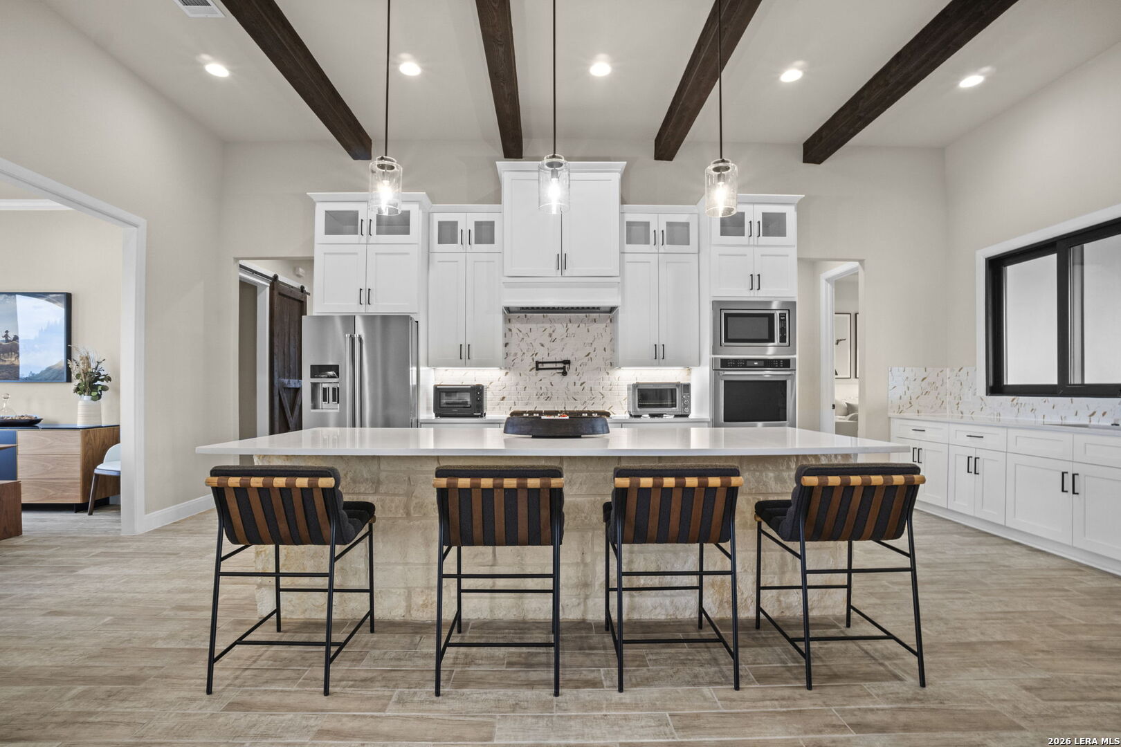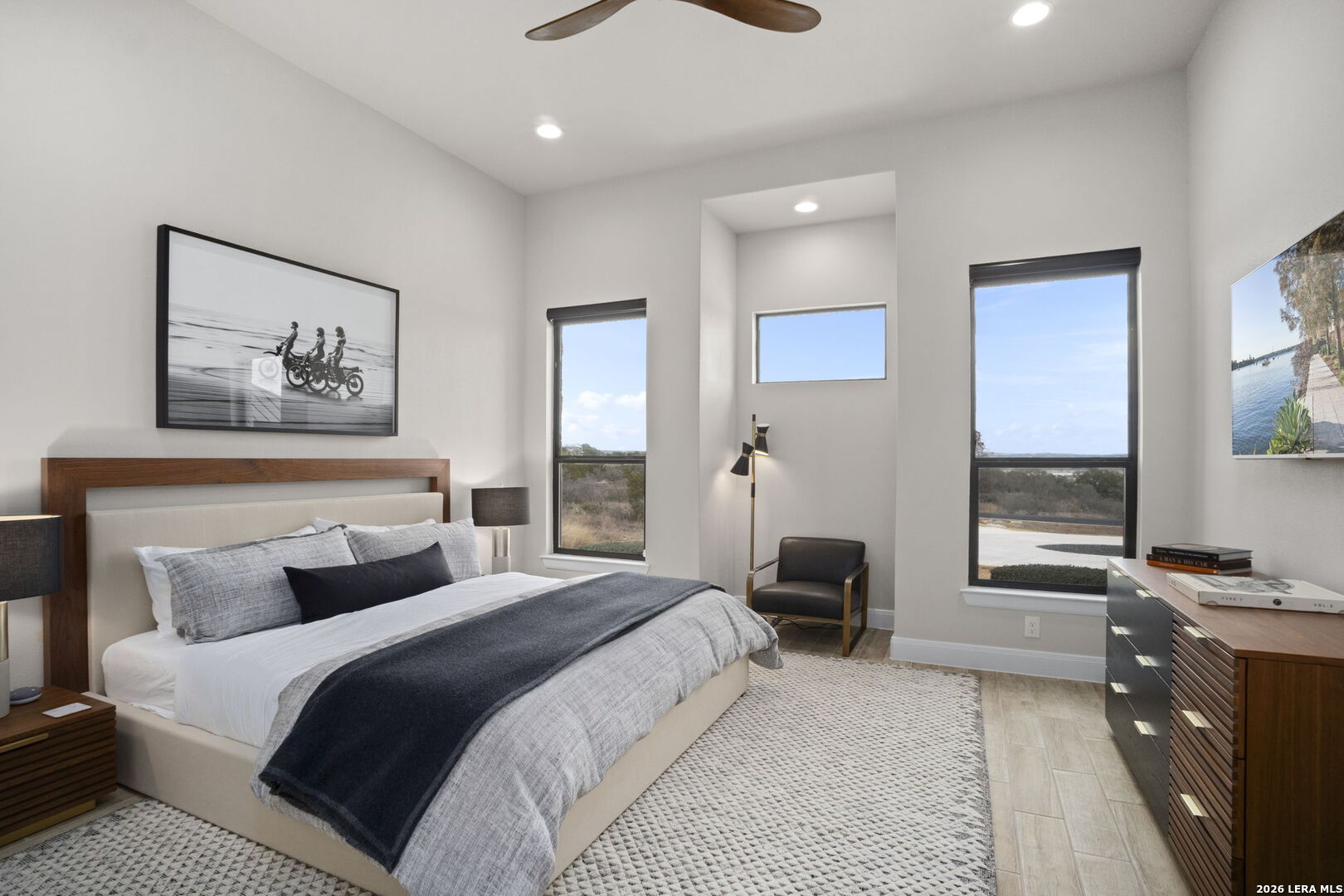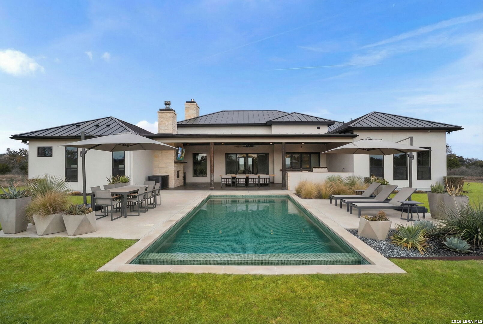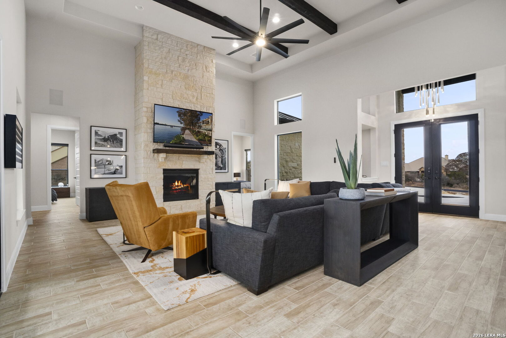 This luxurious, impeccably maintained single-story home is in the highly sought-after gated community of The Peninsula at Mystic Shores, nestled along the shores of the Guadalupe River and Canyon Lake, where water sports and neighborhood amenities abound. A grand entry welcomes you into an open-concept living space seamlessly integrating the living, kitchen, dining, and outdoor living areas-an entertainer's dream. The home features elegant ceramic tile flooring throughout, recessed lighting, quartz countertops, soaring ceilings, and stained wood beams accenting the living area, anchored by a dramatic floor-to-ceiling stone fireplace. The expansive breakfast bar with stone surround serves as the centerpiece for gatherings, while the chef's kitchen is equipped with stainless steel appliances, gas cooktop, double ovens, pot filler, and a convenient window pass-through to the outdoor bar. Outdoor living is exceptional, offering stained concrete flooring, a floor-to-ceiling stone fireplace, stone-enclosed outdoor kitchen, shiplap ceiling, ceiling fan, and a surround-sound system-perfect for year-round enjoyment. The primary suite is a true sanctuary, featuring a spa-like bath and a large walk-in closet with direct access to the oversized utility room, complete with its own dog spa. A fifth bedroom, located opposite the primary suite, is currently utilized as a fully equipped fitness room and would also make an ideal private study. The opposite wing of the home includes a spacious guest suite with an ensuite bath, along with two additional bedrooms connected by a well-appointed Jack-and-Jill bath, each offering walk-in closets. This home shows like a meticulously appointed model, offering effortless living, exceptional entertaining spaces, and an incredible Hill Country location. With access to outstanding amenities and serene surroundings, this private retreat invites you to make 146 Obscure Way your private retreat.