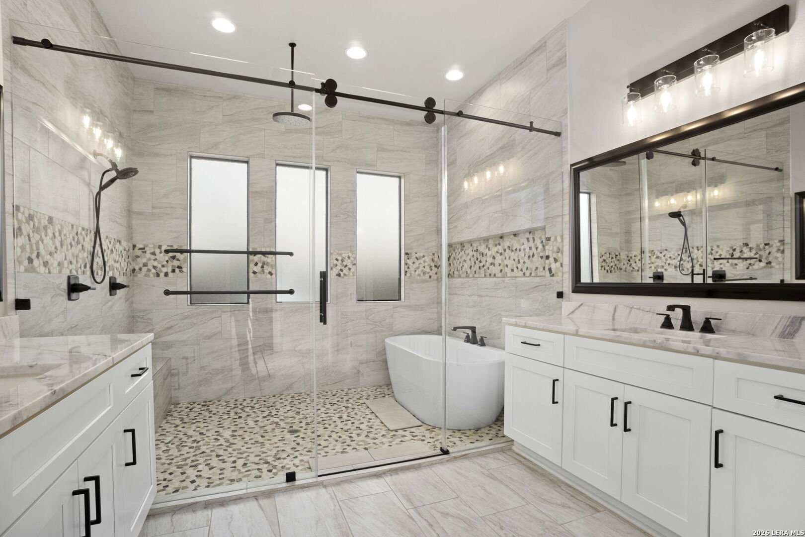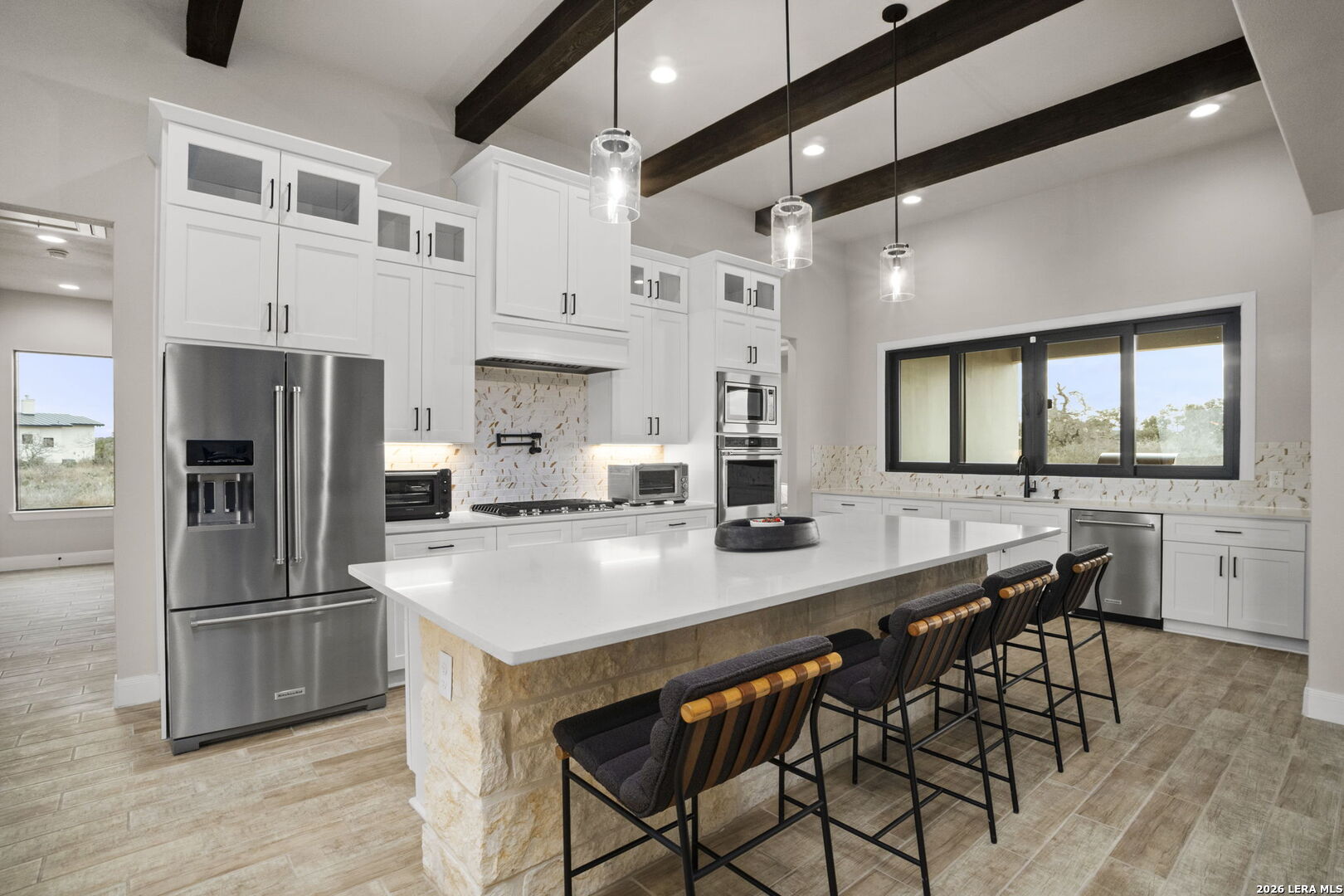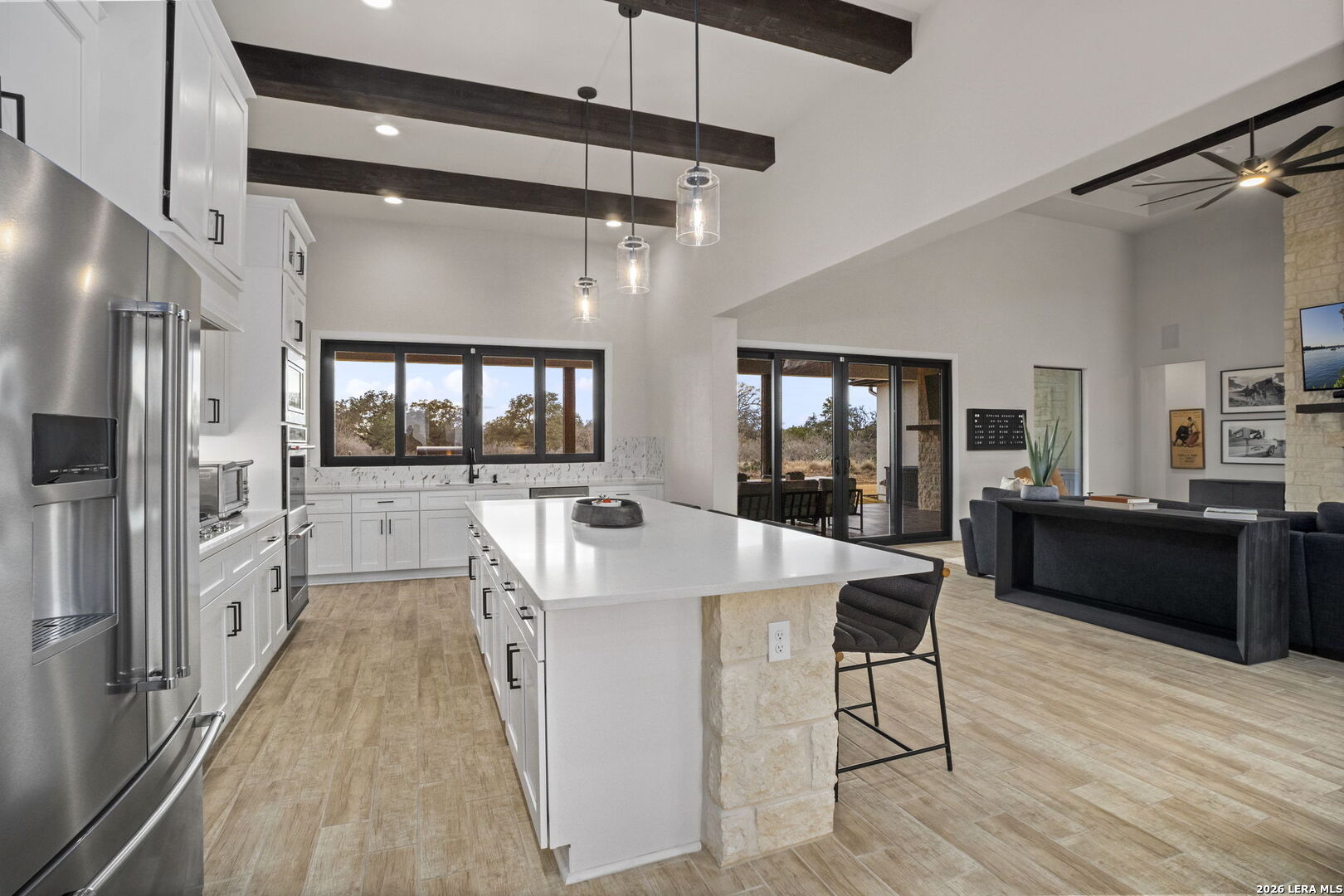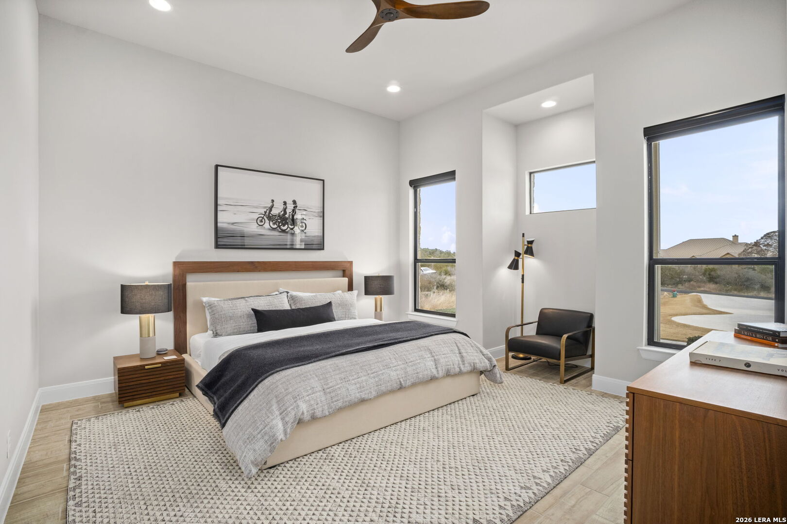 This luxurious, impeccably maintained single-story home is in the highly sought-after gated community of The Peninsula at Mystic Shores, nestled along the shores of the Guadalupe River and Canyon Lake, where water sports and neighborhood amenities abound. A grand entry welcomes you into an open-concept living space seamlessly integrating the living, kitchen, dining, and outdoor living areas-an entertainer's dream. The home features elegant ceramic tile flooring throughout, recessed lighting, quartz countertops, soaring ceilings, and stained wood beams accenting the living area, anchored by a dramatic floor-to-ceiling stone fireplace. The expansive breakfast bar with stone surround serves as the centerpiece for gatherings, while the chef's kitchen is equipped with stainless steel appliances, gas cooktop, double ovens, pot filler, and a convenient window pass-through to the outdoor bar. Outdoor living is exceptional, offering stained concrete flooring, a floor-to-ceiling stone fireplace, stone-enclosed outdoor kitchen, shiplap ceiling, ceiling fan, and a surround-sound system-perfect for year-round enjoyment. The primary suite is a true sanctuary, featuring a spa-like bath and a large walk-in closet with direct access to the oversized utility room, complete with its own dog spa. A fifth bedroom, located opposite the primary suite, is currently utilized as a fully equipped fitness room and would also make an ideal private study. The opposite wing of the home includes a spacious guest suite with an ensuite bath, along with two additional bedrooms connected by a well-appointed Jack-and-Jill bath, each offering walk-in closets. This home shows like a meticulously appointed model, offering effortless living, exceptional entertaining spaces, and an incredible Hill Country location. With access to outstanding amenities and serene surroundings, this private retreat invites you to make 146 Obscure Way your private retreat.