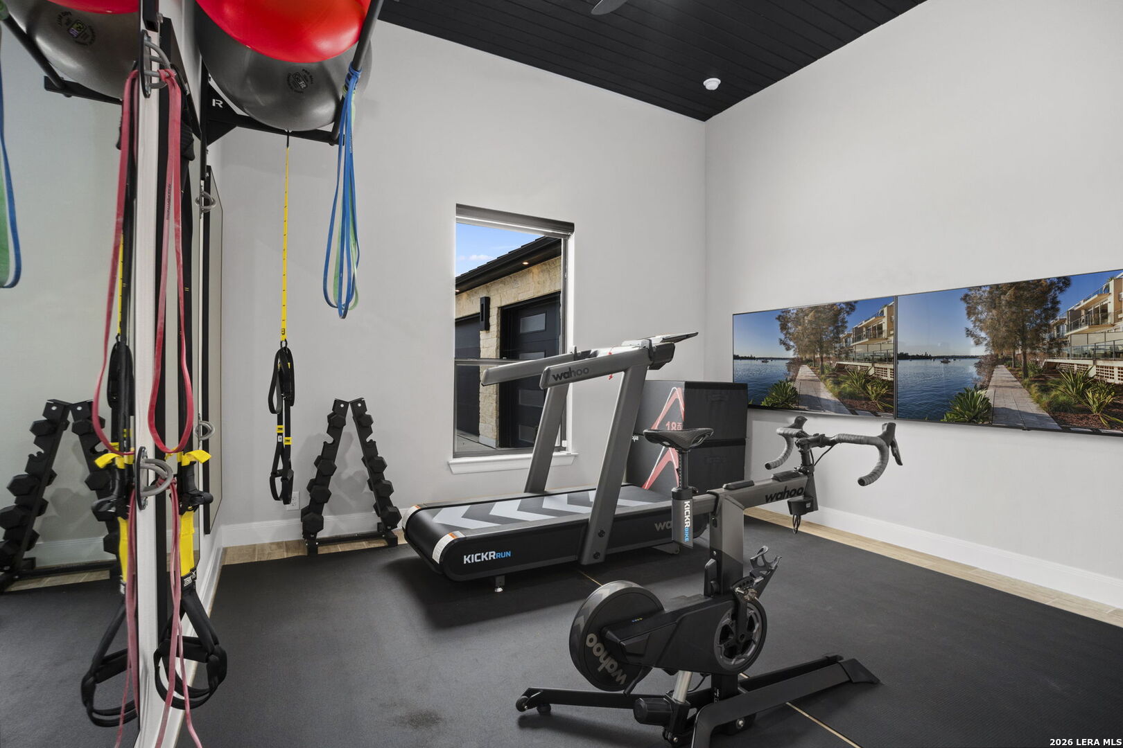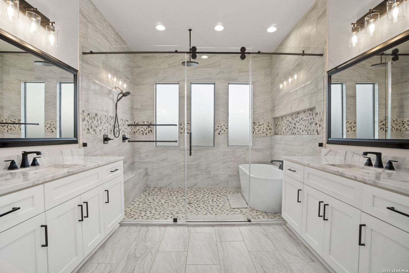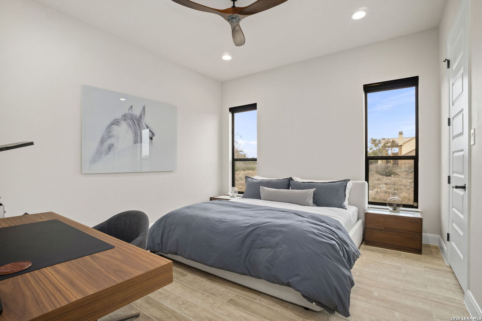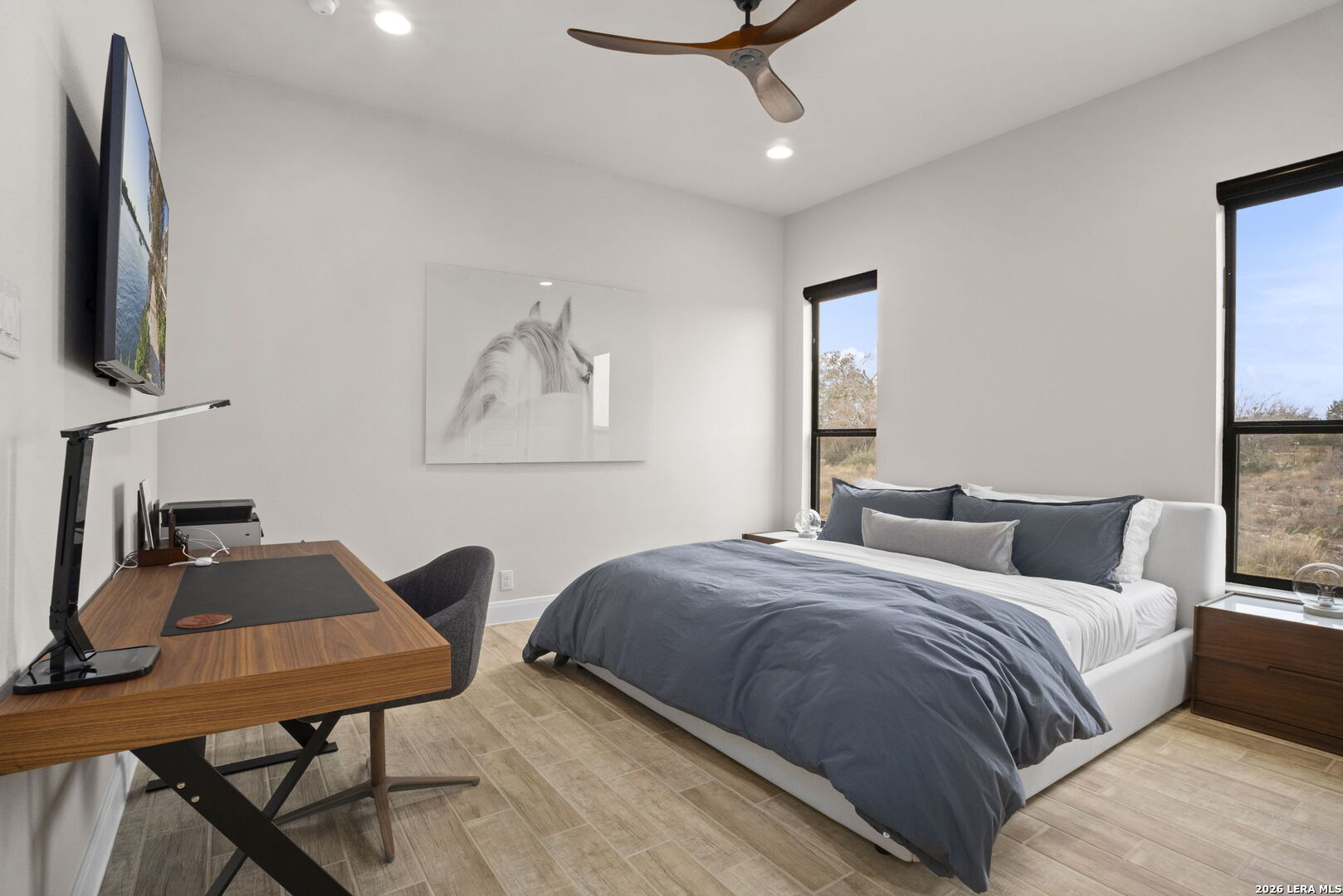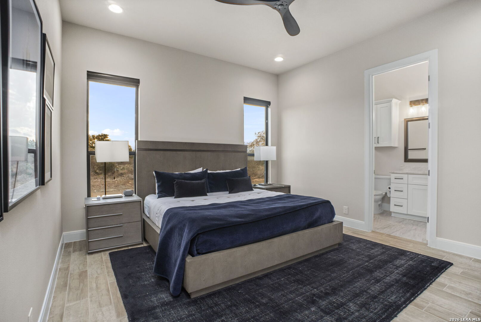 This luxurious, impeccably maintained single-story home is in the highly sought-after gated community of The Peninsula at Mystic Shores, nestled along the shores of the Guadalupe River and Canyon Lake, where water sports and neighborhood amenities abound. A grand entry welcomes you into an open-concept living space seamlessly integrating the living, kitchen, dining, and outdoor living areas-an entertainer's dream. The home features elegant ceramic tile flooring throughout, recessed lighting, quartz countertops, soaring ceilings, and stained wood beams accenting the living area, anchored by a dramatic floor-to-ceiling stone fireplace. The expansive breakfast bar with stone surround serves as the centerpiece for gatherings, while the chef's kitchen is equipped with stainless steel appliances, gas cooktop, double ovens, pot filler, and a convenient window pass-through to the outdoor bar. Outdoor living is exceptional, offering stained concrete flooring, a floor-to-ceiling stone fireplace, stone-enclosed outdoor kitchen, shiplap ceiling, ceiling fan, and a surround-sound system-perfect for year-round enjoyment. The primary suite is a true sanctuary, featuring a spa-like bath and a large walk-in closet with direct access to the oversized utility room, complete with its own dog spa. A fifth bedroom, located opposite the primary suite, is currently utilized as a fully equipped fitness room and would also make an ideal private study. The opposite wing of the home includes a spacious guest suite with an ensuite bath, along with two additional bedrooms connected by a well-appointed Jack-and-Jill bath, each offering walk-in closets. This home shows like a meticulously appointed model, offering effortless living, exceptional entertaining spaces, and an incredible Hill Country location. With access to outstanding amenities and serene surroundings, this private retreat invites you to make 146 Obscure Way your private retreat.