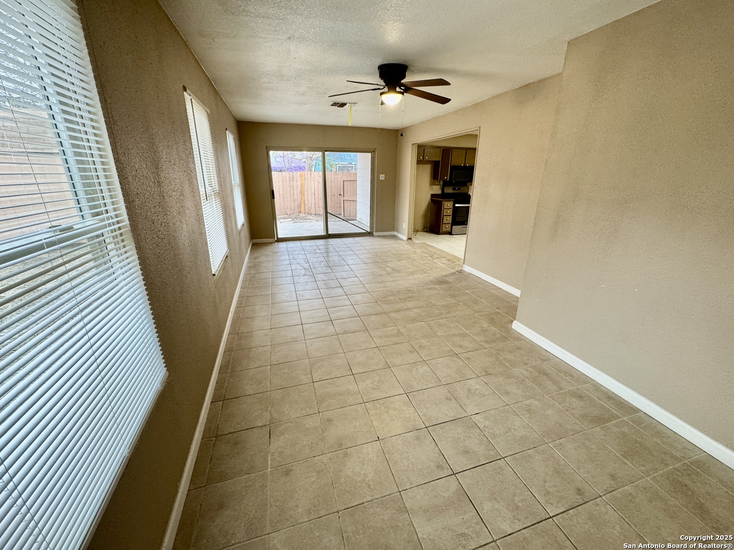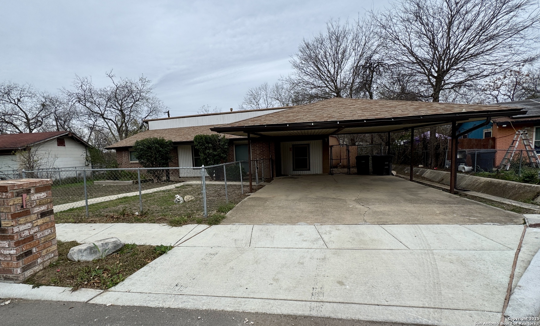 Well-maintained single-story home offering a 4-bedroom layout plus a flexible bonus room, conveniently located with quick access to major roadways, shopping, and everyday services. The home features a functional floor plan with durable finishes throughout. The kitchen includes a gas range, peninsula-style island for added prep and seating space, and opens to the main living areas. Gas heating and a gas dryer connection provide efficiency, while ceiling fans in all rooms help maintain comfort year-round. A storm door and sliding glass back door allow for additional natural light and airflow. In addition to four primary bedrooms, the home includes a separate flex/bonus room with a closet that may be suitable for a home office, hobby room, or additional living space (note: room does not have a window). Outdoor features include a covered patio, covered driveway/carport, and outdoor storage areas. The chain-link front fence and wood privacy fence in the backyard provide defined outdoor spaces. Property Features: 4 bedrooms + flex/bonus room (closet, no window) Gas range and gas heating Peninsula-style kitchen island Ceiling fans in all rooms Storm door and sliding glass rear door Covered patio and outdoor storage Covered driveway / carport Chain-link front fence, wood privacy rear fence Washer/dryer connections (gas)