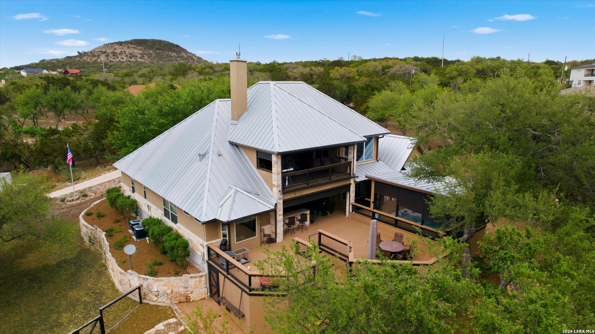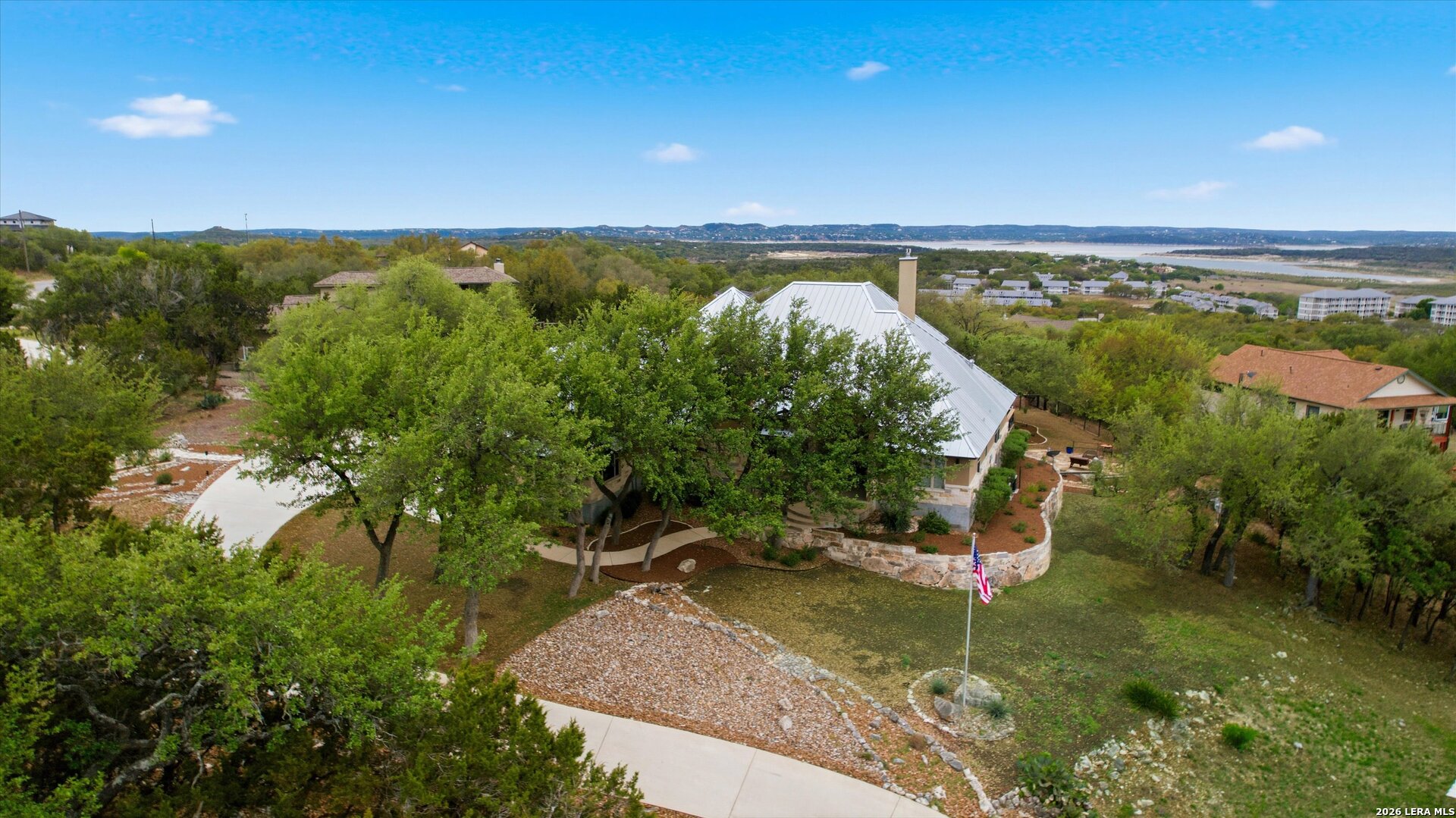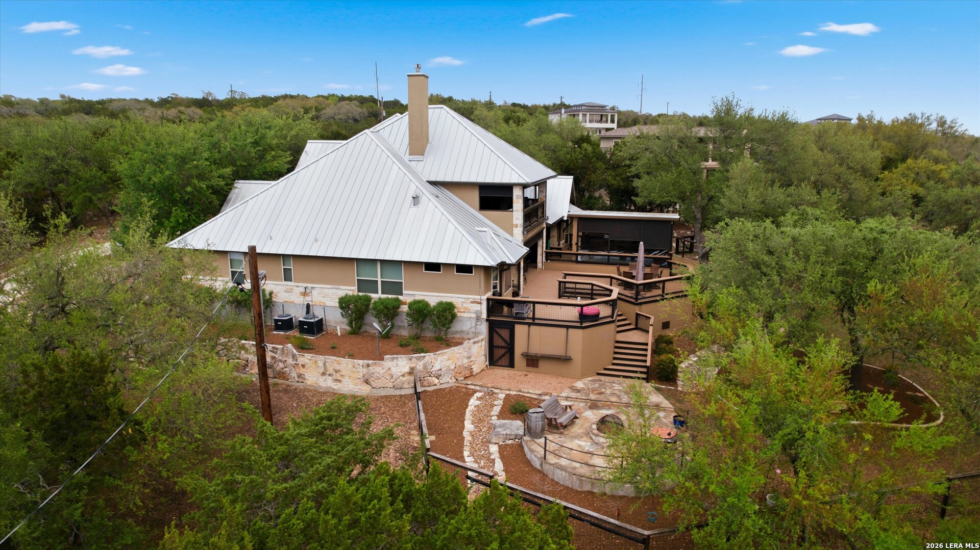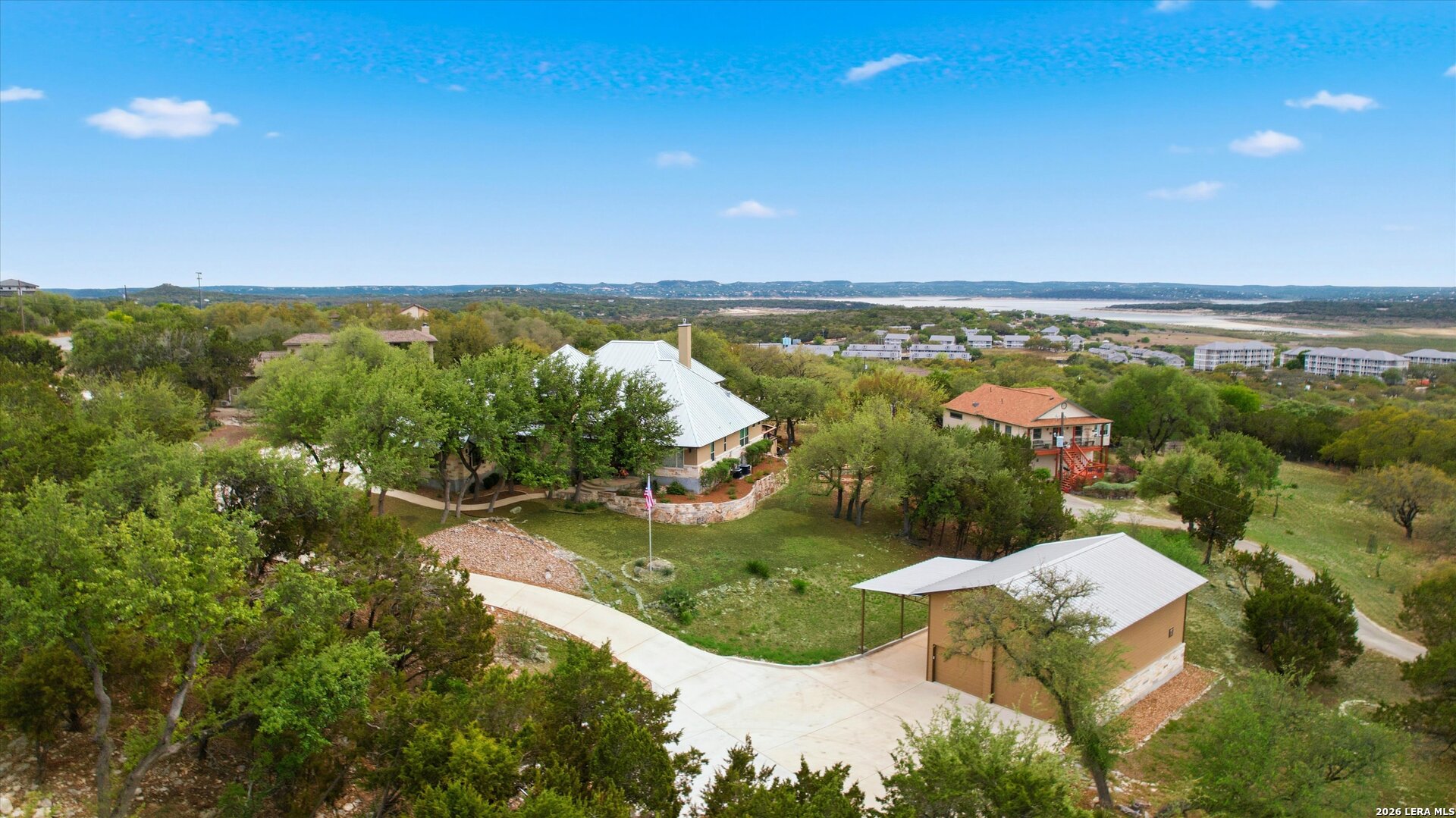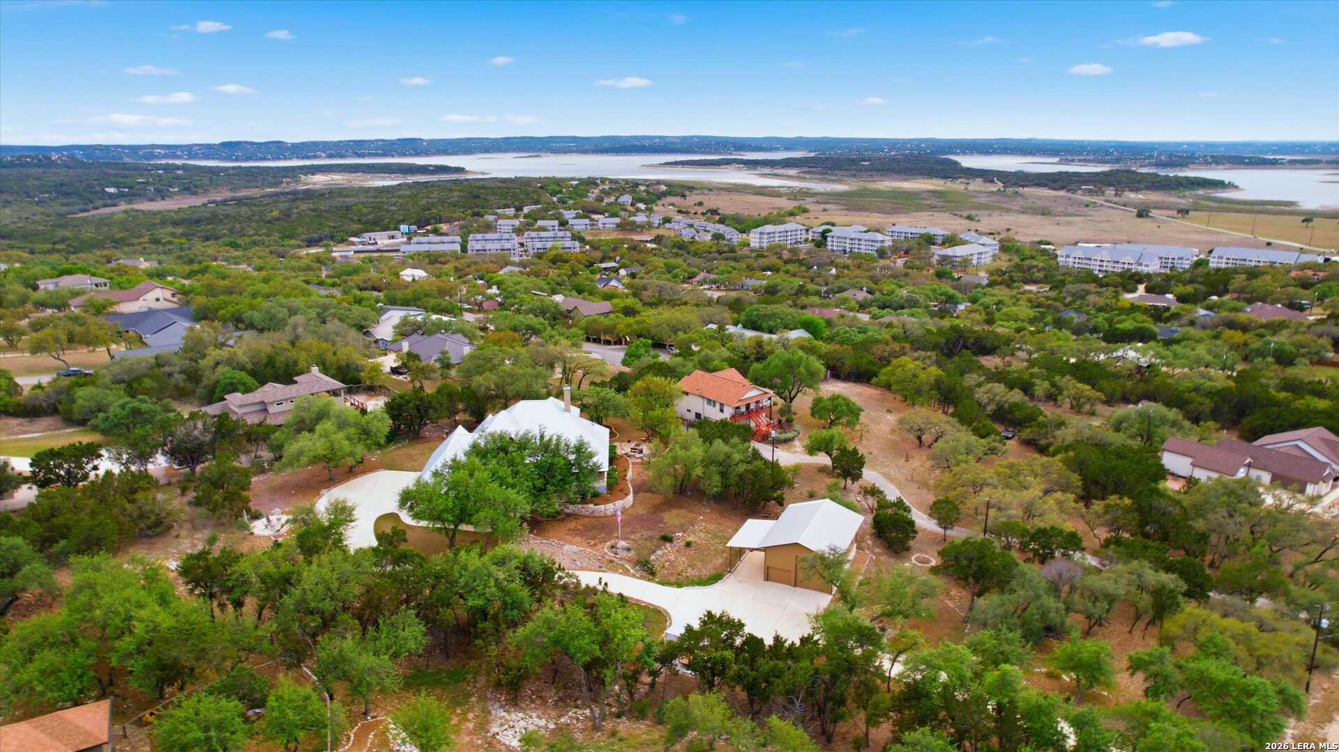Custom Canyon Lake home with both Hill Country and Canyon Lake views. A beautifully crafted home offering thoughtful design and high-end features throughout. This home blends luxury with functionality, incorporating Jack and Jill bedrooms/bathroom and the Master suite both on the main floor but on opposite sides of the house. The natural flow from the 3-car garage thru the laundry/mud room, past the powder room, and a front facing multi-functional room with custom flooring all work well to surround the daily living space. (Some additional information includes both the Master and Jack & Jill bathrooms features Cambria quartz countertops with impeccable pattern matching and the back facing bedroom includes a sunroom offering flexible living space.) On this main floor you'll find a Gourmet kitchen showcasing hickory cabinetry (stained with weathered teak), a multi-level island with top-of-the-line granite and a smaller work island that's been leathered for contrast. A Hickory barn door leads to a large walk-in pantry that expands at the rear for additional space. Top this off with over/under cabinet lighting, soft close cabinetry (several pull-outs) and a glass top gas stove - whoever spends time in the kitchen will want for nothing! The living room is anchored by a gas fireplace with a "floating" 6-inch live-edge pecan mantel creating a warm and inviting focal point. The fireplace stone and the stone face of the kitchen island match the exterior of the home. Hand-scraped hickory floors run throughout the home, complimented by 5-in base boards and 8-foot interior doors. Hunter-Douglas top-down/bottom-up shades and ceiling fans are also found throughout the home. Take the single landing stairs up to find a large game/media room with surround sound, a large guest friendly full bath and an impressive custom live-edge pecan bar with hop/grain inlays and plenty of room for milling around. The custom cabinetry and lighting continue and is complimented with the double tap kegerator, under counter refrigerator, storage cabinets, mirrored accents and floor to ceiling windows. The sliding glass door leads out to an oversized balcony with cedar toppers and remote all weather shades which can enclose the entire balcony. Off the balcony is an entrance to the smaller attic area (the larger is off the upstairs bathroom). Outdoor living is exceptional. Including a covered partially enclosed 15x8ft swim spa, two separate deck areas for entertaining or just taking in the views and wider stairs leading to a flag stone patio with a built in firepit. Partially dried in storage is also available under the deck. On the other side of the home you will find a sitting area with a dual propane heat system for evening viewing of the Hill Country or morning bird watching. This area has an established in-ground arial feeding station. Some additional highlights include but are not limited to: Central Vac, SONOs sound system (inside and out), Reme Halo air purification on all 3 HVAC units, an alarm system (not contracted), a sprinkler system that includes drip irrigation, a 250gal buried propane tank with quick turn valve which supports the partial house generator system, tankless hot water system and water softener. The RV barn has 30 x 40ft enclosed area which includes an inside 2 story airconditioned room and mini-split that cools/heats the entire area, an exhaust fan and a backdoor. Inside you have a full 30/50amp hook-up with dump station and outside, not enclosed but covered, the RV guest area also has full hook-up. The driveway and additional added areas are concrete. This home includes ongoing service agreements for HVAC and septic and has had on-going pest control since build.