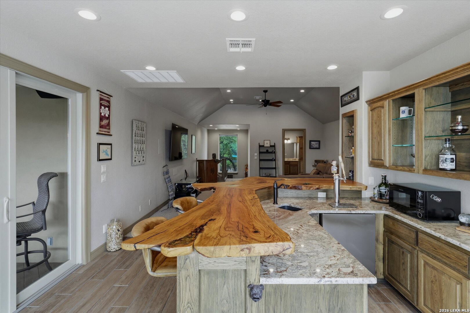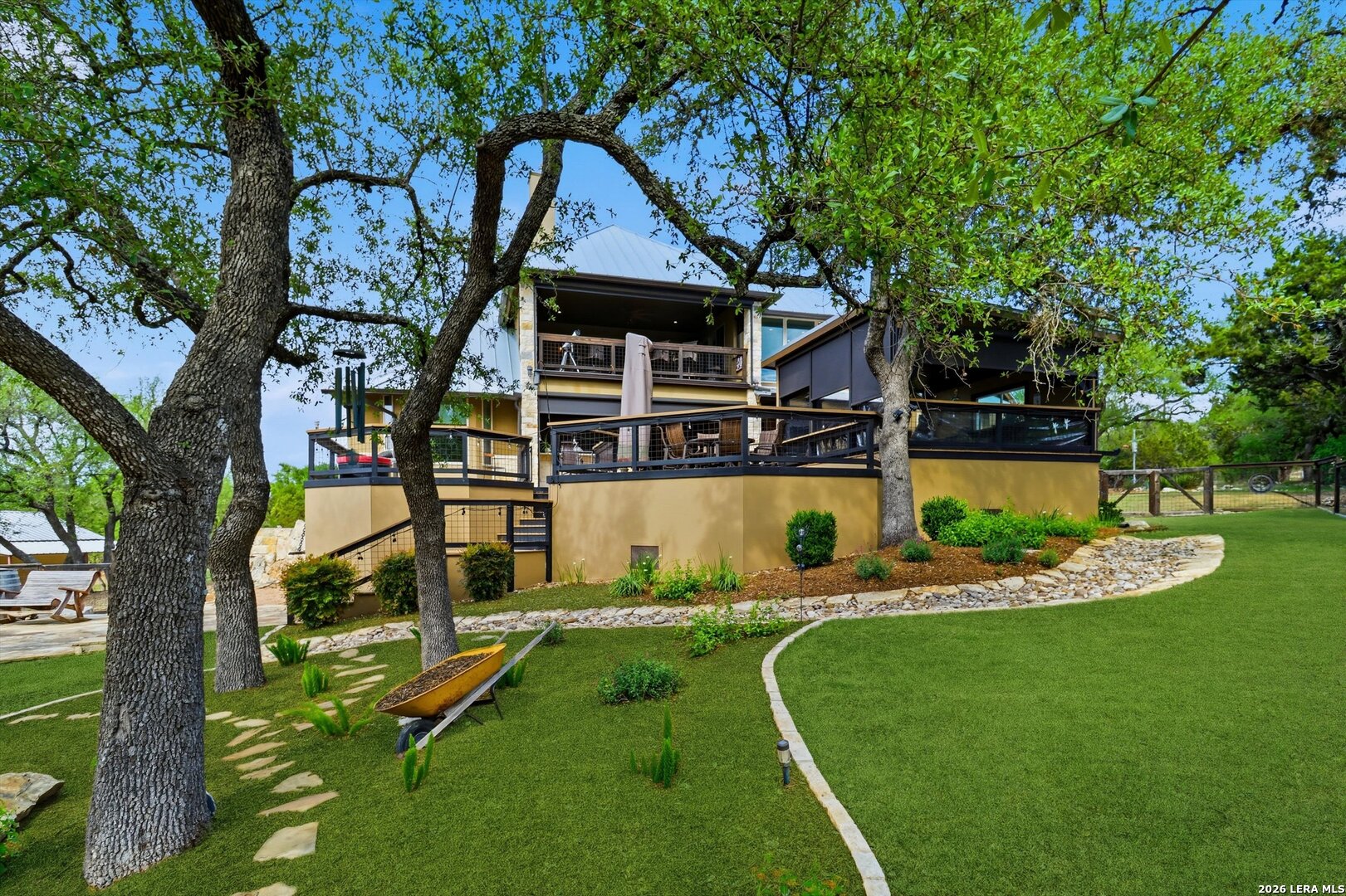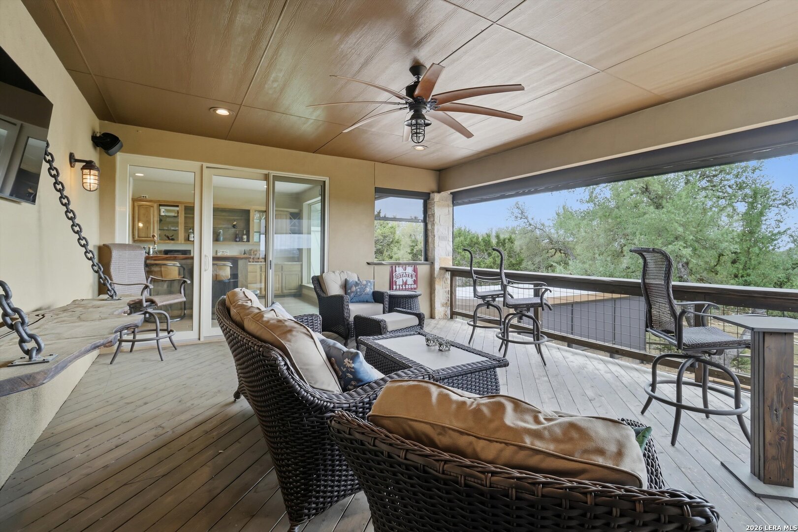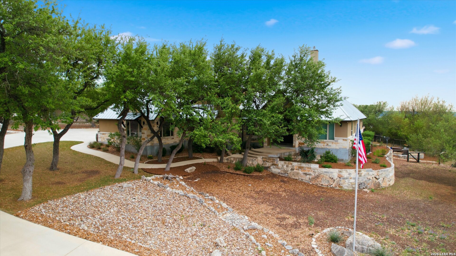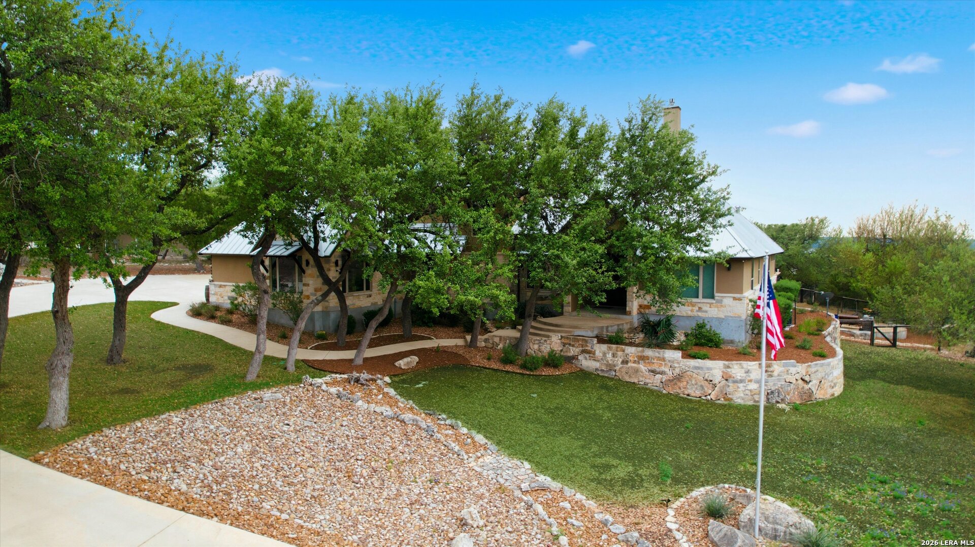 Custom Canyon Lake home with both Hill Country and Canyon Lake views. A beautifully crafted home offering thoughtful design and high-end features throughout. This home blends luxury with functionality, incorporating Jack and Jill bedrooms/bathroom and the Master suite both on the main floor but on opposite sides of the house. The natural flow from the 3-car garage thru the laundry/mud room, past the powder room, and a front facing multi-functional room with custom flooring all work well to surround the daily living space. (Some additional information includes both the Master and Jack & Jill bathrooms features Cambria quartz countertops with impeccable pattern matching and the back facing bedroom includes a sunroom offering flexible living space.) On this main floor you'll find a Gourmet kitchen showcasing hickory cabinetry (stained with weathered teak), a multi-level island with top-of-the-line granite and a smaller work island that's been leathered for contrast. A Hickory barn door leads to a large walk-in pantry that expands at the rear for additional space. Top this off with over/under cabinet lighting, soft close cabinetry (several pull-outs) and a glass top gas stove - whoever spends time in the kitchen will want for nothing! The living room is anchored by a gas fireplace with a "floating" 6-inch live-edge pecan mantel creating a warm and inviting focal point. The fireplace stone and the stone face of the kitchen island match the exterior of the home. Hand-scraped hickory floors run throughout the home, complimented by 5-in base boards and 8-foot interior doors. Hunter-Douglas top-down/bottom-up shades and ceiling fans are also found throughout the home. Take the single landing stairs up to find a large game/media room with surround sound, a large guest friendly full bath and an impressive custom live-edge pecan bar with hop/grain inlays and plenty of room for milling around. The custom cabinetry and lighting continue and is complimented with the double tap kegerator, under counter refrigerator, storage cabinets, mirrored accents and floor to ceiling windows. The sliding glass door leads out to an oversized balcony with cedar toppers and remote all weather shades which can enclose the entire balcony. Off the balcony is an entrance to the smaller attic area (the larger is off the upstairs bathroom). Outdoor living is exceptional. Including a covered partially enclosed 15x8ft swim spa, two separate deck areas for entertaining or just taking in the views and wider stairs leading to a flag stone patio with a built in firepit. Partially dried in storage is also available under the deck. On the other side of the home you will find a sitting area with a dual propane heat system for evening viewing of the Hill Country or morning bird watching. This area has an established in-ground arial feeding station. Some additional highlights include but are not limited to: Central Vac, SONOs sound system (inside and out), Reme Halo air purification on all 3 HVAC units, an alarm system (not contracted), a sprinkler system that includes drip irrigation, a 250gal buried propane tank with quick turn valve which supports the partial house generator system, tankless hot water system and water softener. The RV barn has 30 x 40ft enclosed area which includes an inside 2 story airconditioned room and mini-split that cools/heats the entire area, an exhaust fan and a backdoor. Inside you have a full 30/50amp hook-up with dump station and outside, not enclosed but covered, the RV guest area also has full hook-up. The driveway and additional added areas are concrete. This home includes ongoing service agreements for HVAC and septic and has had on-going pest control since build.