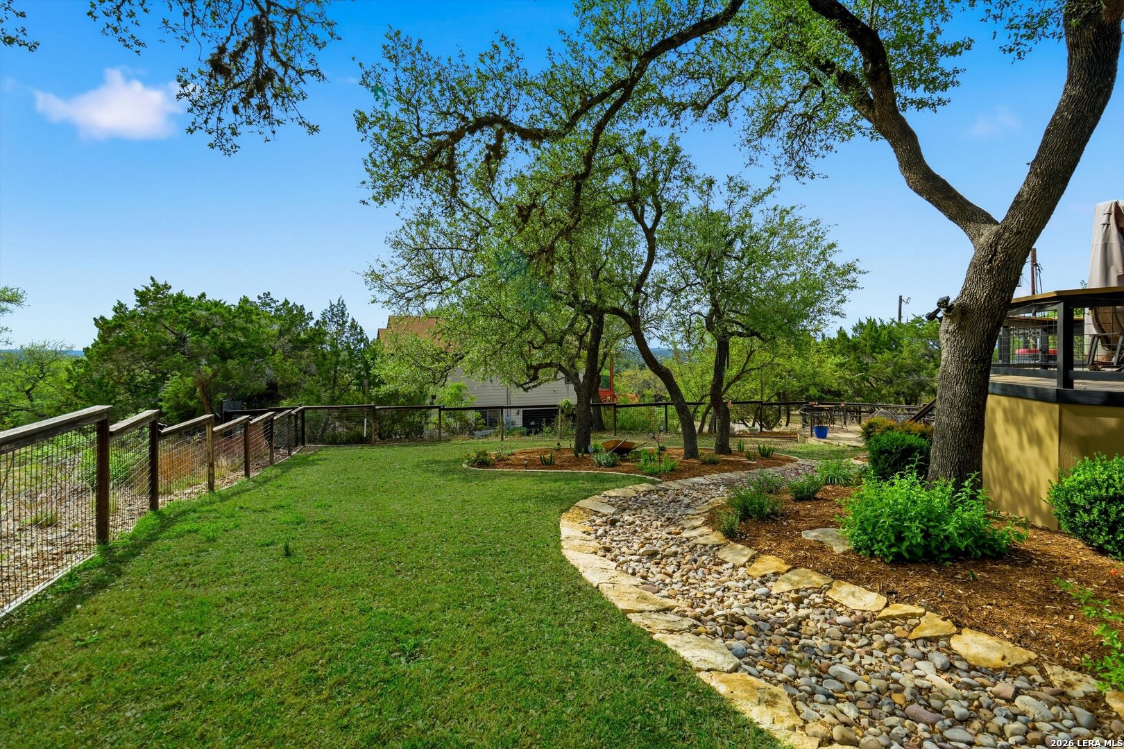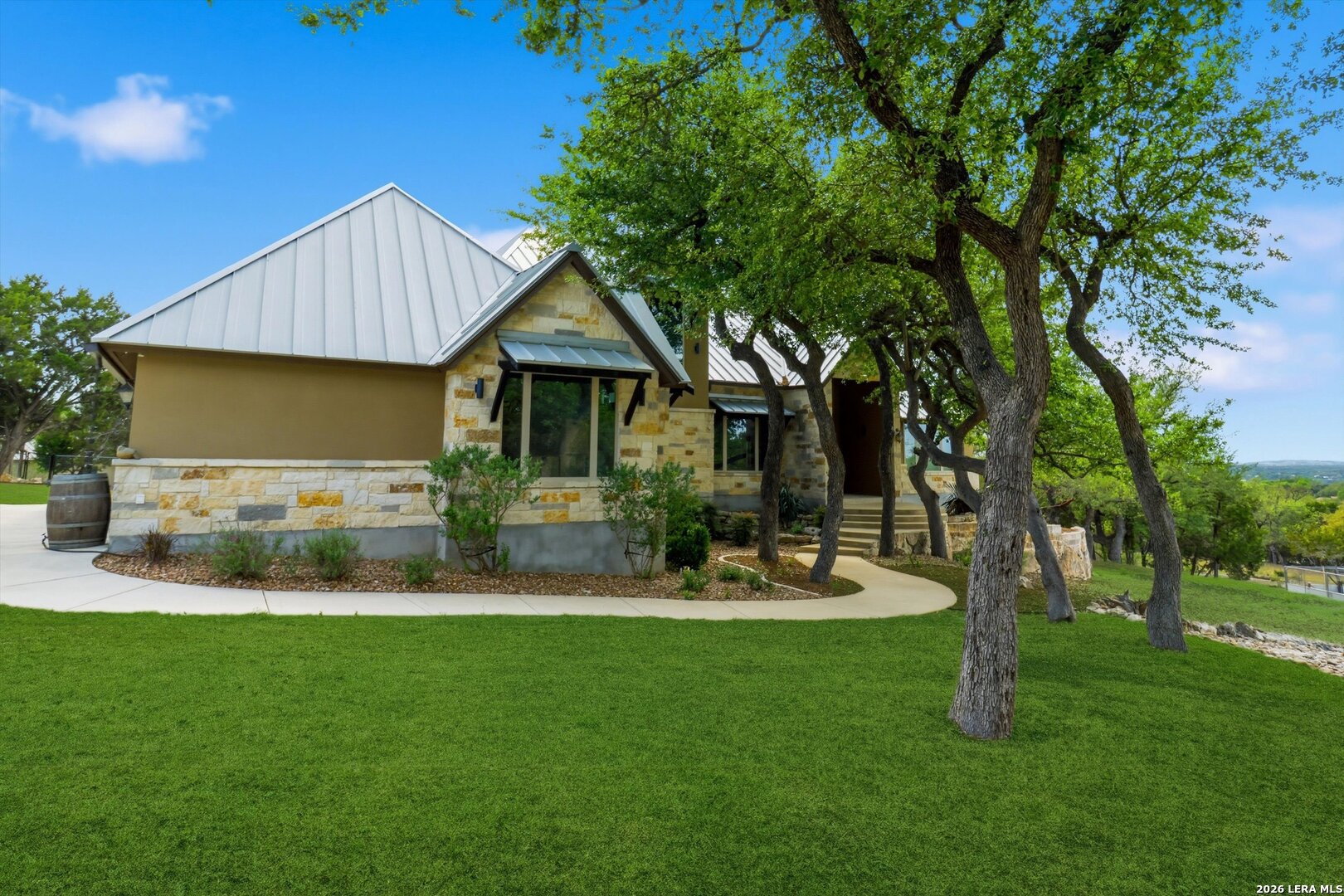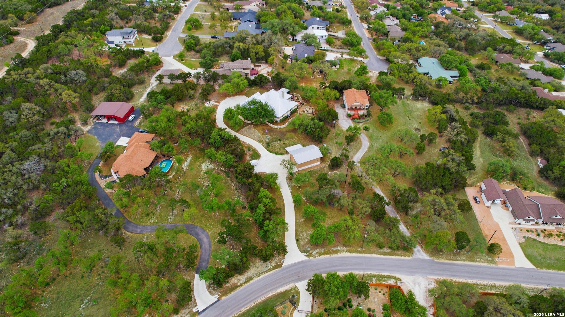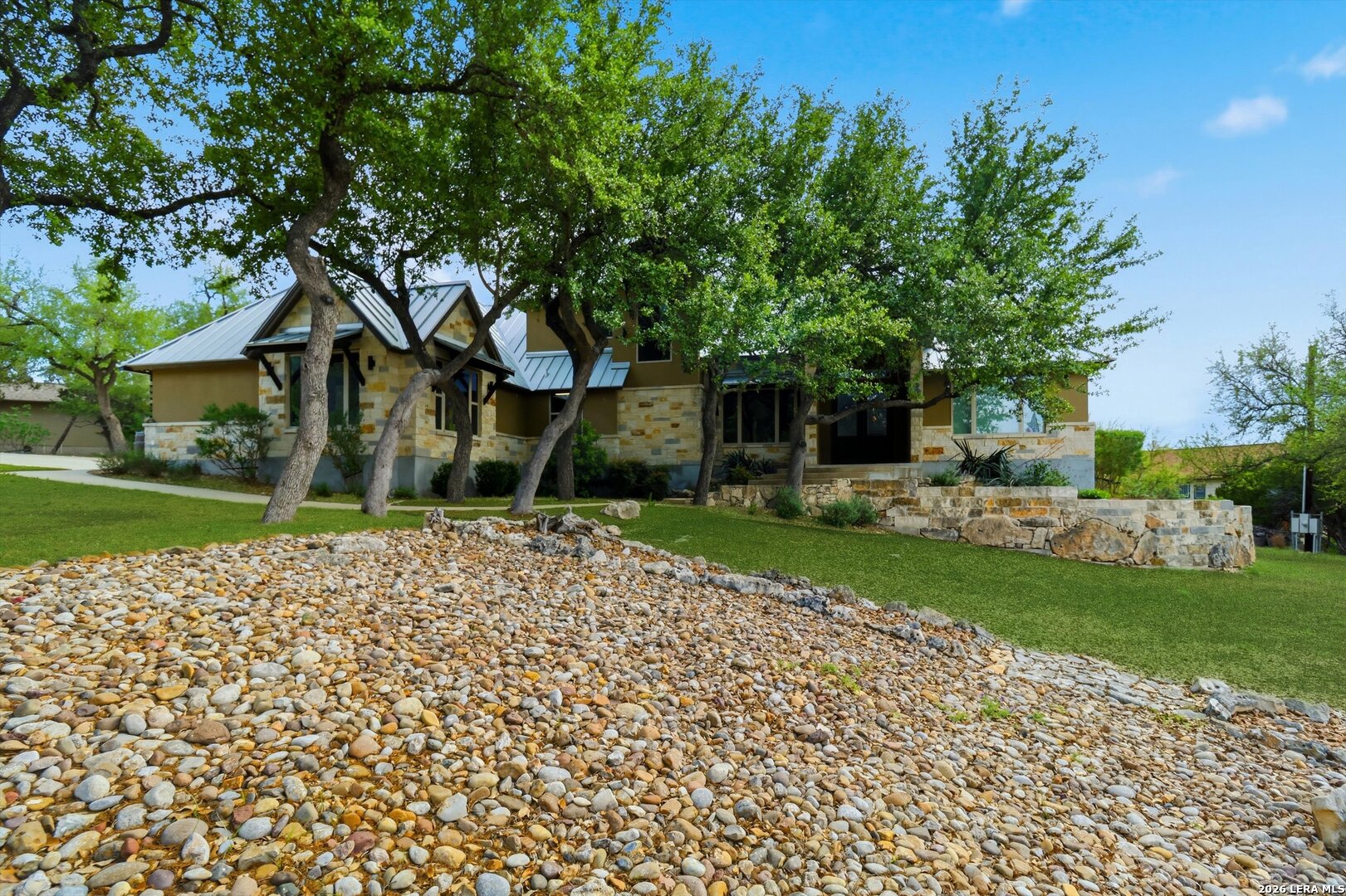 Custom Canyon Lake home with both Hill Country and Canyon Lake views. A beautifully crafted home offering thoughtful design and high-end features throughout. This home blends luxury with functionality, incorporating Jack and Jill bedrooms/bathroom and the Master suite both on the main floor but on opposite sides of the house. The natural flow from the 3-car garage thru the laundry/mud room, past the powder room, and a front facing multi-functional room with custom flooring all work well to surround the daily living space. (Some additional information includes both the Master and Jack & Jill bathrooms features Cambria quartz countertops with impeccable pattern matching and the back facing bedroom includes a sunroom offering flexible living space.) On this main floor you'll find a Gourmet kitchen showcasing hickory cabinetry (stained with weathered teak), a multi-level island with top-of-the-line granite and a smaller work island that's been leathered for contrast. A Hickory barn door leads to a large walk-in pantry that expands at the rear for additional space. Top this off with over/under cabinet lighting, soft close cabinetry (several pull-outs) and a glass top gas stove - whoever spends time in the kitchen will want for nothing! The living room is anchored by a gas fireplace with a "floating" 6-inch live-edge pecan mantel creating a warm and inviting focal point. The fireplace stone and the stone face of the kitchen island match the exterior of the home. Hand-scraped hickory floors run throughout the home, complimented by 5-in base boards and 8-foot interior doors. Hunter-Douglas top-down/bottom-up shades and ceiling fans are also found throughout the home. Take the single landing stairs up to find a large game/media room with surround sound, a large guest friendly full bath and an impressive custom live-edge pecan bar with hop/grain inlays and plenty of room for milling around. The custom cabinetry and lighting continue and is complimented with the double tap kegerator, under counter refrigerator, storage cabinets, mirrored accents and floor to ceiling windows. The sliding glass door leads out to an oversized balcony with cedar toppers and remote all weather shades which can enclose the entire balcony. Off the balcony is an entrance to the smaller attic area (the larger is off the upstairs bathroom). Outdoor living is exceptional. Including a covered partially enclosed 15x8ft swim spa, two separate deck areas for entertaining or just taking in the views and wider stairs leading to a flag stone patio with a built in firepit. Partially dried in storage is also available under the deck. On the other side of the home you will find a sitting area with a dual propane heat system for evening viewing of the Hill Country or morning bird watching. This area has an established in-ground arial feeding station. Some additional highlights include but are not limited to: Central Vac, SONOs sound system (inside and out), Reme Halo air purification on all 3 HVAC units, an alarm system (not contracted), a sprinkler system that includes drip irrigation, a 250gal buried propane tank with quick turn valve which supports the partial house generator system, tankless hot water system and water softener. The RV barn has 30 x 40ft enclosed area which includes an inside 2 story airconditioned room and mini-split that cools/heats the entire area, an exhaust fan and a backdoor. Inside you have a full 30/50amp hook-up with dump station and outside, not enclosed but covered, the RV guest area also has full hook-up. The driveway and additional added areas are concrete. This home includes ongoing service agreements for HVAC and septic and has had on-going pest control since build.