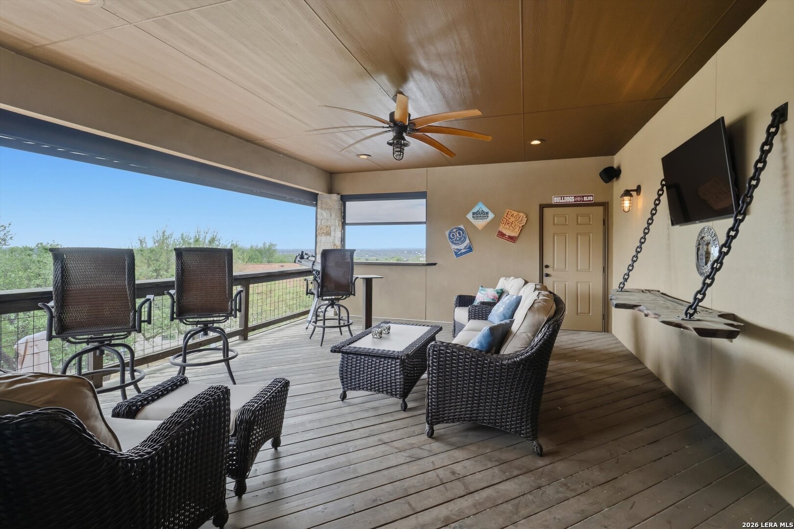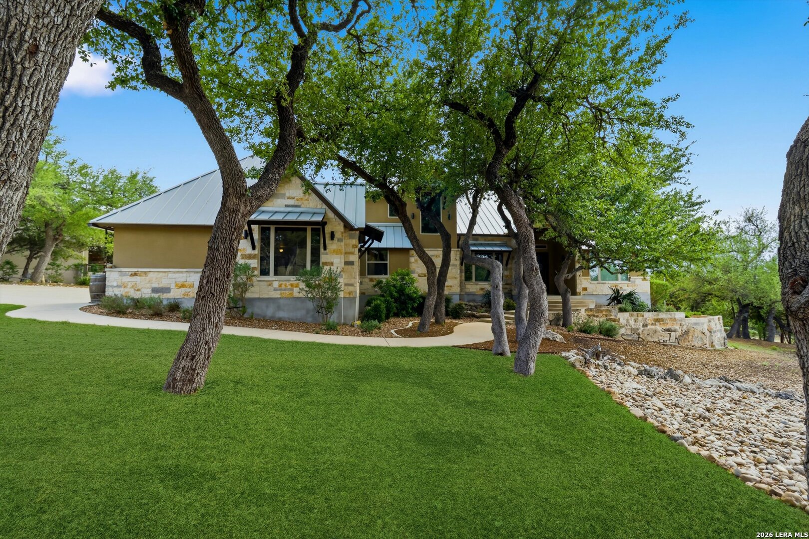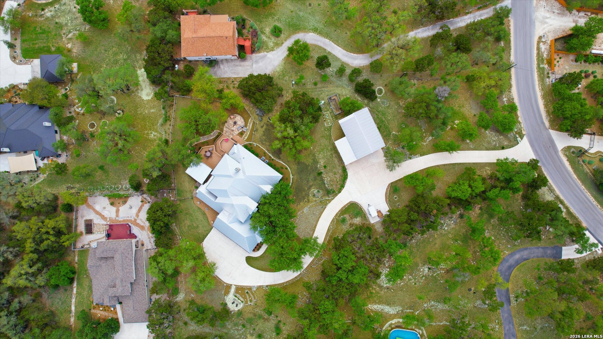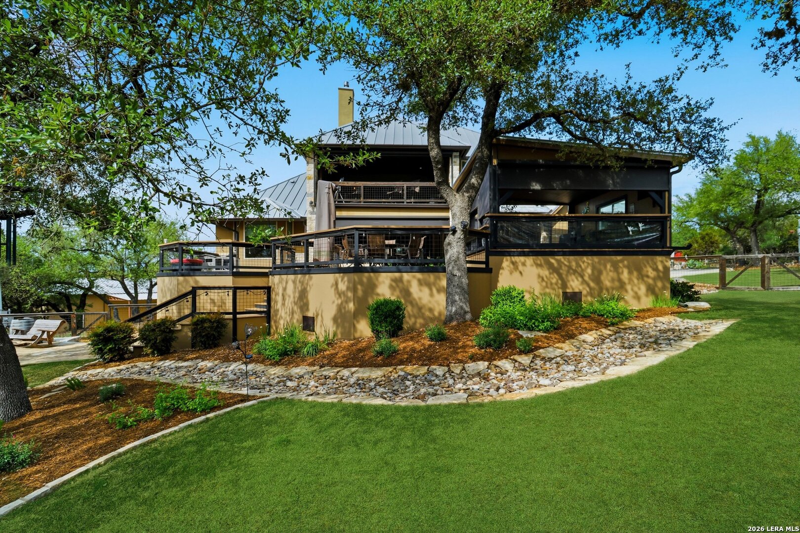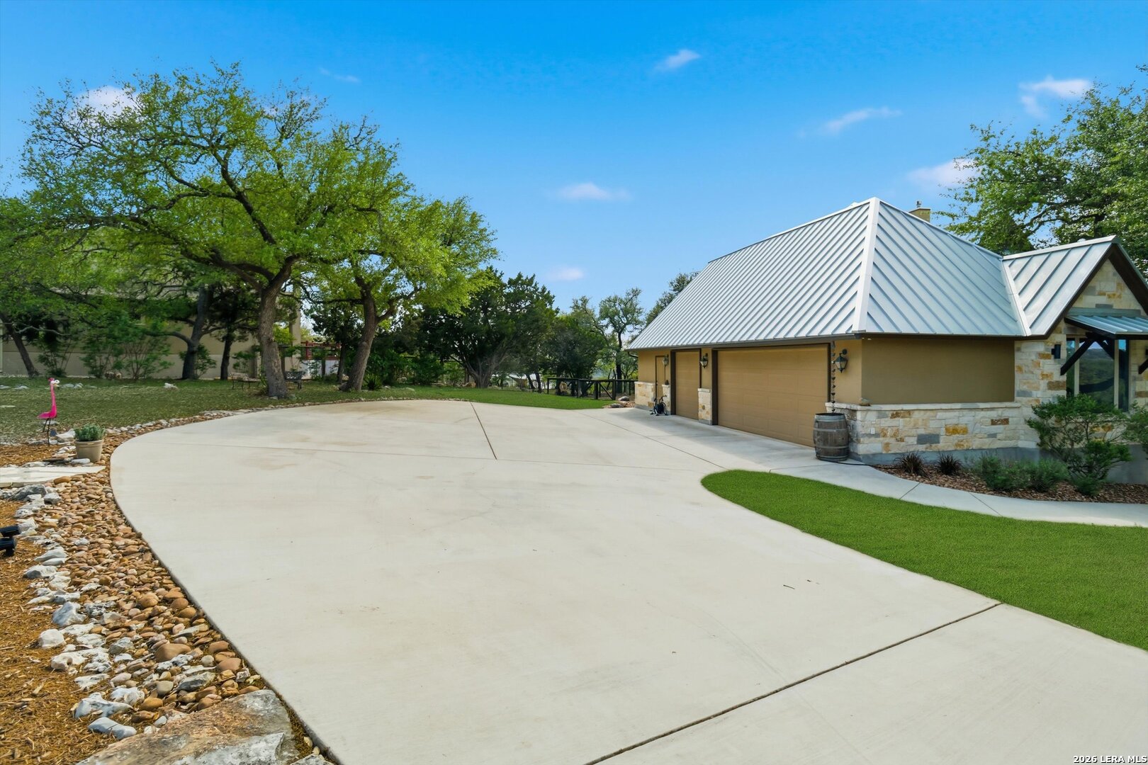Custom Canyon Lake home with both Hill Country and Canyon Lake views. A beautifully crafted home offering thoughtful design and high-end features throughout. This home blends luxury with functionality, incorporating Jack and Jill bedrooms/bathroom and the Master suite both on the main floor but on opposite sides of the house. The natural flow from the 3-car garage thru the laundry/mud room, past the powder room, and a front facing multi-functional room with custom flooring all work well to surround the daily living space. (Some additional information includes both the Master and Jack & Jill bathrooms features Cambria quartz countertops with impeccable pattern matching and the back facing bedroom includes a sunroom offering flexible living space.) On this main floor you'll find a Gourmet kitchen showcasing hickory cabinetry (stained with weathered teak), a multi-level island with top-of-the-line granite and a smaller work island that's been leathered for contrast. A Hickory barn door leads to a large walk-in pantry that expands at the rear for additional space. Top this off with over/under cabinet lighting, soft close cabinetry (several pull-outs) and a glass top gas stove - whoever spends time in the kitchen will want for nothing! The living room is anchored by a gas fireplace with a "floating" 6-inch live-edge pecan mantel creating a warm and inviting focal point. The fireplace stone and the stone face of the kitchen island match the exterior of the home. Hand-scraped hickory floors run throughout the home, complimented by 5-in base boards and 8-foot interior doors. Hunter-Douglas top-down/bottom-up shades and ceiling fans are also found throughout the home. Take the single landing stairs up to find a large game/media room with surround sound, a large guest friendly full bath and an impressive custom live-edge pecan bar with hop/grain inlays and plenty of room for milling around. The custom cabinetry and lighting continue and is complimented with the double tap kegerator, under counter refrigerator, storage cabinets, mirrored accents and floor to ceiling windows. The sliding glass door leads out to an oversized balcony with cedar toppers and remote all weather shades which can enclose the entire balcony. Off the balcony is an entrance to the smaller attic area (the larger is off the upstairs bathroom). Outdoor living is exceptional. Including a covered partially enclosed 15x8ft swim spa, two separate deck areas for entertaining or just taking in the views and wider stairs leading to a flag stone patio with a built in firepit. Partially dried in storage is also available under the deck. On the other side of the home you will find a sitting area with a dual propane heat system for evening viewing of the Hill Country or morning bird watching. This area has an established in-ground arial feeding station. Some additional highlights include but are not limited to: Central Vac, SONOs sound system (inside and out), Reme Halo air purification on all 3 HVAC units, an alarm system (not contracted), a sprinkler system that includes drip irrigation, a 250gal buried propane tank with quick turn valve which supports the partial house generator system, tankless hot water system and water softener. The RV barn has 30 x 40ft enclosed area which includes an inside 2 story airconditioned room and mini-split that cools/heats the entire area, an exhaust fan and a backdoor. Inside you have a full 30/50amp hook-up with dump station and outside, not enclosed but covered, the RV guest area also has full hook-up. The driveway and additional added areas are concrete. This home includes ongoing service agreements for HVAC and septic and has had on-going pest control since build.