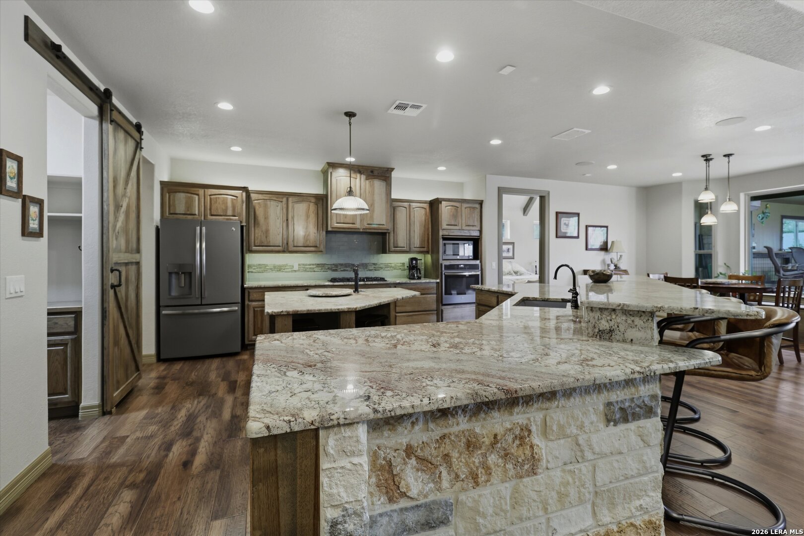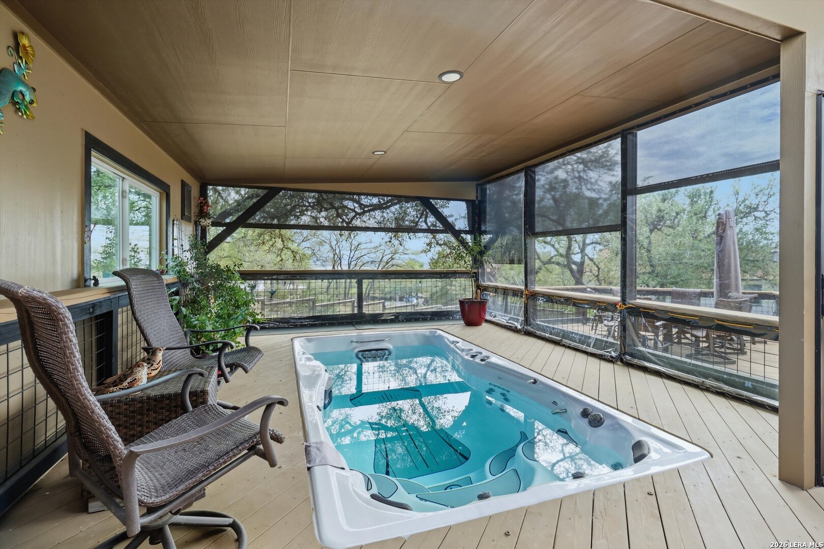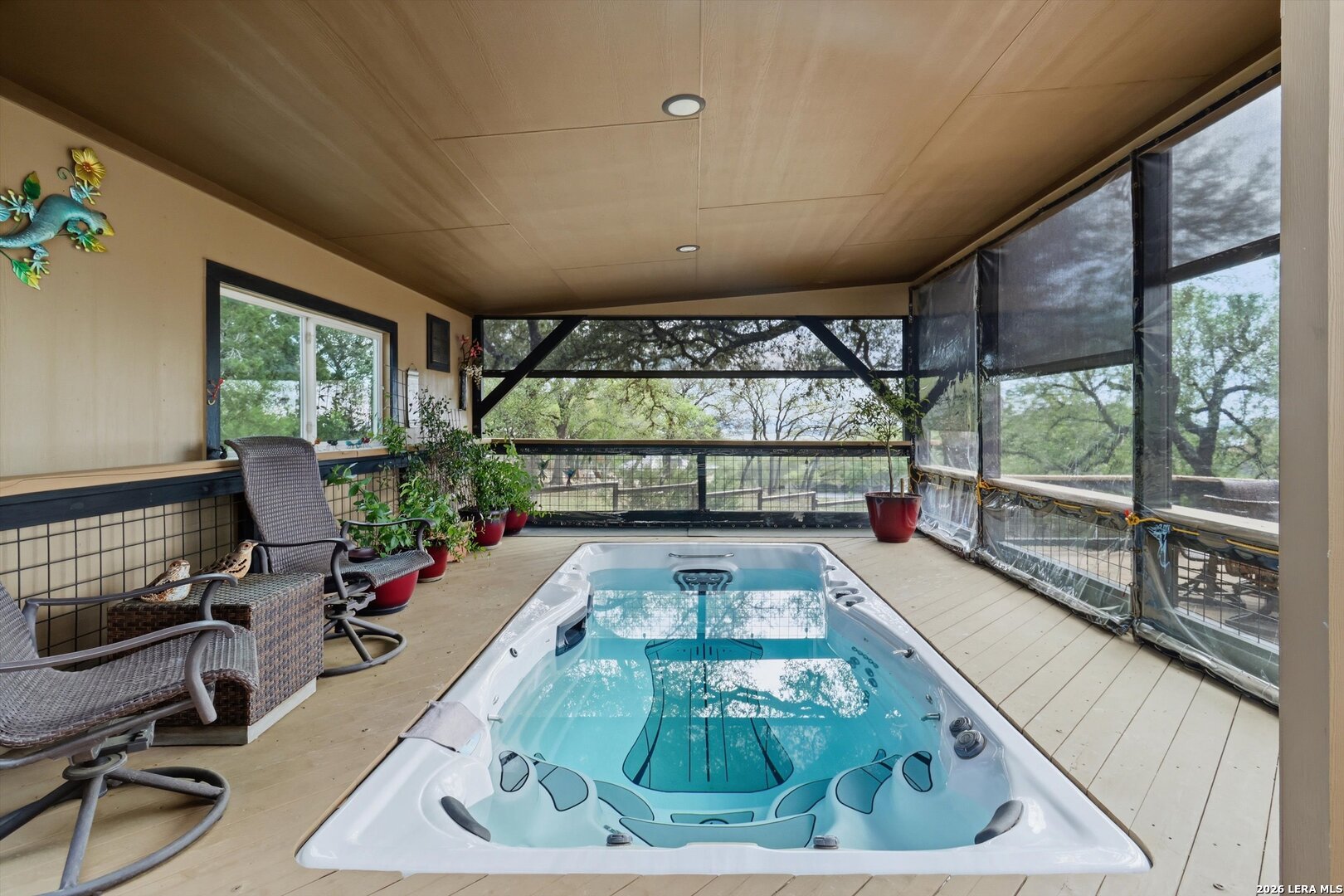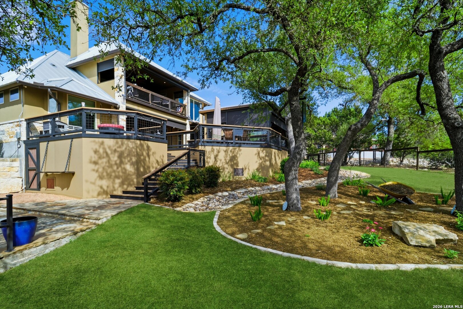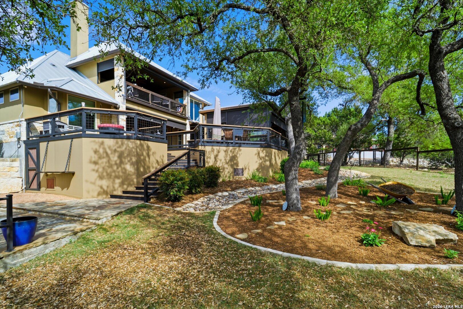 Custom Canyon Lake home with both Hill Country and Canyon Lake views. A beautifully crafted home offering thoughtful design and high-end features throughout. This home blends luxury with functionality, incorporating Jack and Jill bedrooms/bathroom and the Master suite both on the main floor but on opposite sides of the house. The natural flow from the 3-car garage thru the laundry/mud room, past the powder room, and a front facing multi-functional room with custom flooring all work well to surround the daily living space. (Some additional information includes both the Master and Jack & Jill bathrooms features Cambria quartz countertops with impeccable pattern matching and the back facing bedroom includes a sunroom offering flexible living space.) On this main floor you'll find a Gourmet kitchen showcasing hickory cabinetry (stained with weathered teak), a multi-level island with top-of-the-line granite and a smaller work island that's been leathered for contrast. A Hickory barn door leads to a large walk-in pantry that expands at the rear for additional space. Top this off with over/under cabinet lighting, soft close cabinetry (several pull-outs) and a glass top gas stove - whoever spends time in the kitchen will want for nothing! The living room is anchored by a gas fireplace with a "floating" 6-inch live-edge pecan mantel creating a warm and inviting focal point. The fireplace stone and the stone face of the kitchen island match the exterior of the home. Hand-scraped hickory floors run throughout the home, complimented by 5-in base boards and 8-foot interior doors. Hunter-Douglas top-down/bottom-up shades and ceiling fans are also found throughout the home. Take the single landing stairs up to find a large game/media room with surround sound, a large guest friendly full bath and an impressive custom live-edge pecan bar with hop/grain inlays and plenty of room for milling around. The custom cabinetry and lighting continue and is complimented with the double tap kegerator, under counter refrigerator, storage cabinets, mirrored accents and floor to ceiling windows. The sliding glass door leads out to an oversized balcony with cedar toppers and remote all weather shades which can enclose the entire balcony. Off the balcony is an entrance to the smaller attic area (the larger is off the upstairs bathroom). Outdoor living is exceptional. Including a covered partially enclosed 15x8ft swim spa, two separate deck areas for entertaining or just taking in the views and wider stairs leading to a flag stone patio with a built in firepit. Partially dried in storage is also available under the deck. On the other side of the home you will find a sitting area with a dual propane heat system for evening viewing of the Hill Country or morning bird watching. This area has an established in-ground arial feeding station. Some additional highlights include but are not limited to: Central Vac, SONOs sound system (inside and out), Reme Halo air purification on all 3 HVAC units, an alarm system (not contracted), a sprinkler system that includes drip irrigation, a 250gal buried propane tank with quick turn valve which supports the partial house generator system, tankless hot water system and water softener. The RV barn has 30 x 40ft enclosed area which includes an inside 2 story airconditioned room and mini-split that cools/heats the entire area, an exhaust fan and a backdoor. Inside you have a full 30/50amp hook-up with dump station and outside, not enclosed but covered, the RV guest area also has full hook-up. The driveway and additional added areas are concrete. This home includes ongoing service agreements for HVAC and septic and has had on-going pest control since build.