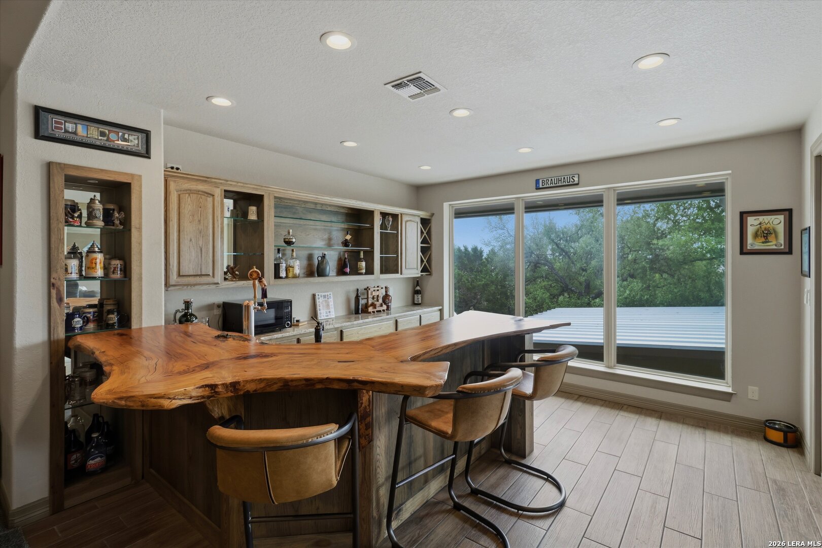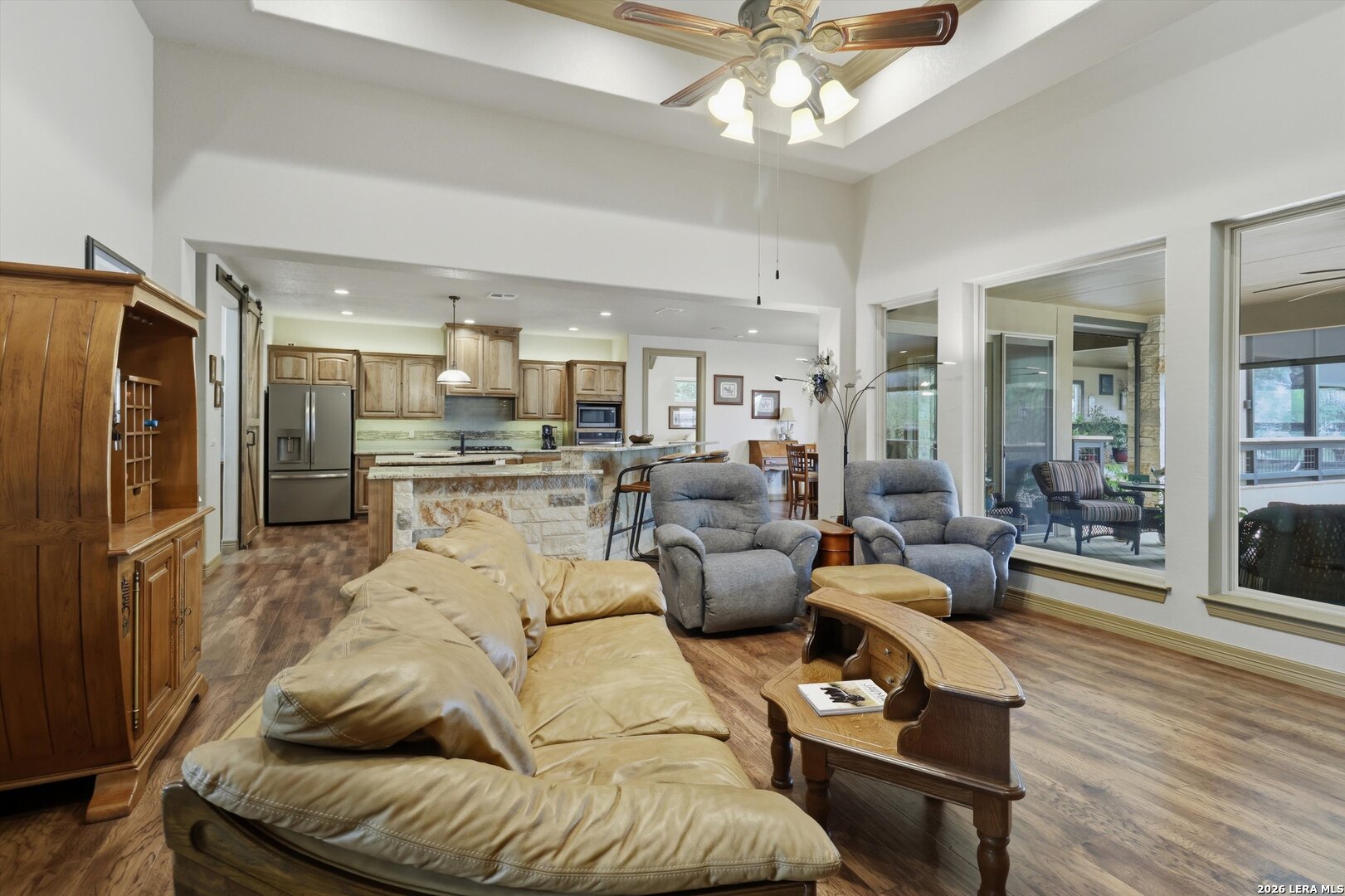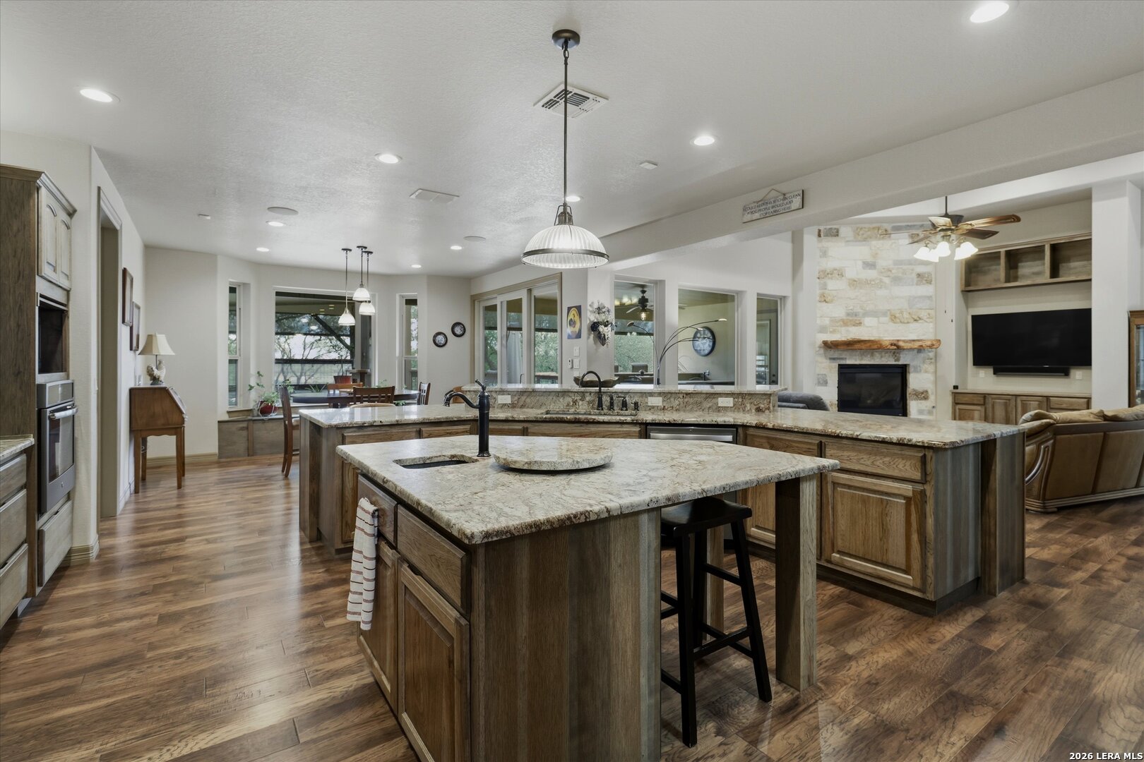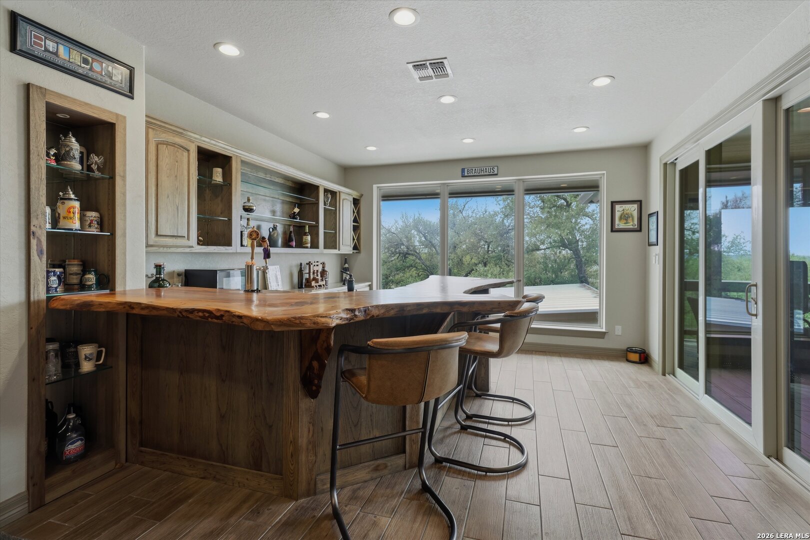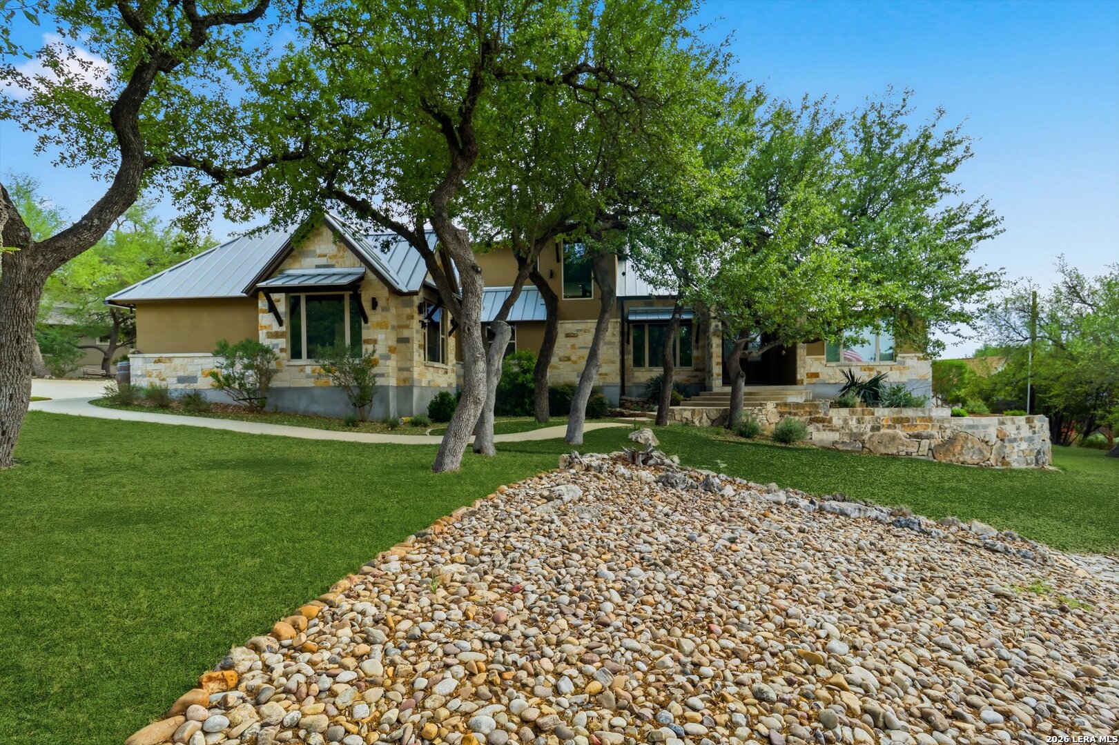Custom Canyon Lake home with both Hill Country and Canyon Lake views. A beautifully crafted home offering thoughtful design and high-end features throughout. This home blends luxury with functionality, incorporating Jack and Jill bedrooms/bathroom and the Master suite both on the main floor but on opposite sides of the house. The natural flow from the 3-car garage thru the laundry/mud room, past the powder room, and a front facing multi-functional room with custom flooring all work well to surround the daily living space. (Some additional information includes both the Master and Jack & Jill bathrooms features Cambria quartz countertops with impeccable pattern matching and the back facing bedroom includes a sunroom offering flexible living space.) On this main floor you'll find a Gourmet kitchen showcasing hickory cabinetry (stained with weathered teak), a multi-level island with top-of-the-line granite and a smaller work island that's been leathered for contrast. A Hickory barn door leads to a large walk-in pantry that expands at the rear for additional space. Top this off with over/under cabinet lighting, soft close cabinetry (several pull-outs) and a glass top gas stove - whoever spends time in the kitchen will want for nothing! The living room is anchored by a gas fireplace with a "floating" 6-inch live-edge pecan mantel creating a warm and inviting focal point. The fireplace stone and the stone face of the kitchen island match the exterior of the home. Hand-scraped hickory floors run throughout the home, complimented by 5-in base boards and 8-foot interior doors. Hunter-Douglas top-down/bottom-up shades and ceiling fans are also found throughout the home. Take the single landing stairs up to find a large game/media room with surround sound, a large guest friendly full bath and an impressive custom live-edge pecan bar with hop/grain inlays and plenty of room for milling around. The custom cabinetry and lighting continue and is complimented with the double tap kegerator, under counter refrigerator, storage cabinets, mirrored accents and floor to ceiling windows. The sliding glass door leads out to an oversized balcony with cedar toppers and remote all weather shades which can enclose the entire balcony. Off the balcony is an entrance to the smaller attic area (the larger is off the upstairs bathroom). Outdoor living is exceptional. Including a covered partially enclosed 15x8ft swim spa, two separate deck areas for entertaining or just taking in the views and wider stairs leading to a flag stone patio with a built in firepit. Partially dried in storage is also available under the deck. On the other side of the home you will find a sitting area with a dual propane heat system for evening viewing of the Hill Country or morning bird watching. This area has an established in-ground arial feeding station. Some additional highlights include but are not limited to: Central Vac, SONOs sound system (inside and out), Reme Halo air purification on all 3 HVAC units, an alarm system (not contracted), a sprinkler system that includes drip irrigation, a 250gal buried propane tank with quick turn valve which supports the partial house generator system, tankless hot water system and water softener. The RV barn has 30 x 40ft enclosed area which includes an inside 2 story airconditioned room and mini-split that cools/heats the entire area, an exhaust fan and a backdoor. Inside you have a full 30/50amp hook-up with dump station and outside, not enclosed but covered, the RV guest area also has full hook-up. The driveway and additional added areas are concrete. This home includes ongoing service agreements for HVAC and septic and has had on-going pest control since build.