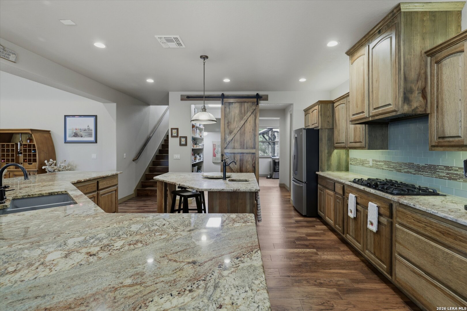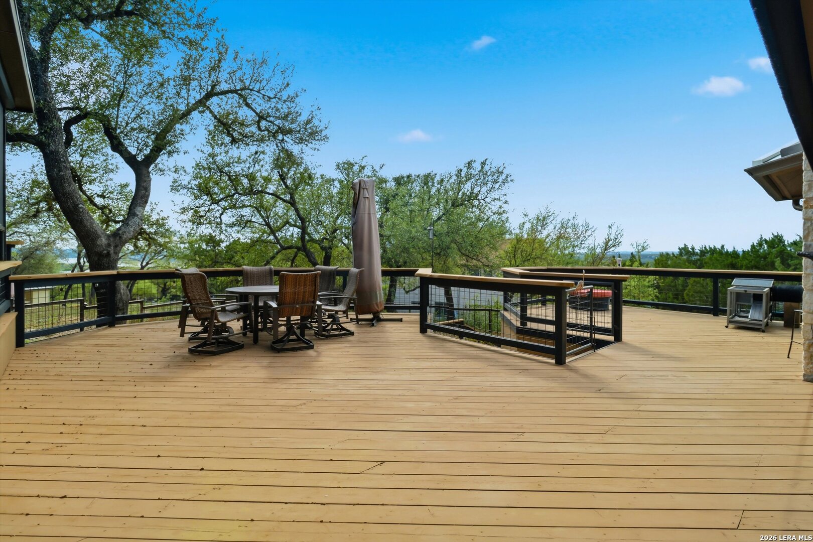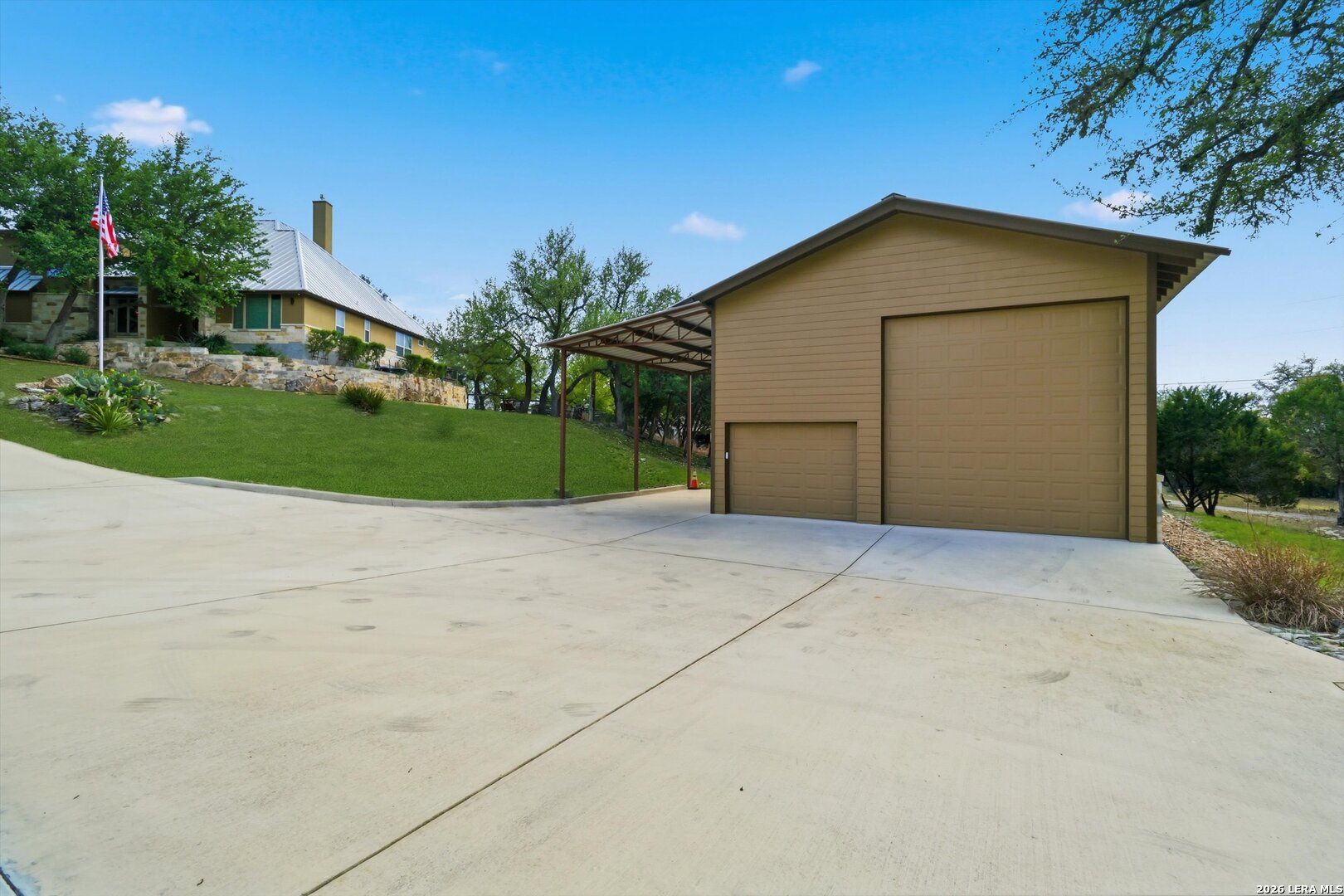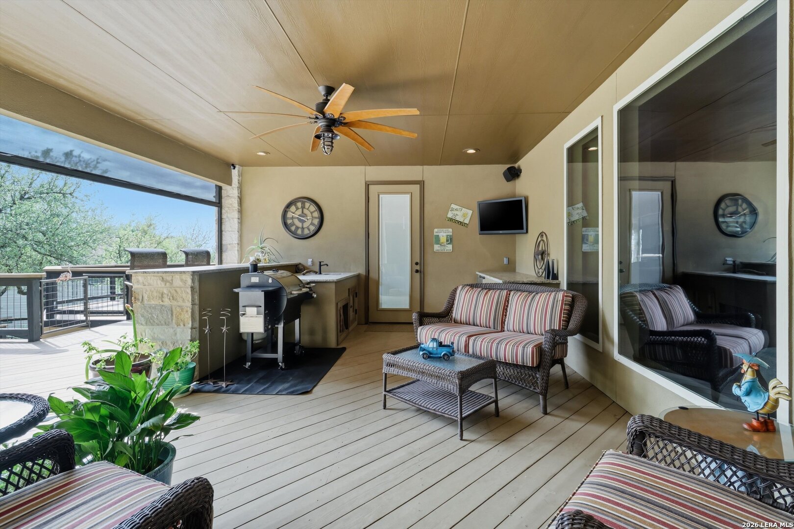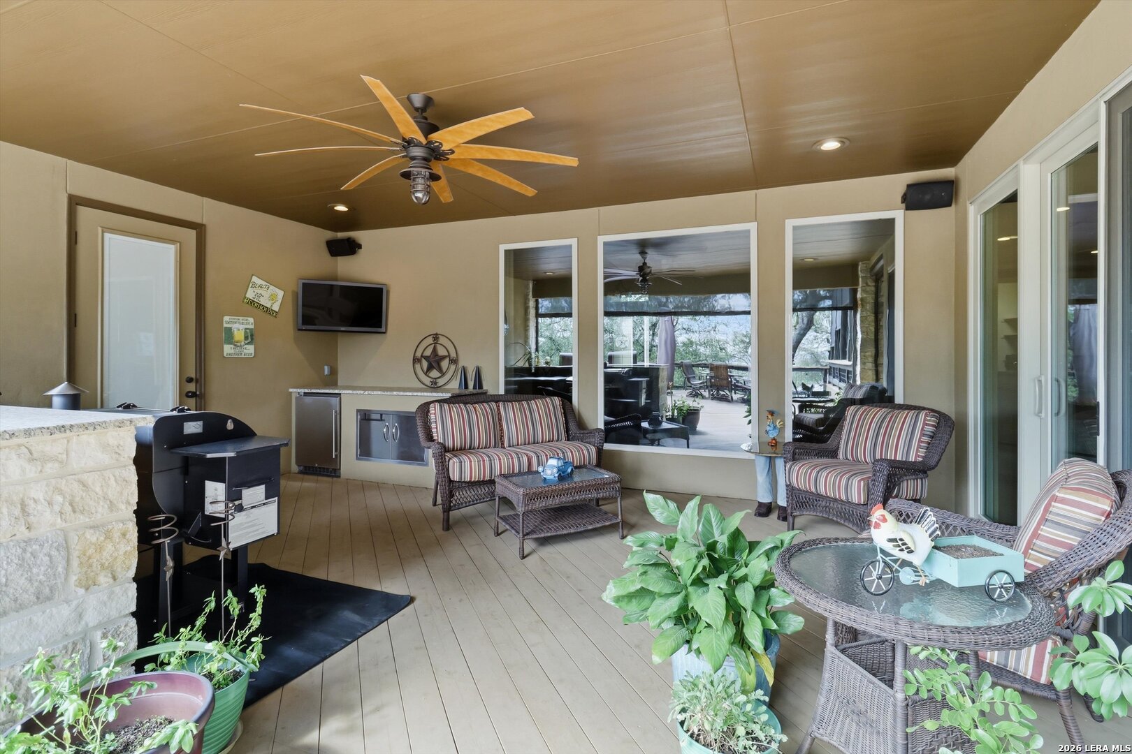 Custom Canyon Lake home with both Hill Country and Canyon Lake views. A beautifully crafted home offering thoughtful design and high-end features throughout. This home blends luxury with functionality, incorporating Jack and Jill bedrooms/bathroom and the Master suite both on the main floor but on opposite sides of the house. The natural flow from the 3-car garage thru the laundry/mud room, past the powder room, and a front facing multi-functional room with custom flooring all work well to surround the daily living space. (Some additional information includes both the Master and Jack & Jill bathrooms features Cambria quartz countertops with impeccable pattern matching and the back facing bedroom includes a sunroom offering flexible living space.) On this main floor you'll find a Gourmet kitchen showcasing hickory cabinetry (stained with weathered teak), a multi-level island with top-of-the-line granite and a smaller work island that's been leathered for contrast. A Hickory barn door leads to a large walk-in pantry that expands at the rear for additional space. Top this off with over/under cabinet lighting, soft close cabinetry (several pull-outs) and a glass top gas stove - whoever spends time in the kitchen will want for nothing! The living room is anchored by a gas fireplace with a "floating" 6-inch live-edge pecan mantel creating a warm and inviting focal point. The fireplace stone and the stone face of the kitchen island match the exterior of the home. Hand-scraped hickory floors run throughout the home, complimented by 5-in base boards and 8-foot interior doors. Hunter-Douglas top-down/bottom-up shades and ceiling fans are also found throughout the home. Take the single landing stairs up to find a large game/media room with surround sound, a large guest friendly full bath and an impressive custom live-edge pecan bar with hop/grain inlays and plenty of room for milling around. The custom cabinetry and lighting continue and is complimented with the double tap kegerator, under counter refrigerator, storage cabinets, mirrored accents and floor to ceiling windows. The sliding glass door leads out to an oversized balcony with cedar toppers and remote all weather shades which can enclose the entire balcony. Off the balcony is an entrance to the smaller attic area (the larger is off the upstairs bathroom). Outdoor living is exceptional. Including a covered partially enclosed 15x8ft swim spa, two separate deck areas for entertaining or just taking in the views and wider stairs leading to a flag stone patio with a built in firepit. Partially dried in storage is also available under the deck. On the other side of the home you will find a sitting area with a dual propane heat system for evening viewing of the Hill Country or morning bird watching. This area has an established in-ground arial feeding station. Some additional highlights include but are not limited to: Central Vac, SONOs sound system (inside and out), Reme Halo air purification on all 3 HVAC units, an alarm system (not contracted), a sprinkler system that includes drip irrigation, a 250gal buried propane tank with quick turn valve which supports the partial house generator system, tankless hot water system and water softener. The RV barn has 30 x 40ft enclosed area which includes an inside 2 story airconditioned room and mini-split that cools/heats the entire area, an exhaust fan and a backdoor. Inside you have a full 30/50amp hook-up with dump station and outside, not enclosed but covered, the RV guest area also has full hook-up. The driveway and additional added areas are concrete. This home includes ongoing service agreements for HVAC and septic and has had on-going pest control since build.