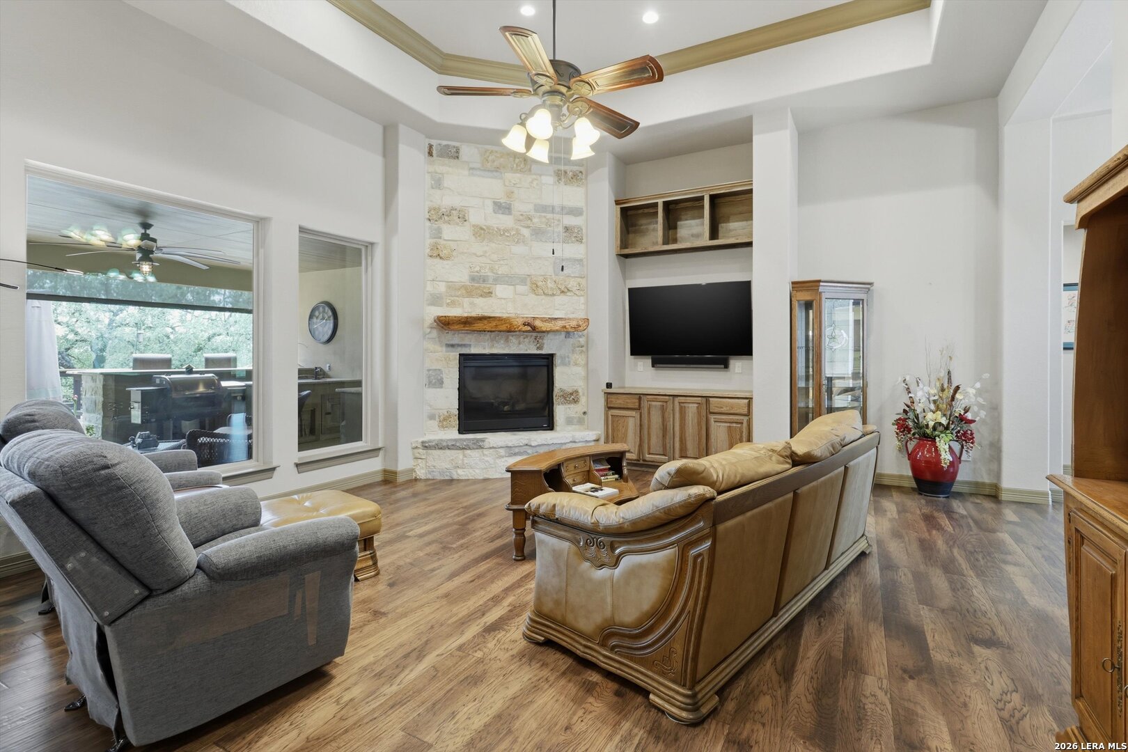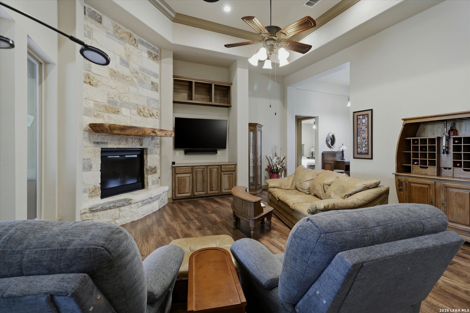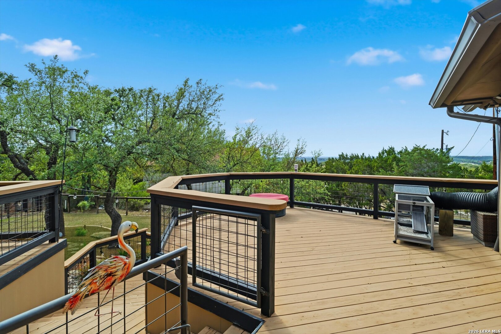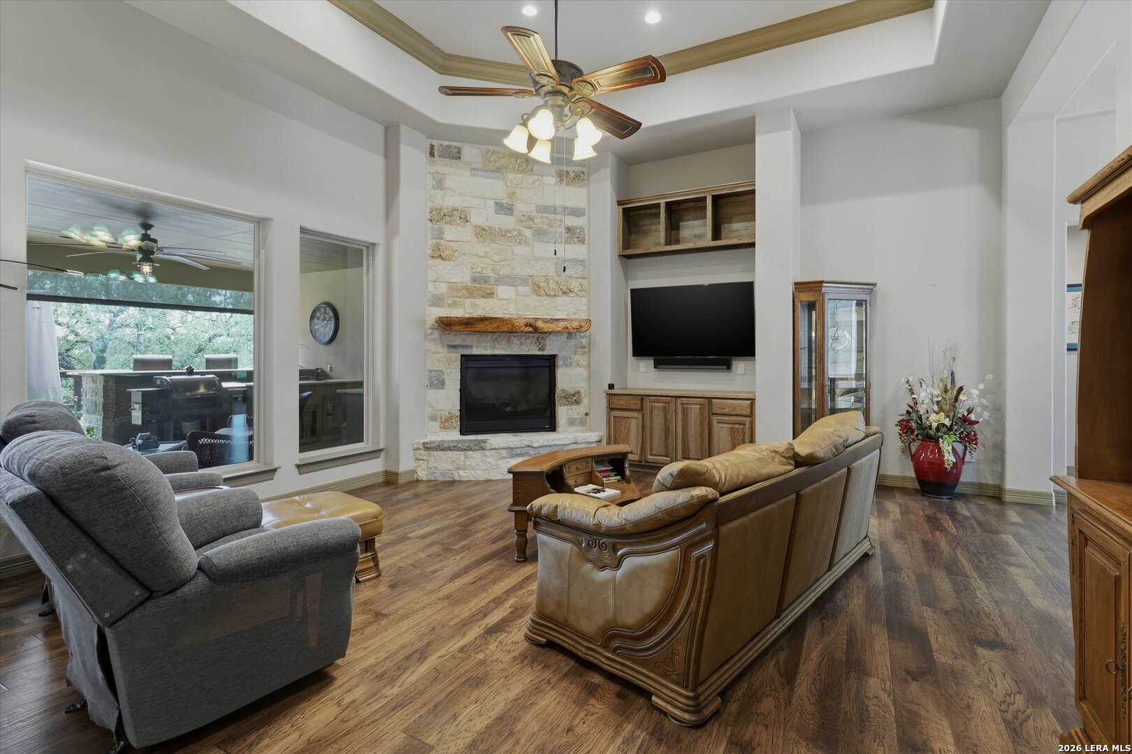 Custom Canyon Lake home with both Hill Country and Canyon Lake views. A beautifully crafted home offering thoughtful design and high-end features throughout. This home blends luxury with functionality, incorporating Jack and Jill bedrooms/bathroom and the Master suite both on the main floor but on opposite sides of the house. The natural flow from the 3-car garage thru the laundry/mud room, past the powder room, and a front facing multi-functional room with custom flooring all work well to surround the daily living space. (Some additional information includes both the Master and Jack & Jill bathrooms features Cambria quartz countertops with impeccable pattern matching and the back facing bedroom includes a sunroom offering flexible living space.) On this main floor you'll find a Gourmet kitchen showcasing hickory cabinetry (stained with weathered teak), a multi-level island with top-of-the-line granite and a smaller work island that's been leathered for contrast. A Hickory barn door leads to a large walk-in pantry that expands at the rear for additional space. Top this off with over/under cabinet lighting, soft close cabinetry (several pull-outs) and a glass top gas stove - whoever spends time in the kitchen will want for nothing! The living room is anchored by a gas fireplace with a "floating" 6-inch live-edge pecan mantel creating a warm and inviting focal point. The fireplace stone and the stone face of the kitchen island match the exterior of the home. Hand-scraped hickory floors run throughout the home, complimented by 5-in base boards and 8-foot interior doors. Hunter-Douglas top-down/bottom-up shades and ceiling fans are also found throughout the home. Take the single landing stairs up to find a large game/media room with surround sound, a large guest friendly full bath and an impressive custom live-edge pecan bar with hop/grain inlays and plenty of room for milling around. The custom cabinetry and lighting continue and is complimented with the double tap kegerator, under counter refrigerator, storage cabinets, mirrored accents and floor to ceiling windows. The sliding glass door leads out to an oversized balcony with cedar toppers and remote all weather shades which can enclose the entire balcony. Off the balcony is an entrance to the smaller attic area (the larger is off the upstairs bathroom). Outdoor living is exceptional. Including a covered partially enclosed 15x8ft swim spa, two separate deck areas for entertaining or just taking in the views and wider stairs leading to a flag stone patio with a built in firepit. Partially dried in storage is also available under the deck. On the other side of the home you will find a sitting area with a dual propane heat system for evening viewing of the Hill Country or morning bird watching. This area has an established in-ground arial feeding station. Some additional highlights include but are not limited to: Central Vac, SONOs sound system (inside and out), Reme Halo air purification on all 3 HVAC units, an alarm system (not contracted), a sprinkler system that includes drip irrigation, a 250gal buried propane tank with quick turn valve which supports the partial house generator system, tankless hot water system and water softener. The RV barn has 30 x 40ft enclosed area which includes an inside 2 story airconditioned room and mini-split that cools/heats the entire area, an exhaust fan and a backdoor. Inside you have a full 30/50amp hook-up with dump station and outside, not enclosed but covered, the RV guest area also has full hook-up. The driveway and additional added areas are concrete. This home includes ongoing service agreements for HVAC and septic and has had on-going pest control since build.
