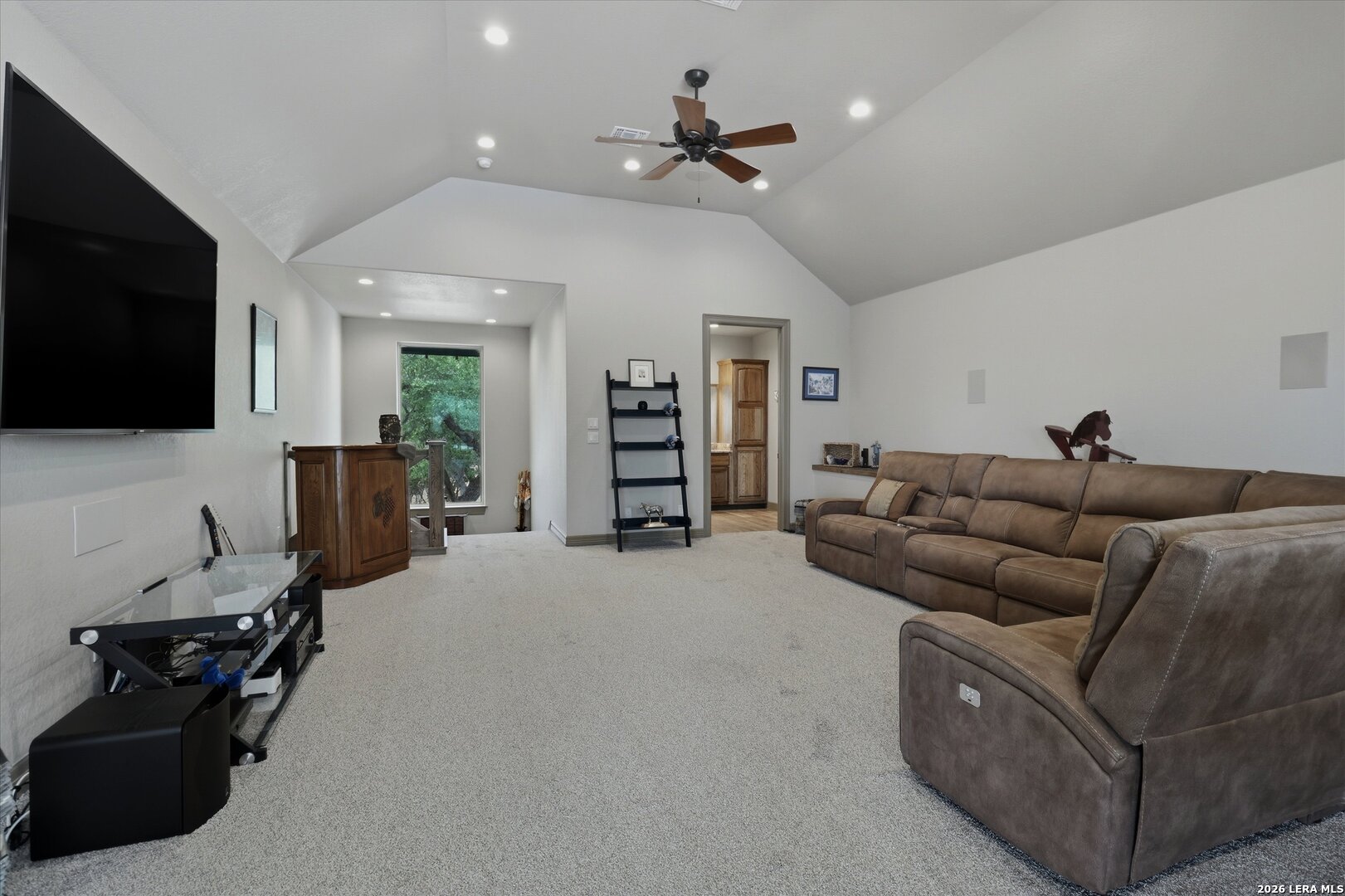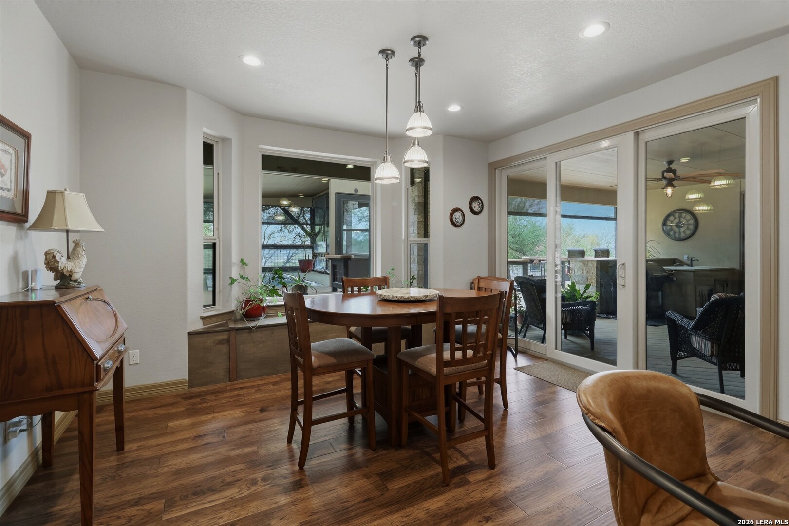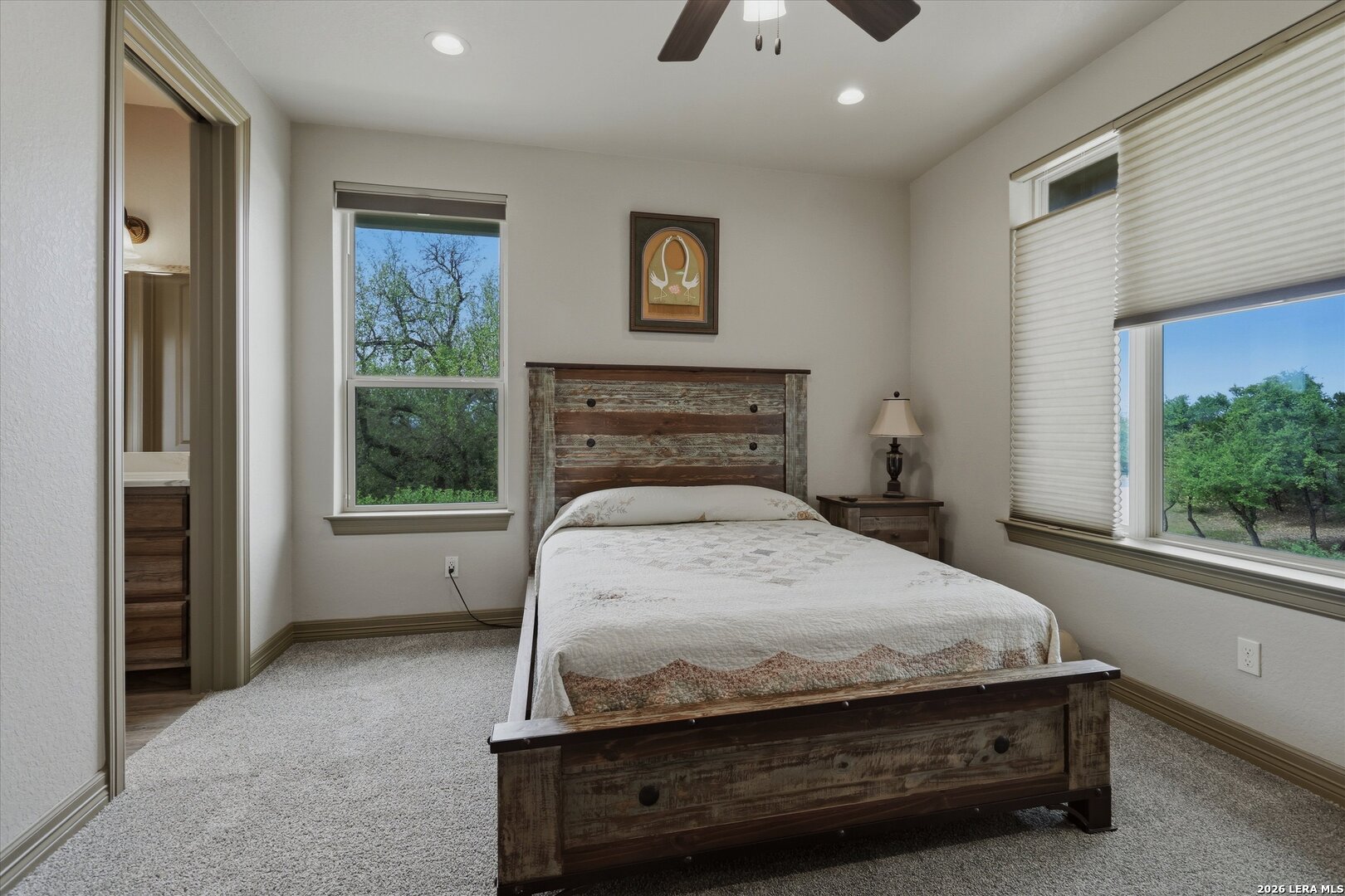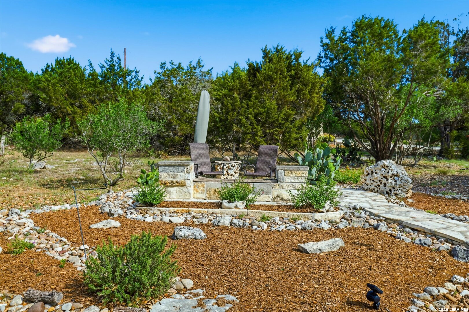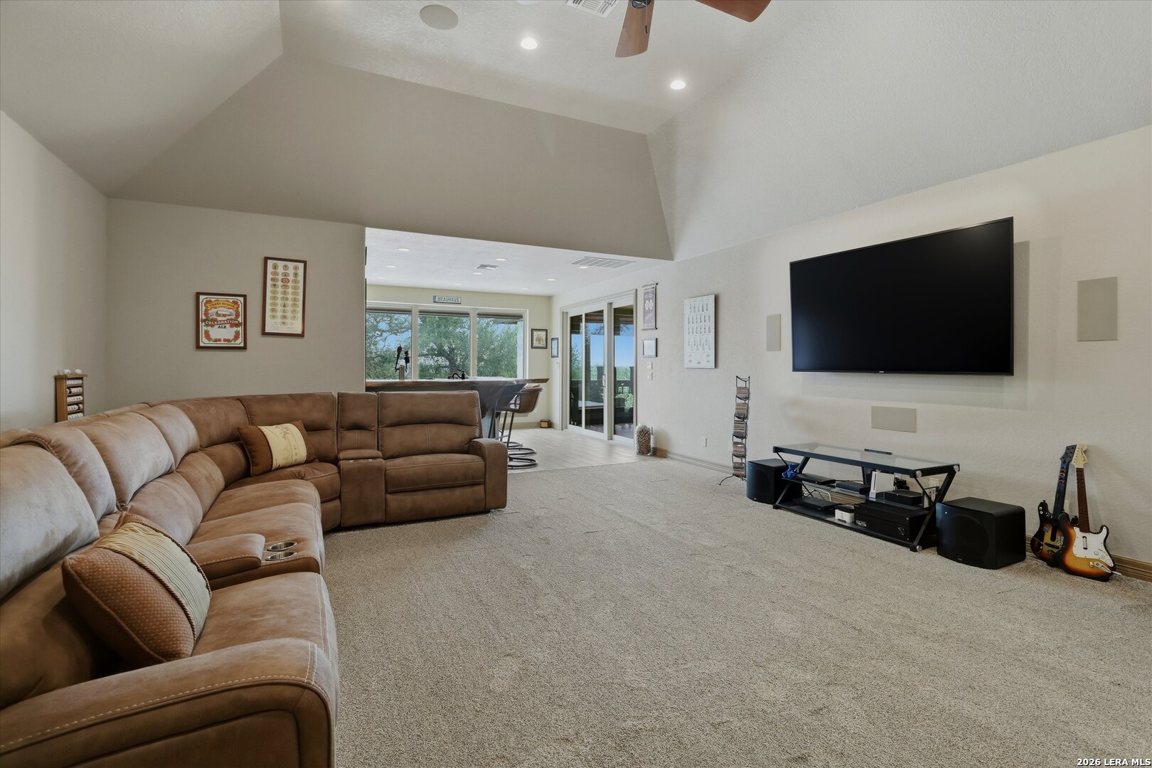 Custom Canyon Lake home with both Hill Country and Canyon Lake views. A beautifully crafted home offering thoughtful design and high-end features throughout. This home blends luxury with functionality, incorporating Jack and Jill bedrooms/bathroom and the Master suite both on the main floor but on opposite sides of the house. The natural flow from the 3-car garage thru the laundry/mud room, past the powder room, and a front facing multi-functional room with custom flooring all work well to surround the daily living space. (Some additional information includes both the Master and Jack & Jill bathrooms features Cambria quartz countertops with impeccable pattern matching and the back facing bedroom includes a sunroom offering flexible living space.) On this main floor you'll find a Gourmet kitchen showcasing hickory cabinetry (stained with weathered teak), a multi-level island with top-of-the-line granite and a smaller work island that's been leathered for contrast. A Hickory barn door leads to a large walk-in pantry that expands at the rear for additional space. Top this off with over/under cabinet lighting, soft close cabinetry (several pull-outs) and a glass top gas stove - whoever spends time in the kitchen will want for nothing! The living room is anchored by a gas fireplace with a "floating" 6-inch live-edge pecan mantel creating a warm and inviting focal point. The fireplace stone and the stone face of the kitchen island match the exterior of the home. Hand-scraped hickory floors run throughout the home, complimented by 5-in base boards and 8-foot interior doors. Hunter-Douglas top-down/bottom-up shades and ceiling fans are also found throughout the home. Take the single landing stairs up to find a large game/media room with surround sound, a large guest friendly full bath and an impressive custom live-edge pecan bar with hop/grain inlays and plenty of room for milling around. The custom cabinetry and lighting continue and is complimented with the double tap kegerator, under counter refrigerator, storage cabinets, mirrored accents and floor to ceiling windows. The sliding glass door leads out to an oversized balcony with cedar toppers and remote all weather shades which can enclose the entire balcony. Off the balcony is an entrance to the smaller attic area (the larger is off the upstairs bathroom). Outdoor living is exceptional. Including a covered partially enclosed 15x8ft swim spa, two separate deck areas for entertaining or just taking in the views and wider stairs leading to a flag stone patio with a built in firepit. Partially dried in storage is also available under the deck. On the other side of the home you will find a sitting area with a dual propane heat system for evening viewing of the Hill Country or morning bird watching. This area has an established in-ground arial feeding station. Some additional highlights include but are not limited to: Central Vac, SONOs sound system (inside and out), Reme Halo air purification on all 3 HVAC units, an alarm system (not contracted), a sprinkler system that includes drip irrigation, a 250gal buried propane tank with quick turn valve which supports the partial house generator system, tankless hot water system and water softener. The RV barn has 30 x 40ft enclosed area which includes an inside 2 story airconditioned room and mini-split that cools/heats the entire area, an exhaust fan and a backdoor. Inside you have a full 30/50amp hook-up with dump station and outside, not enclosed but covered, the RV guest area also has full hook-up. The driveway and additional added areas are concrete. This home includes ongoing service agreements for HVAC and septic and has had on-going pest control since build.