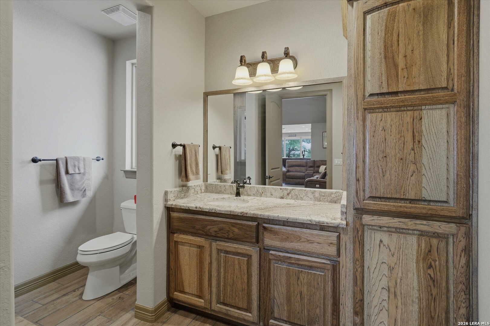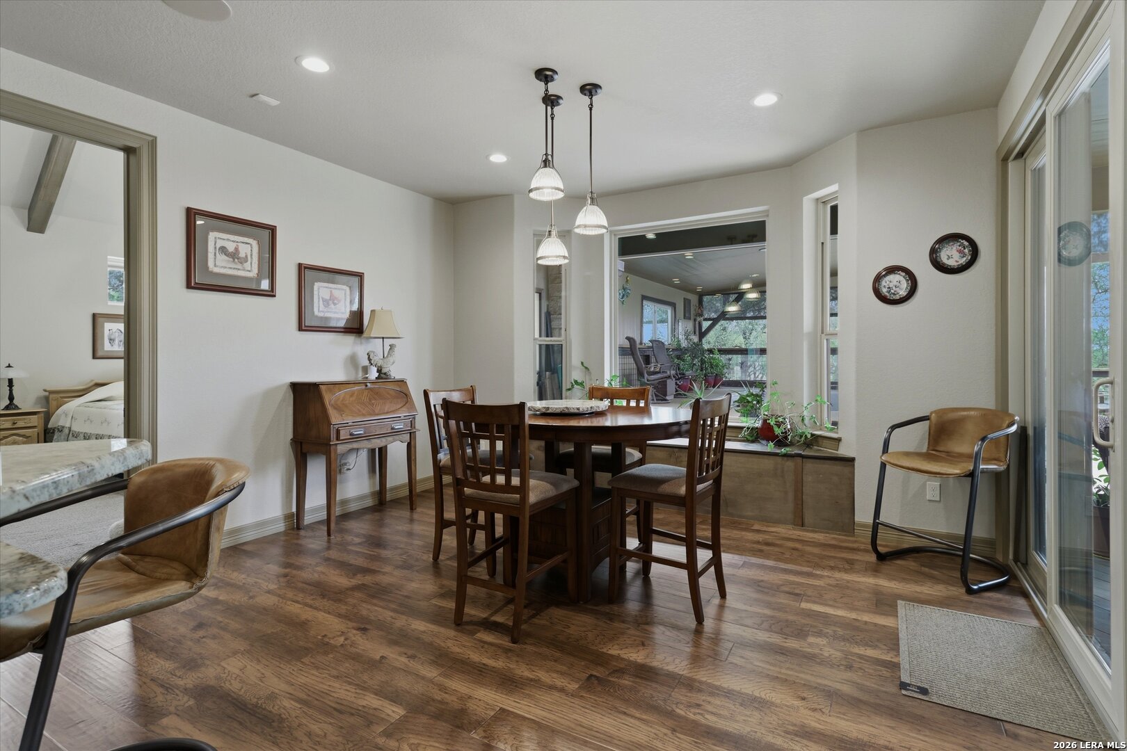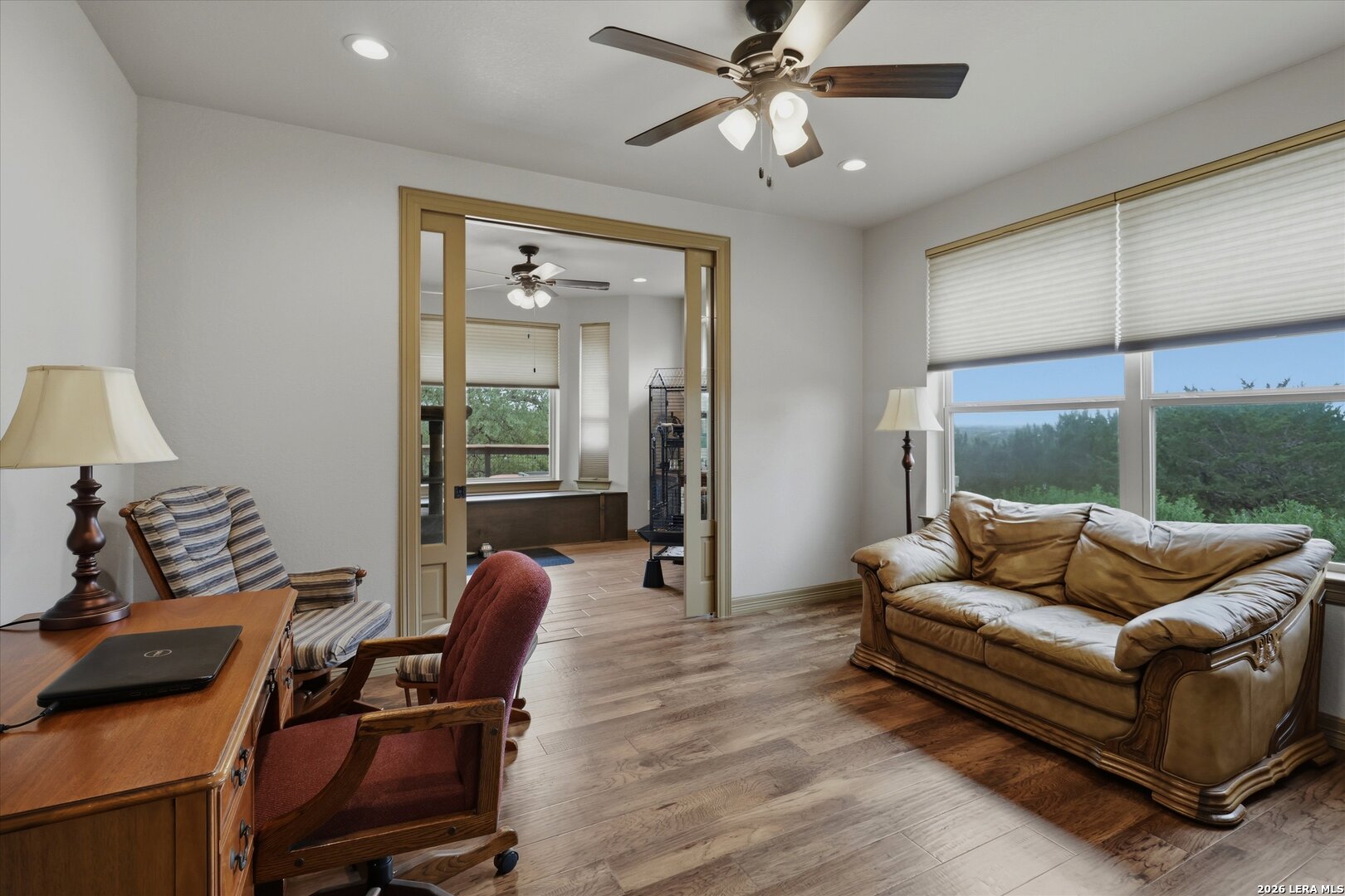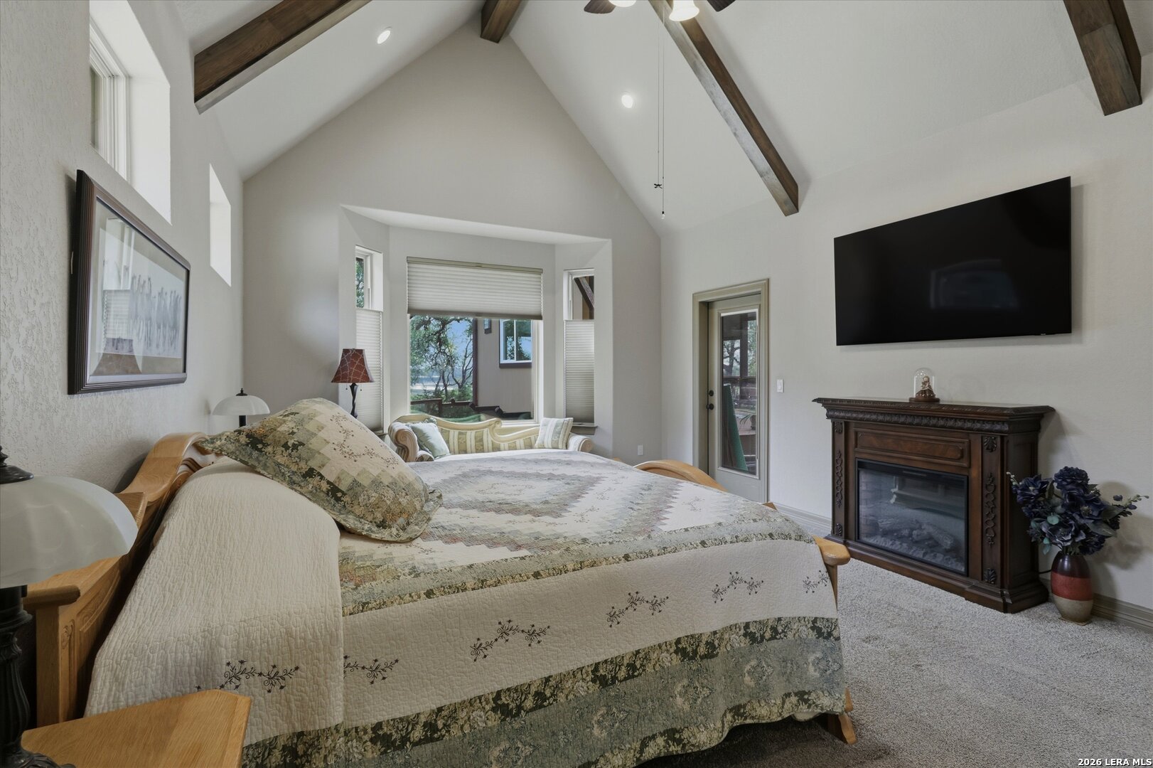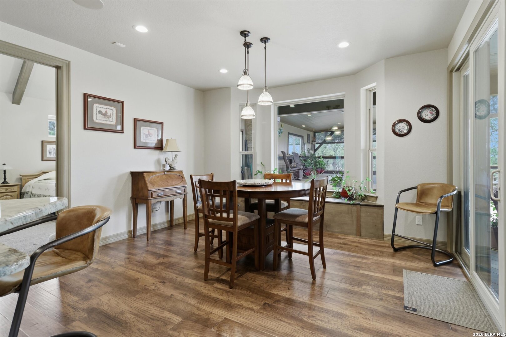 Custom Canyon Lake home with both Hill Country and Canyon Lake views. A beautifully crafted home offering thoughtful design and high-end features throughout. This home blends luxury with functionality, incorporating Jack and Jill bedrooms/bathroom and the Master suite both on the main floor but on opposite sides of the house. The natural flow from the 3-car garage thru the laundry/mud room, past the powder room, and a front facing multi-functional room with custom flooring all work well to surround the daily living space. (Some additional information includes both the Master and Jack & Jill bathrooms features Cambria quartz countertops with impeccable pattern matching and the back facing bedroom includes a sunroom offering flexible living space.) On this main floor you'll find a Gourmet kitchen showcasing hickory cabinetry (stained with weathered teak), a multi-level island with top-of-the-line granite and a smaller work island that's been leathered for contrast. A Hickory barn door leads to a large walk-in pantry that expands at the rear for additional space. Top this off with over/under cabinet lighting, soft close cabinetry (several pull-outs) and a glass top gas stove - whoever spends time in the kitchen will want for nothing! The living room is anchored by a gas fireplace with a "floating" 6-inch live-edge pecan mantel creating a warm and inviting focal point. The fireplace stone and the stone face of the kitchen island match the exterior of the home. Hand-scraped hickory floors run throughout the home, complimented by 5-in base boards and 8-foot interior doors. Hunter-Douglas top-down/bottom-up shades and ceiling fans are also found throughout the home. Take the single landing stairs up to find a large game/media room with surround sound, a large guest friendly full bath and an impressive custom live-edge pecan bar with hop/grain inlays and plenty of room for milling around. The custom cabinetry and lighting continue and is complimented with the double tap kegerator, under counter refrigerator, storage cabinets, mirrored accents and floor to ceiling windows. The sliding glass door leads out to an oversized balcony with cedar toppers and remote all weather shades which can enclose the entire balcony. Off the balcony is an entrance to the smaller attic area (the larger is off the upstairs bathroom). Outdoor living is exceptional. Including a covered partially enclosed 15x8ft swim spa, two separate deck areas for entertaining or just taking in the views and wider stairs leading to a flag stone patio with a built in firepit. Partially dried in storage is also available under the deck. On the other side of the home you will find a sitting area with a dual propane heat system for evening viewing of the Hill Country or morning bird watching. This area has an established in-ground arial feeding station. Some additional highlights include but are not limited to: Central Vac, SONOs sound system (inside and out), Reme Halo air purification on all 3 HVAC units, an alarm system (not contracted), a sprinkler system that includes drip irrigation, a 250gal buried propane tank with quick turn valve which supports the partial house generator system, tankless hot water system and water softener. The RV barn has 30 x 40ft enclosed area which includes an inside 2 story airconditioned room and mini-split that cools/heats the entire area, an exhaust fan and a backdoor. Inside you have a full 30/50amp hook-up with dump station and outside, not enclosed but covered, the RV guest area also has full hook-up. The driveway and additional added areas are concrete. This home includes ongoing service agreements for HVAC and septic and has had on-going pest control since build.