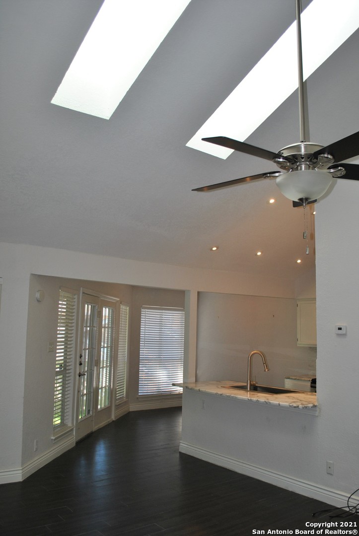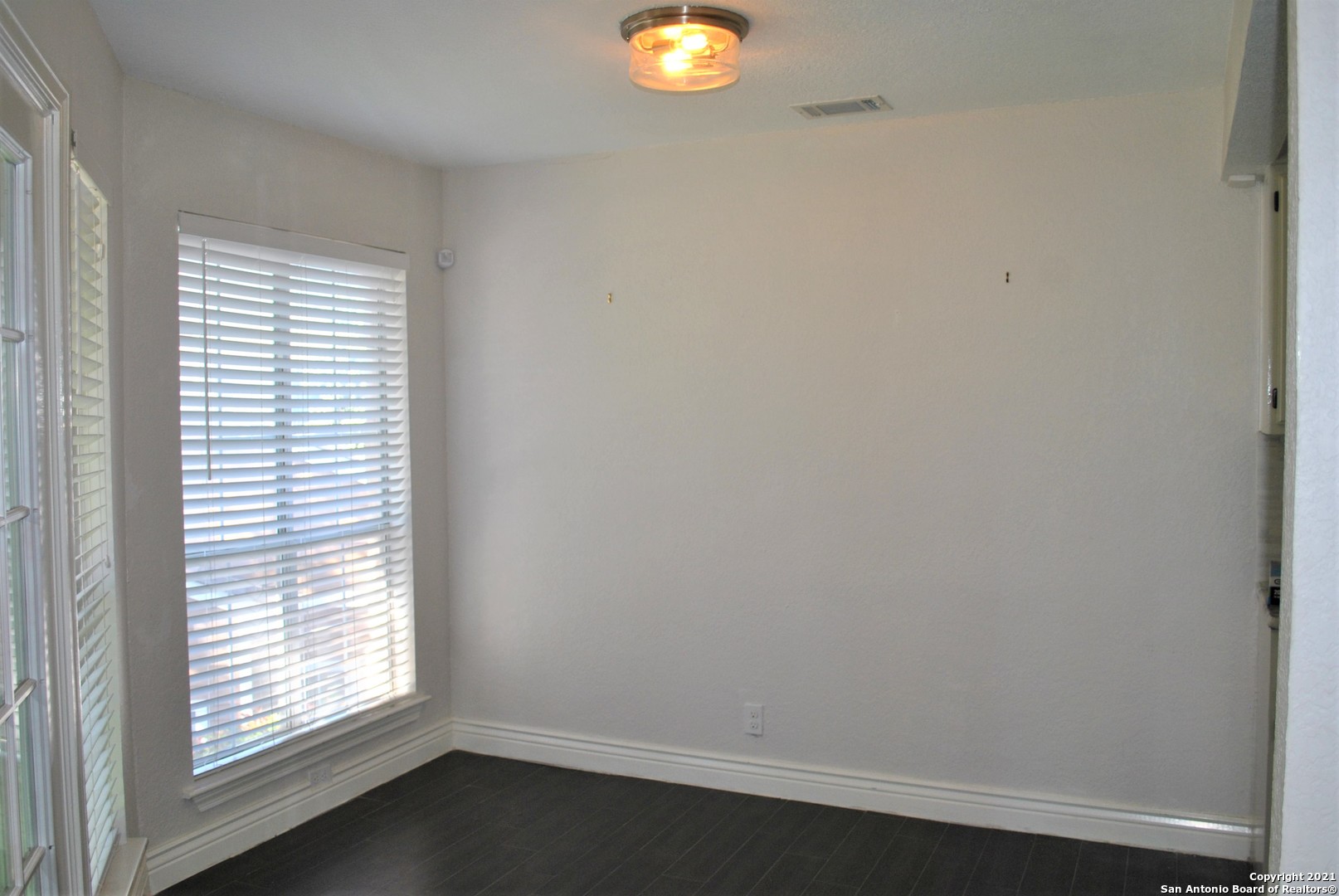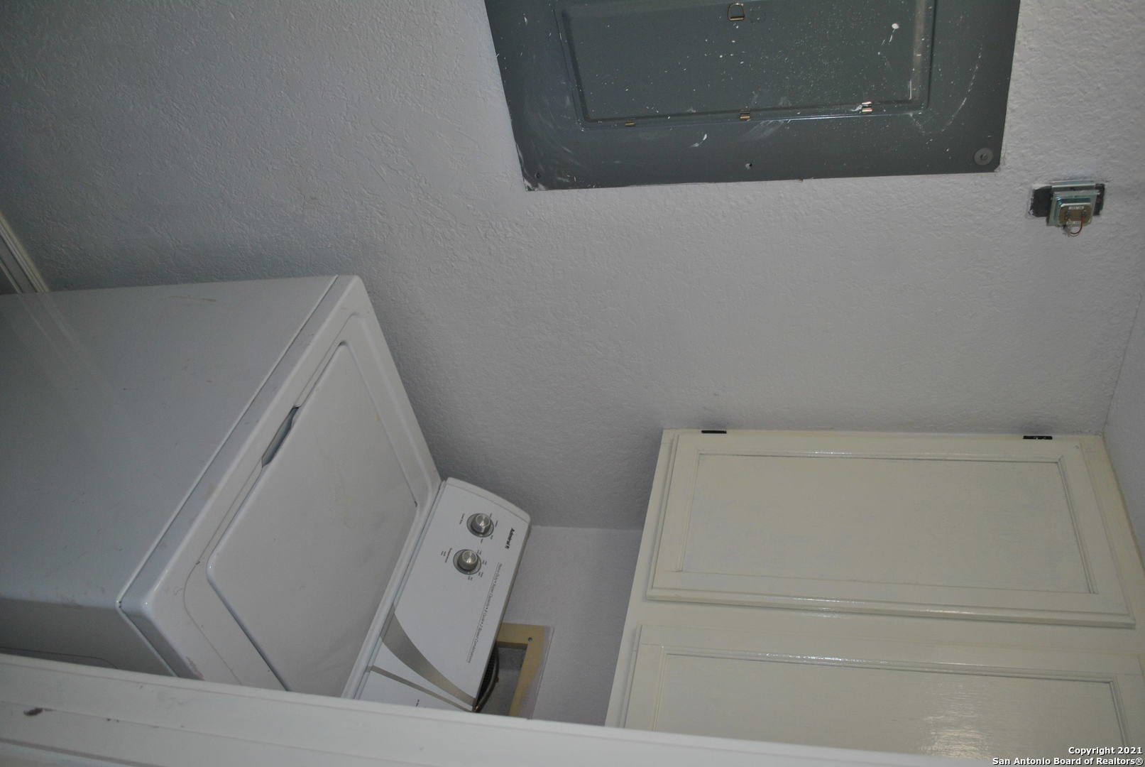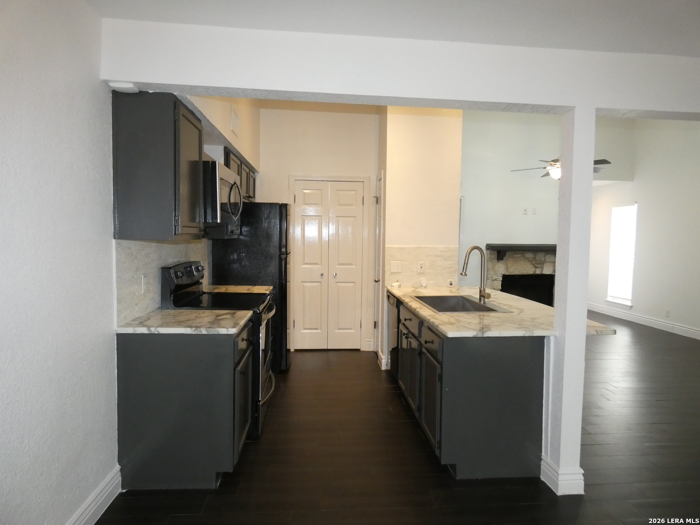 Comfortable 1 bedroom 1 bath end unit on the second floor. Wood burning fireplace in living room with skylights in the tall ceiling. Oversized balcony overlooks the pool area and has additional storage. Bedroom has 2 walk in closets. Pets on case by case basis under 25lbs. Rent includes condominium fees and use of common areas and pool. Close to UTSA, new HEB and LaCantera Mall.
