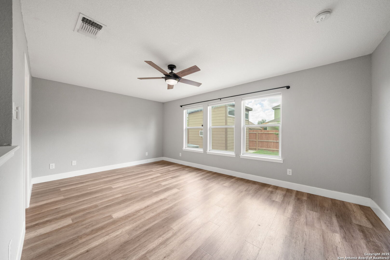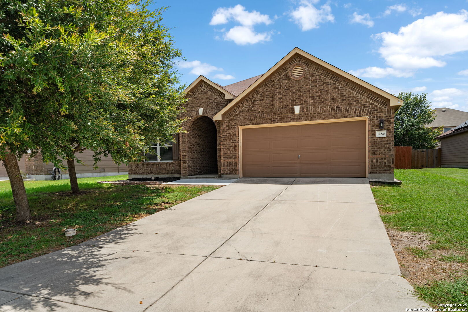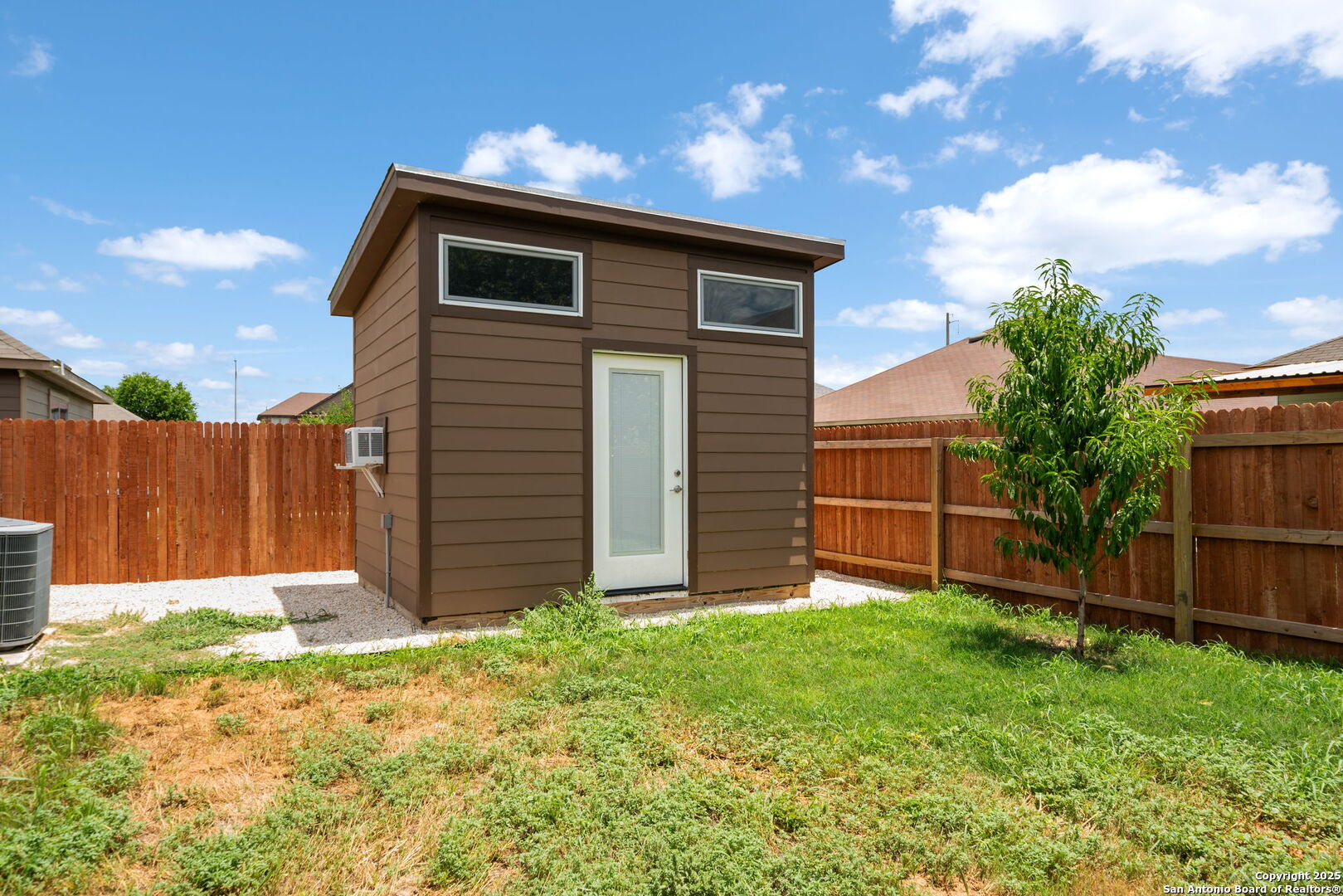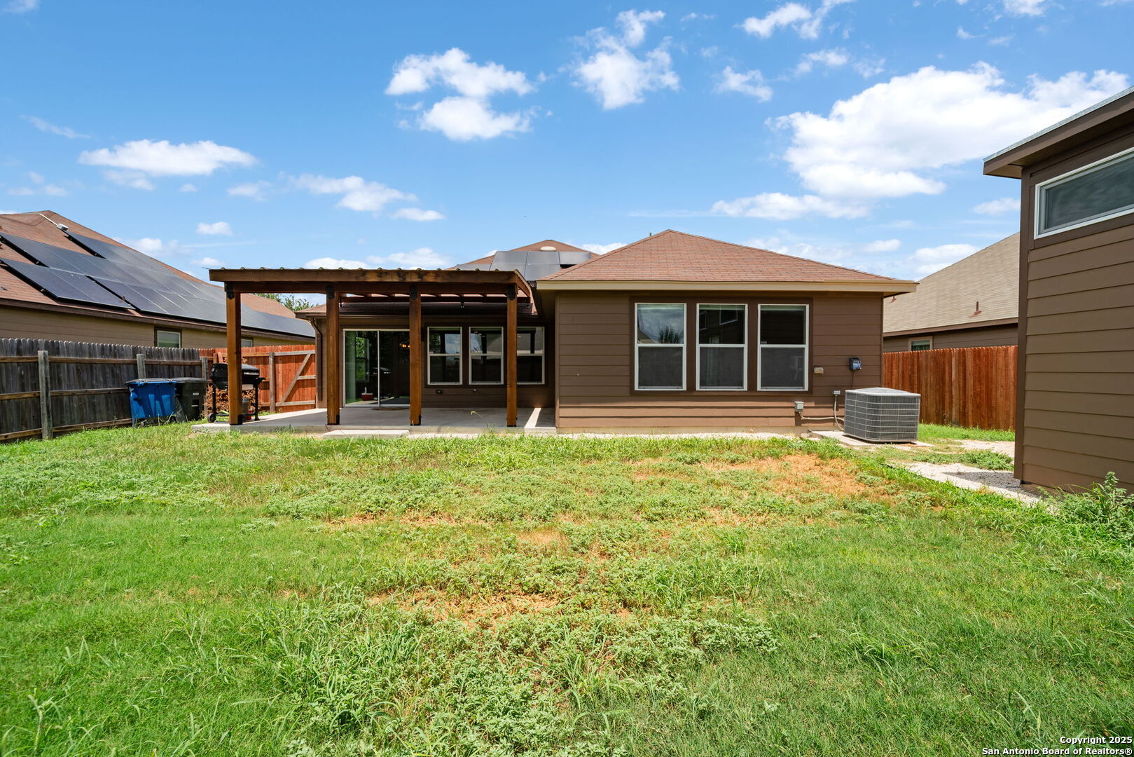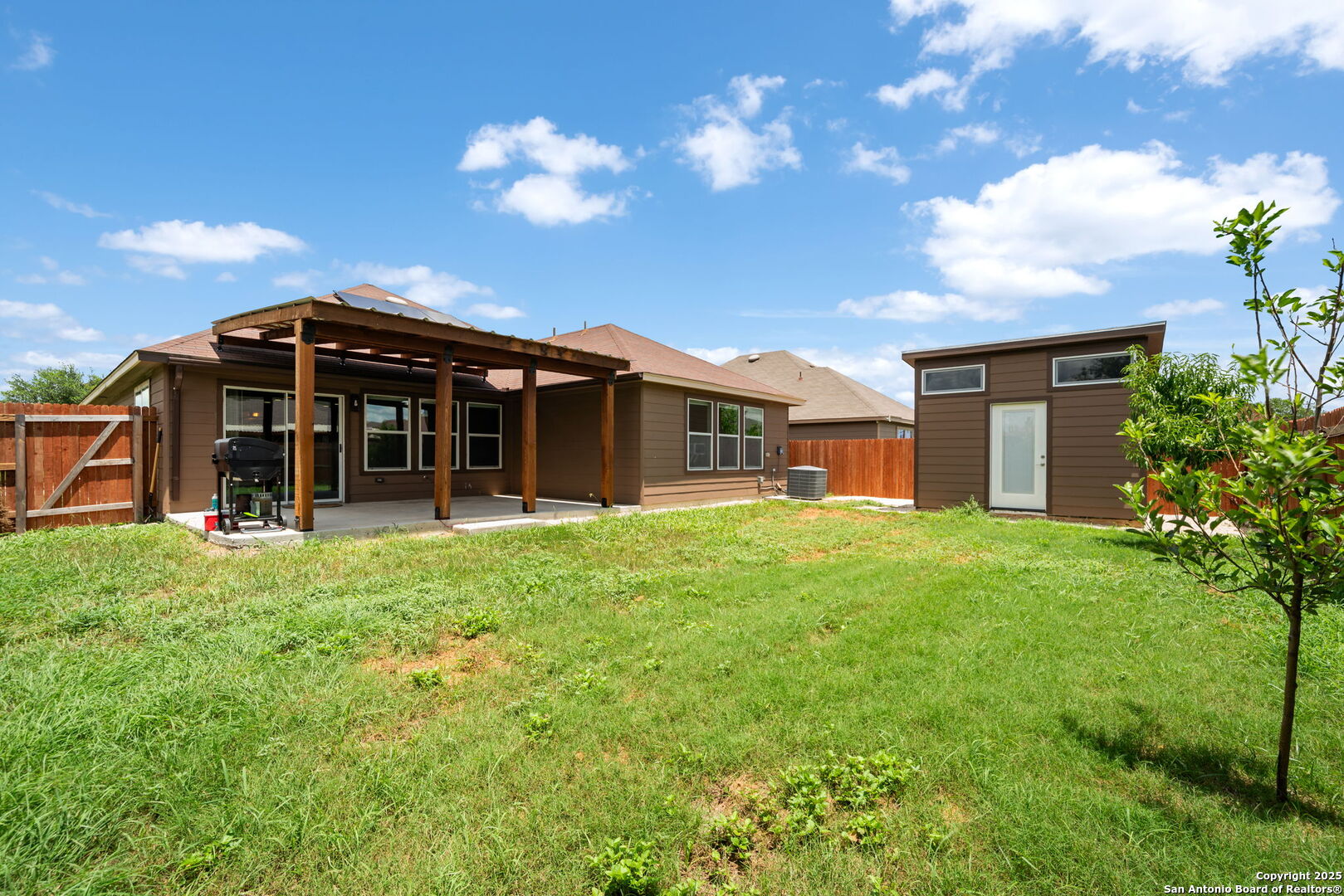 Well-maintained one-story home featuring 3 spacious bedrooms and 2 full bathrooms. The open floor plan offers a bright and inviting living area that flows into the dining space and kitchen. The kitchen is equipped with modern appliances, a breakfast bar, and a large walk-in pantry providing plenty of storage and functionality. The primary suite features a generous walk-in closet and an ensuite bathroom with dual vanities and a tub/shower combo. Secondary bedrooms are well-sized and share a full hallway bath. The large backyard is perfect for outdoor entertaining and includes a detached office space ideal for remote work or a creative studio. Home is also equipped with solar panels for energy efficiency. Conveniently located Hwy 46 Near New Braunfels. Minutes from Lake Dunlap