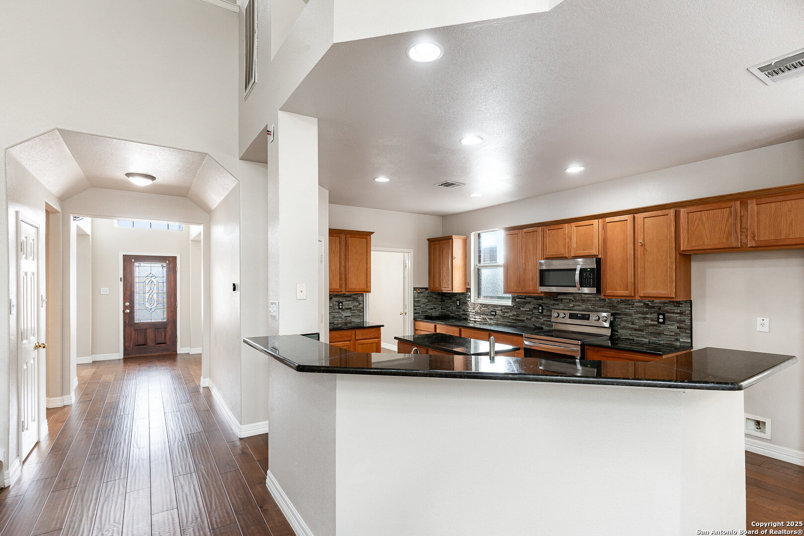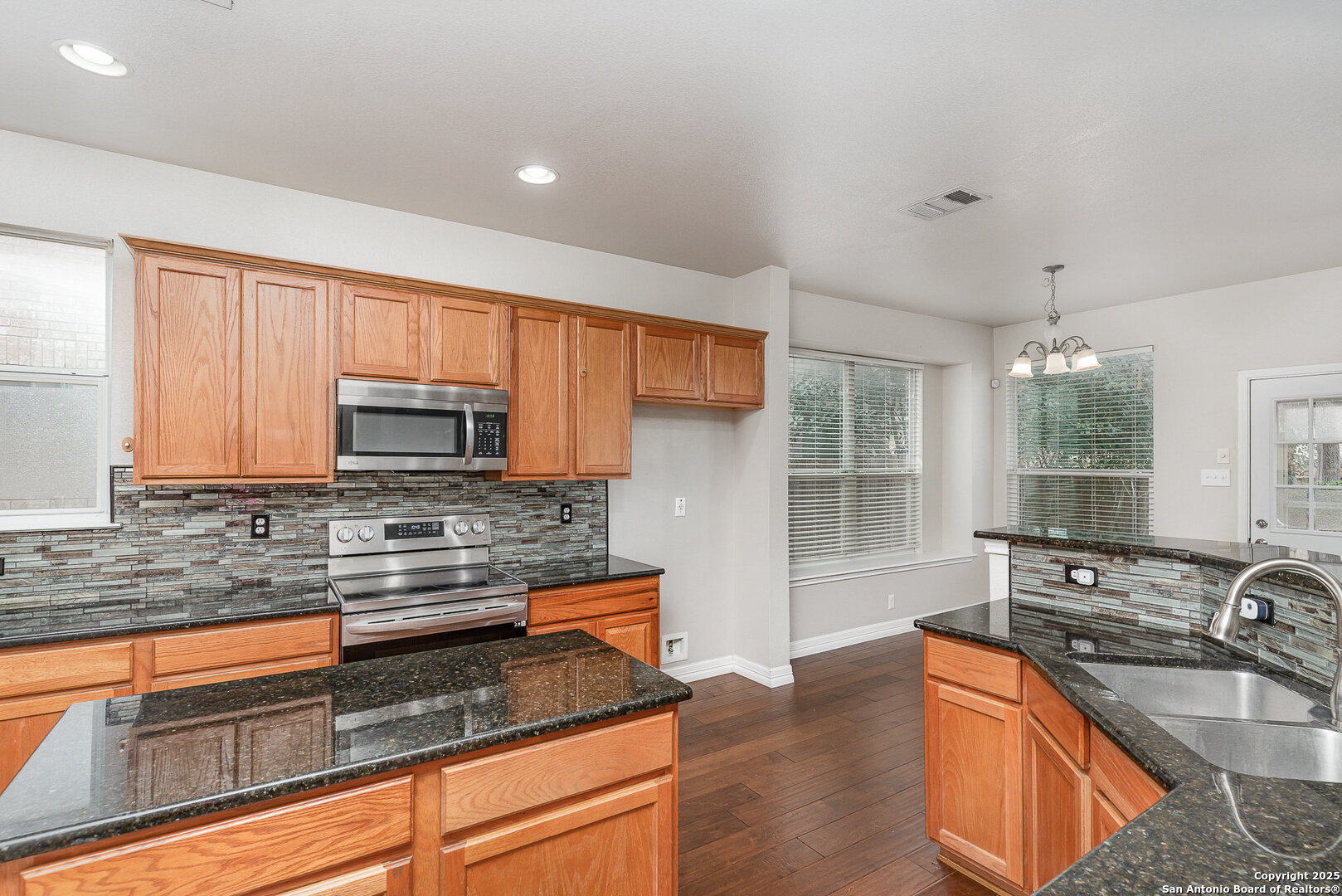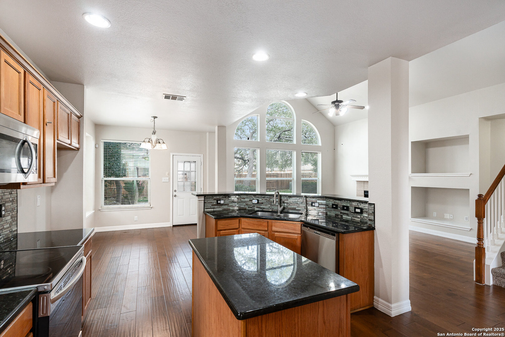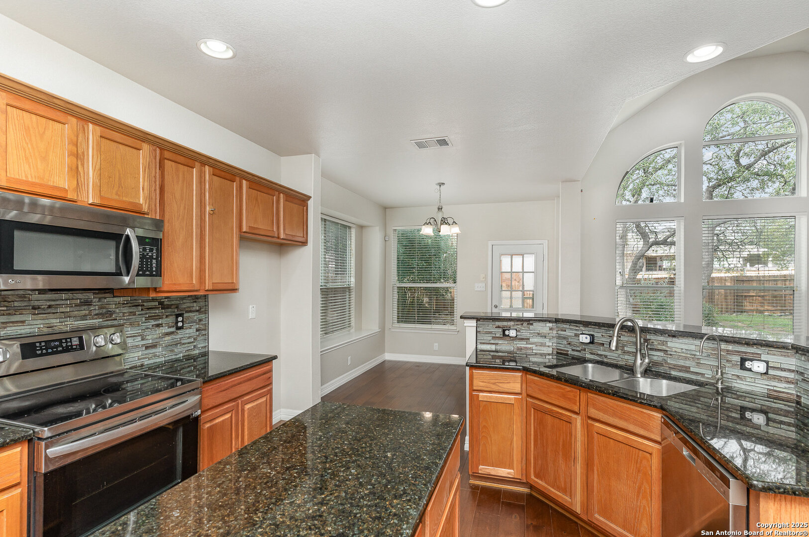 Welcome to this gorgeous immaculately maintained 4-bedroom, 2.5-bath home in the coveted gated community of Enclave at Sonoma Ranch. The brick exterior exudes classic elegance, complemented by mature trees. The open-concept design features two living areas, a formal dining room, a flex space perfect as an office and a stylish eat-in kitchen with an island and recently updated with a LG stainless steel appliance package . The soaring vaulted ceilings and fireplace in the main living area create an inviting space to unwind. The oversized first-floor master suite provides a private retreat, complete with separate tub and shower with a seating area and a large walk-in closet that would get any closet connoisseur excited! Upstairs, you'll find a spacious game room and three generously sized bedrooms and a double vanity bathroom. The backyard is a true oasis, featuring mature trees and ample space for outdoor gatherings. Beyond the grand feel of the home, the community offers a first class amenity center complete with multiple pools, clubhouse, basketball court, tennis court, volleyball court and Mini-Golf area. Perfect for families to connect and enjoy. Experience the charm, comfort, and luxury of this remarkable home and community. Located in the heart of Helotes, this home is close to top-rated public and private schools, shopping, and dining. If you're looking for your forever home, congratulations, you've found it!